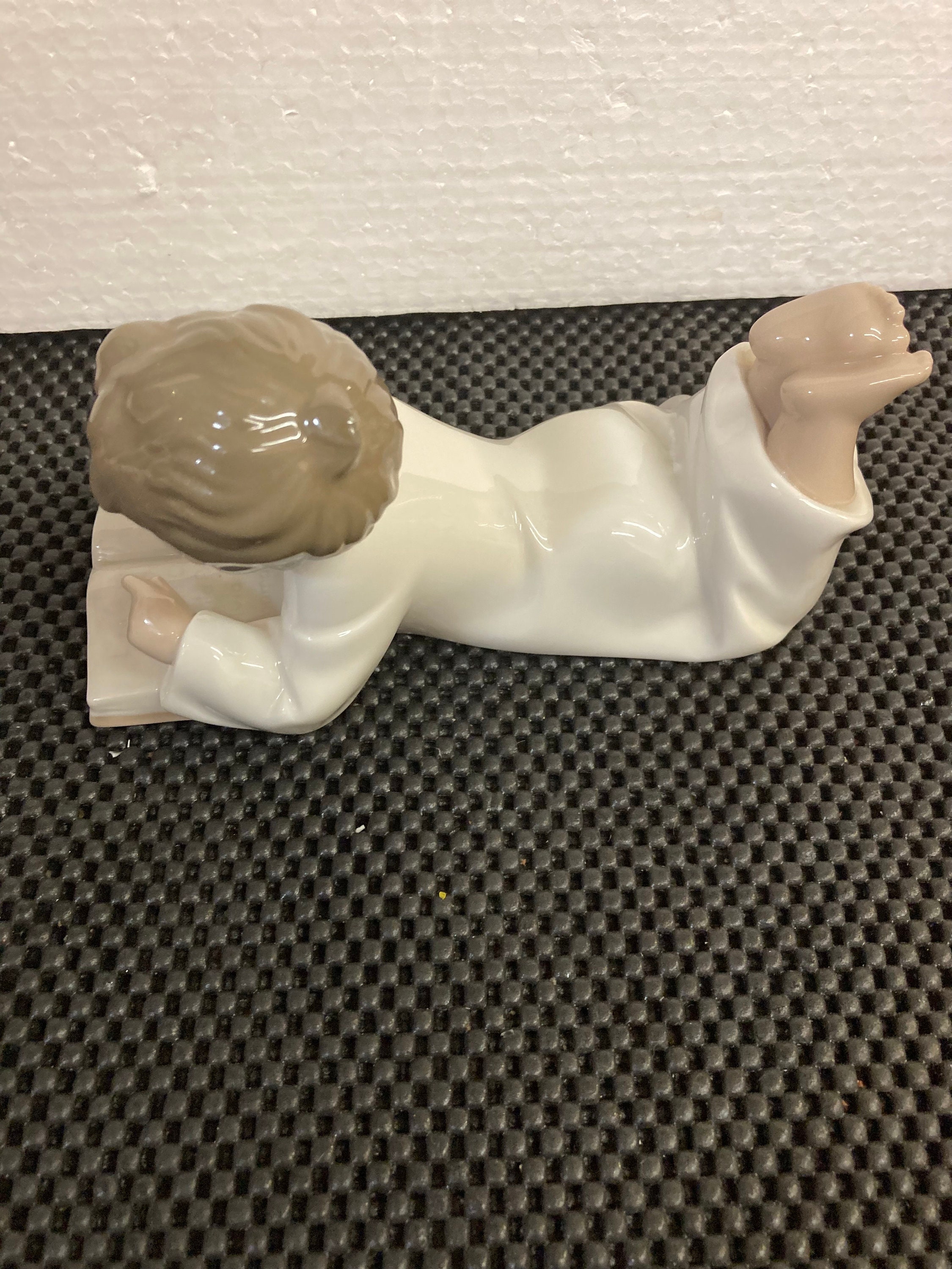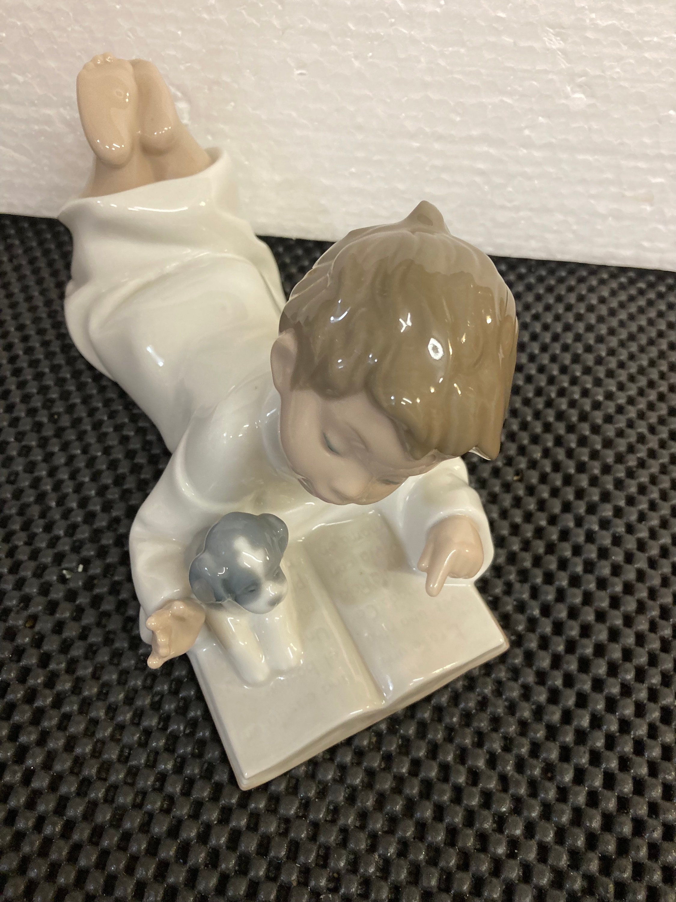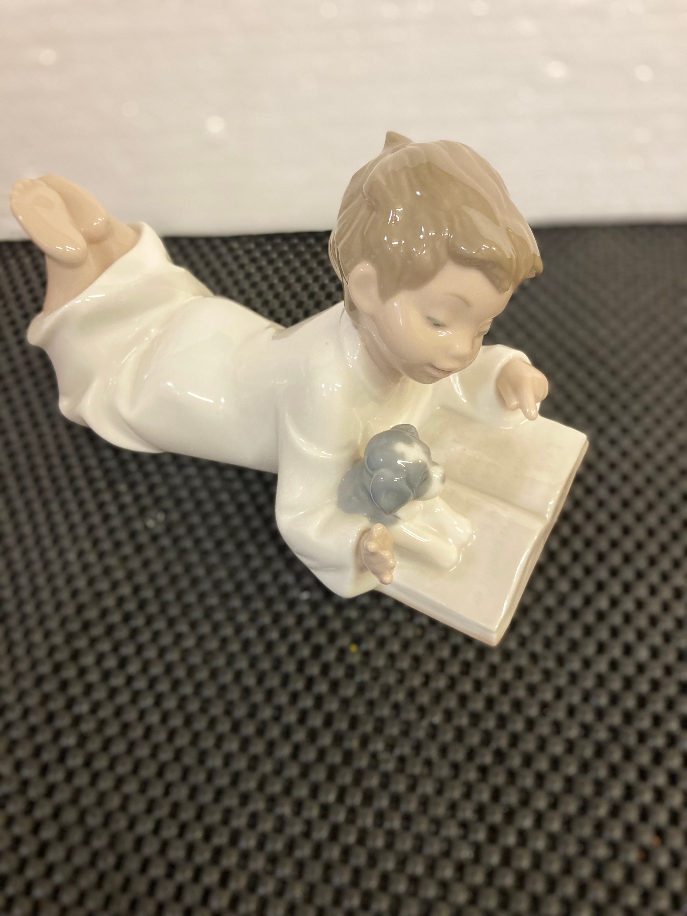 NAO: Boy Reading Book With His Dog next to Him # 1285 , 3 3/4" tall x 7" wide x 3 1/2 " deep
