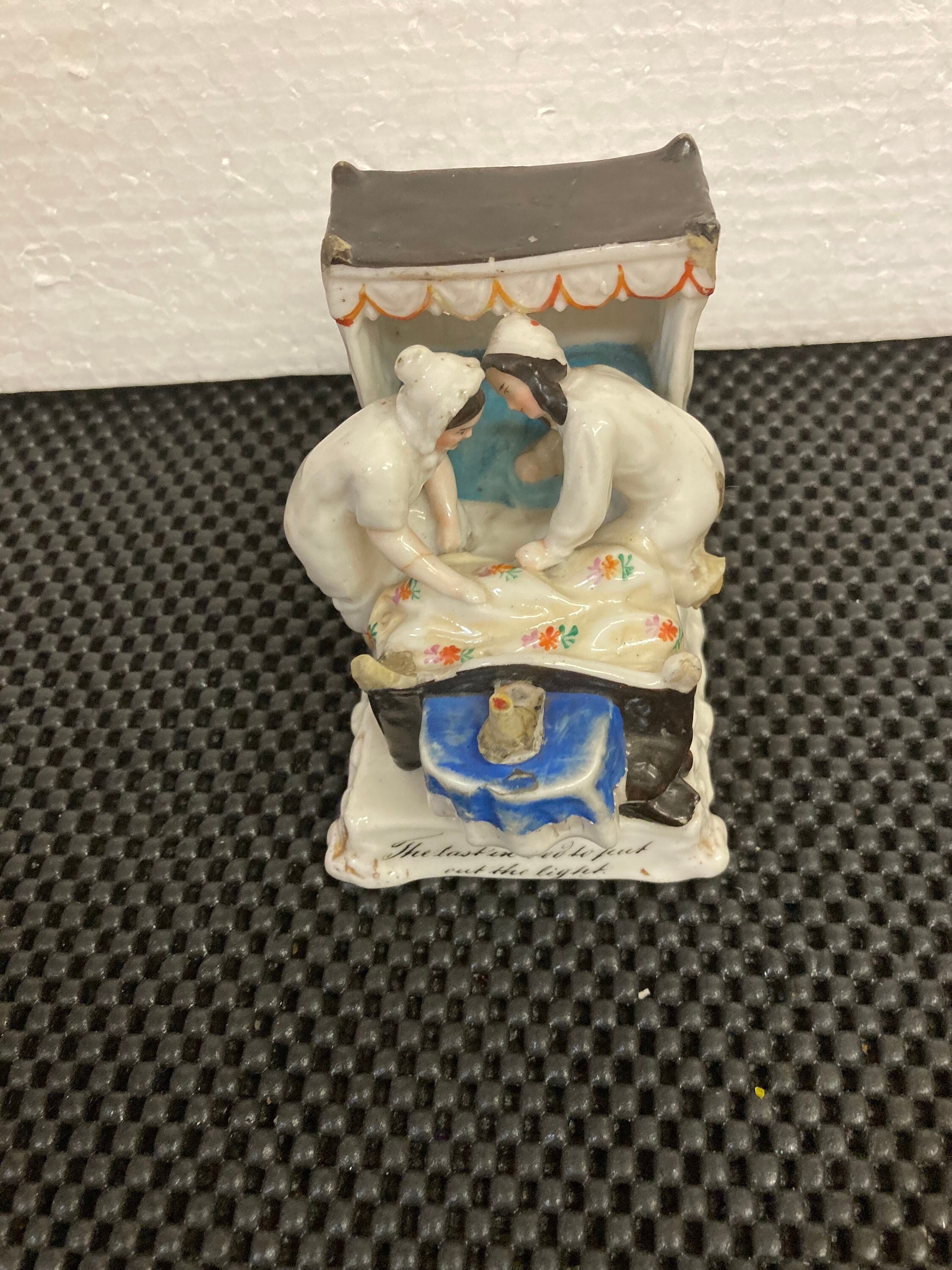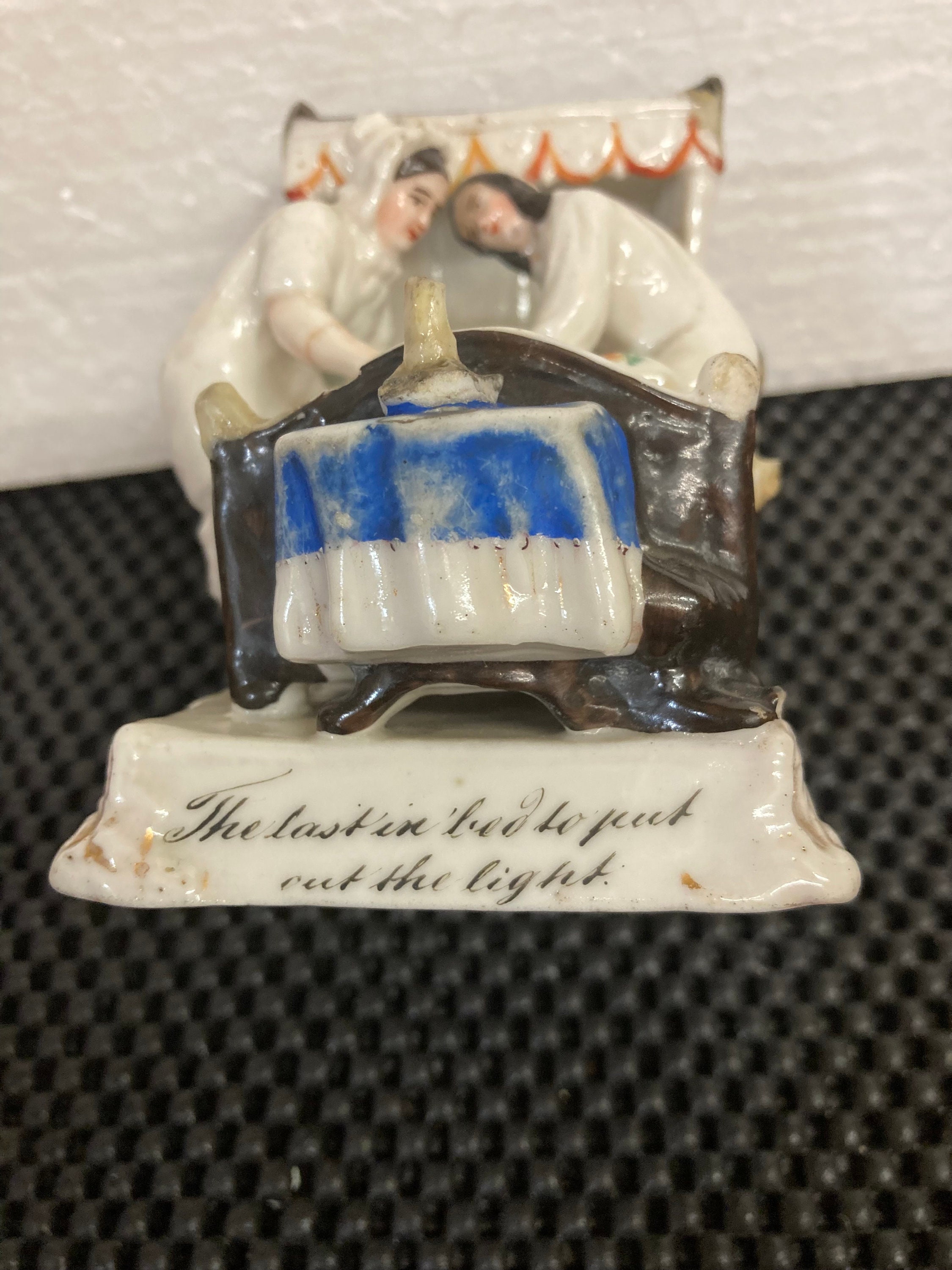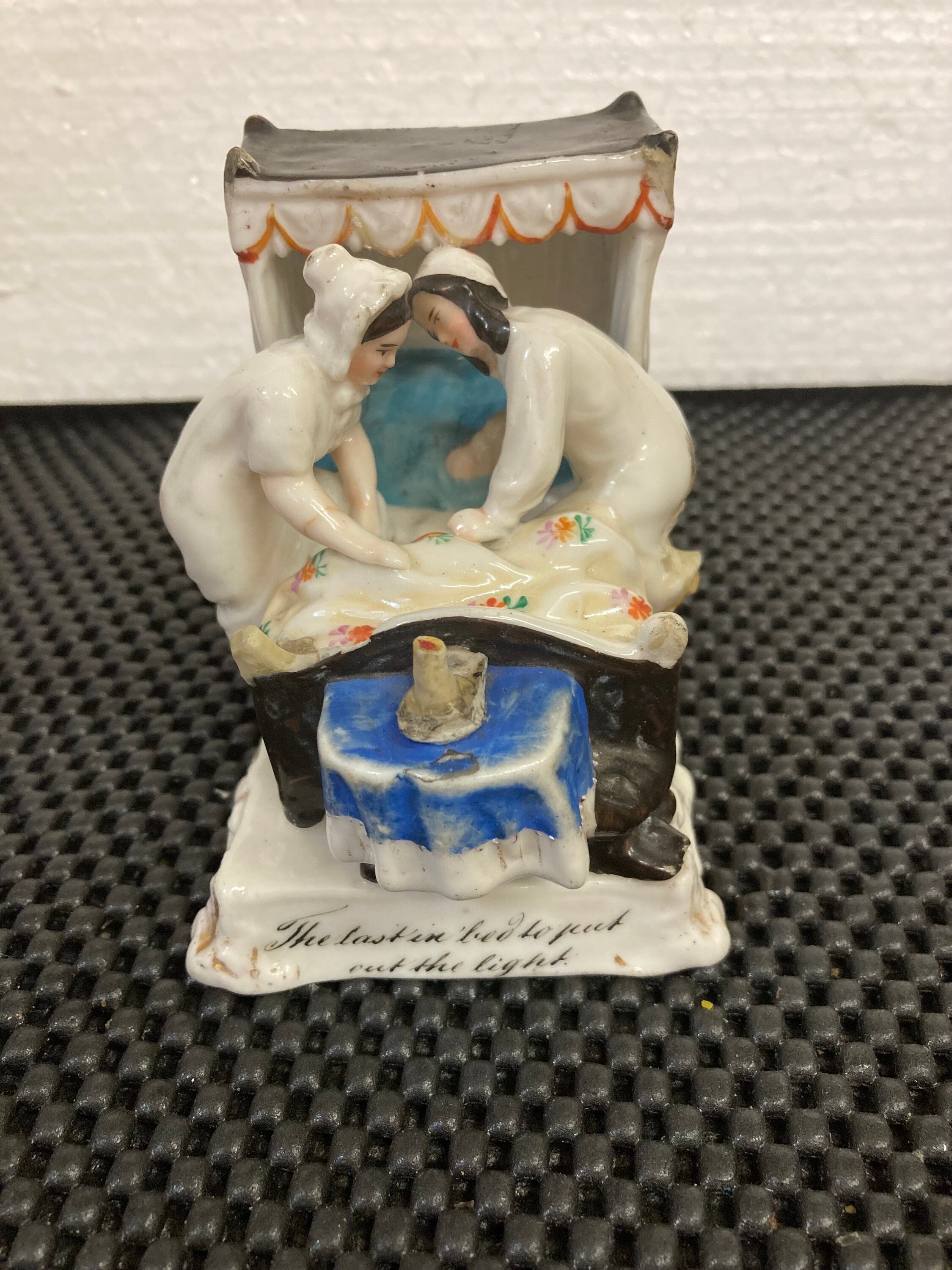 The verse on the figurine says: “The Last in Bed to Put out the Light” in black.