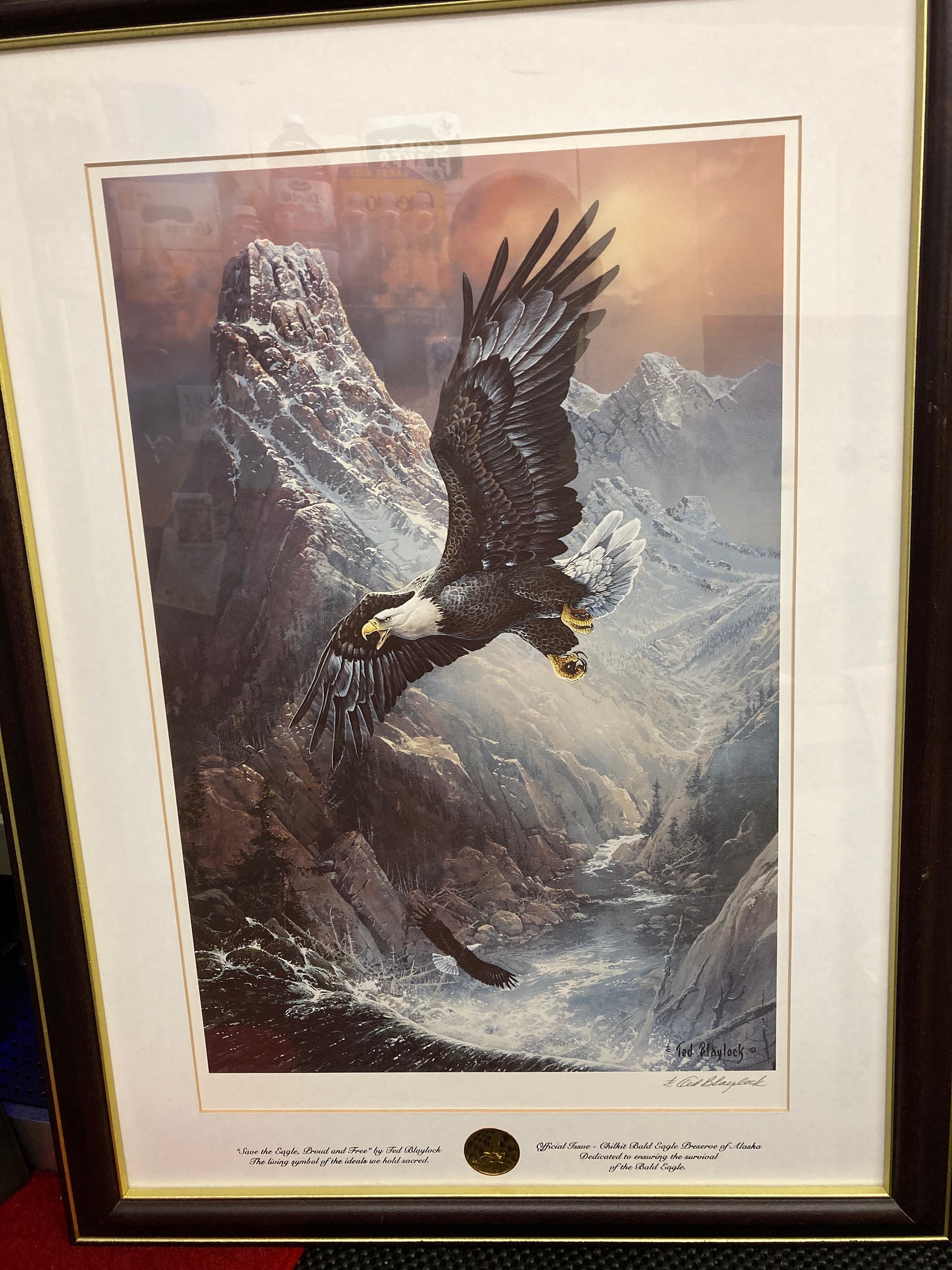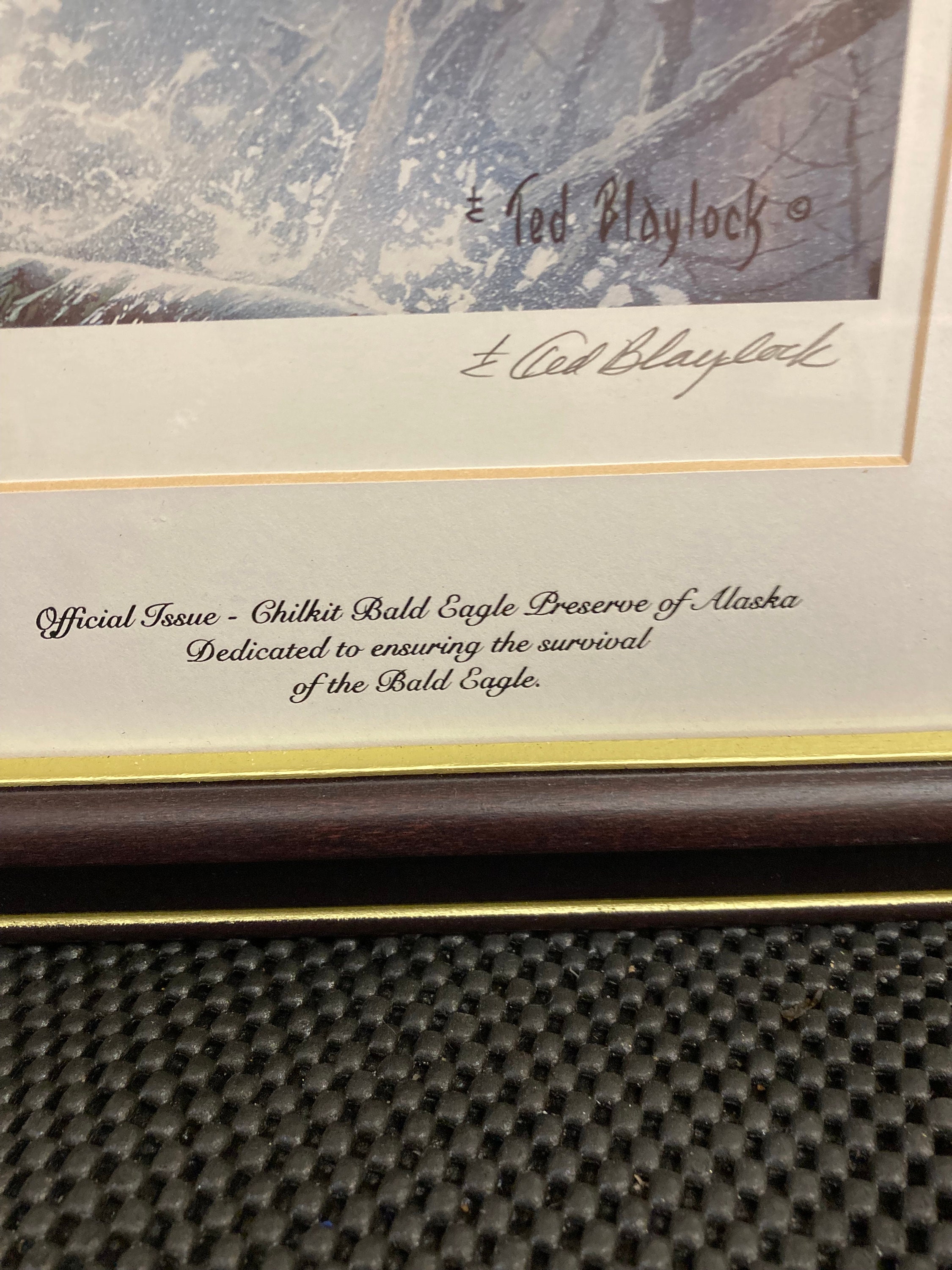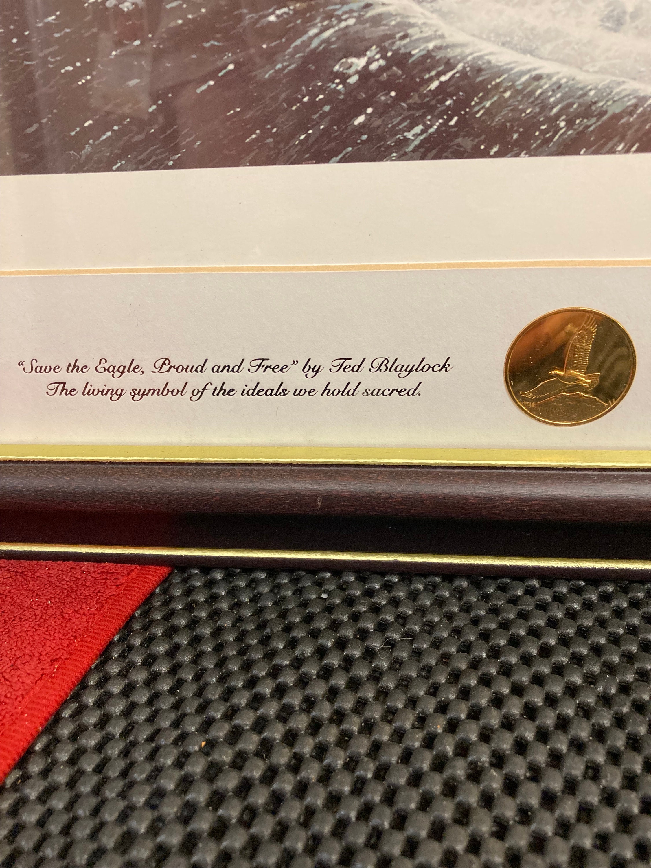 TED Blaylock art Lithographs. Double signed certified with COA by the Alaskan Chilkat Bald Eagle Preserve and the Alaska State Parks. They are complimented with a minted medallion, embellished with 24k gold. . frame is fine, and the paper on the back is peeling off a little,