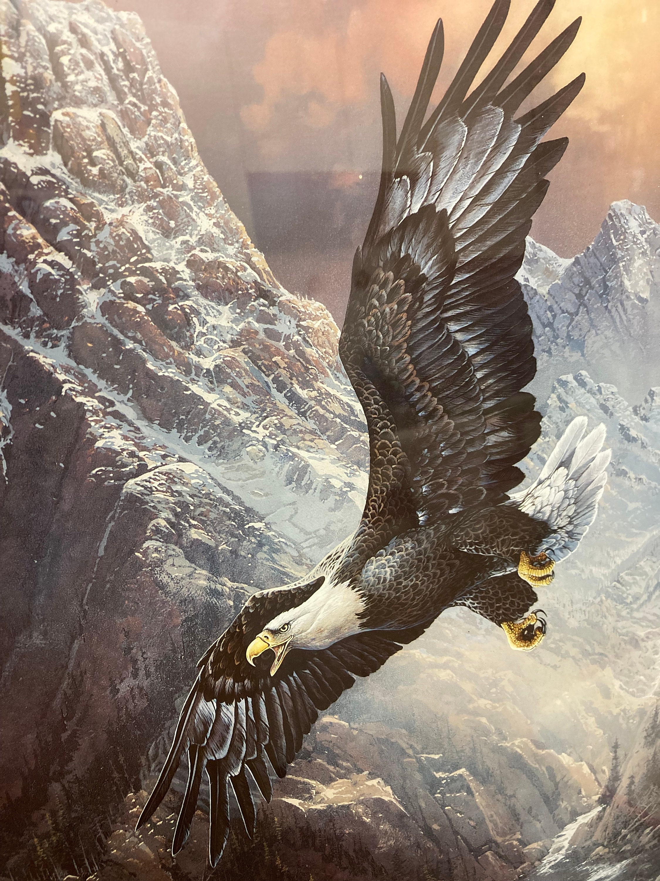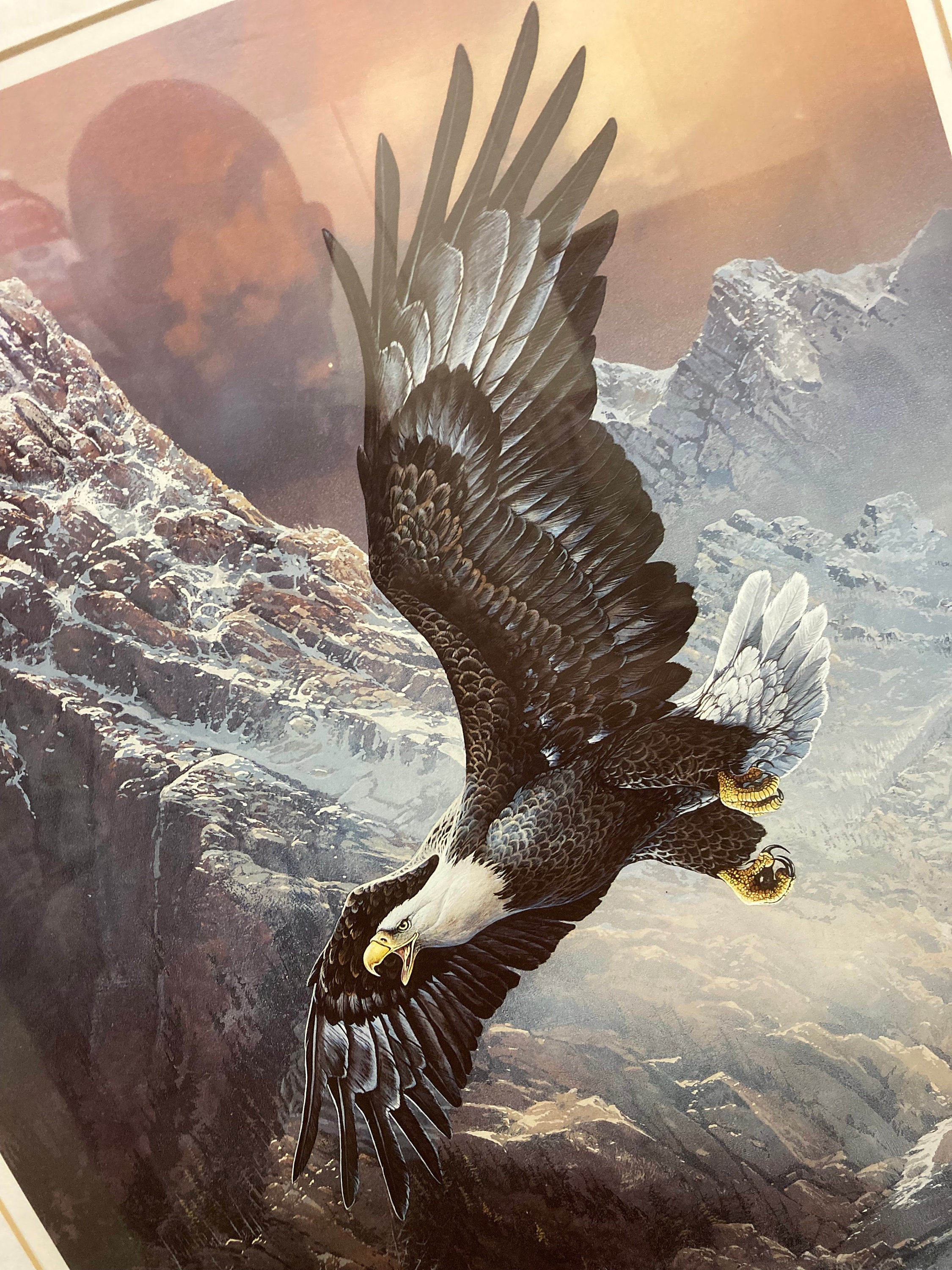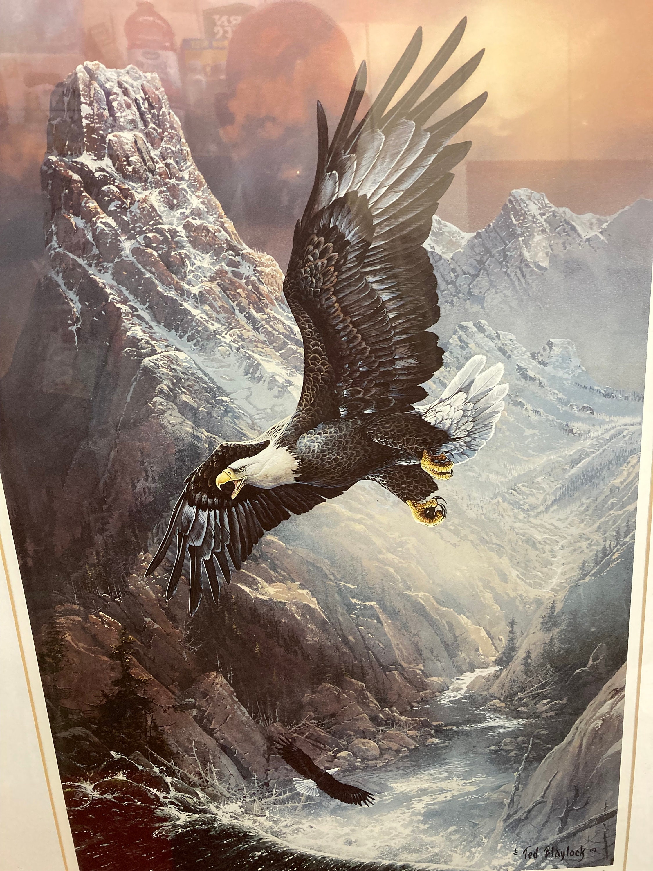 TED Blaylock art Lithographs. Double signed certified with COA by the Alaskan Chilkat Bald Eagle Preserve and the Alaska State Parks. They are complimented with a minted medallion, embellished with 24k gold. . frame is fine, and the paper on the back is peeling off a little,