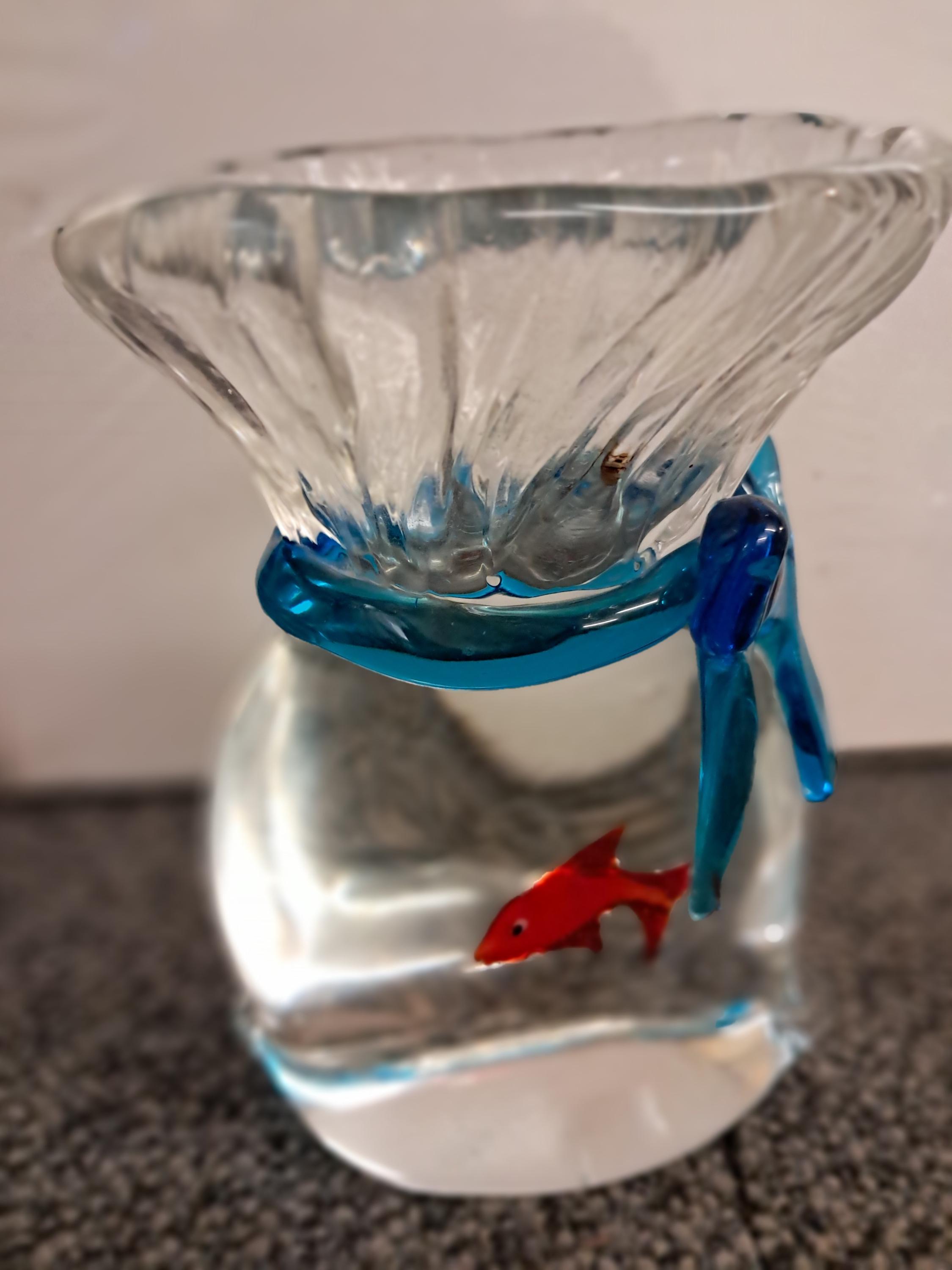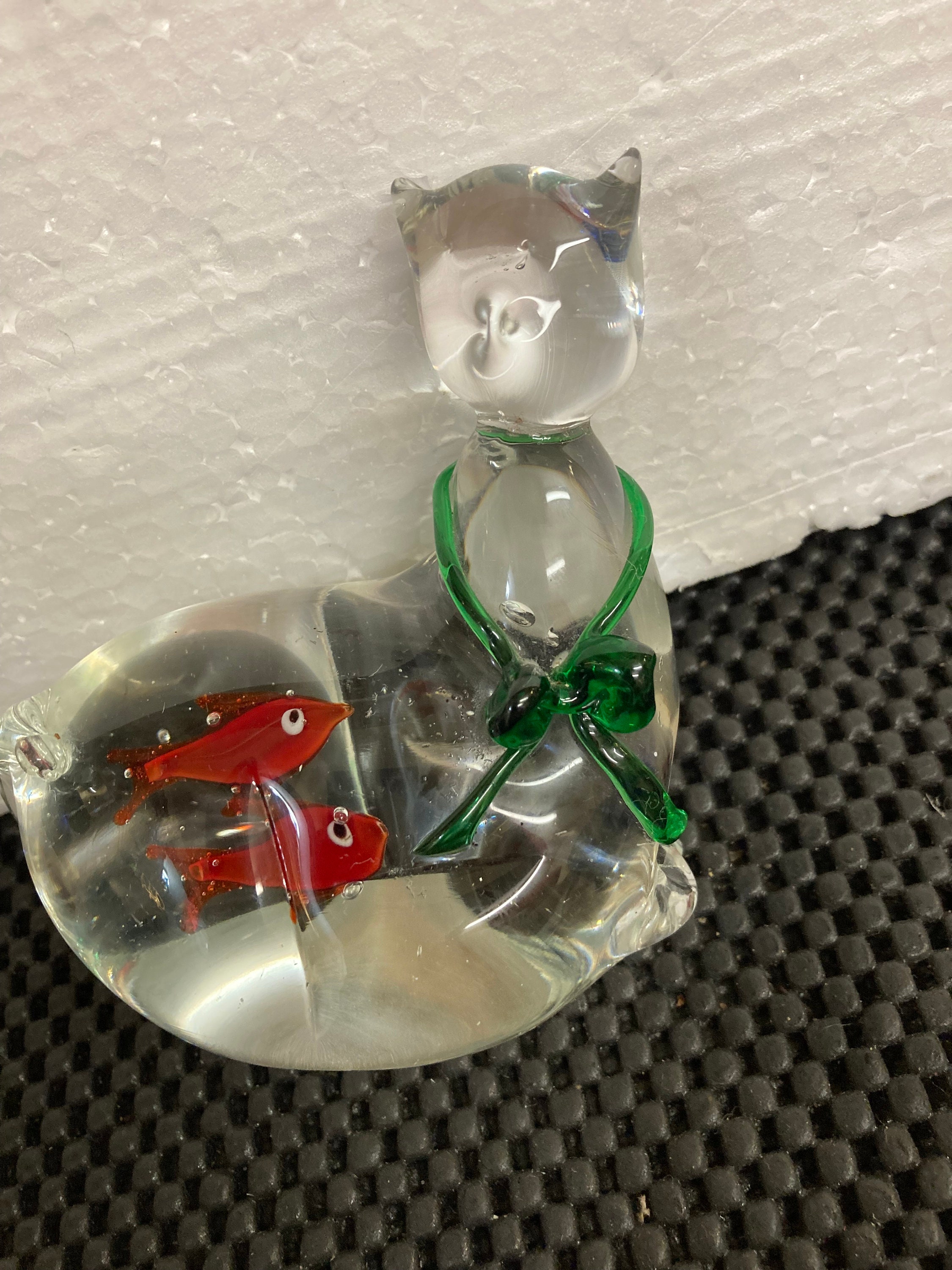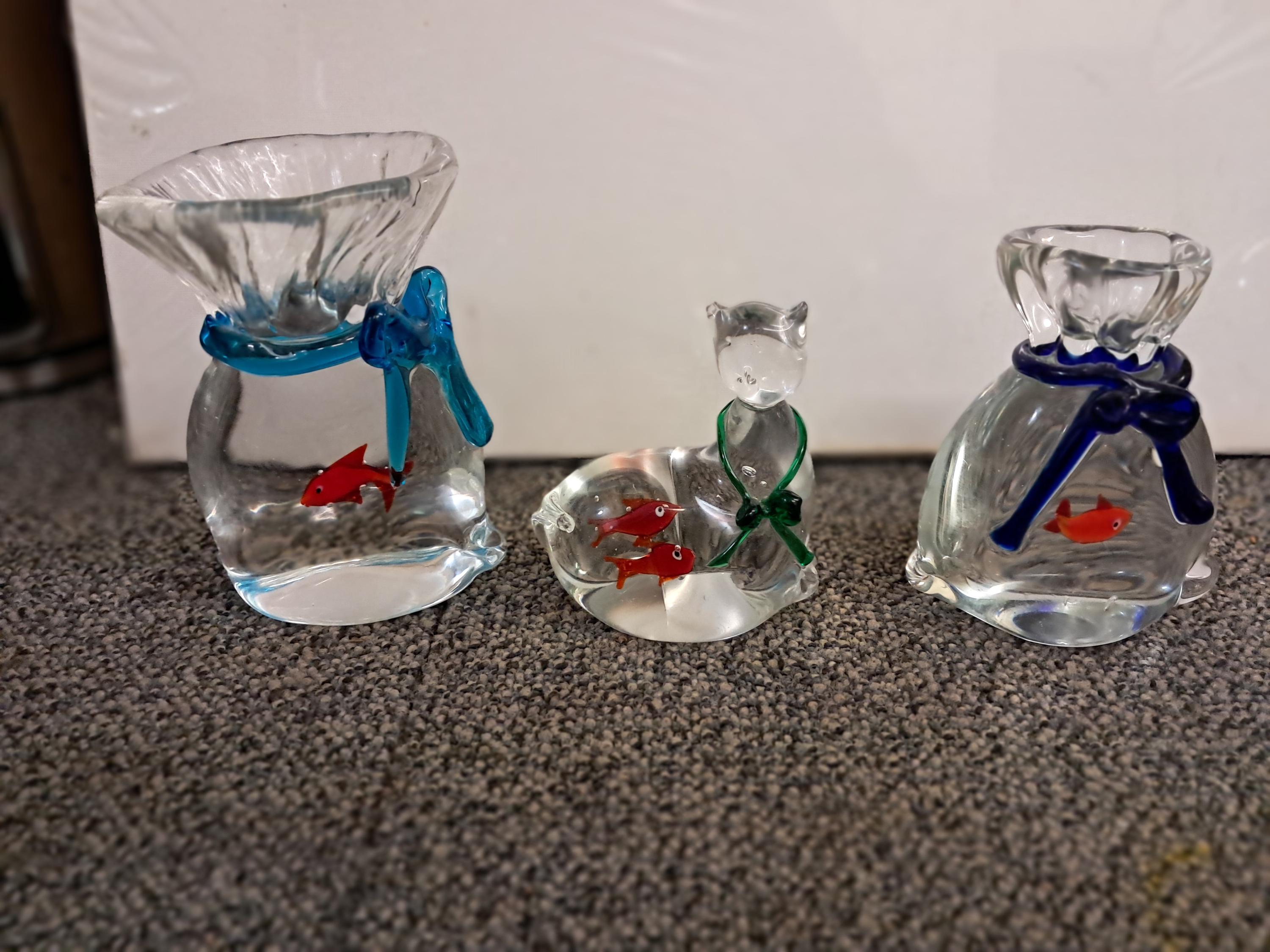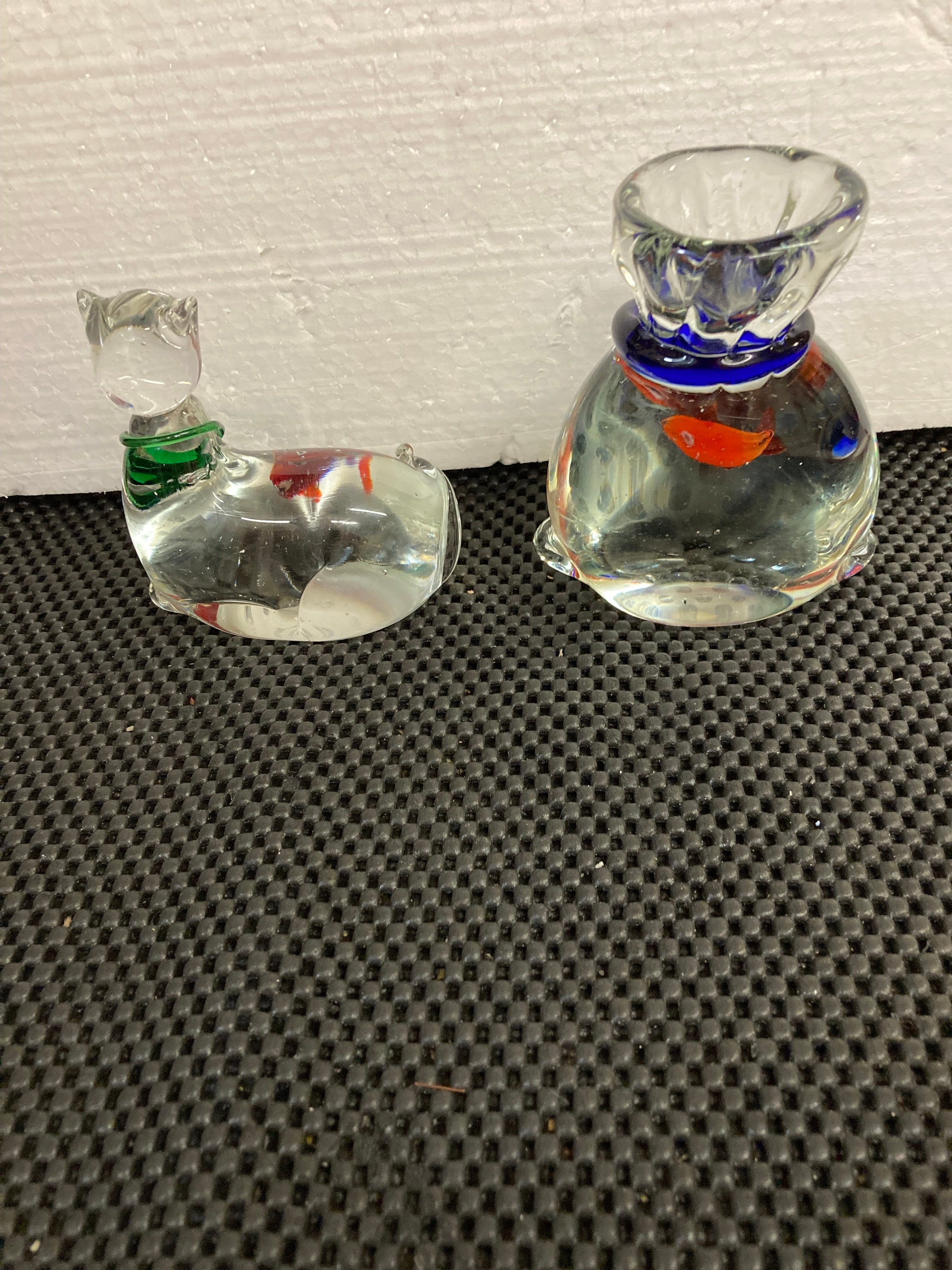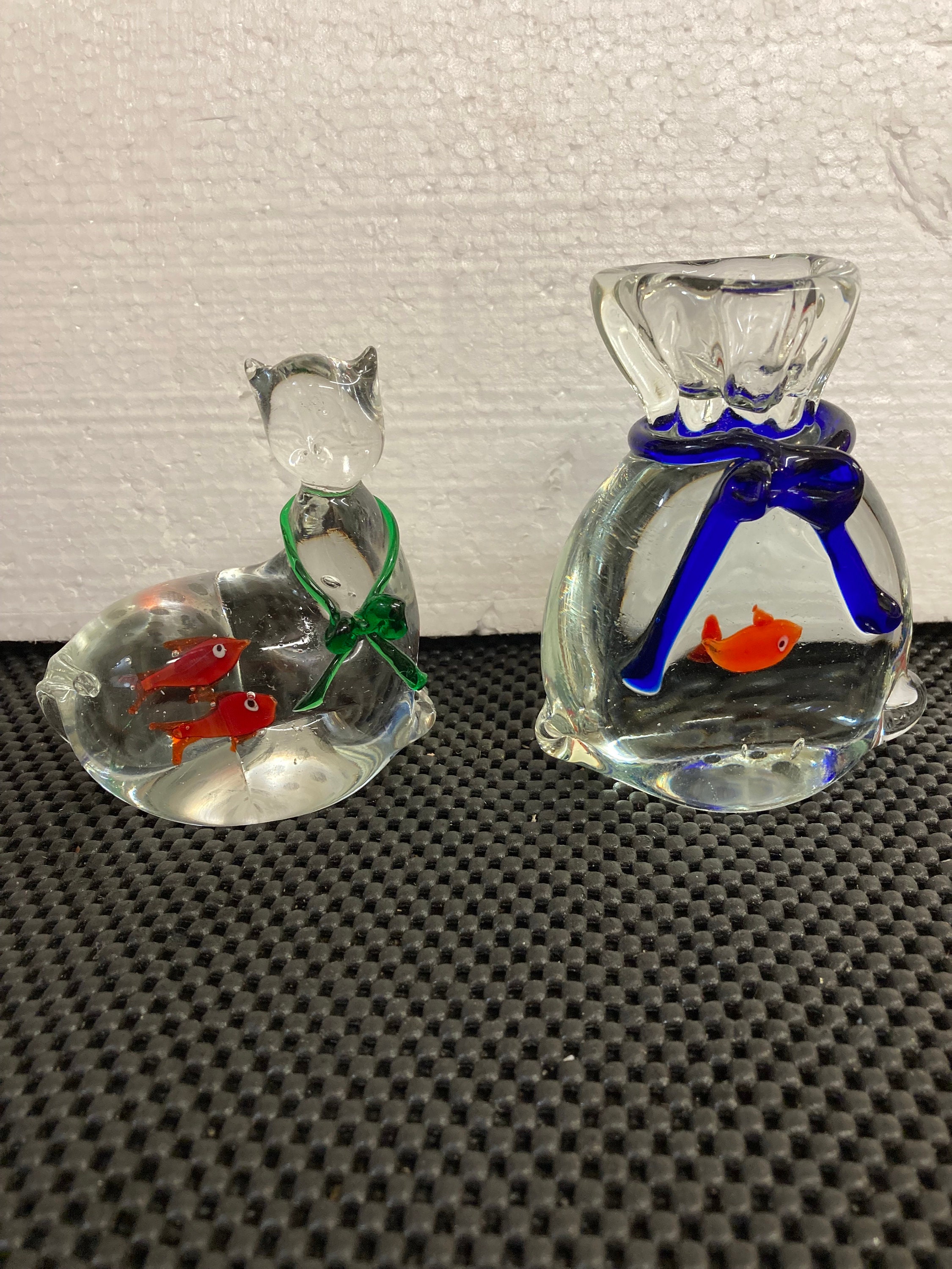 Two Vintage Murano Paperweights ,Fish in The Bag and Cat