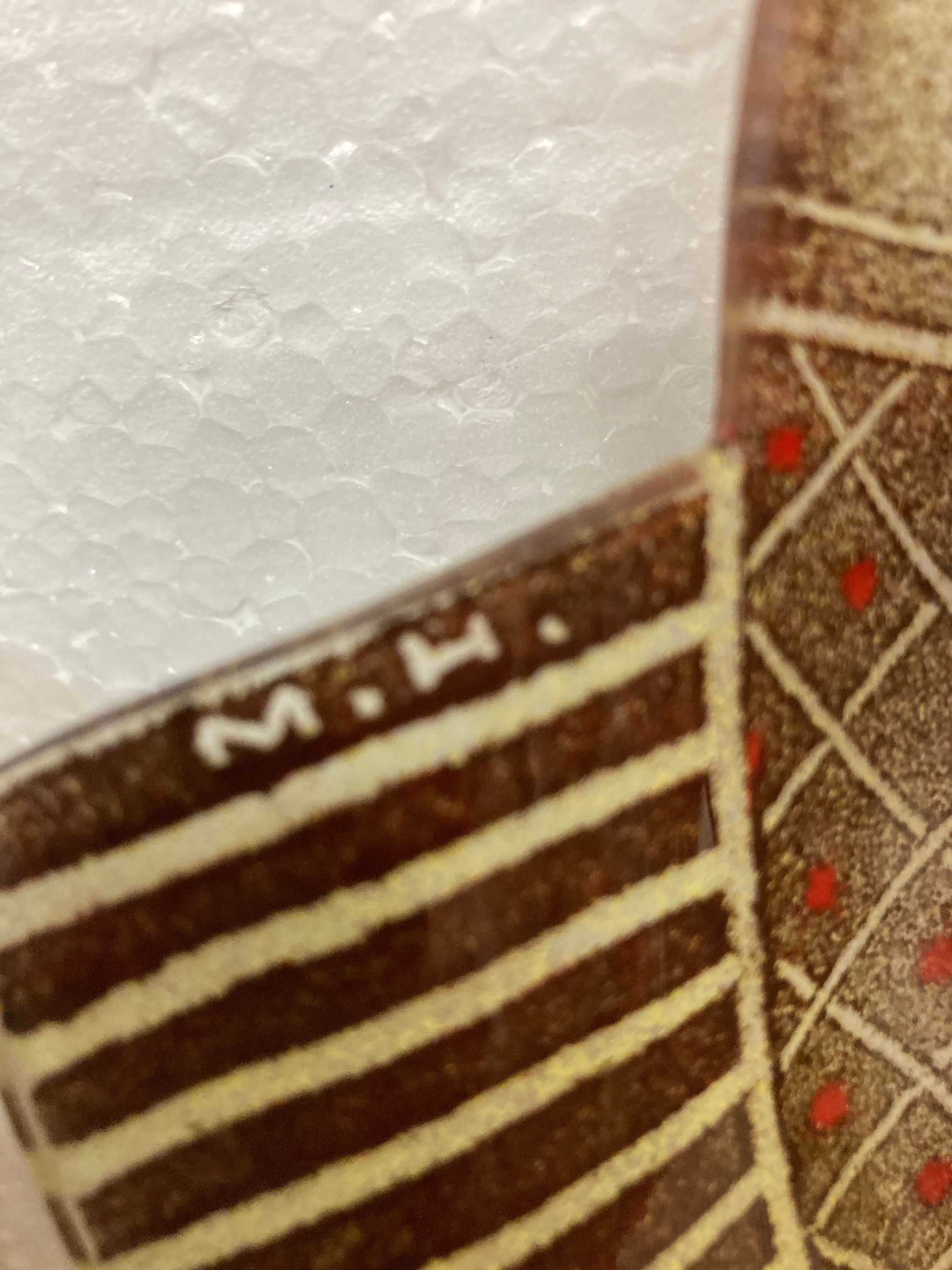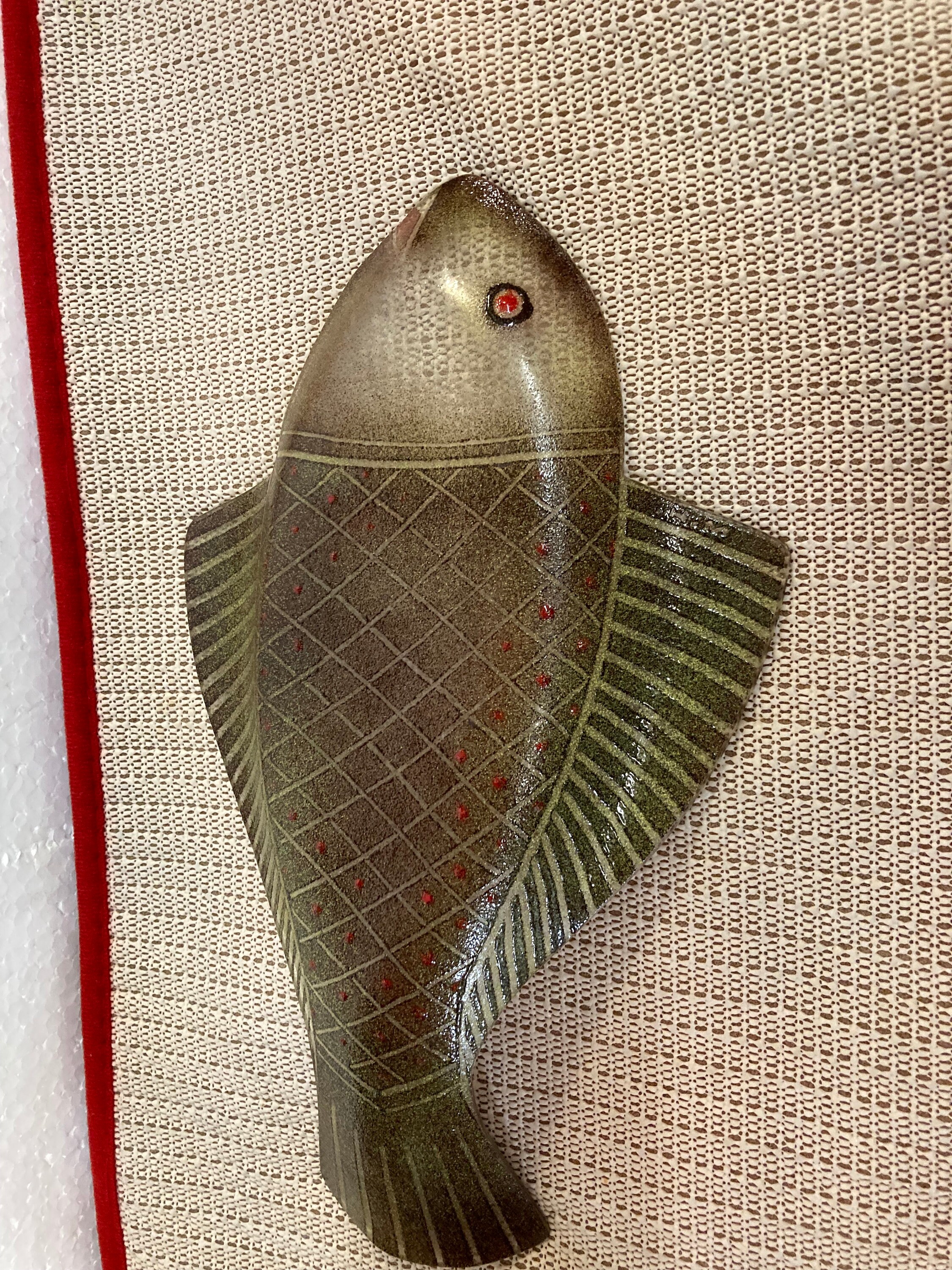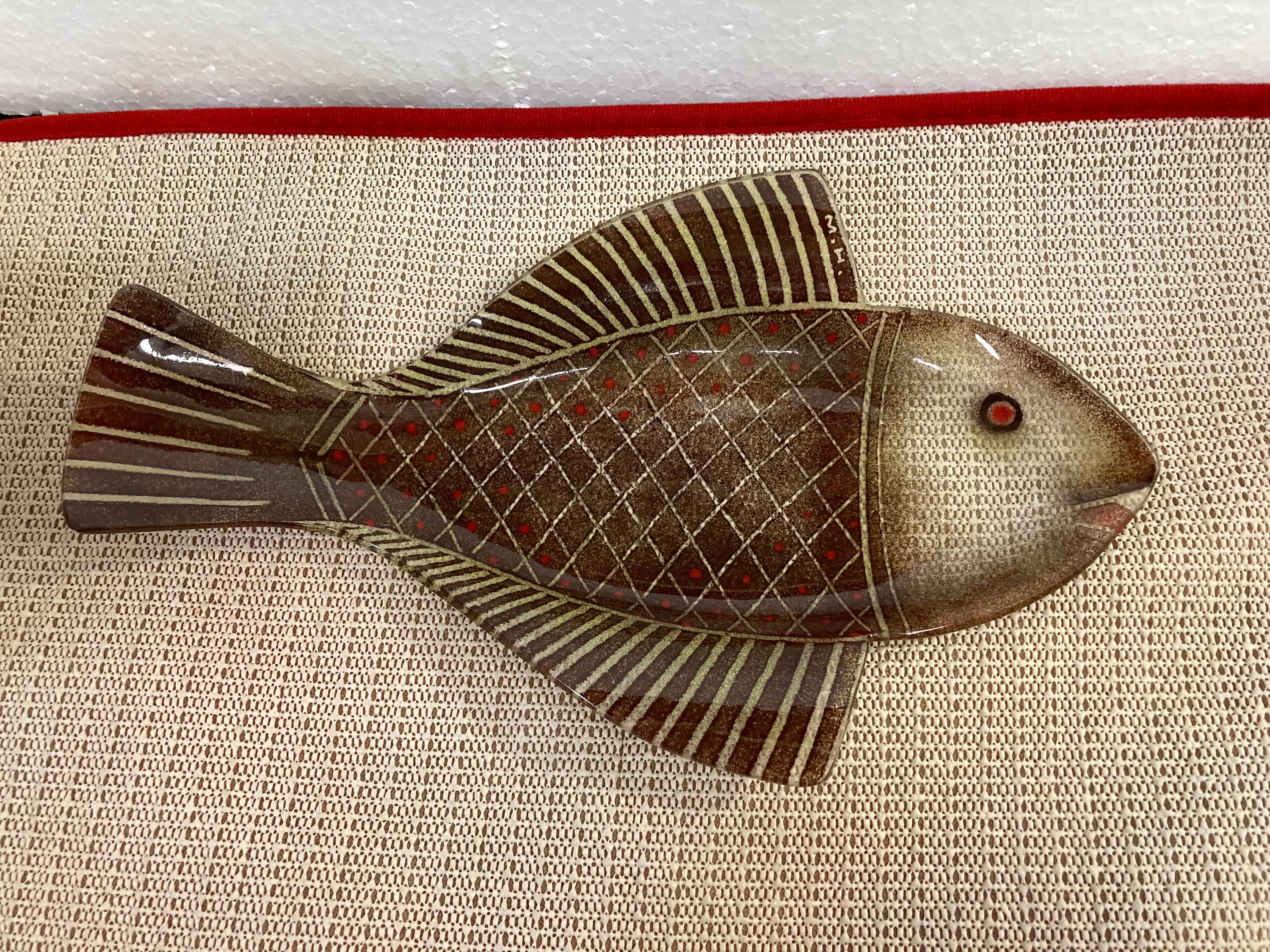 Fish-shaped dish, c. 1970. Green and yellow shades, red dots and red eye with green outer circle, signed: “M.H.” on top fin. Collection of the Museum of American Glass, Wheaton Arts and Cultural Center, Millville, New Jersey