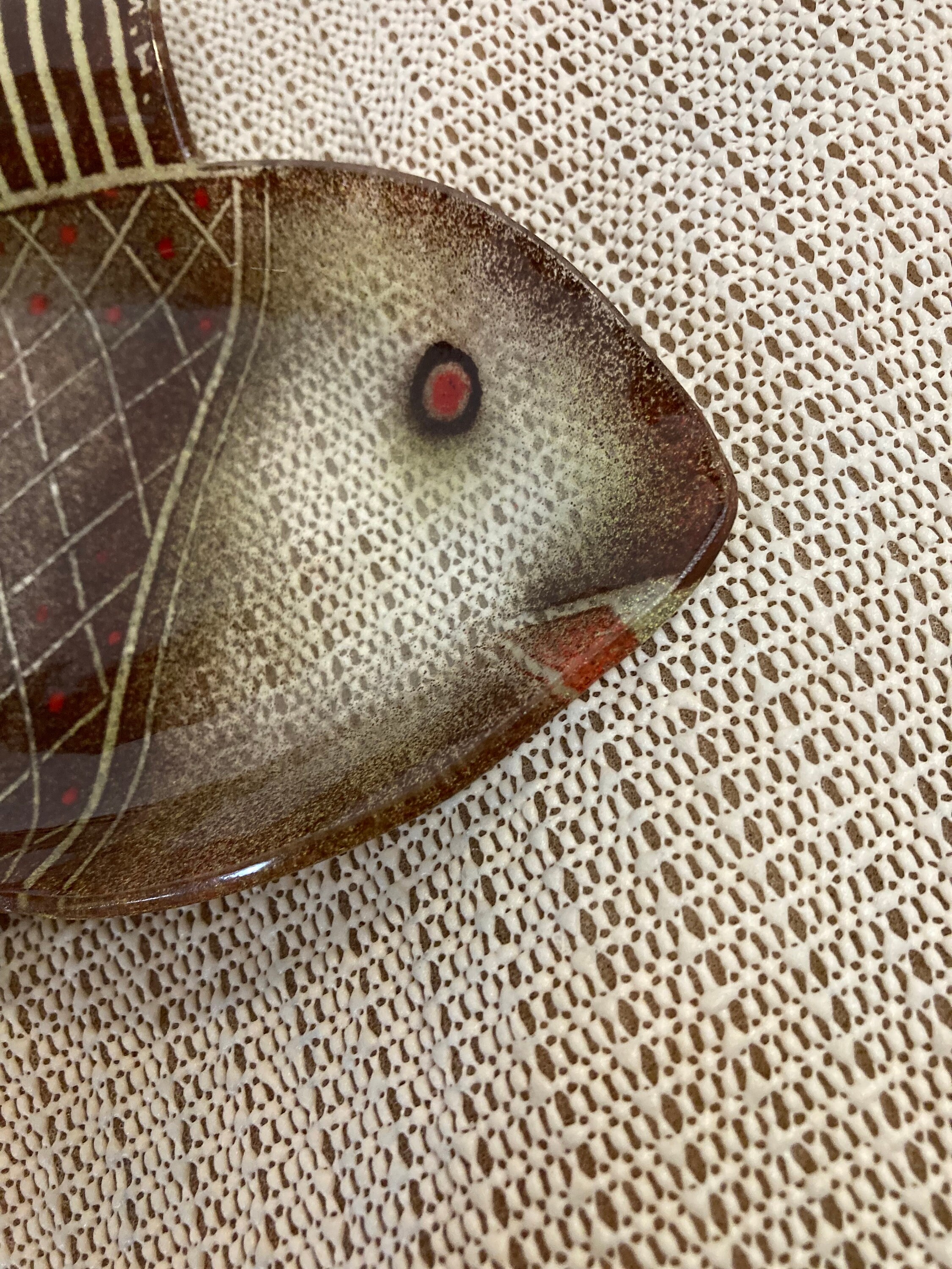 MAURICE HEATON Studio Glass Bird & Fish BOWL Mid-20th Century Decorated in shades of Brown with Red accents. Initialed.