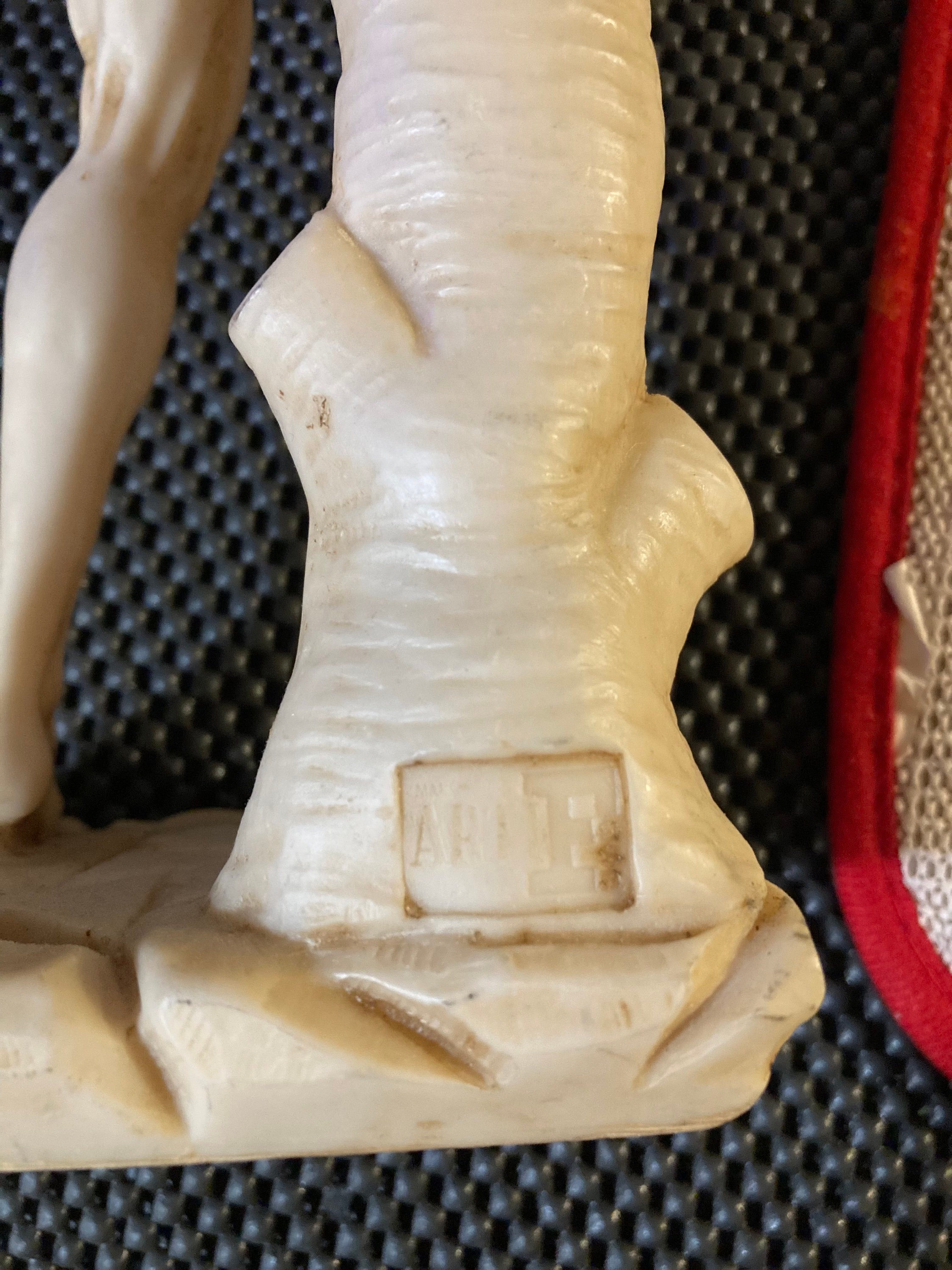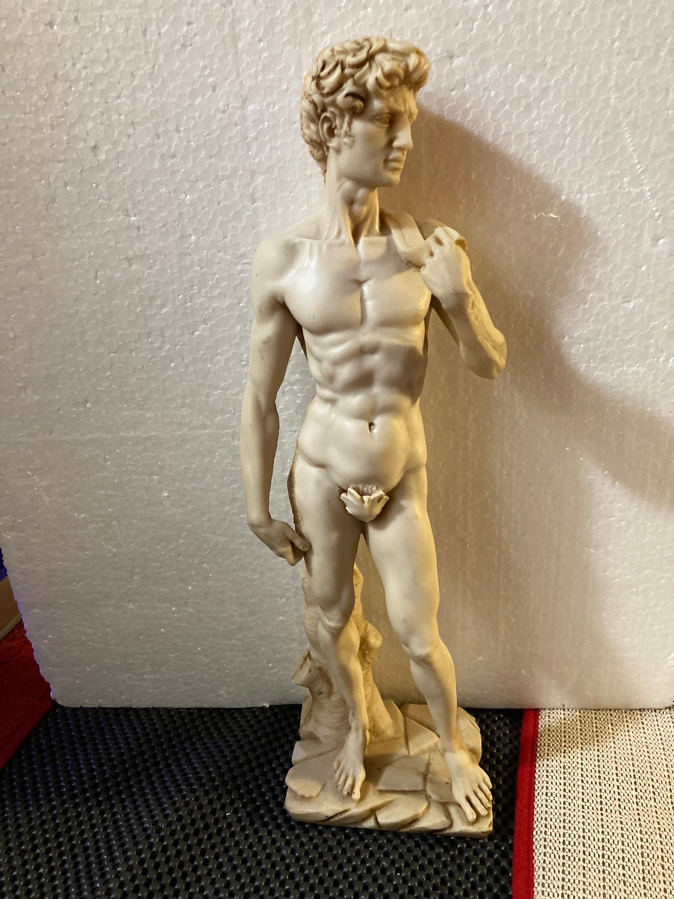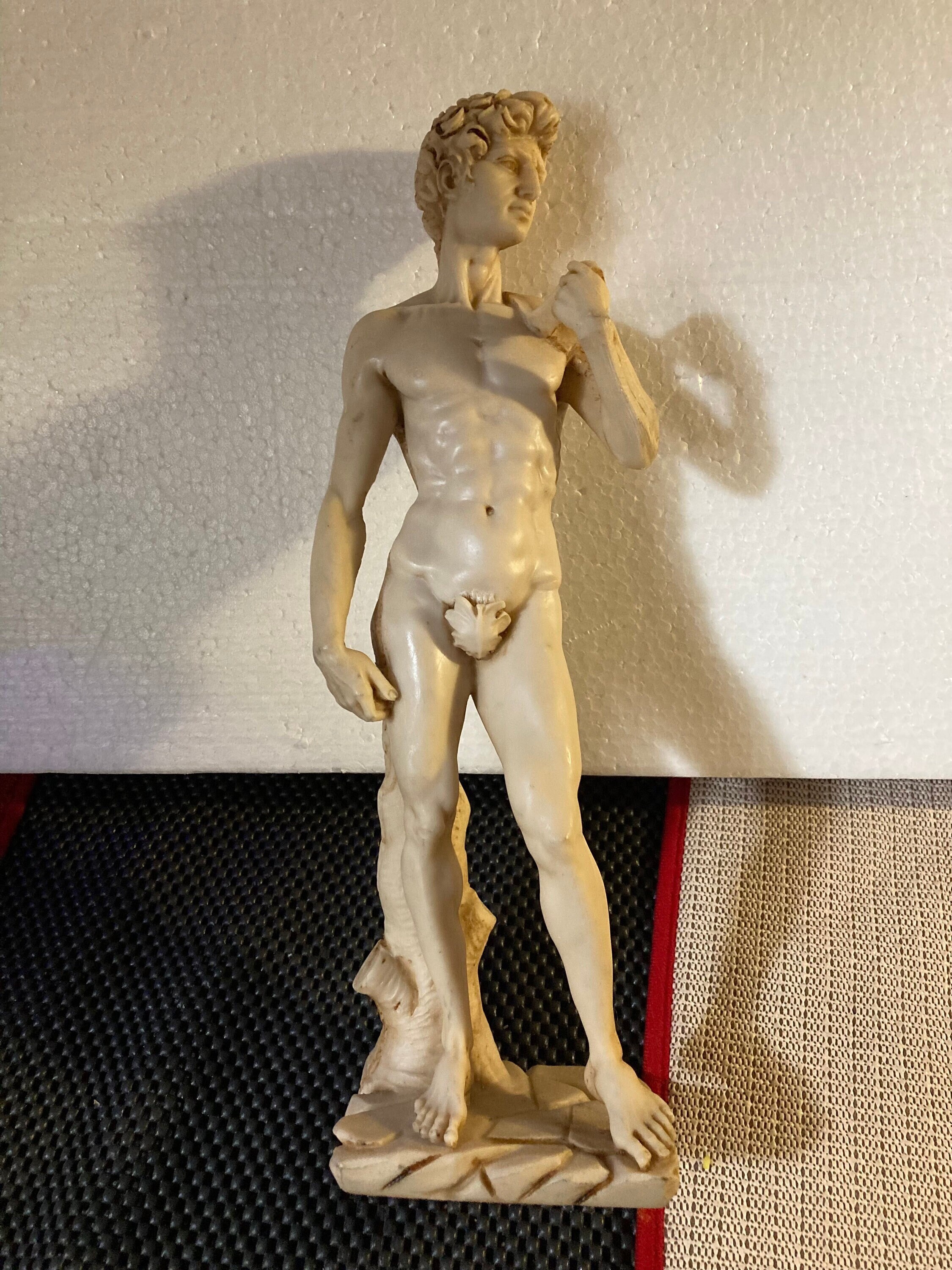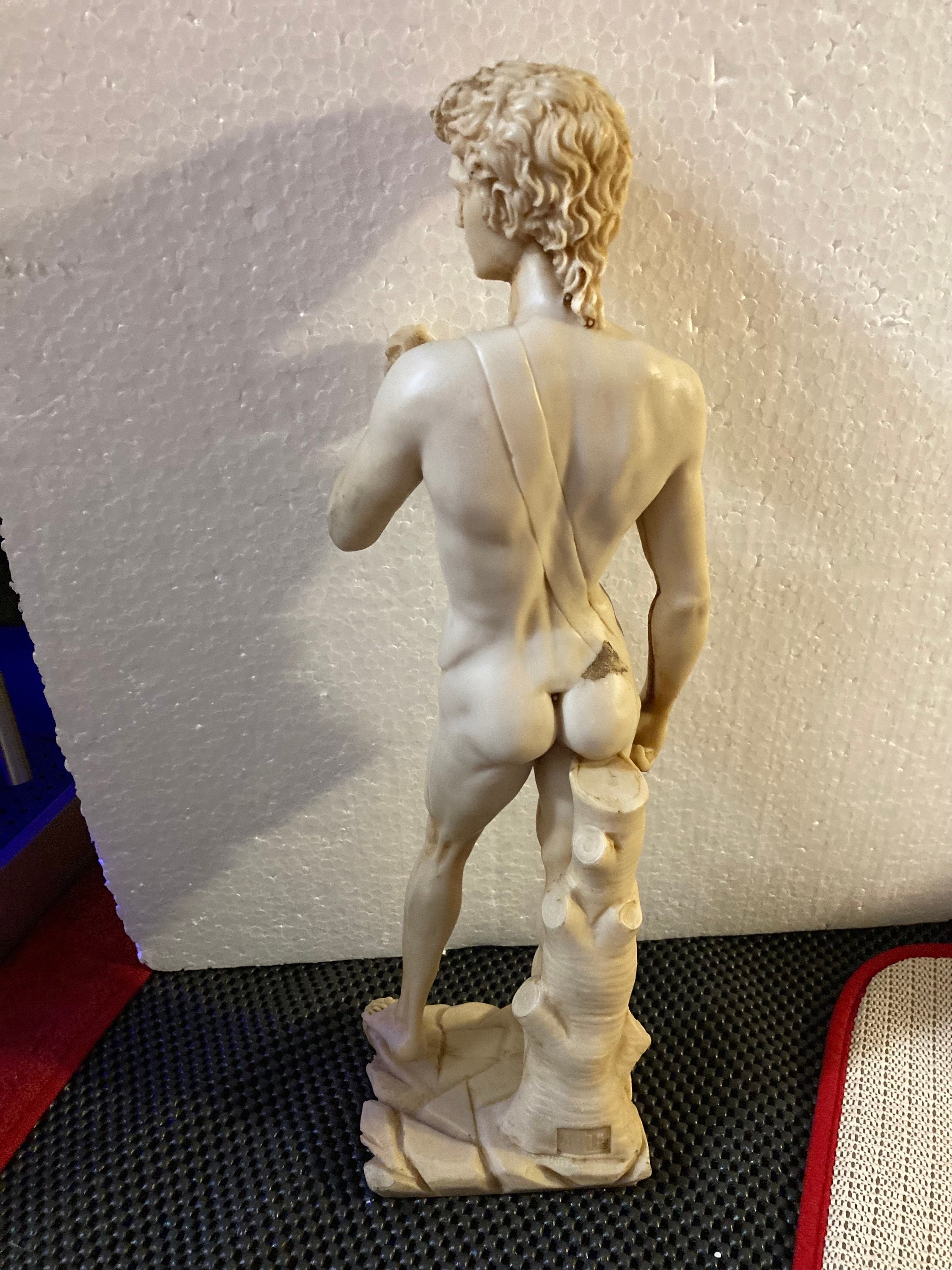Michel Angelo's Classic Fig Leaf Sculpture of David14.5" tall x 4" wide x 3.5" deepMarked " ART F" VintageMaterial made : ResinCondition : Very good without any damages , chips, or cracksWeight :2 3/4 lbs