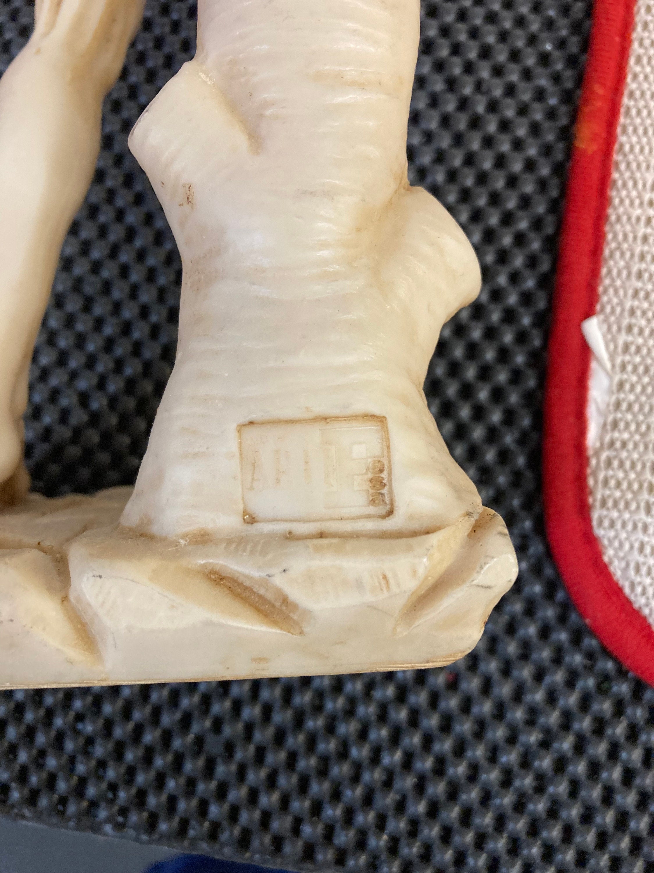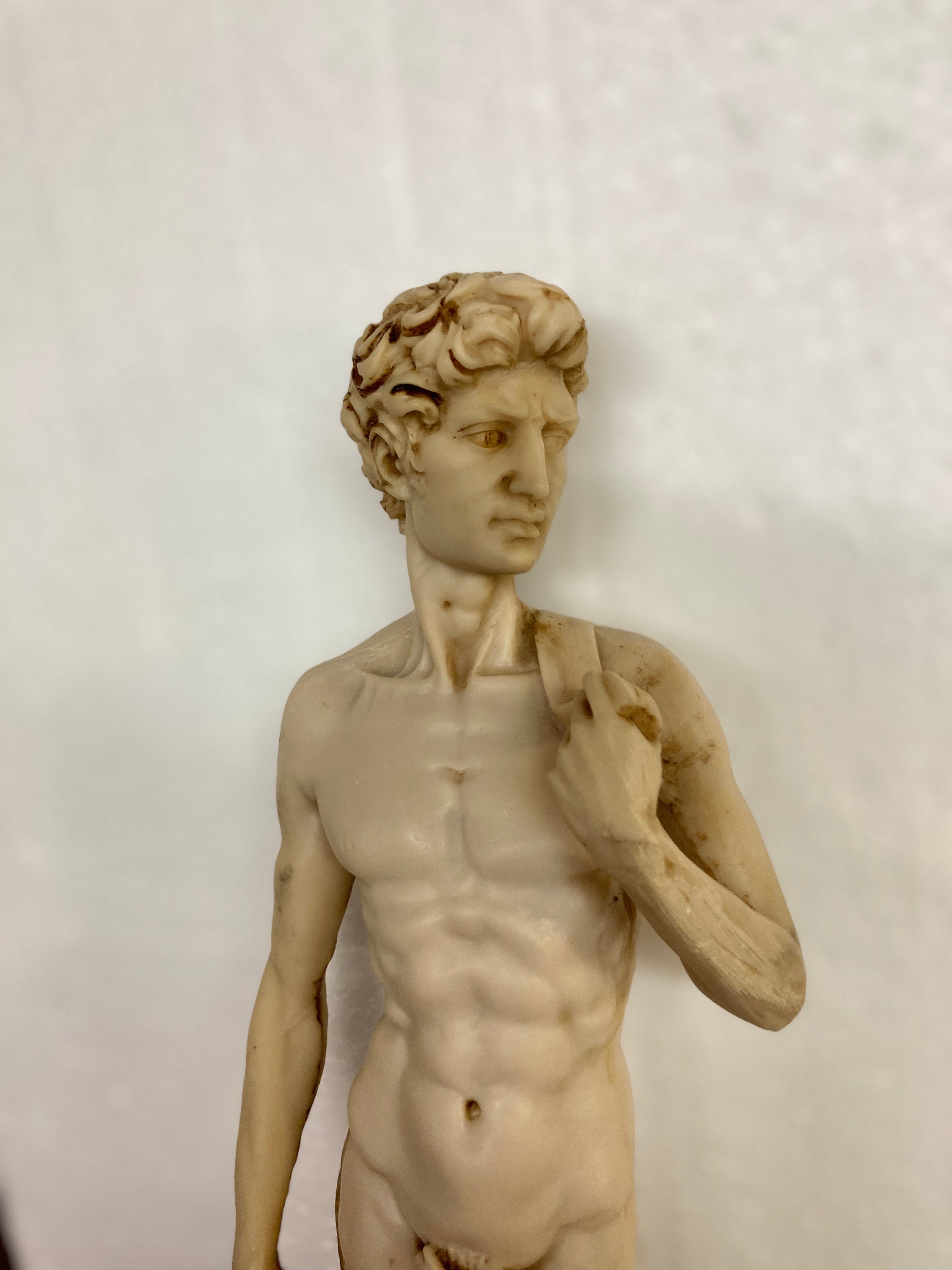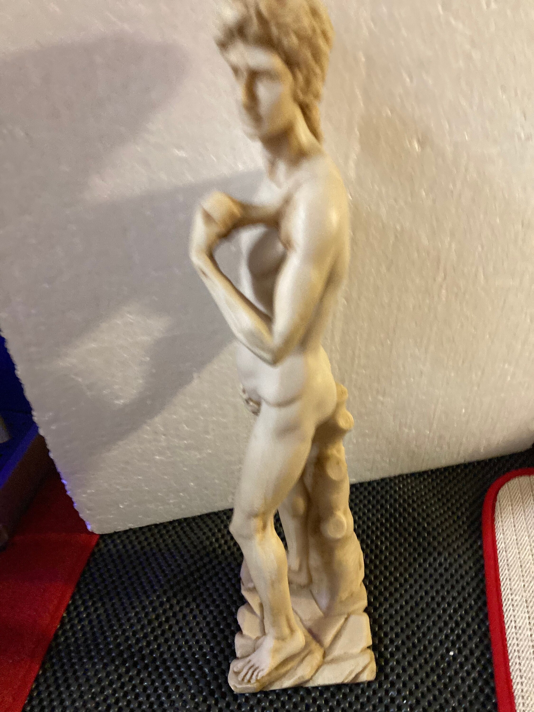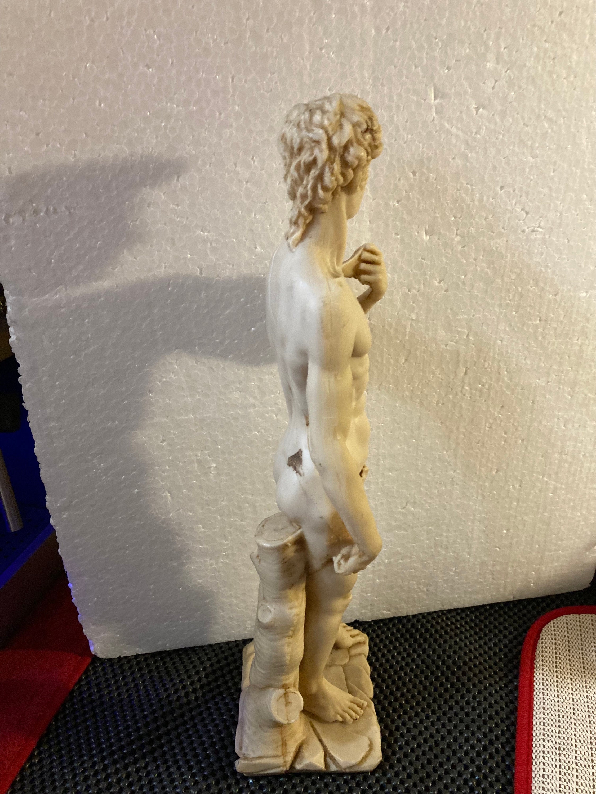 Michel Angelo's Classic Fig Leaf Sculpture of David14.5" tall x 4" wide x 3.5" deepMarked " ART F" VintageMaterial made : ResinCondition : Very good without any damages , chips, or cracksWeight :2 3/4 lbs