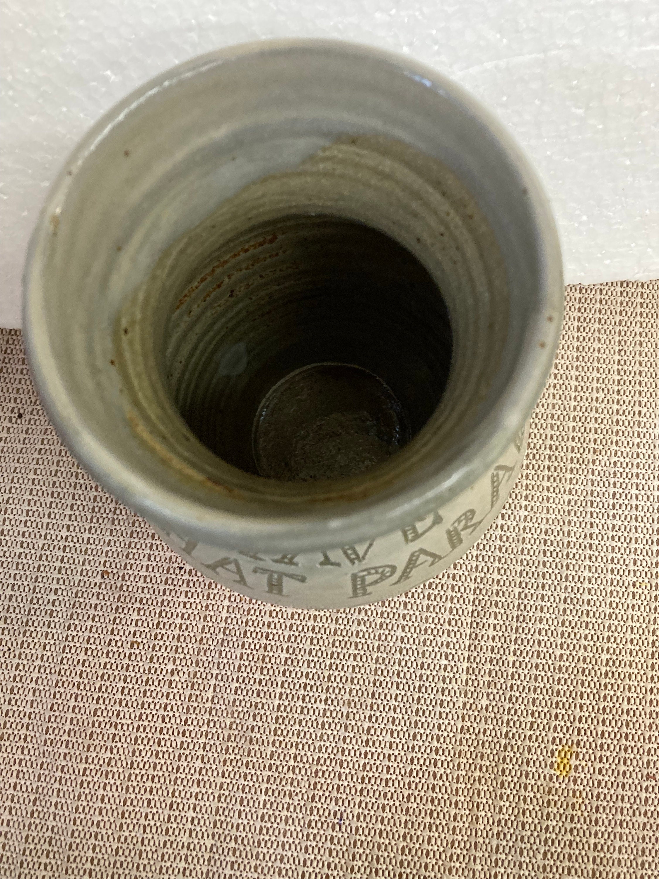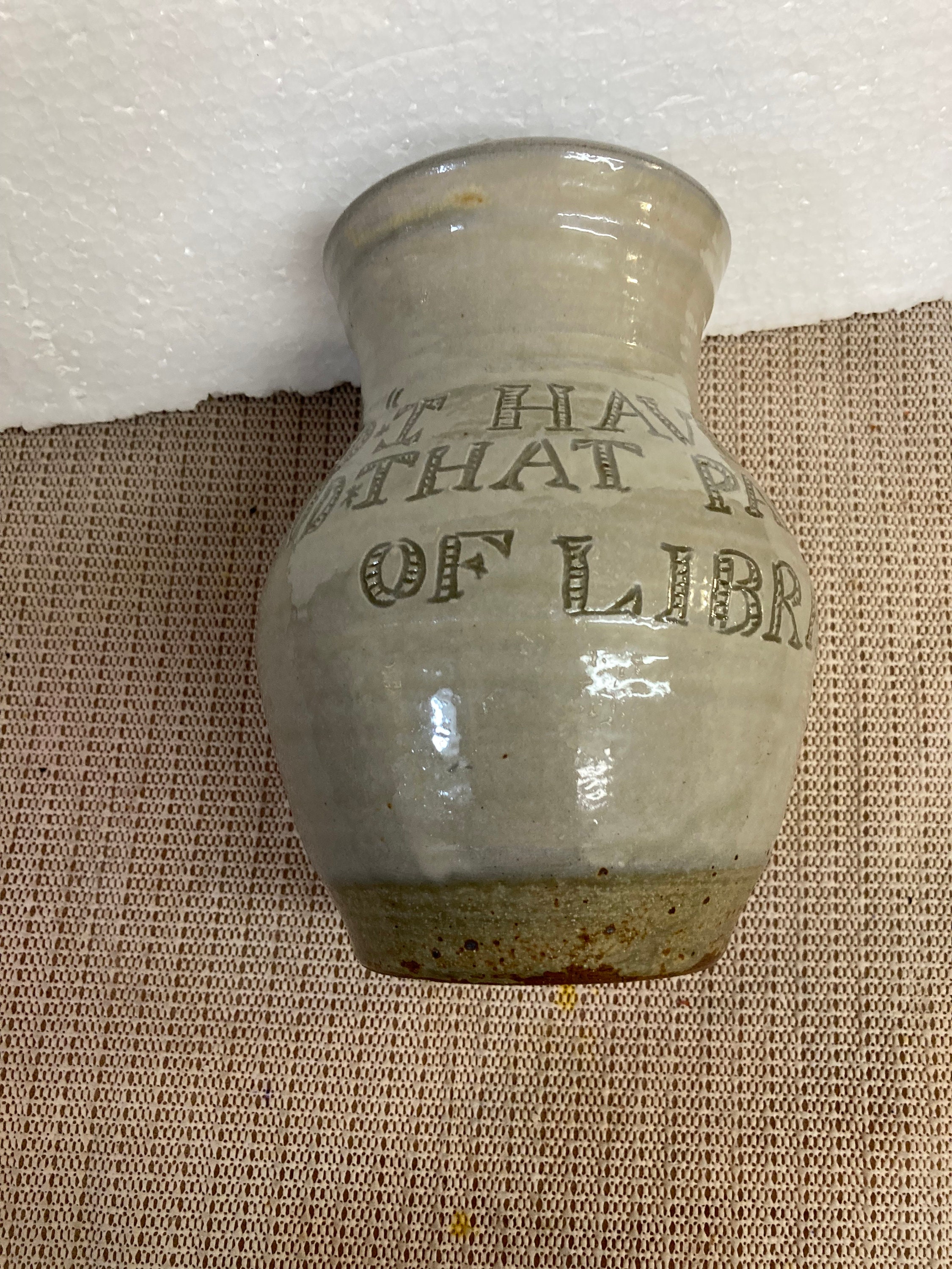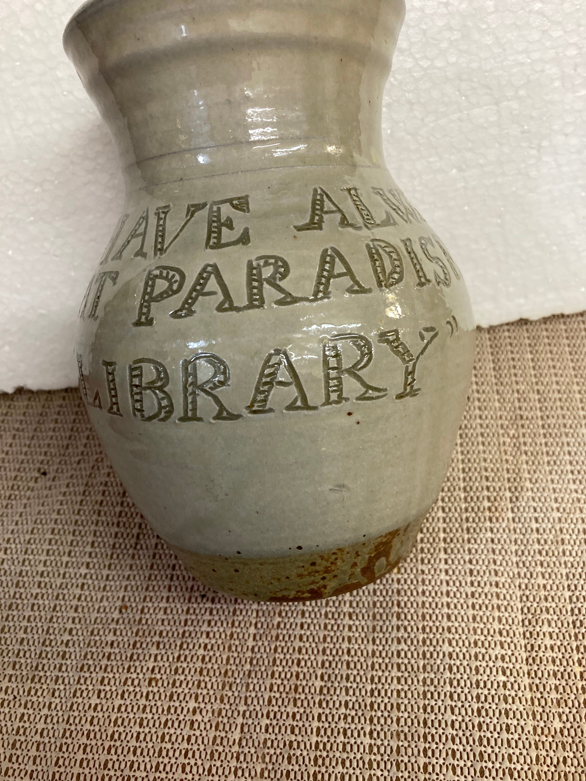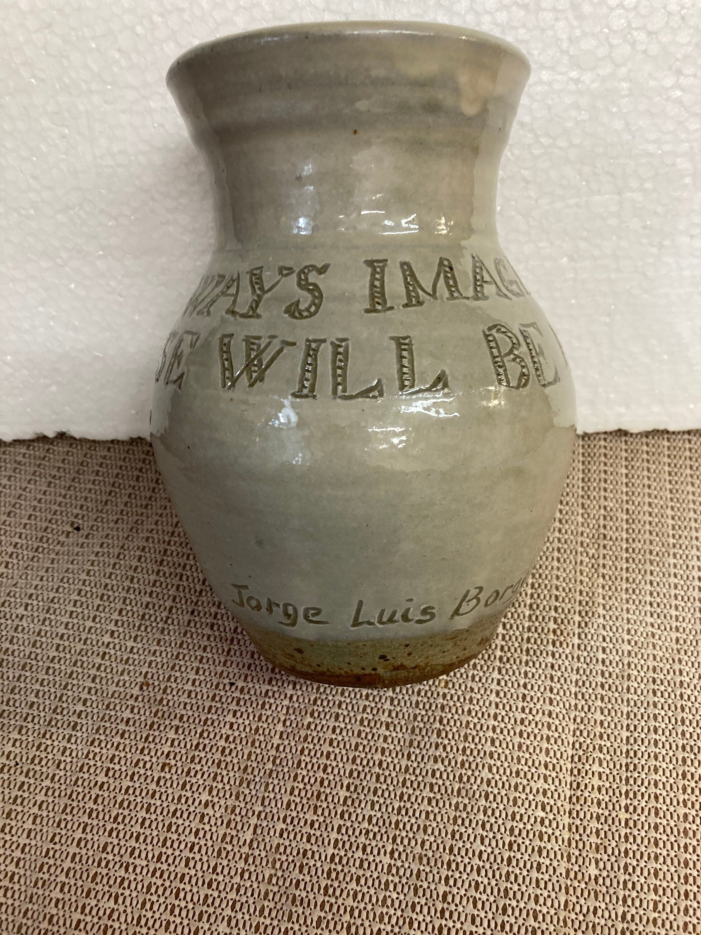 Herold Sandstone Vase, Written on The Vase ;I have Always Imagined That Paradise will Be A Kind Of Library.Jorge Luis Borges7" tall x 4" opening x 3 1/4" Base x 5" Diameter