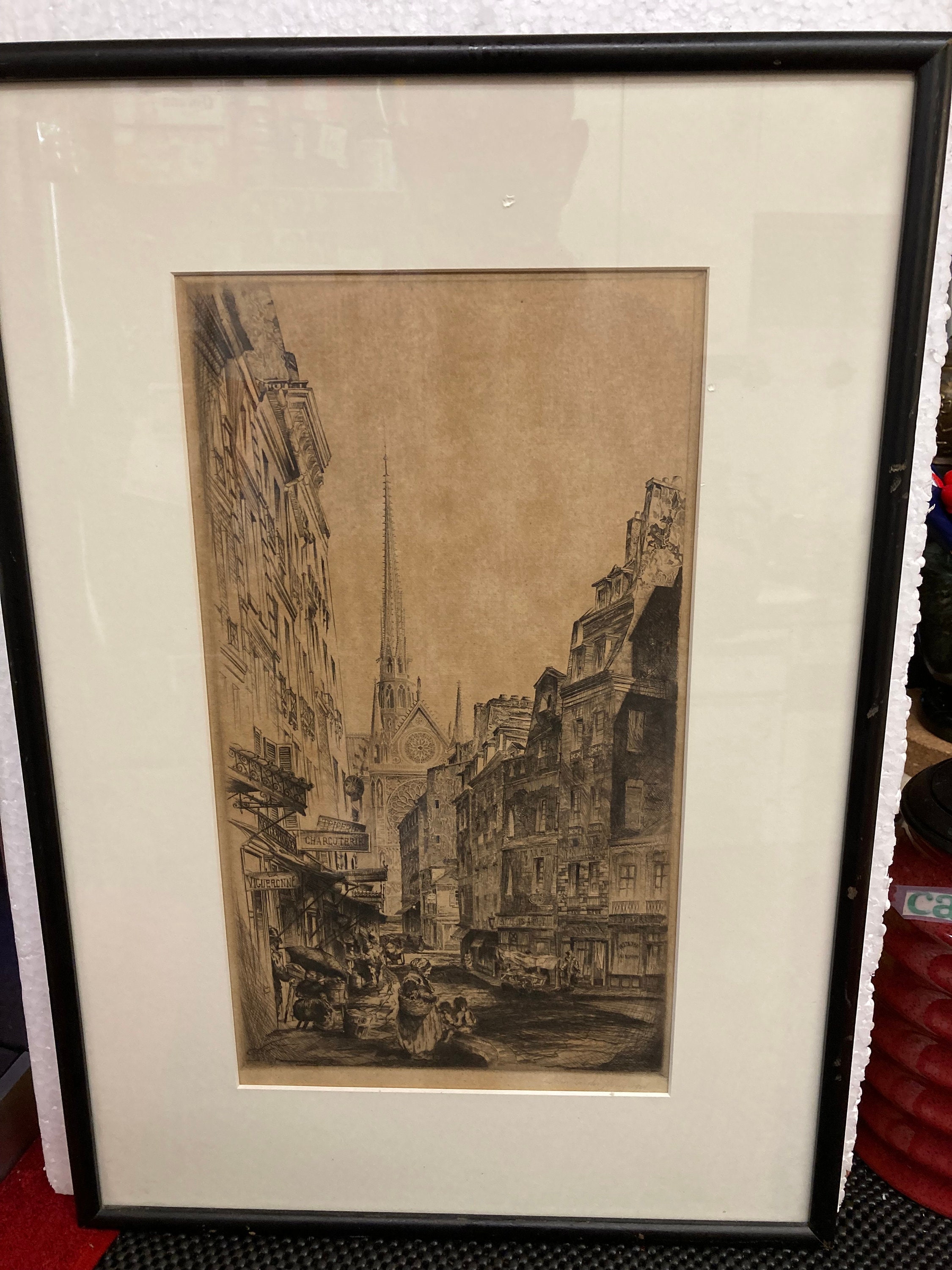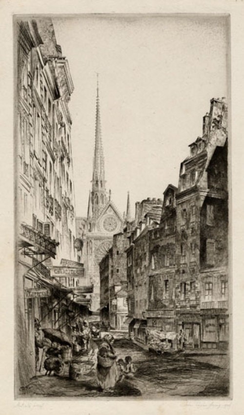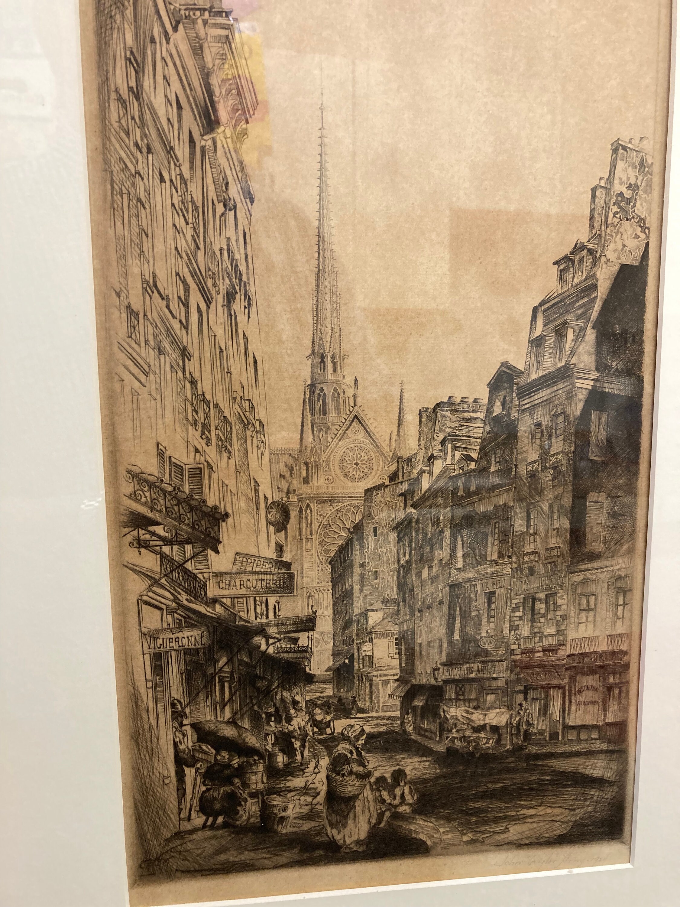 This detailed etching depicts 'La Rue Sauton, Paris. T Each mark and detail is purposeful, giving the viewer an intimate look at these famous landmarks. The artist used sewing needles and magnifying glasses to achieve this level of detail. This piece is sold in wood frame and is signed and dated by the artist in the front.