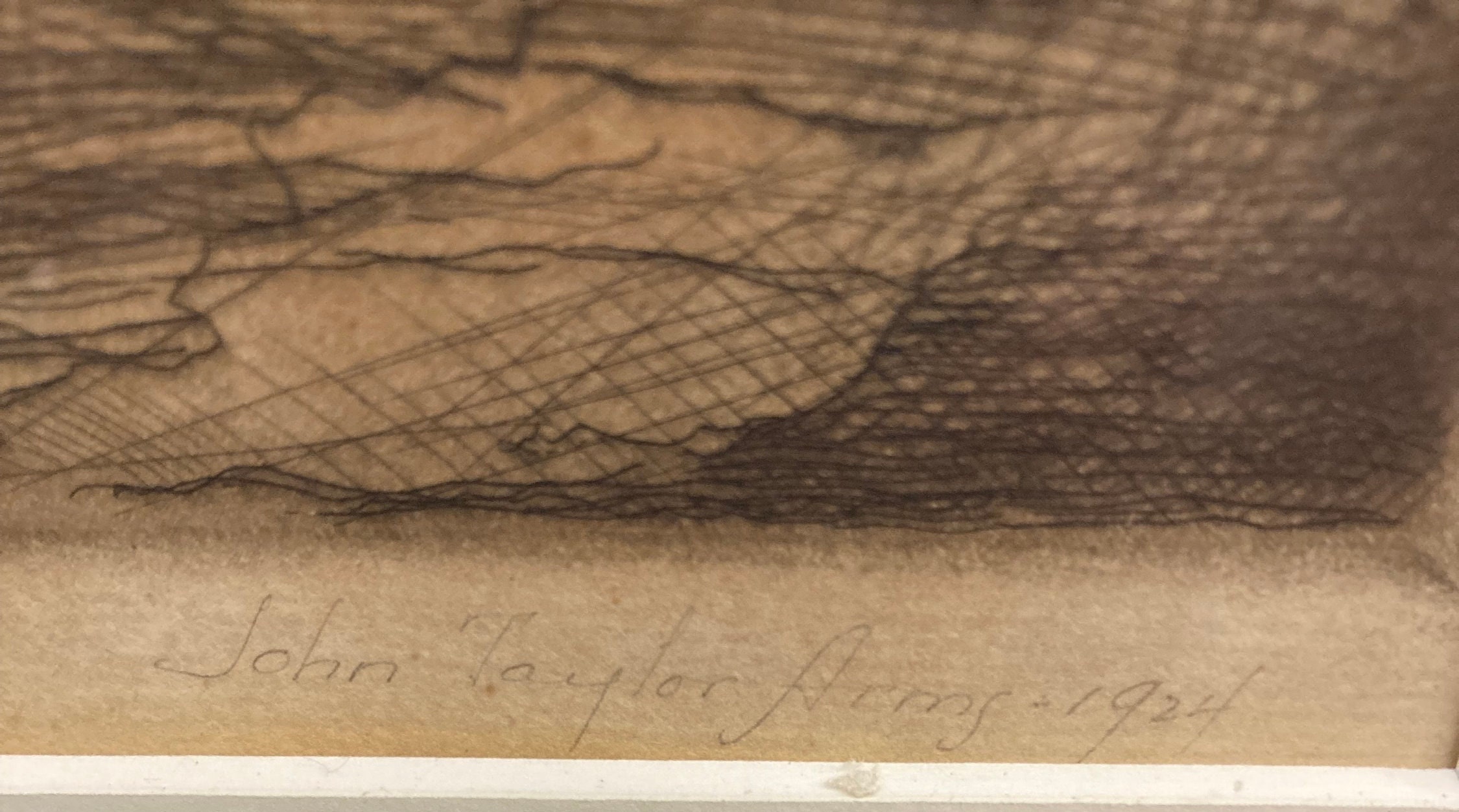 John Taylor Arms is a well-known American etcher whose prints are very collectible. He studied Law at Princeton University, then transferred to the Massachusetts Institute of Technology to study architecture. After WWI, he became a full-time etcher and successful graphic artist. The subjects of his etchings were primarily buildings in Italy and France; he also etched American cities.
