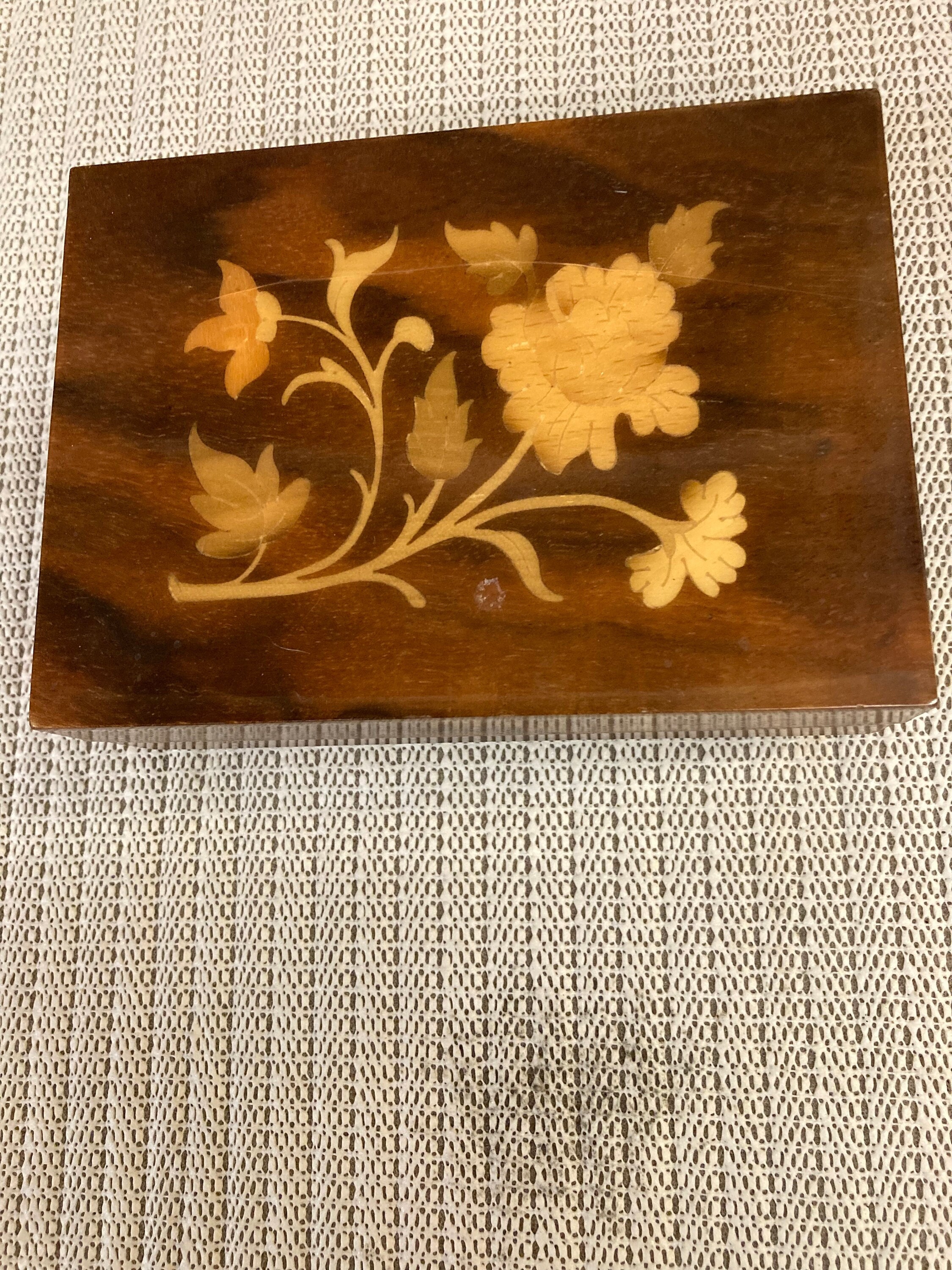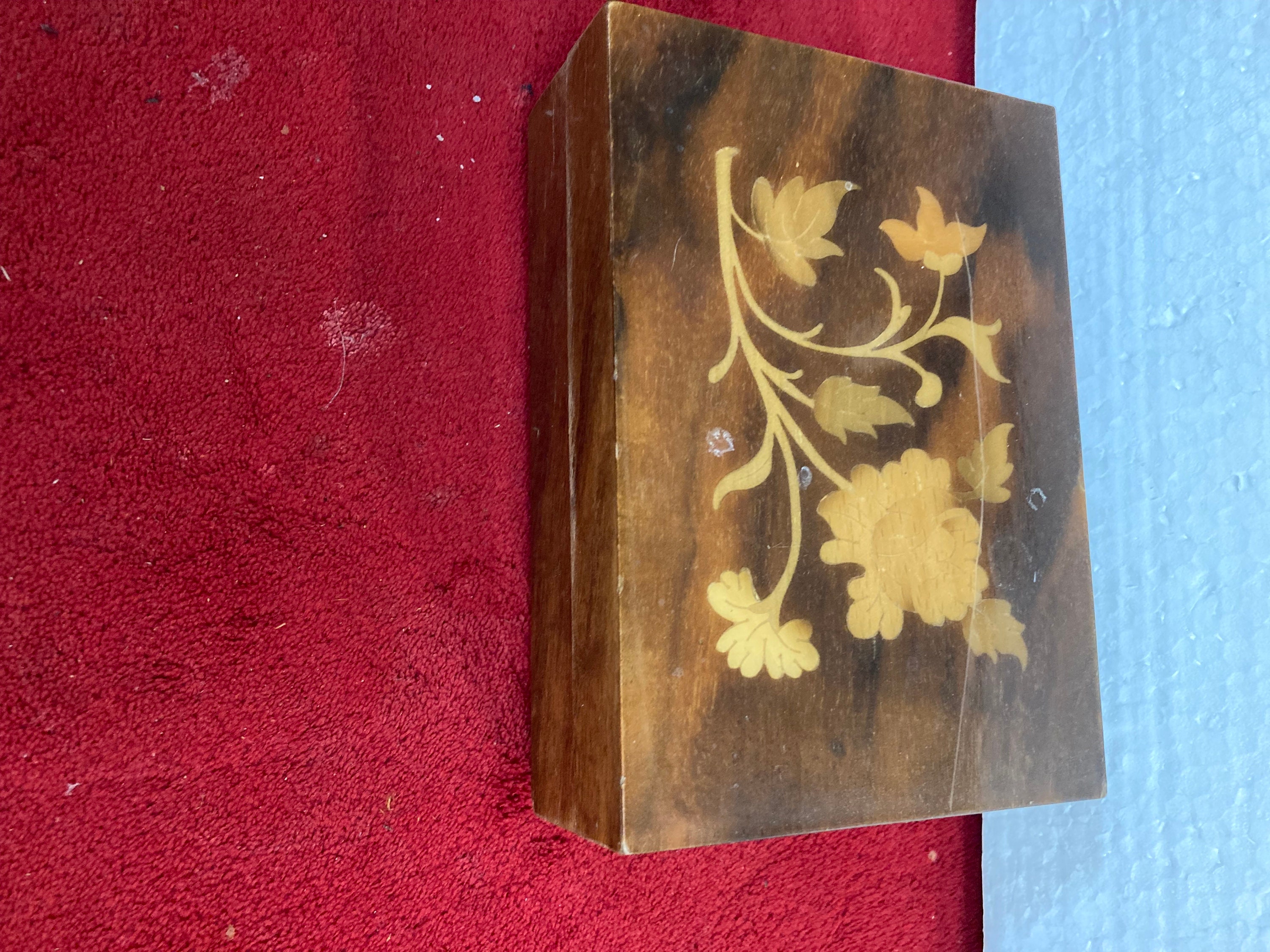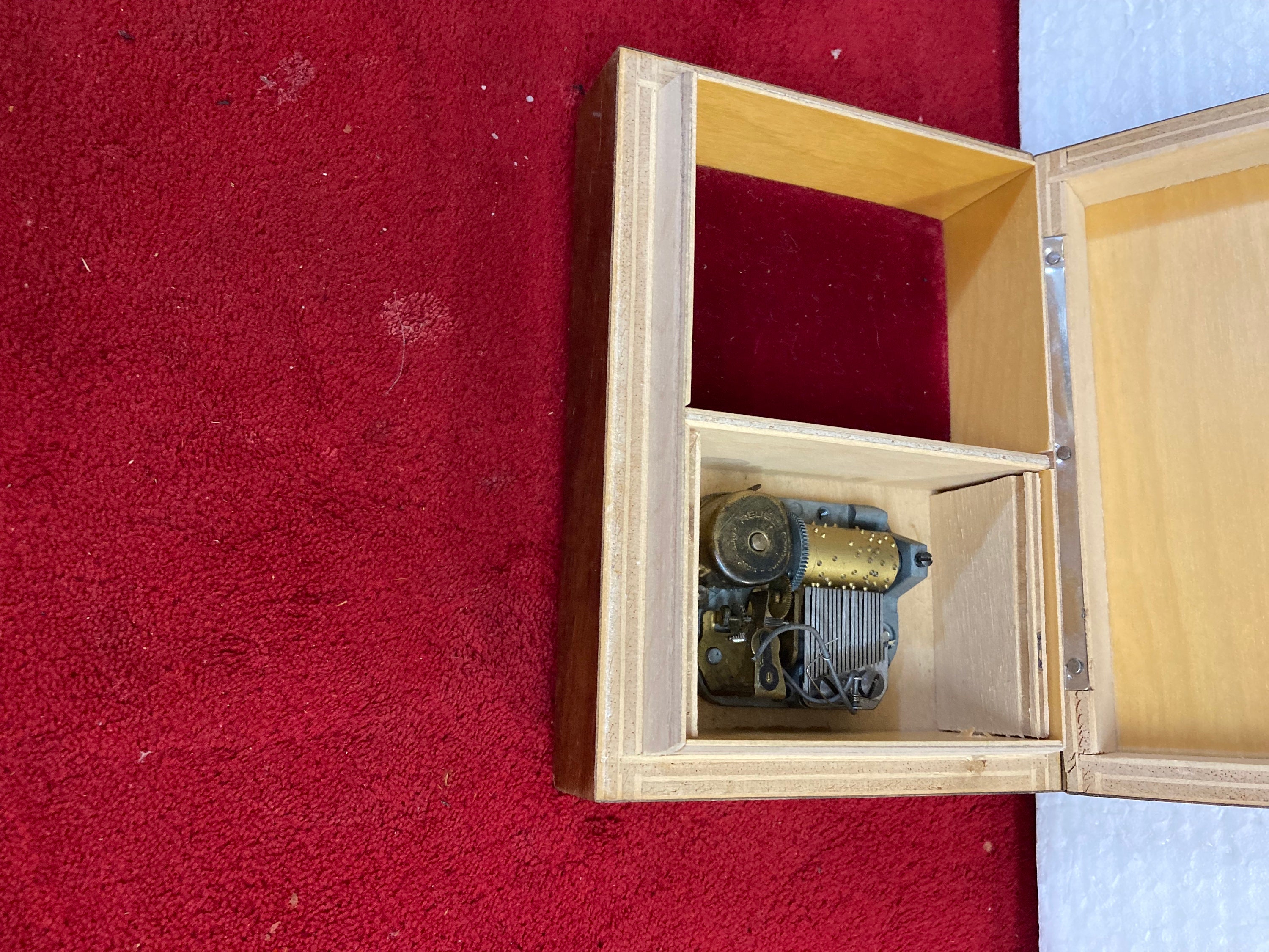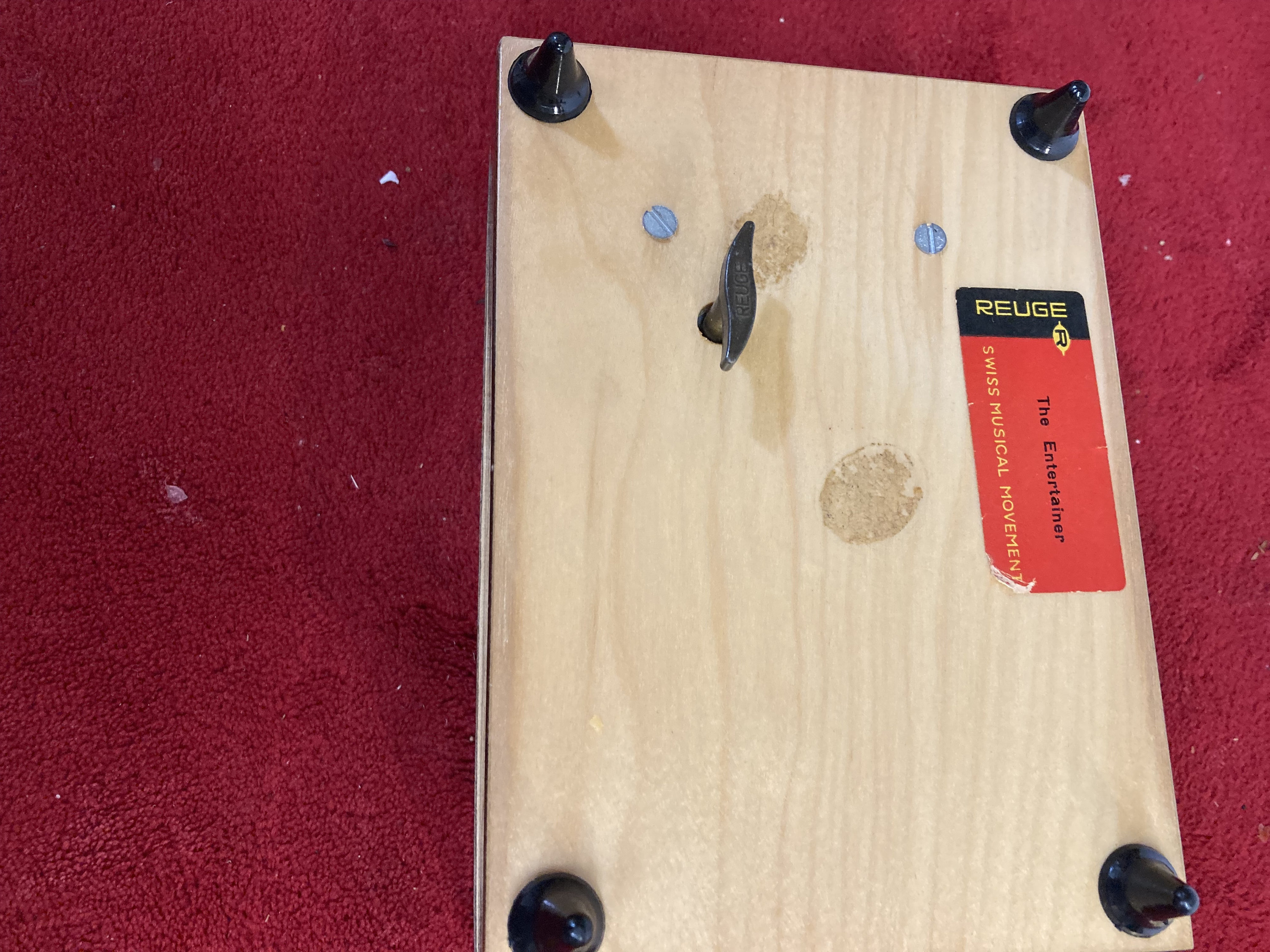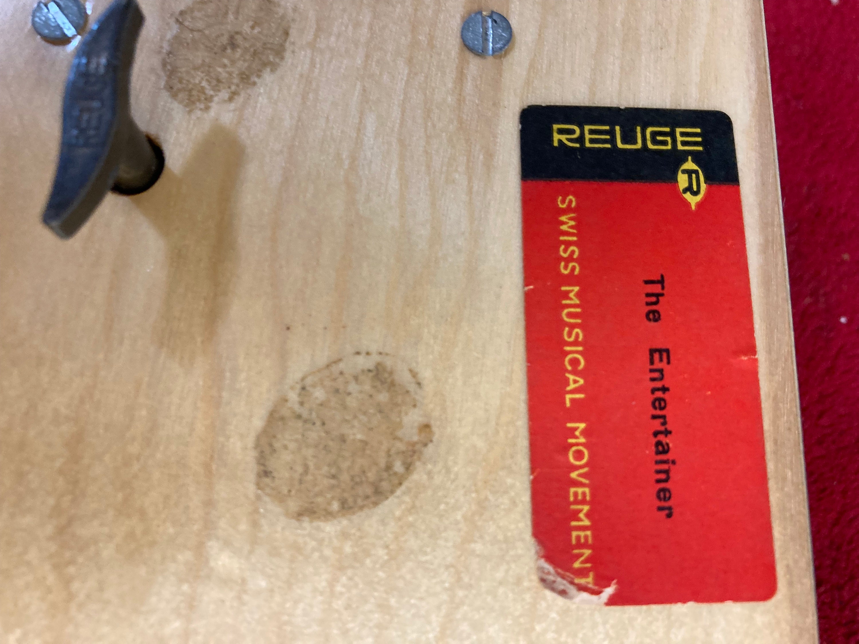 Vintage REUGE Swiss Wooden Musical Box,Jewely BoxPlays The EntertainerMeasurements: 5.5" wide x 4" deep x 2.5" tallCondition is Good red Velvet inside
