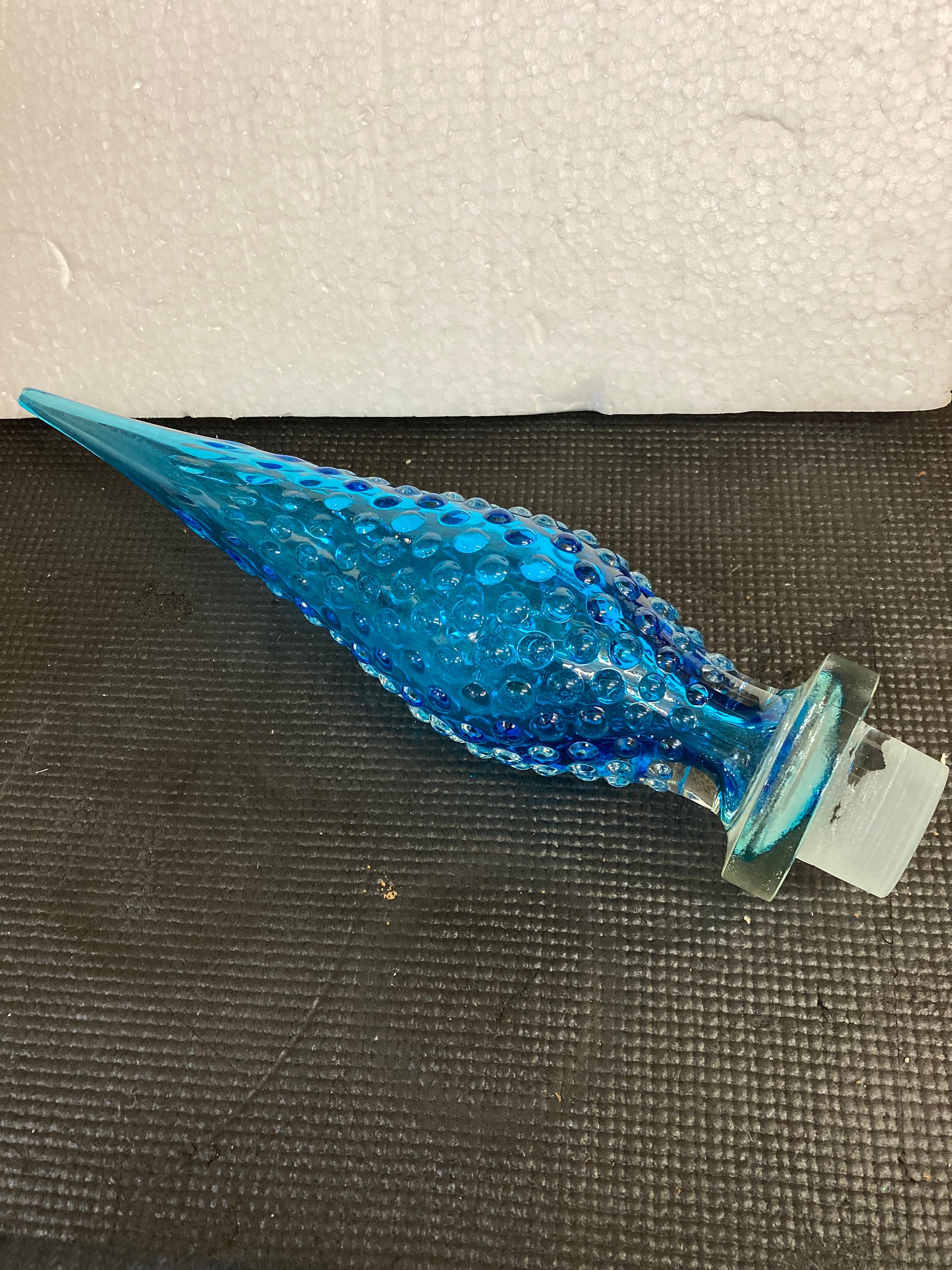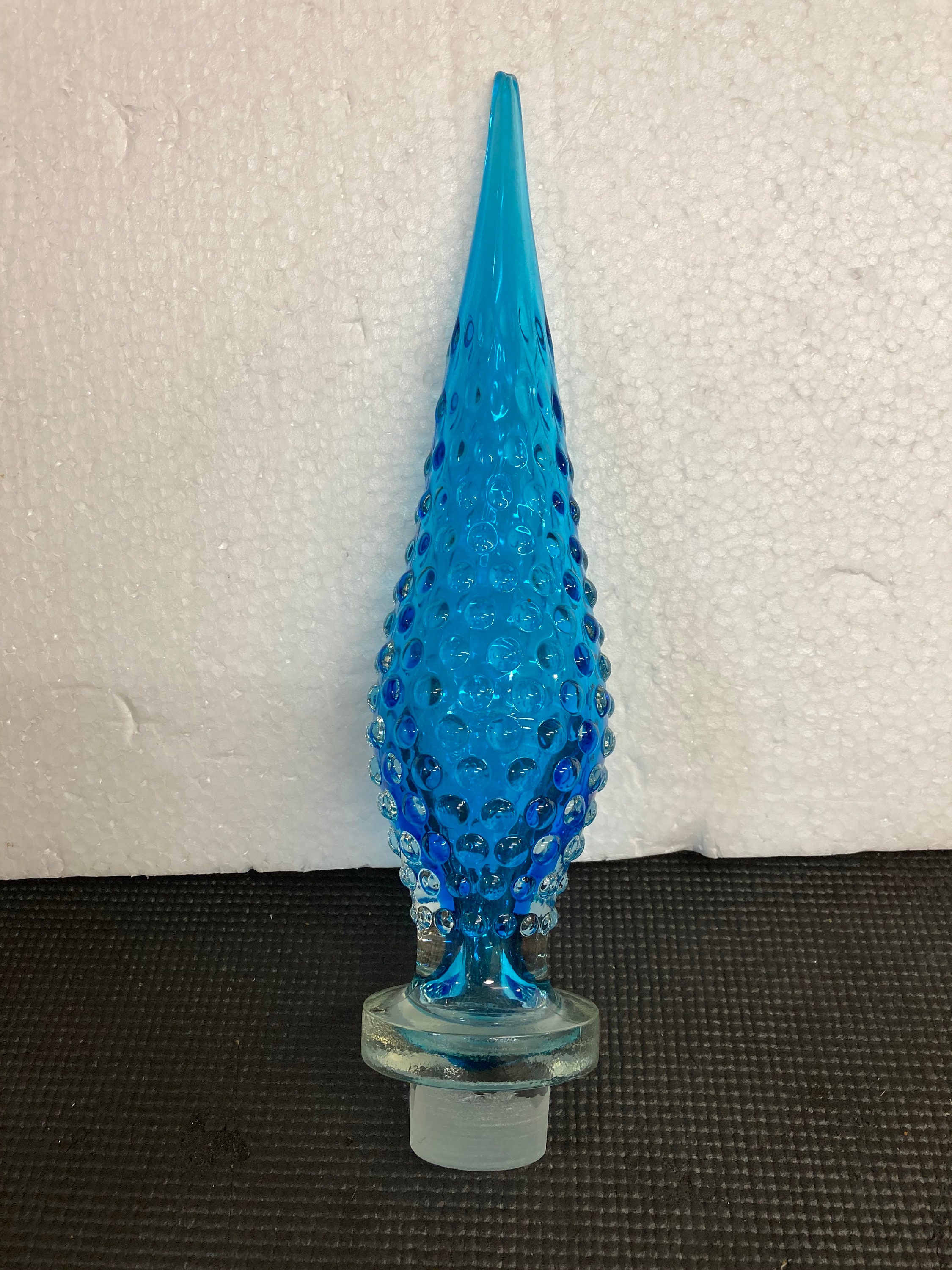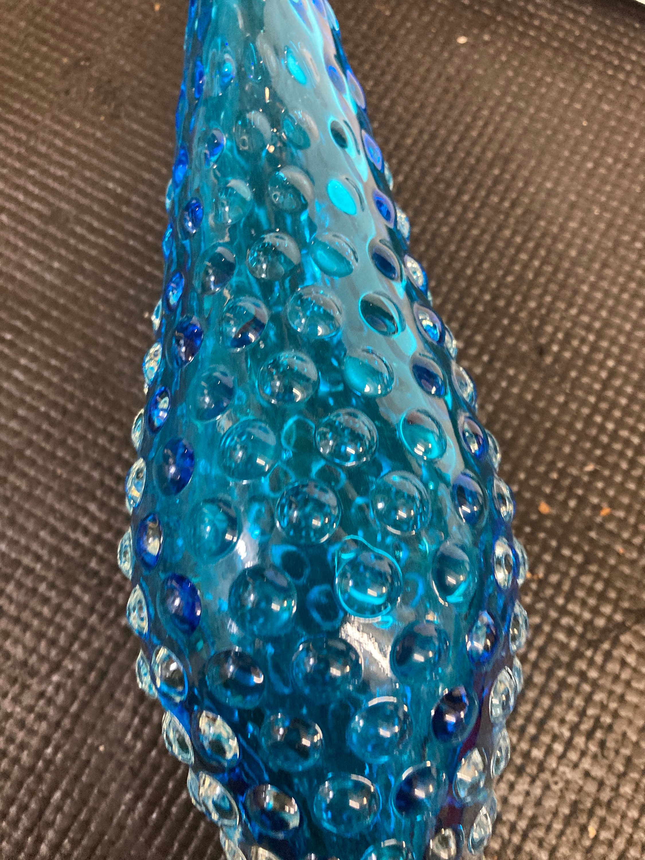 This beautiful Italian art glass Genie bottle with a unique bubble hobnail design is a vintage piece from the Mid-Century Modern era. The blue abstract pattern on the hand-blown glass body gives it an artistic look that can enhance the décor of any room. The bottle comes with a stopper, and its dimensions are 24.5" height ( with Stopper) x 9.5" width, with a weight of 6.25 lbs.