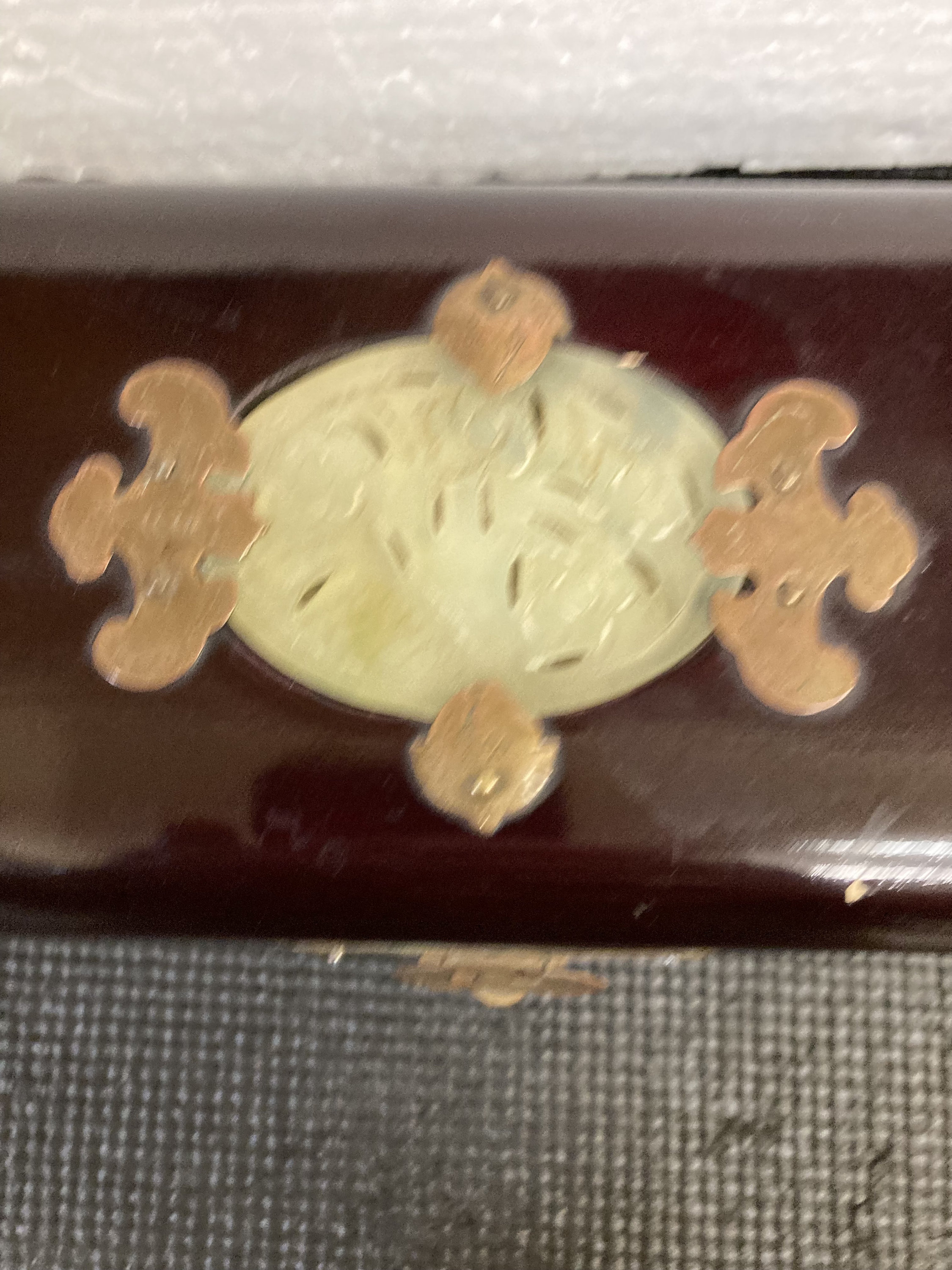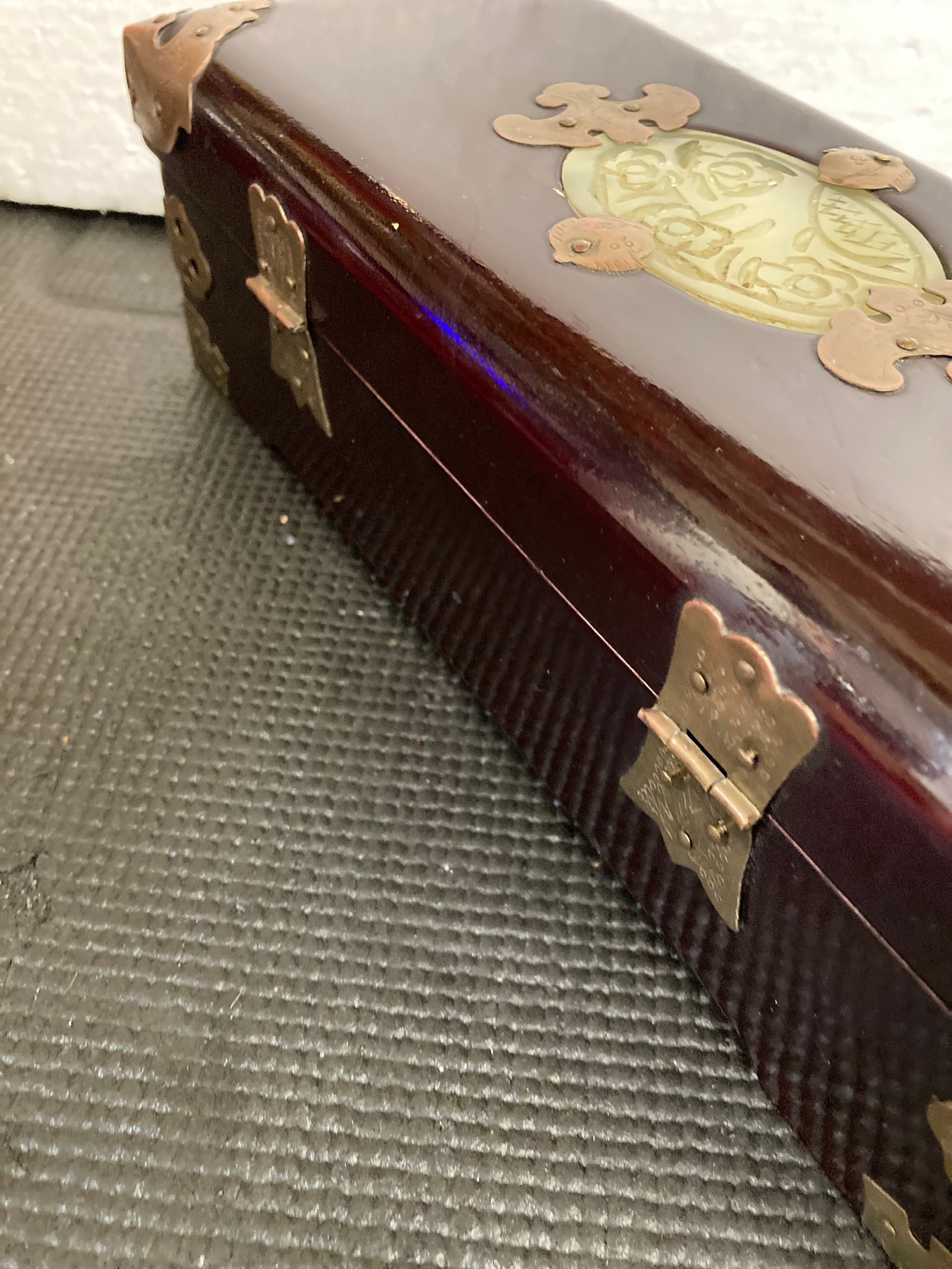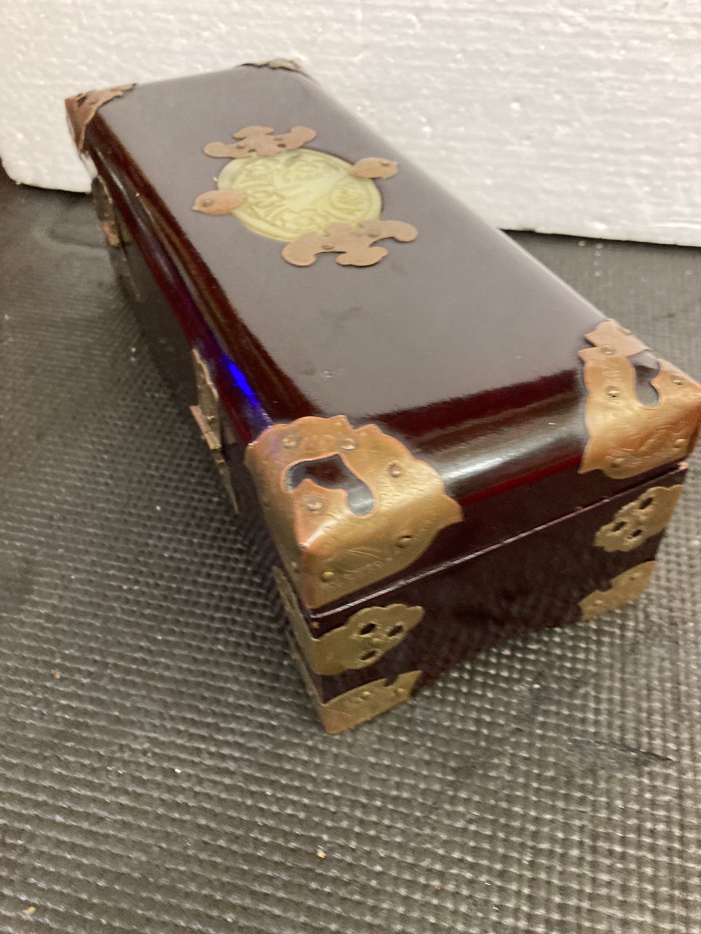 Vintage Jade Wood & Etched Brass Treasure Trinket Box 10 " W x 4" D x 3-1/4" T