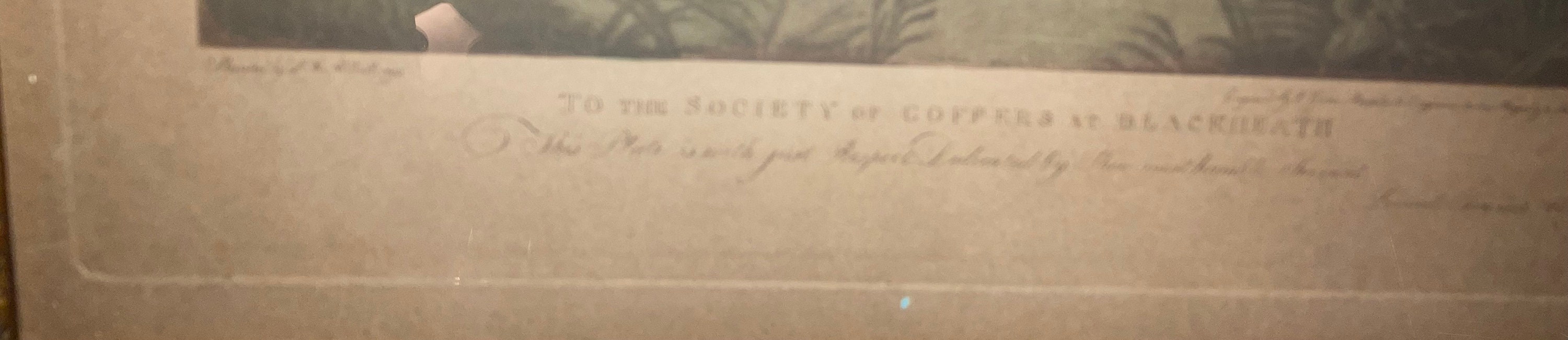 Based on the paper type, printers margin and footer details we believe this to be an early print circa 1800. I don’t believe this is one of the original 45 copies produced for members of the Blackheath Society It was reproduced/resized several times throughout the later Victorian/Edwardian era.