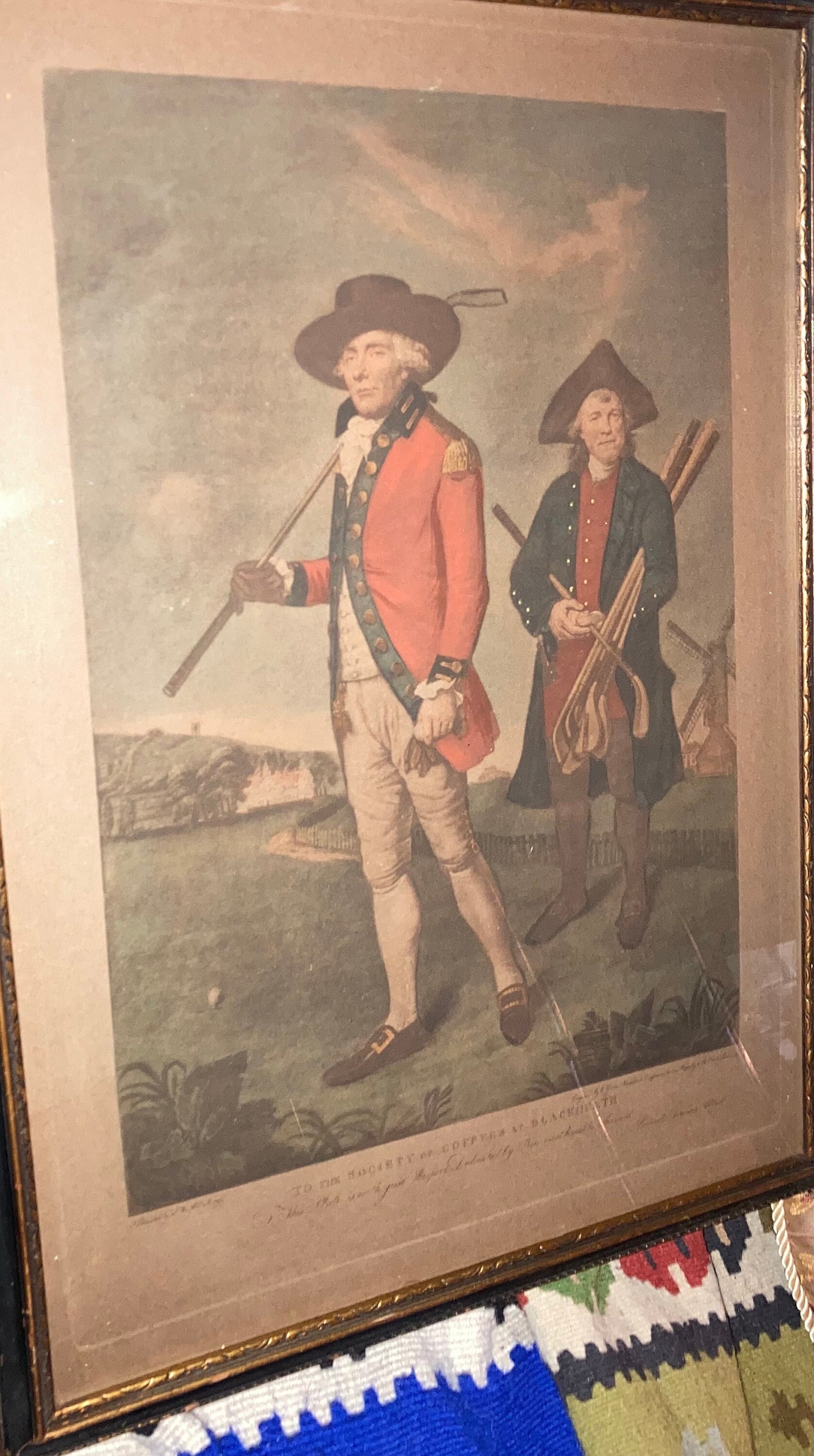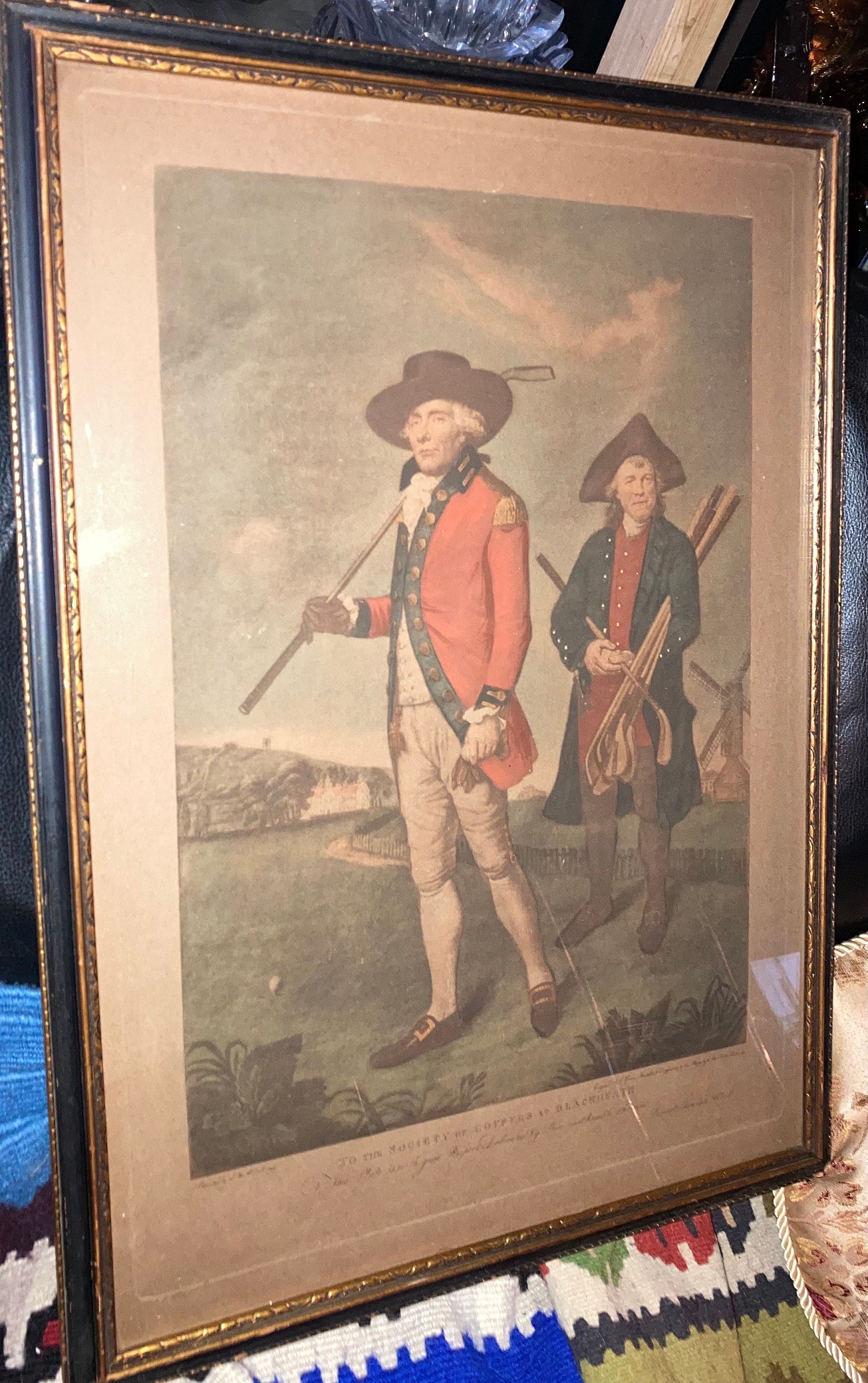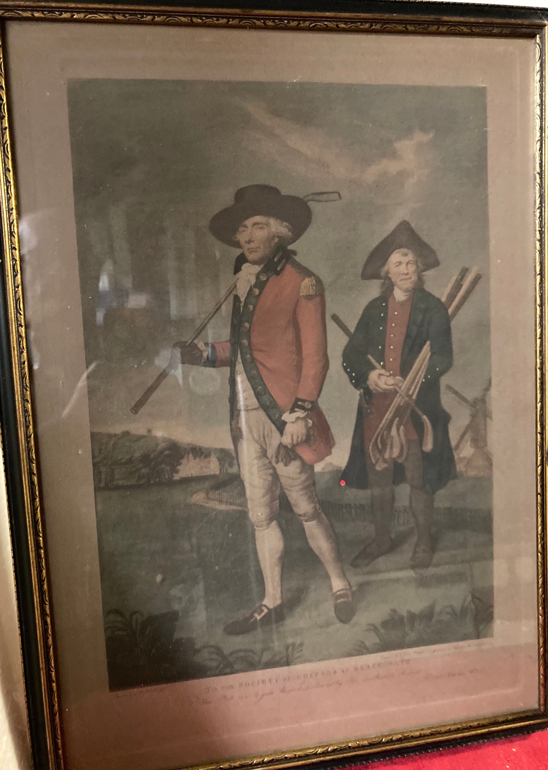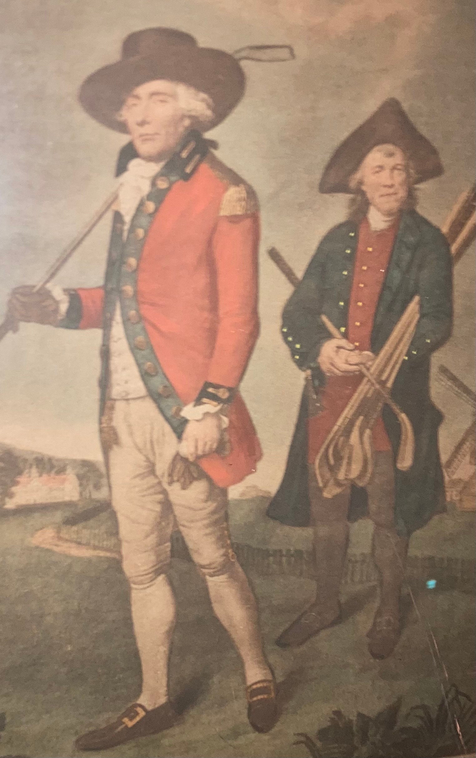 Thought to be one of the first golf portraits ever to be widely published, the Blackheath golf course depicted in the print was a basic five-to-seven-hole golf format, its members being wealthy merchants. Society records tell us the Blackheath club had 45 members at the time depicted in this print. The print itself shows Captain William Innes (1719-1795), captain, and an unnamed Greenwich Hospital Naval pensioner serving as caddie.