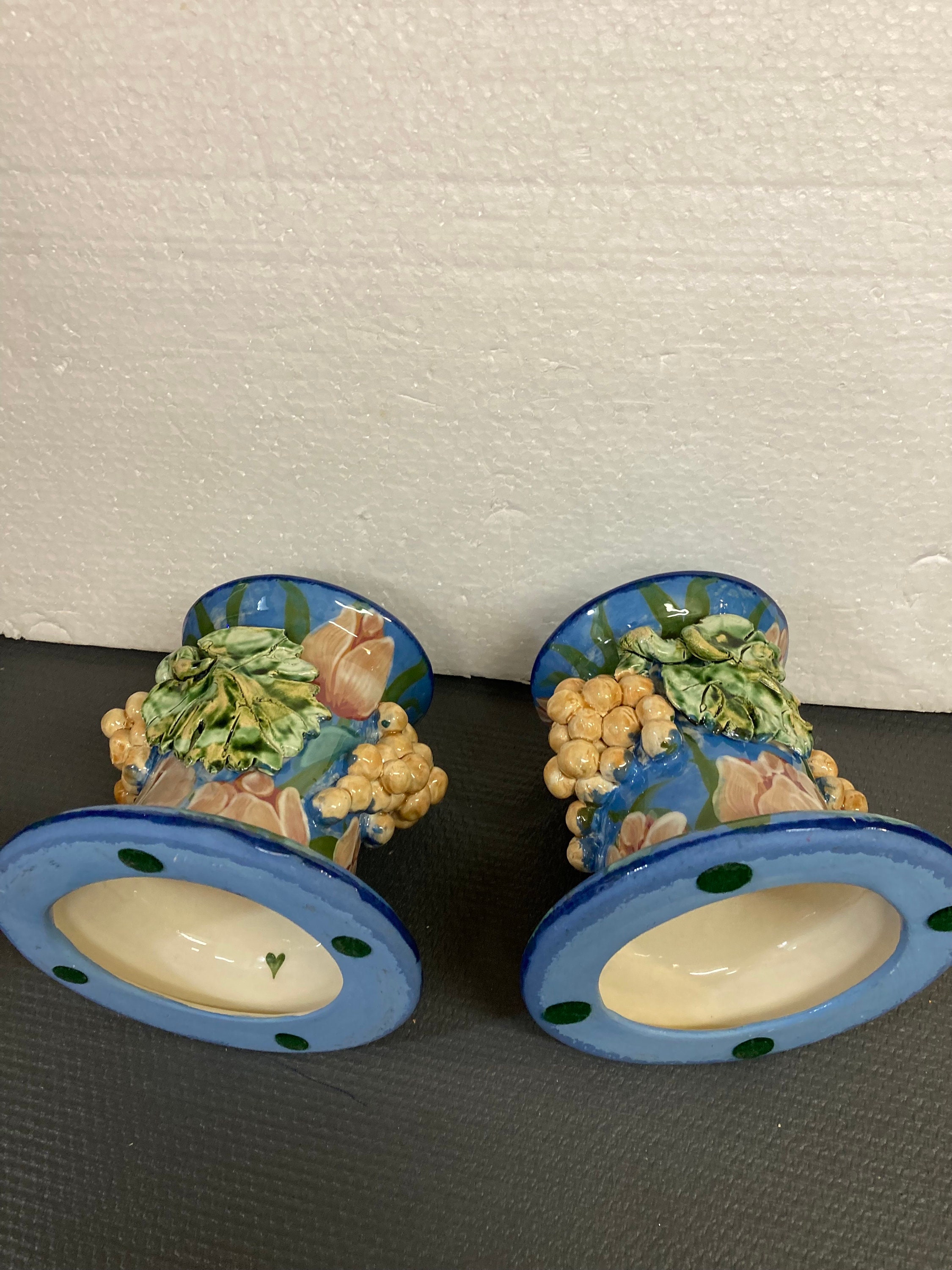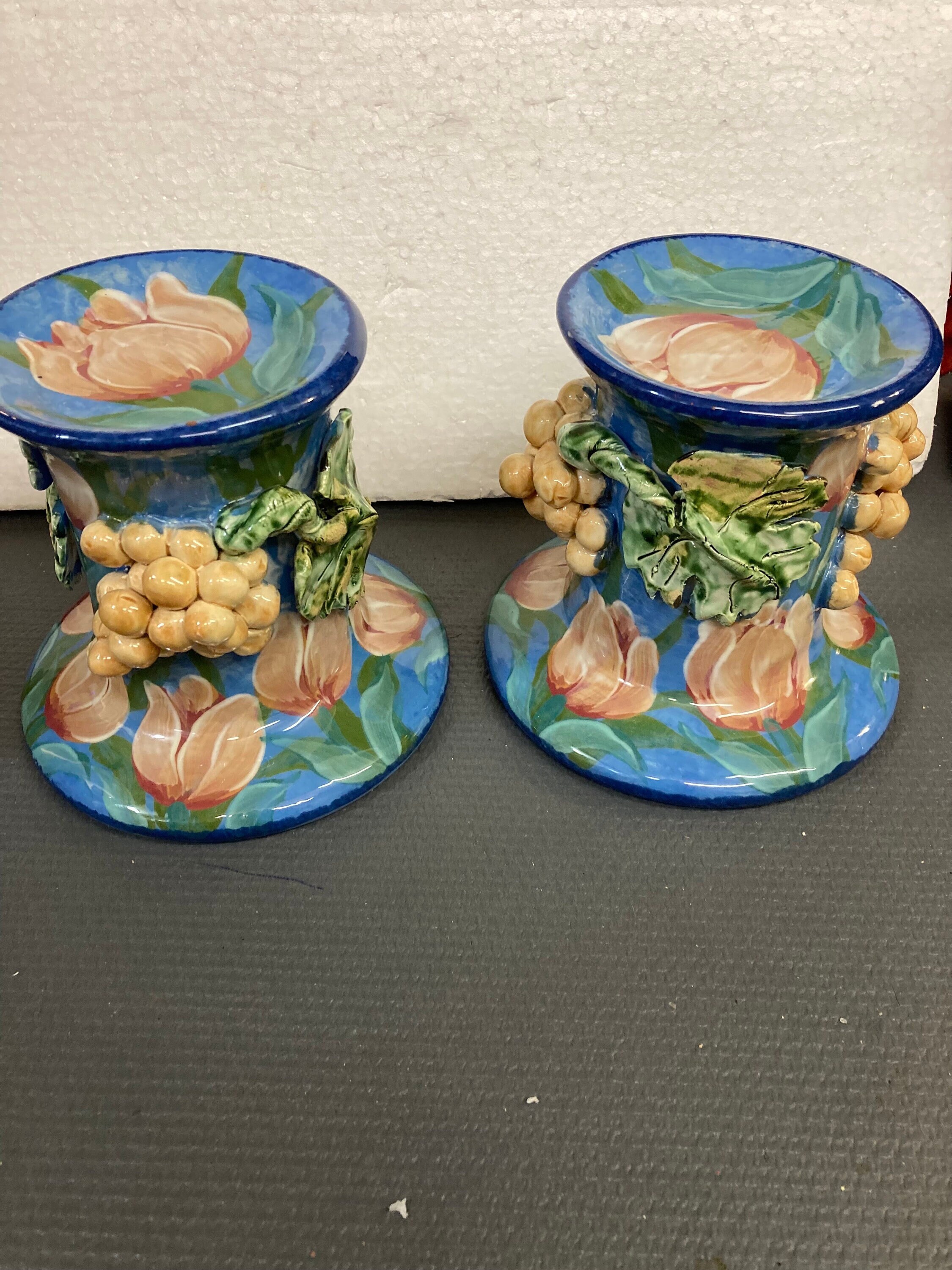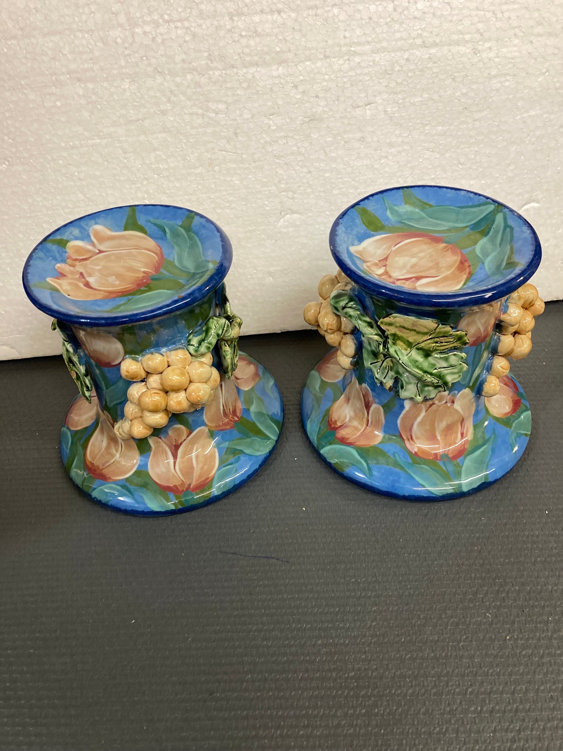 Set of TW0 Lesäl Ceramics Pillar Candle Holder 3D Relief Grape Clusters and Leaves Hand Crafted