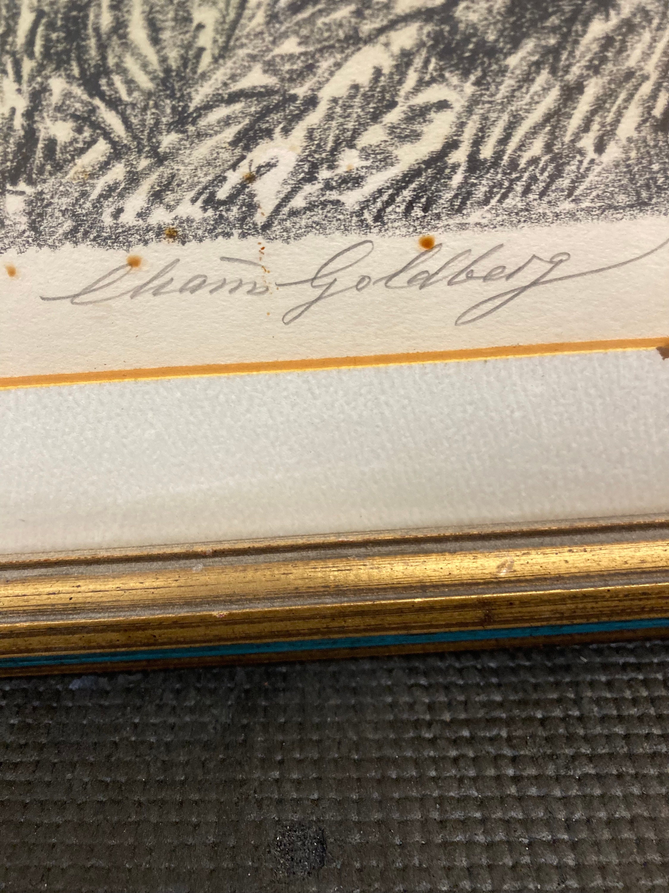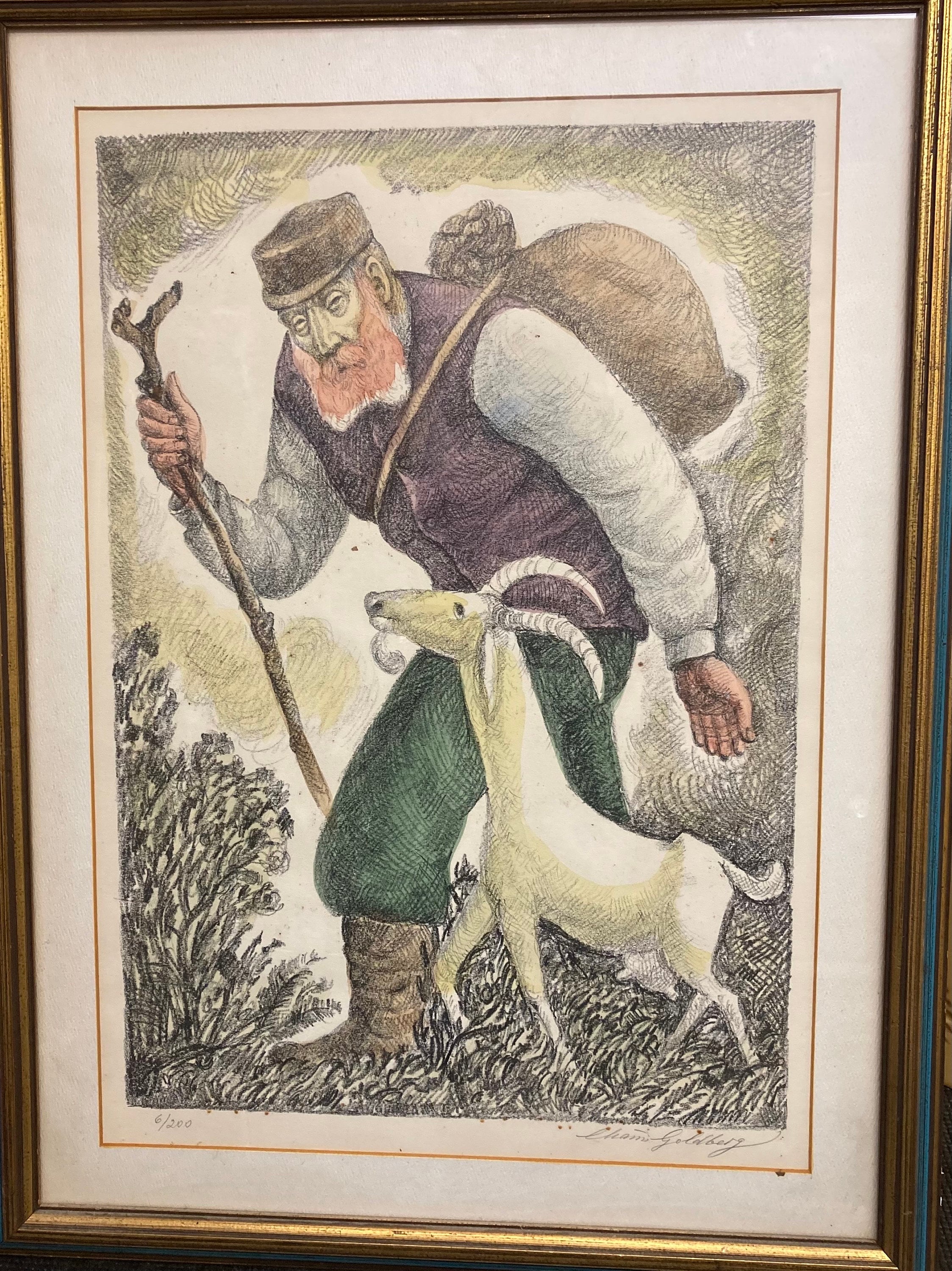 Chaim Goldberg (1917 - 2004) "Old Man & Goat" Chaim worked from a studio in Tel Aviv and also began a series of line engravings. In the late 1960s, the Goldberg's moved to New York, and from 1967 to 1971, he had 30 shows across the United States. Seeking a warm climate, the family settled in Houston, Texas where Goldberg was quite prolific, creating copper engravings, and abstract oil and watercolor paintings. Artist: Chaim Goldberg Title: "Old Man & Goat" Medium: Embellished Lithograph Signature Type: Hand Signed Signature Location: Lower Right Edition: 6 / 200 Site Measurement: Framed 24" Tall x 18 " Wide . Keywords: Portrait Artwork,