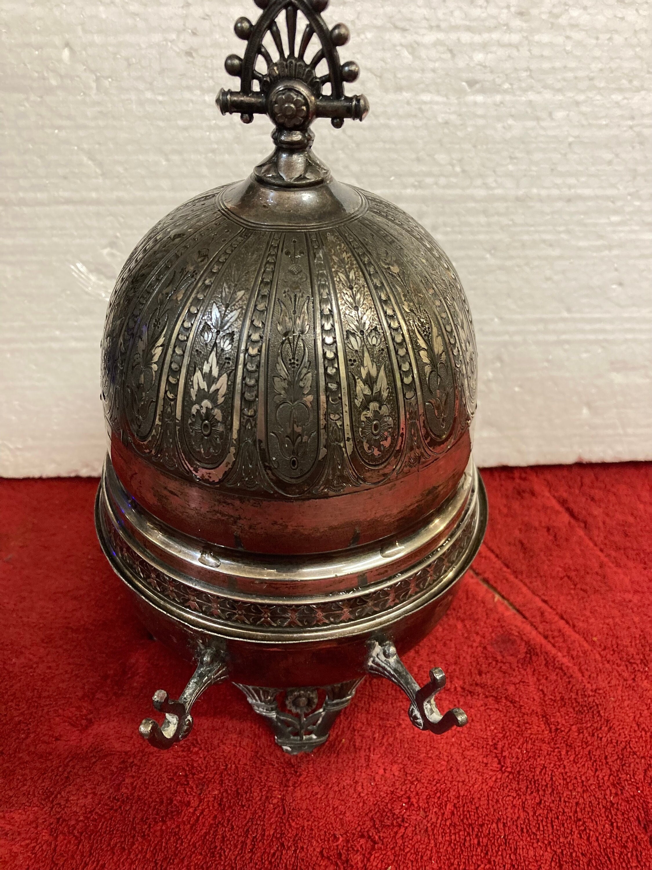 The antique James W. Tufts Boston Quadruple Plate is a silver-plated butter dish with a domed lid and floral etchings. The model number is 2047, Antique Quadruple Plate Domed Butter Dish With Flower Etchings.