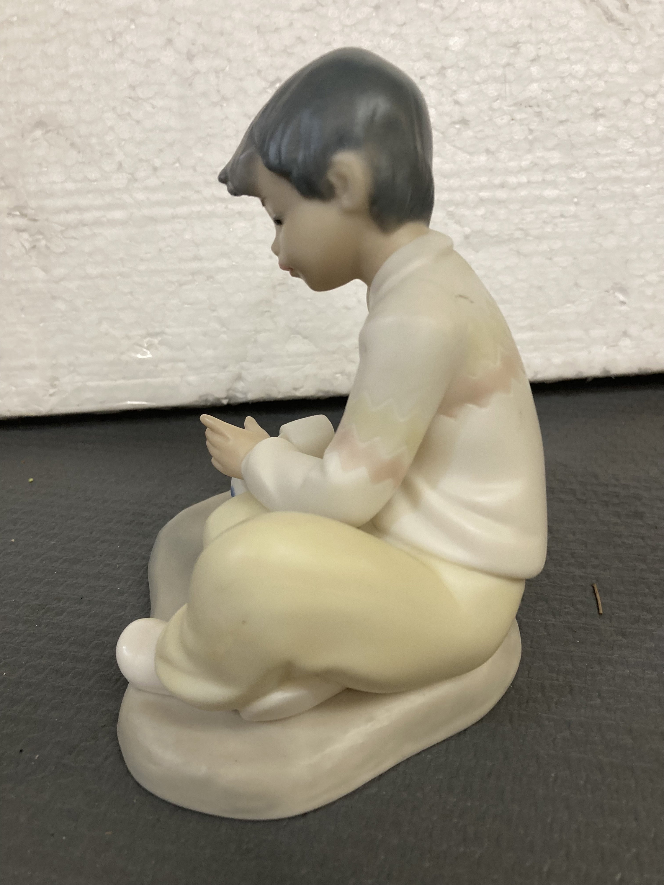 This beautiful vintage Lladro figurine is from the Golden Memories series and was released in 1991. It features a young boy sitting on the floor, playing with a toy train. The figurine is made of fine porcelain and is hand-painted in vibrant colors. It is in excellent condition with no chips or cracks.