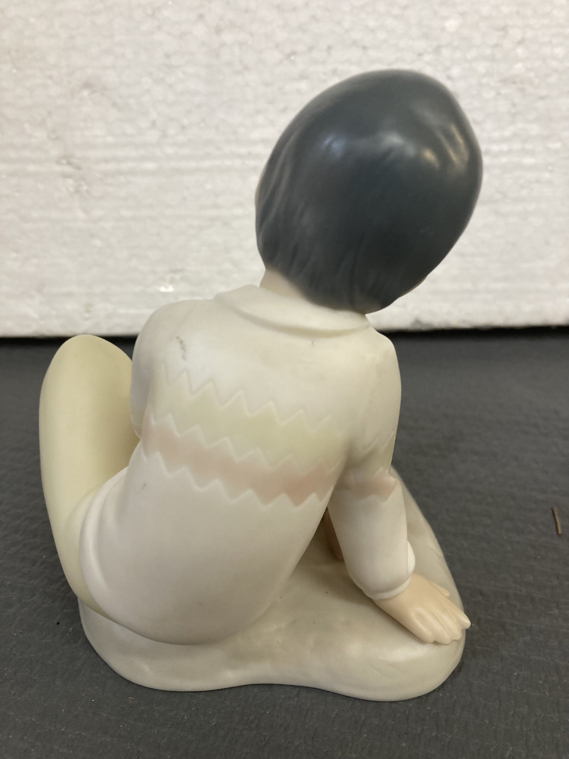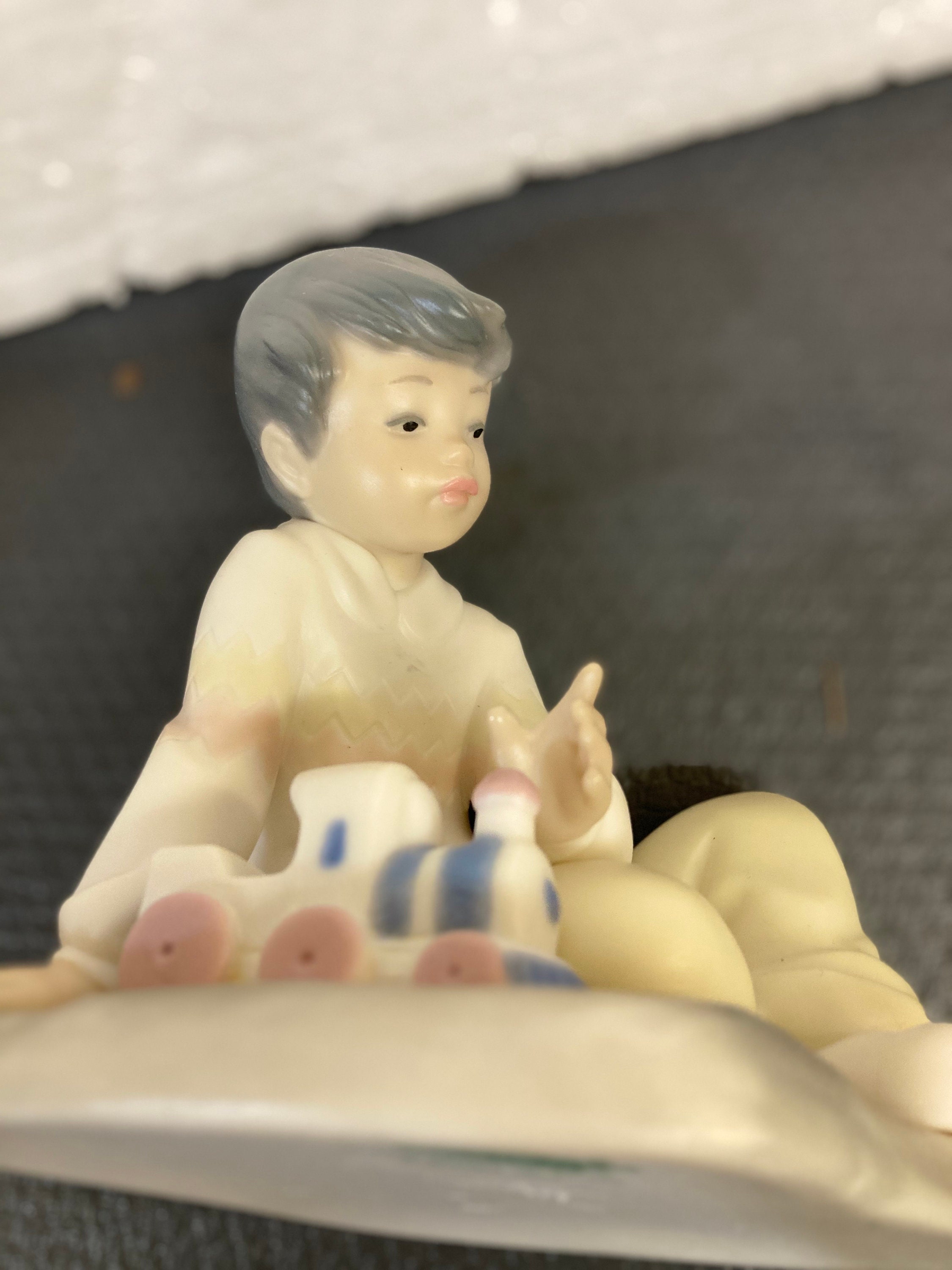 The figurine is titled "Boy with Toy Train" and is a charming depiction of a young boy lost in his imagination. The boy is sitting on the floor, his legs crossed, and his head tilted back. He is holding a toy train in his hands, and his eyes are closed as he imagines the train chugging along the tracks. The figurine is a beautiful reminder of the power of imagination and the joy of childhood.