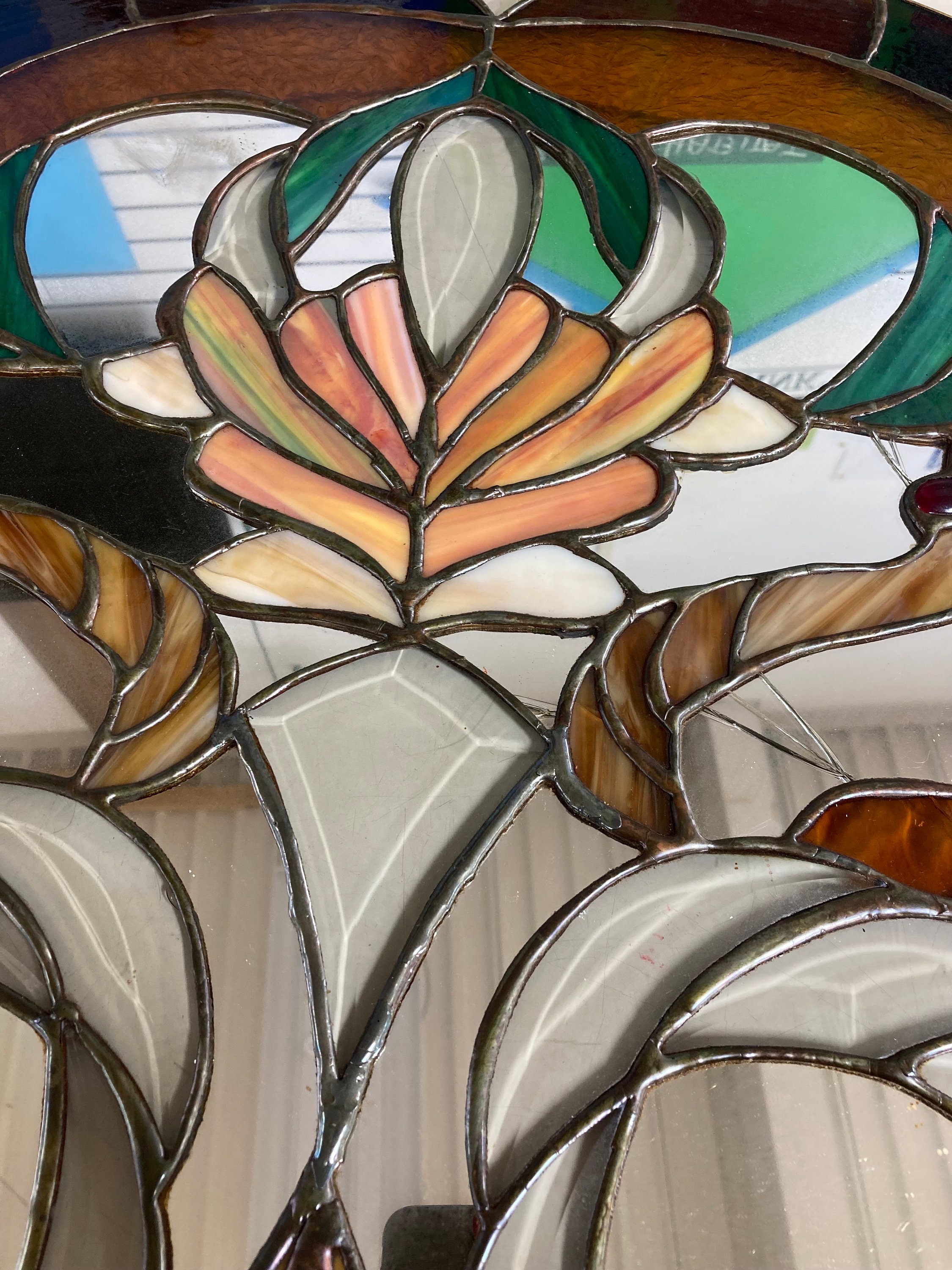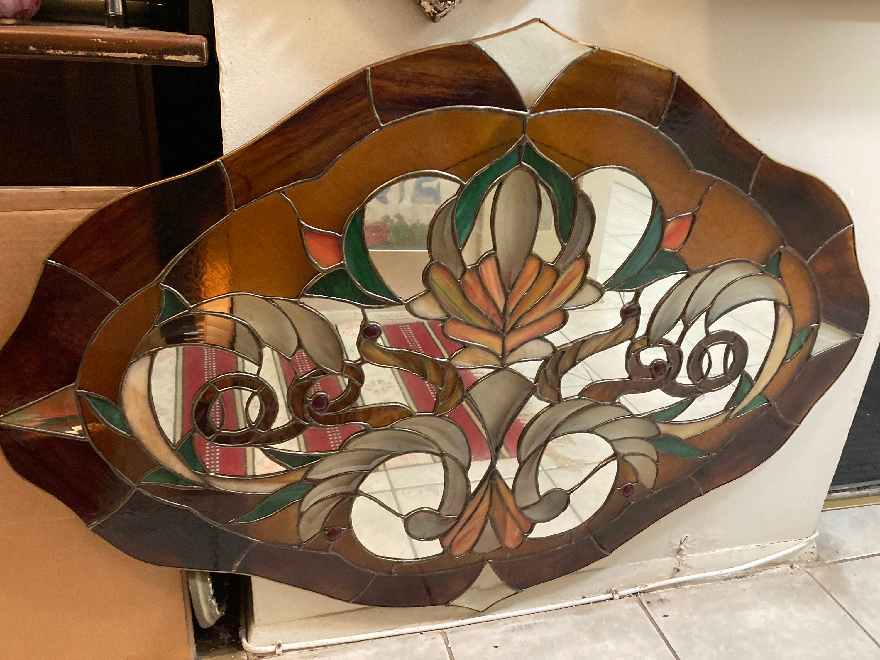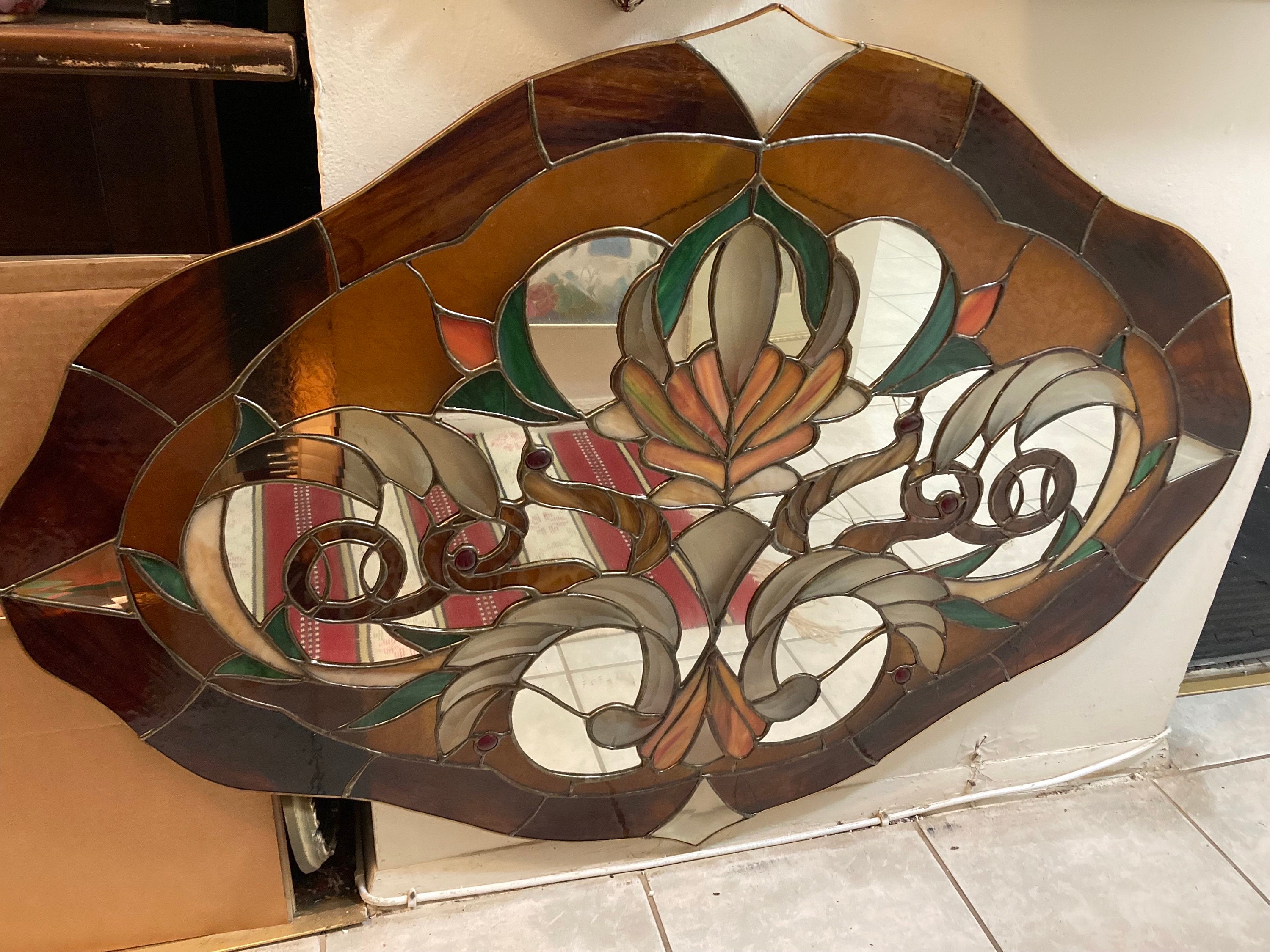 Large Antique Handmade Floral Design Oval Shape Stained Glass