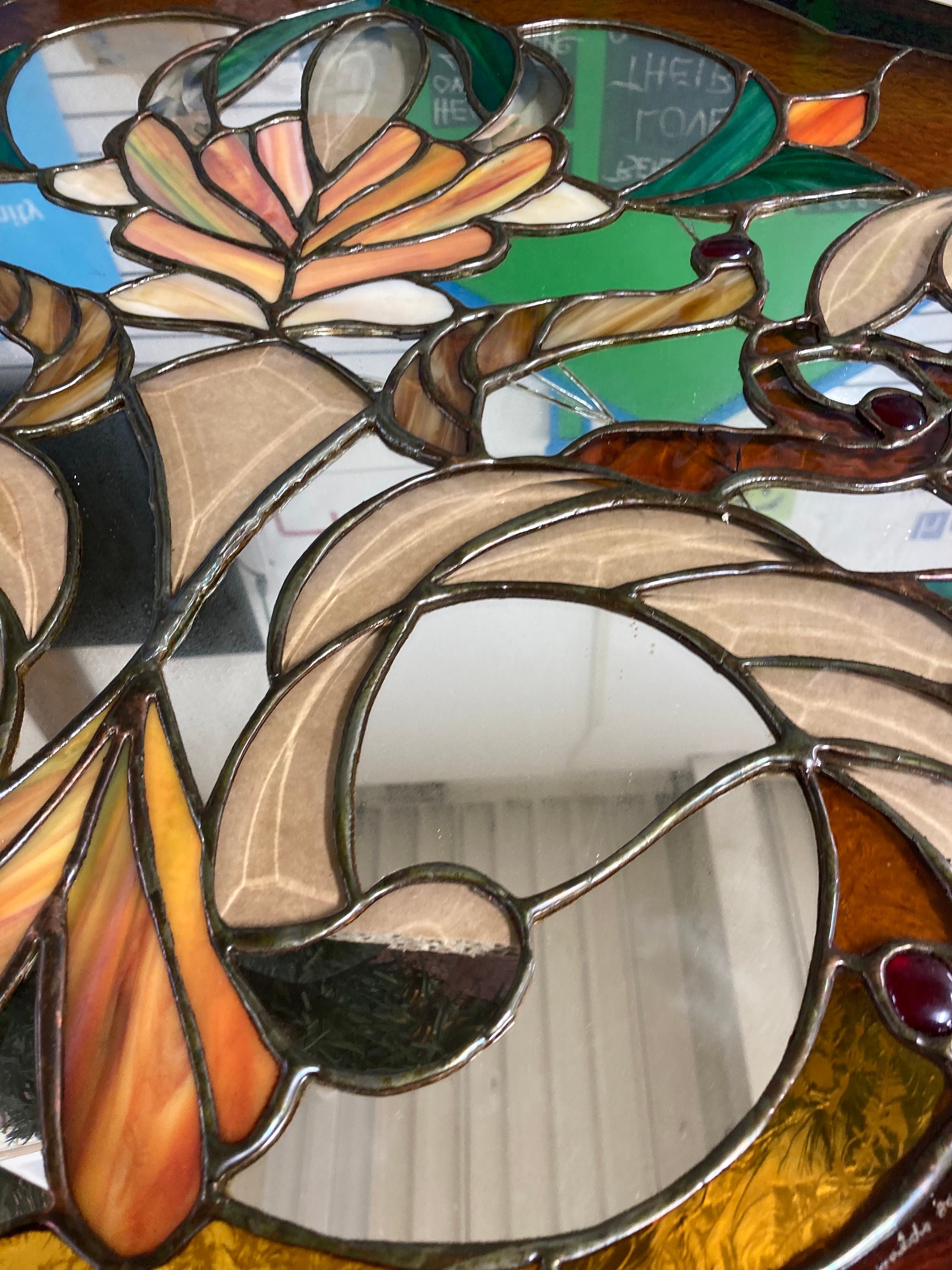 Artistically done with Mixture of Mirror, Clear and Colored Glasses Joined by what it looks like Copper