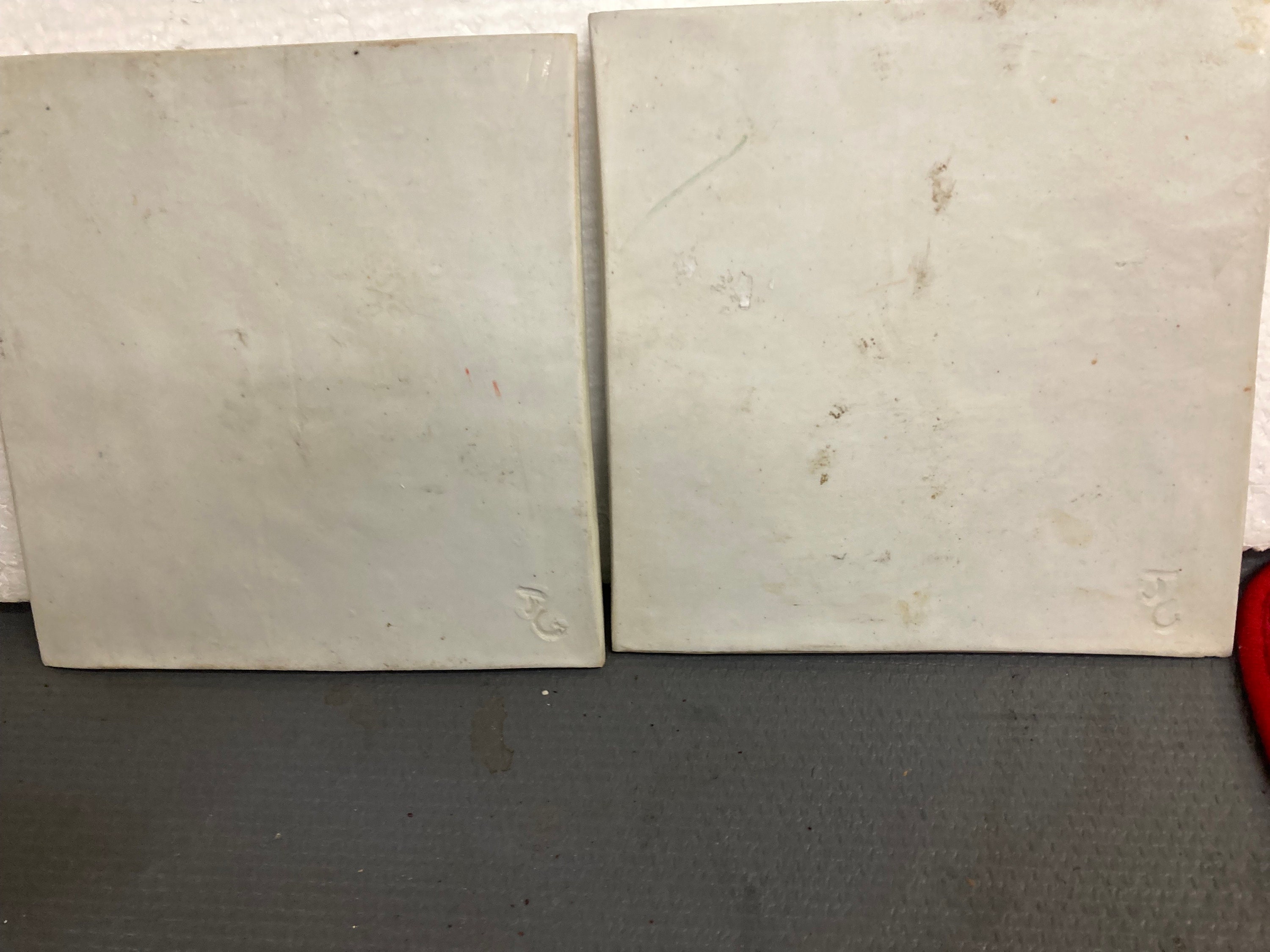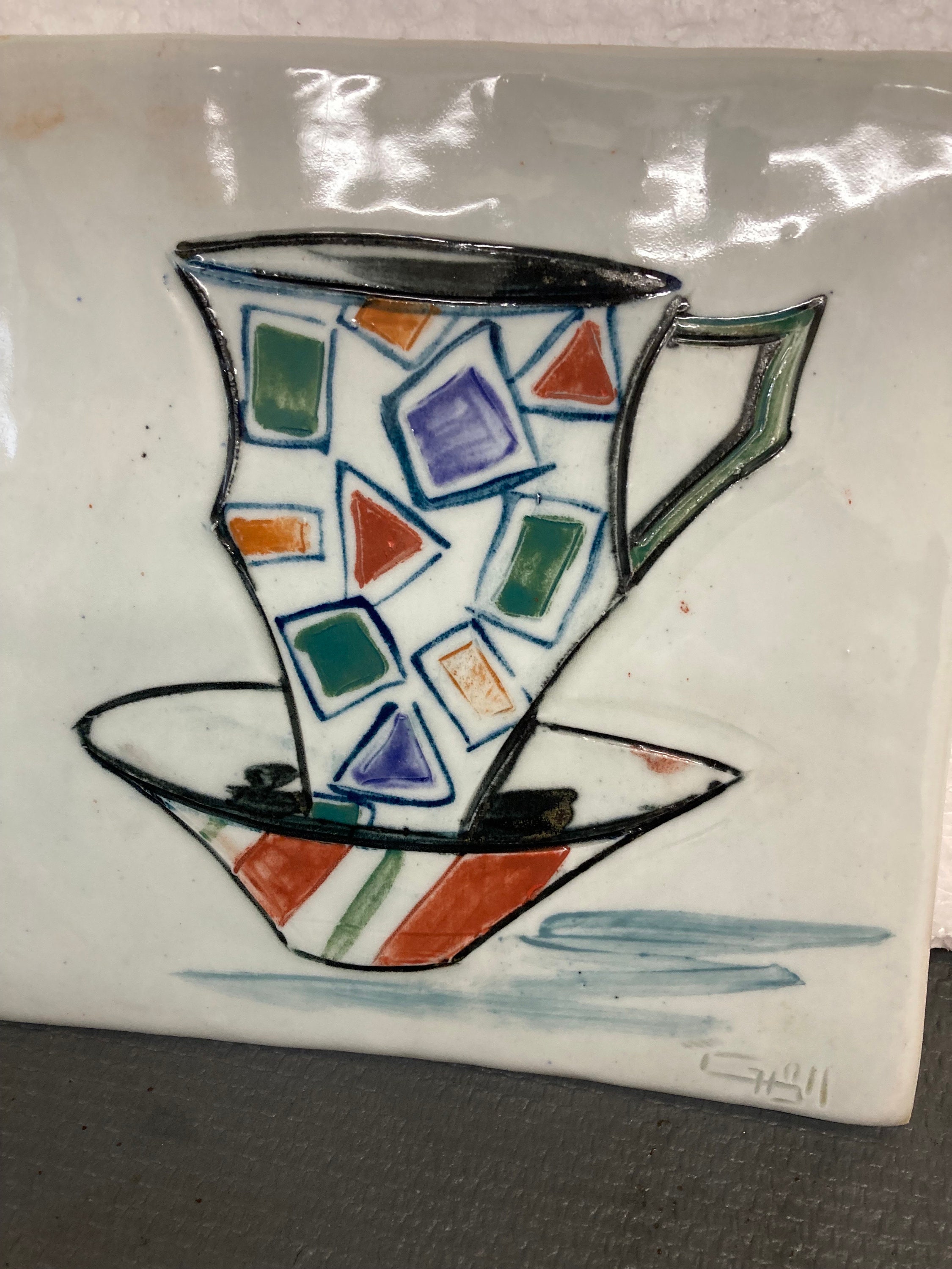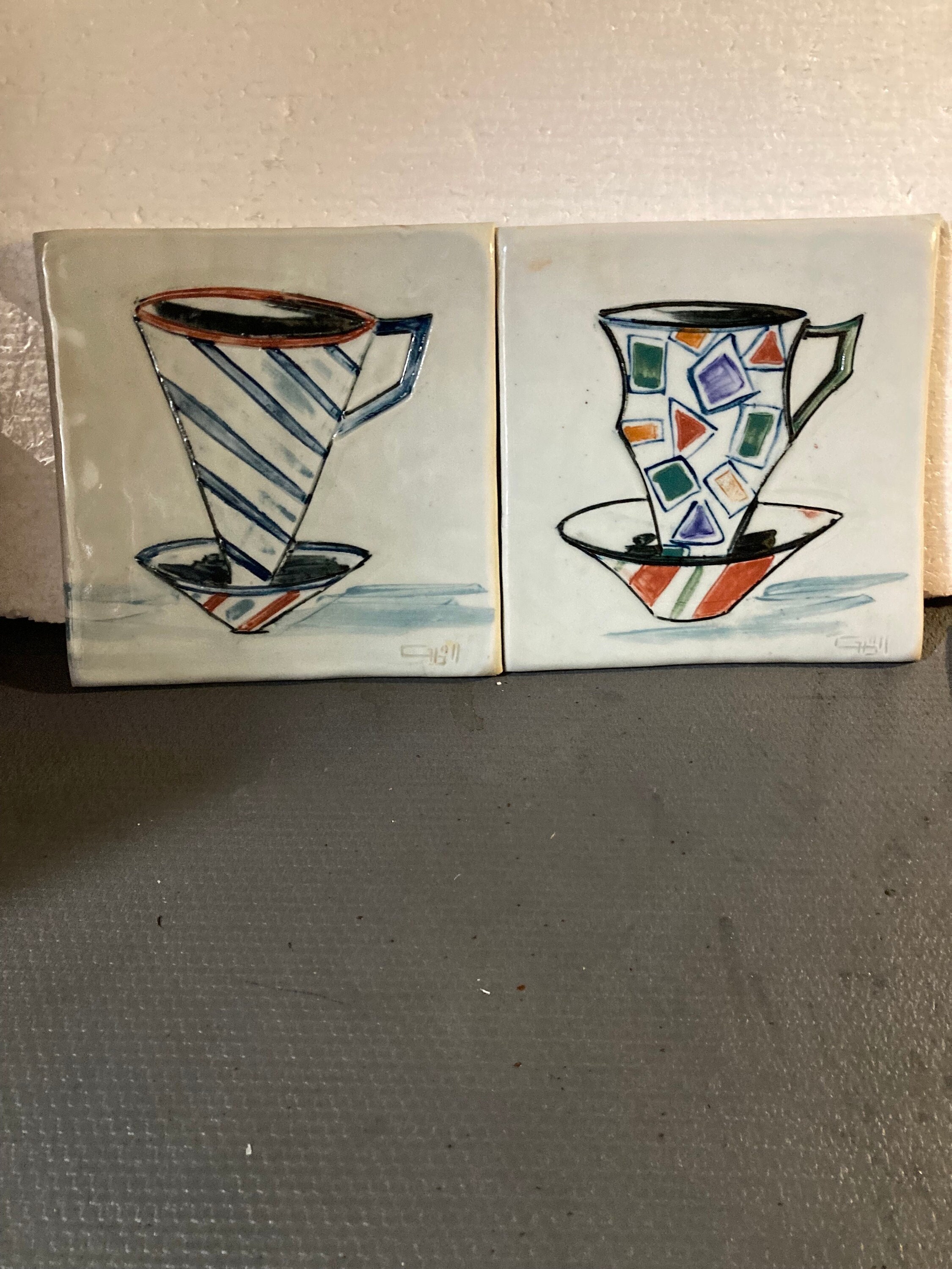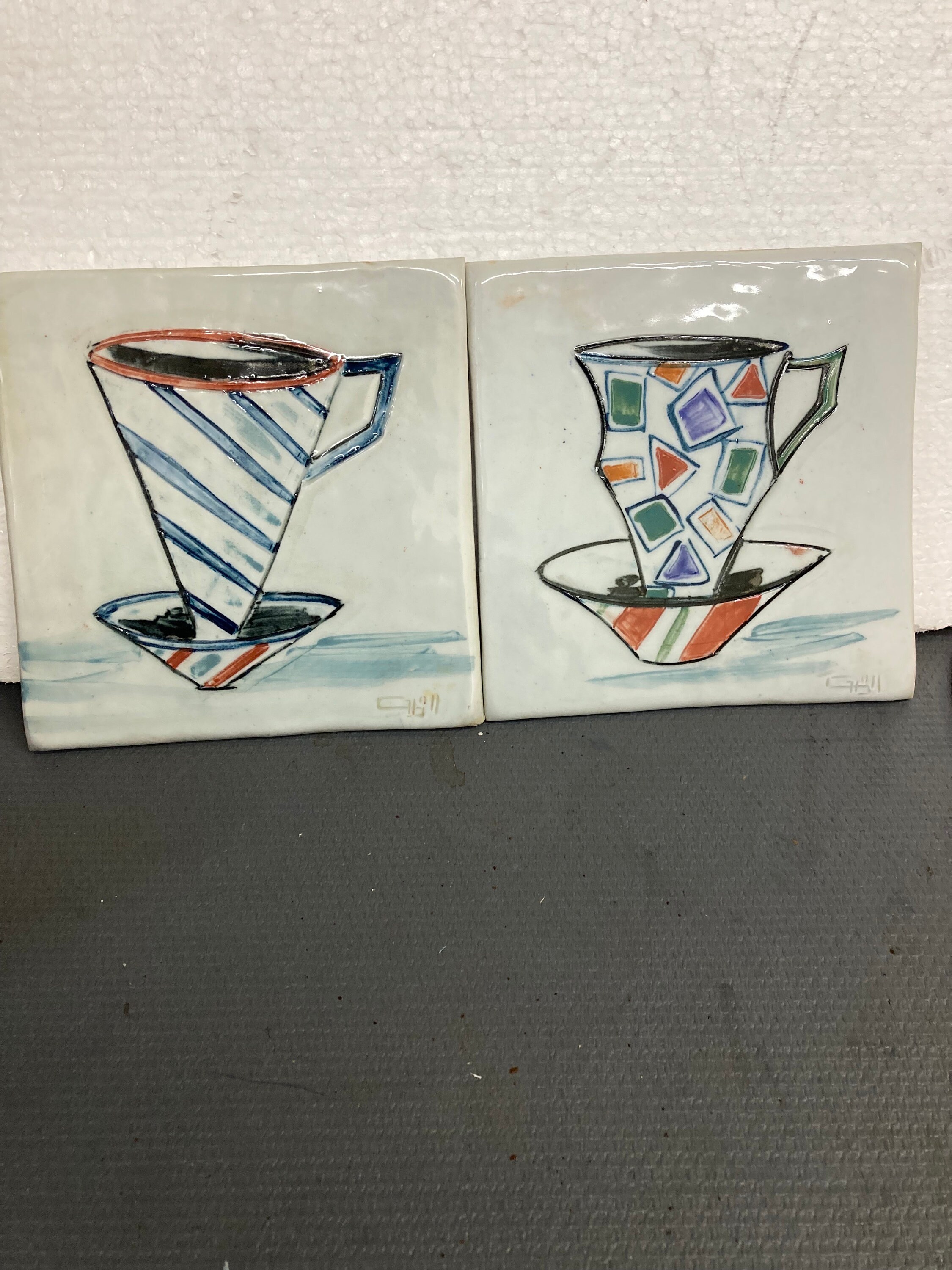 2 Modern Abstract Art Works on Ceramic Tile7 7/8'W X 7 7/8" T X 1/2" DEach tile Weight 2 lbs.Both are in Excellent ConditionSigned by Artist in frontInitialed on the back , looks like TG or JG