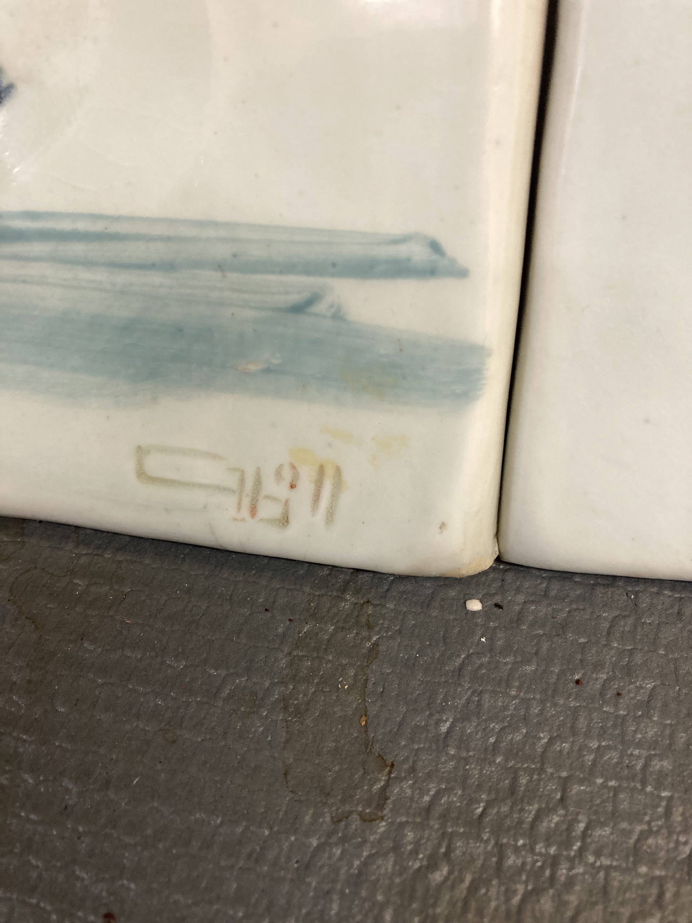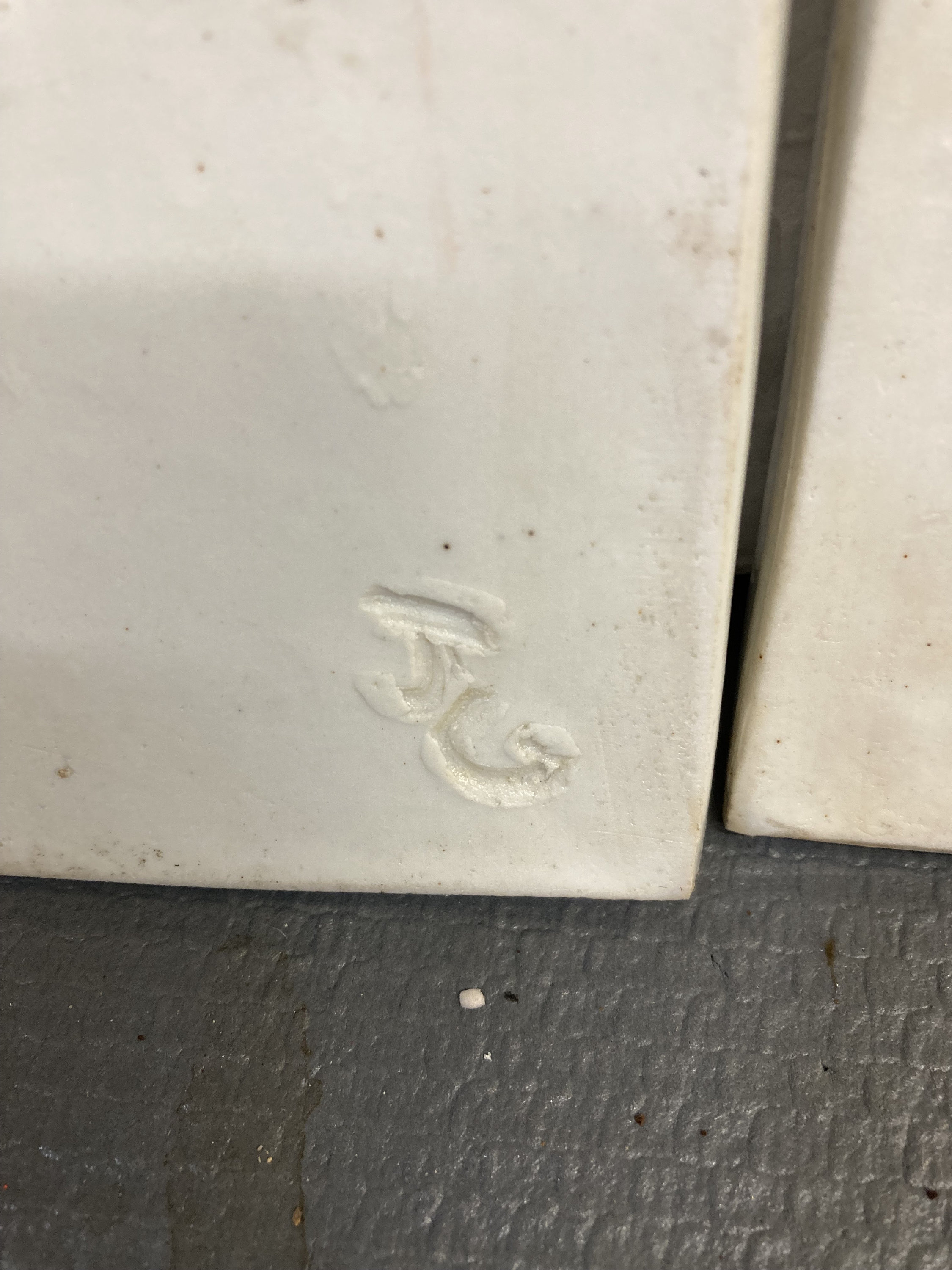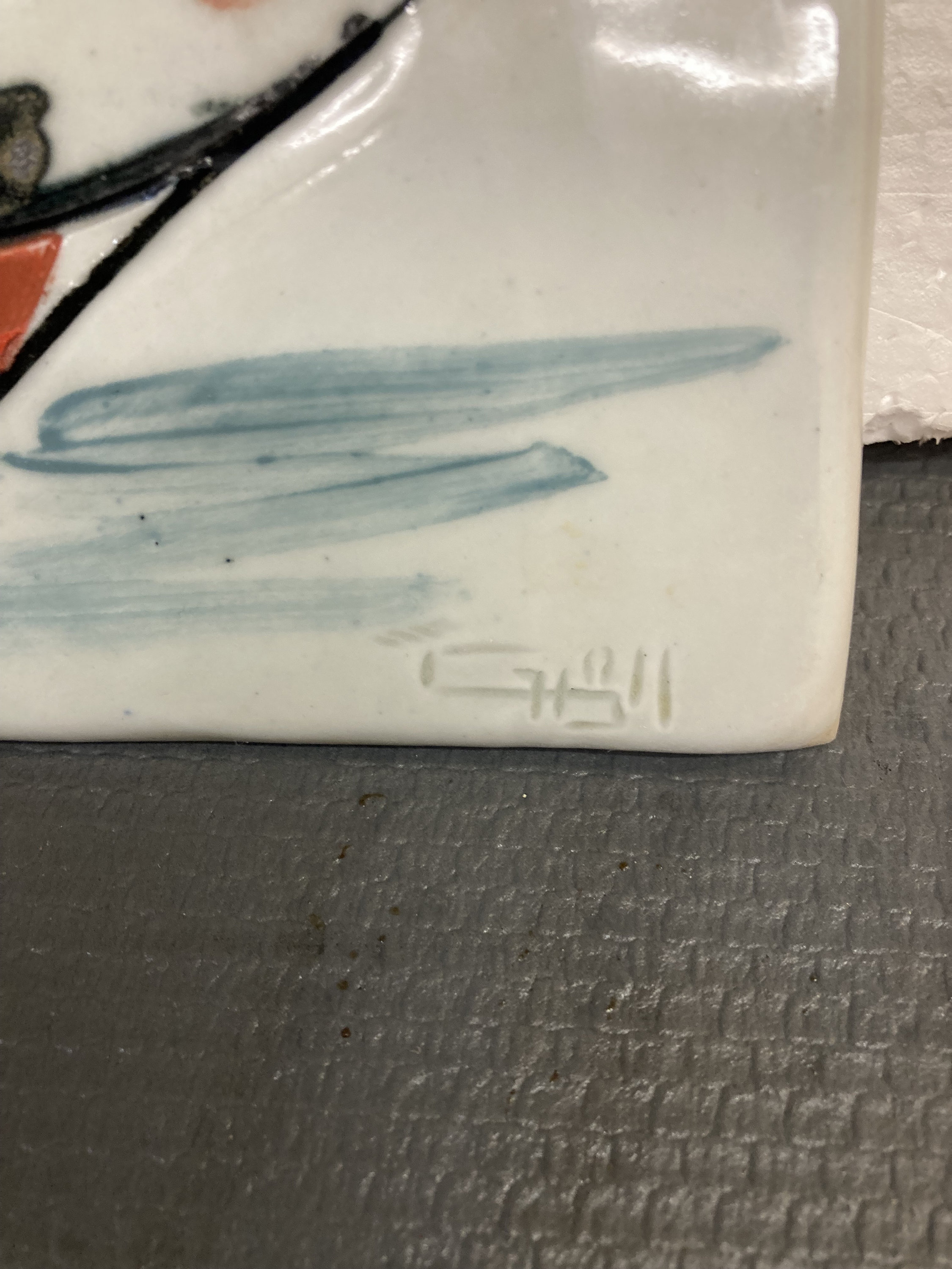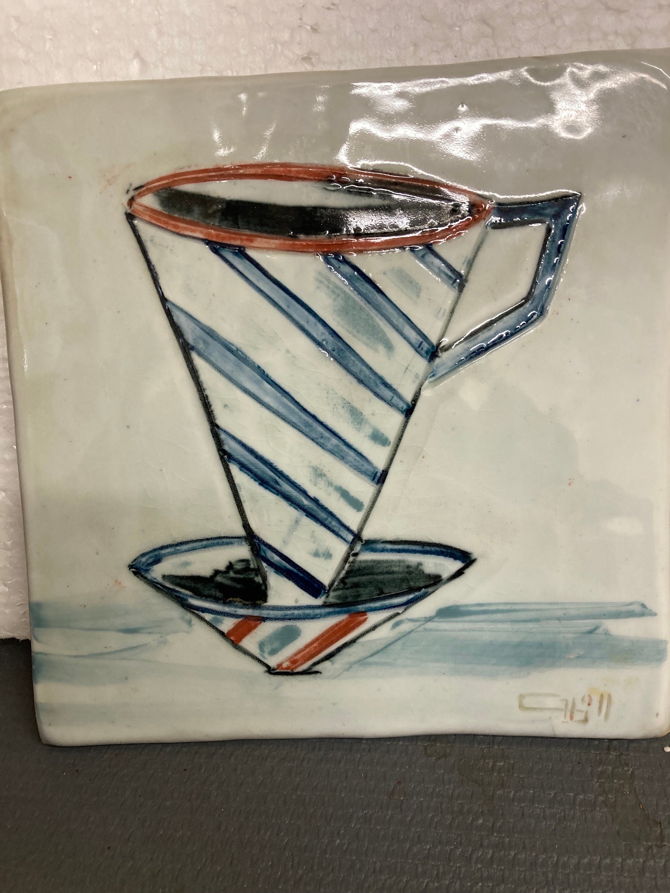 2 Modern Abstract Art Works on Ceramic Tile7 7/8'W X 7 7/8" T X 1/2" DEach tile Weight 2 lbs.Both are in Excellent ConditionSigned by Artist in frontInitialed on the back , looks like TG or JG