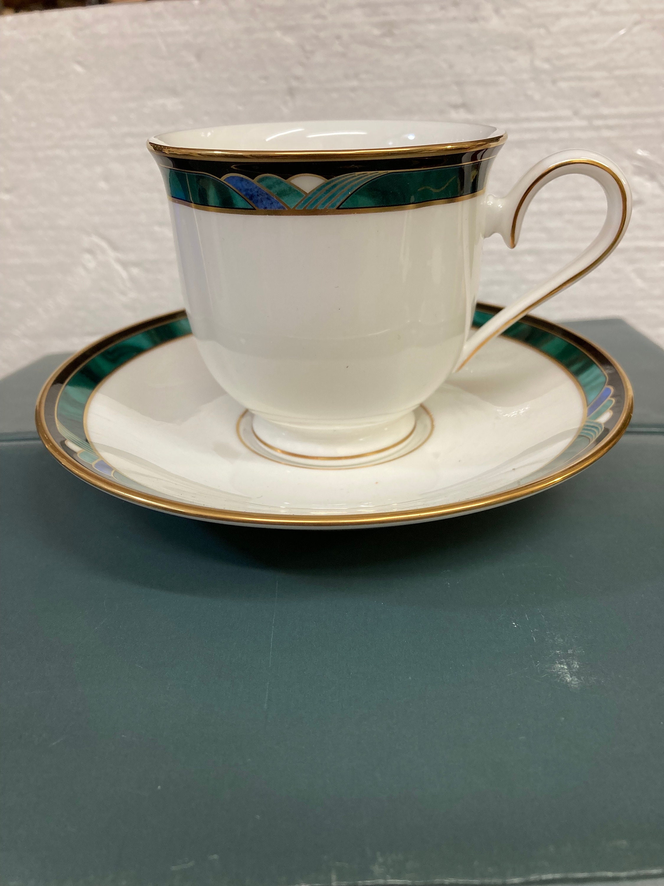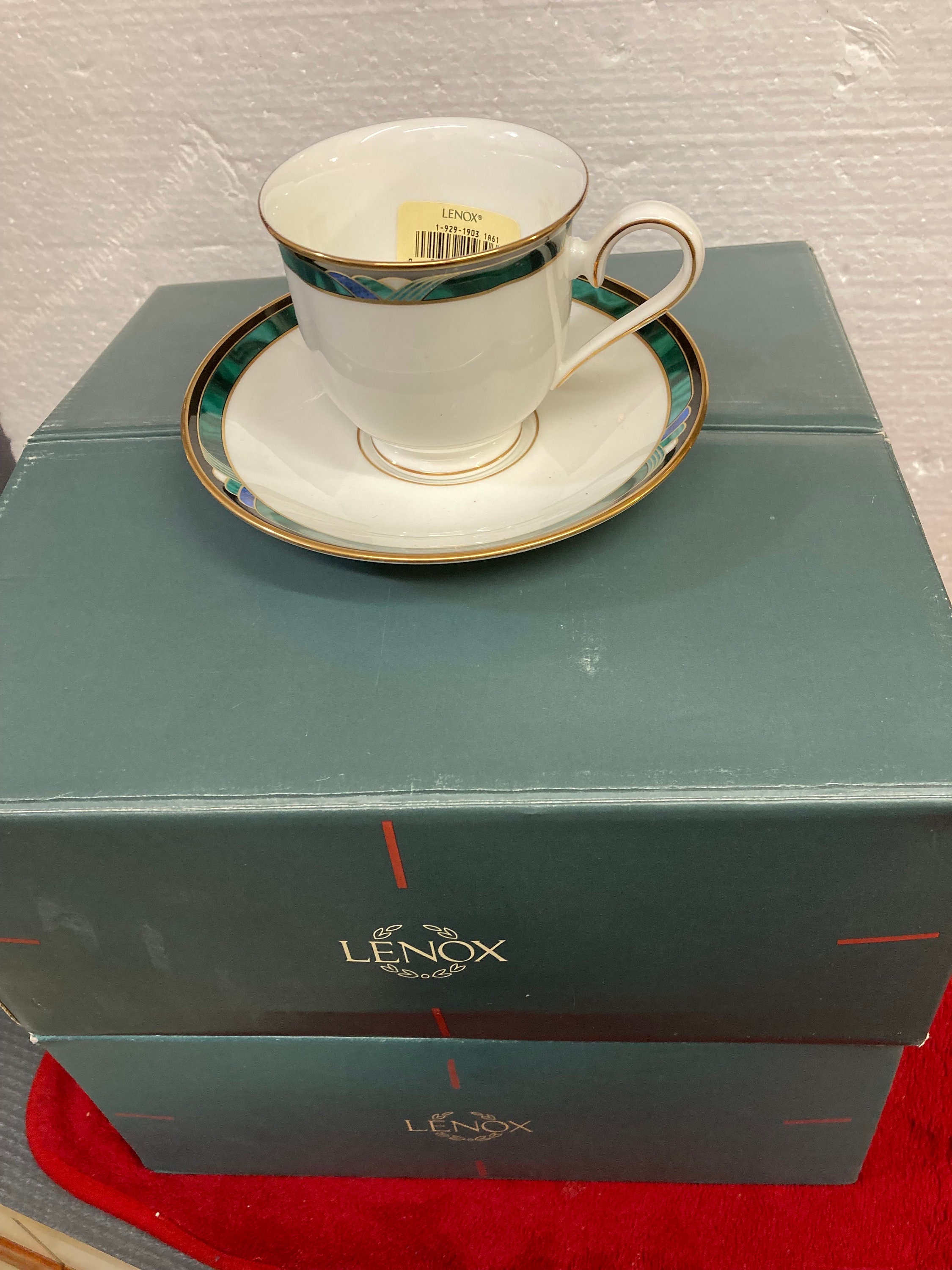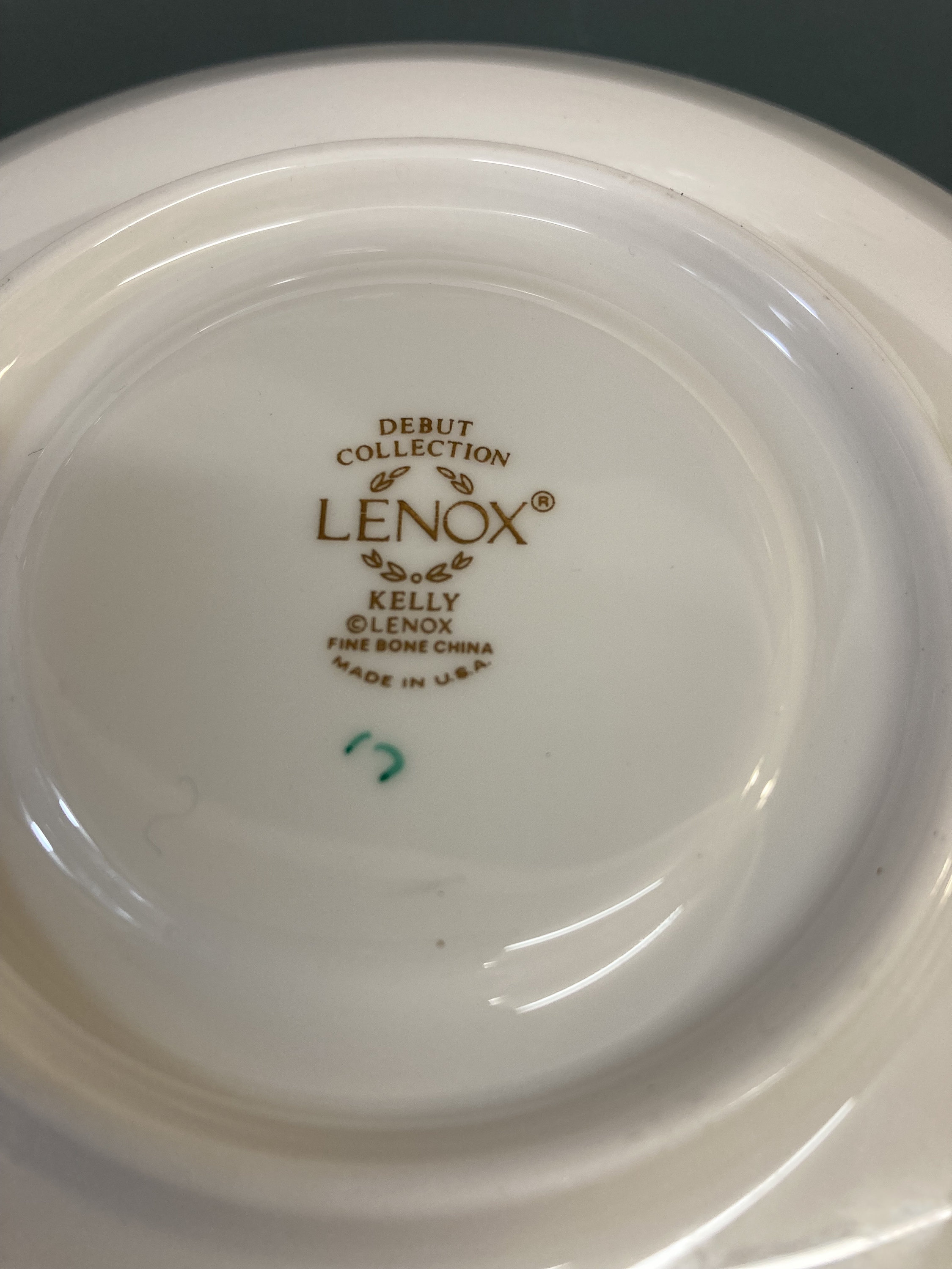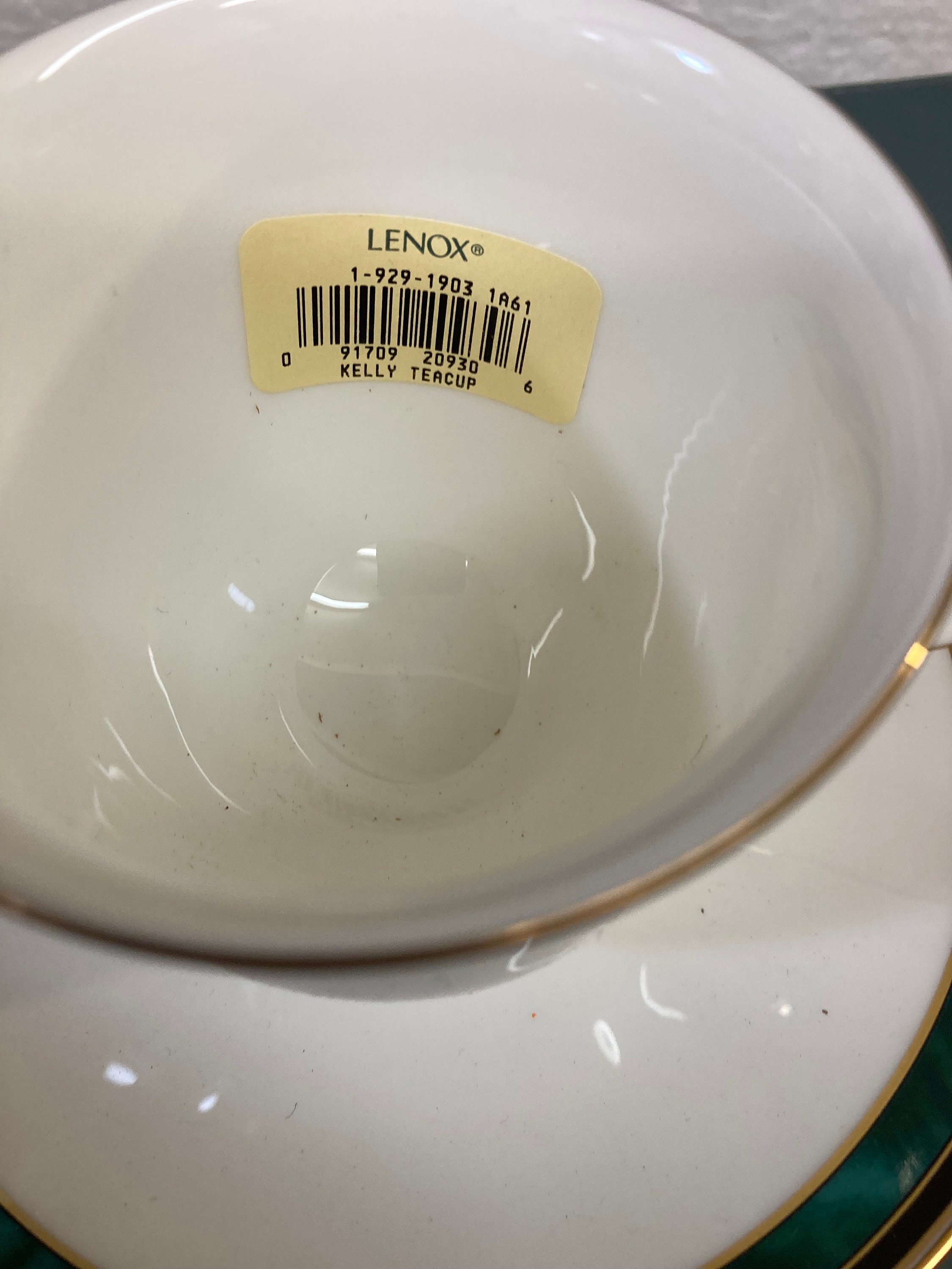 Lenox Kelly teacups and saucers are made from bone china and come in a variety of colors including teal green, white, black, blue, and gold.