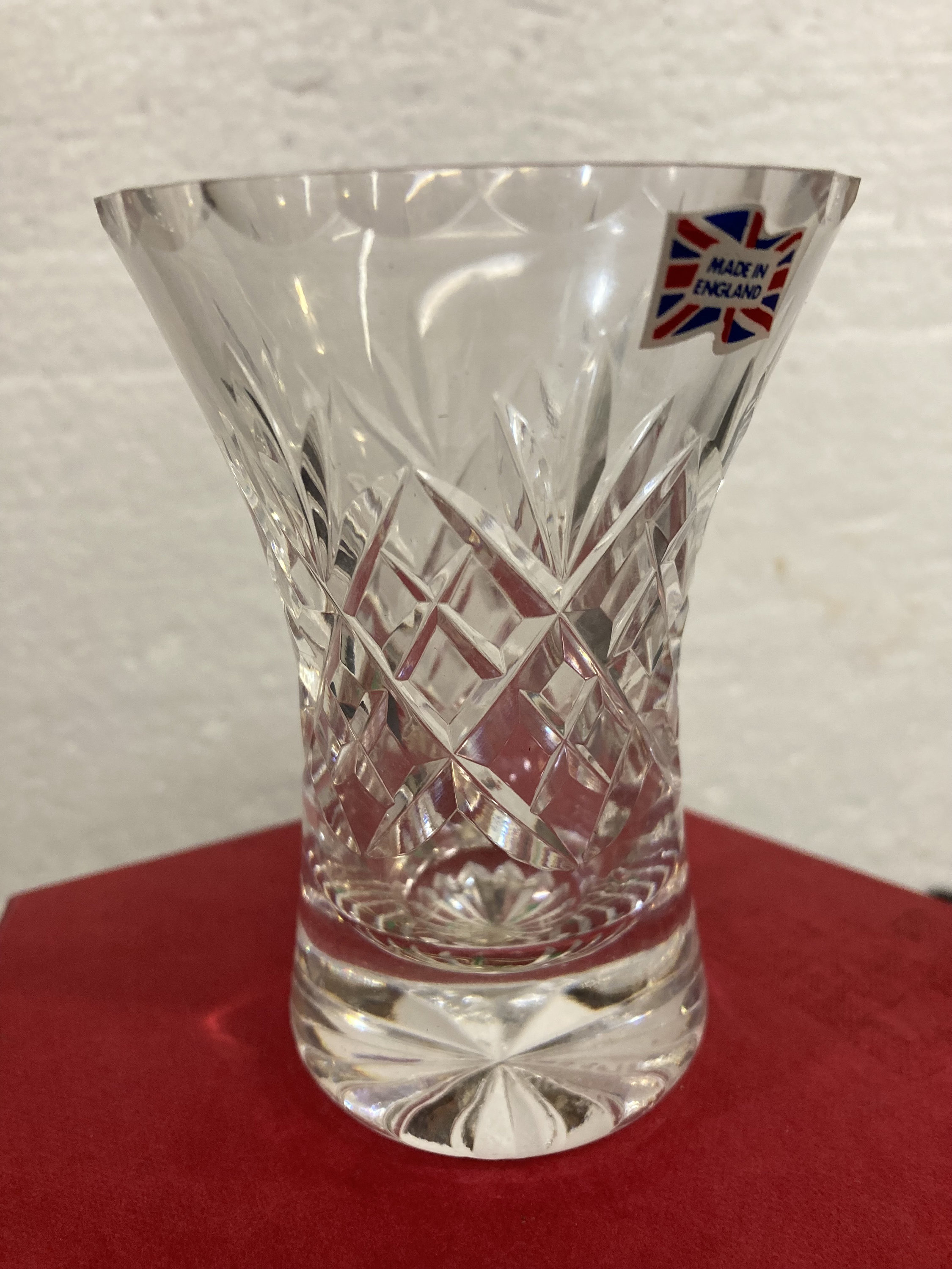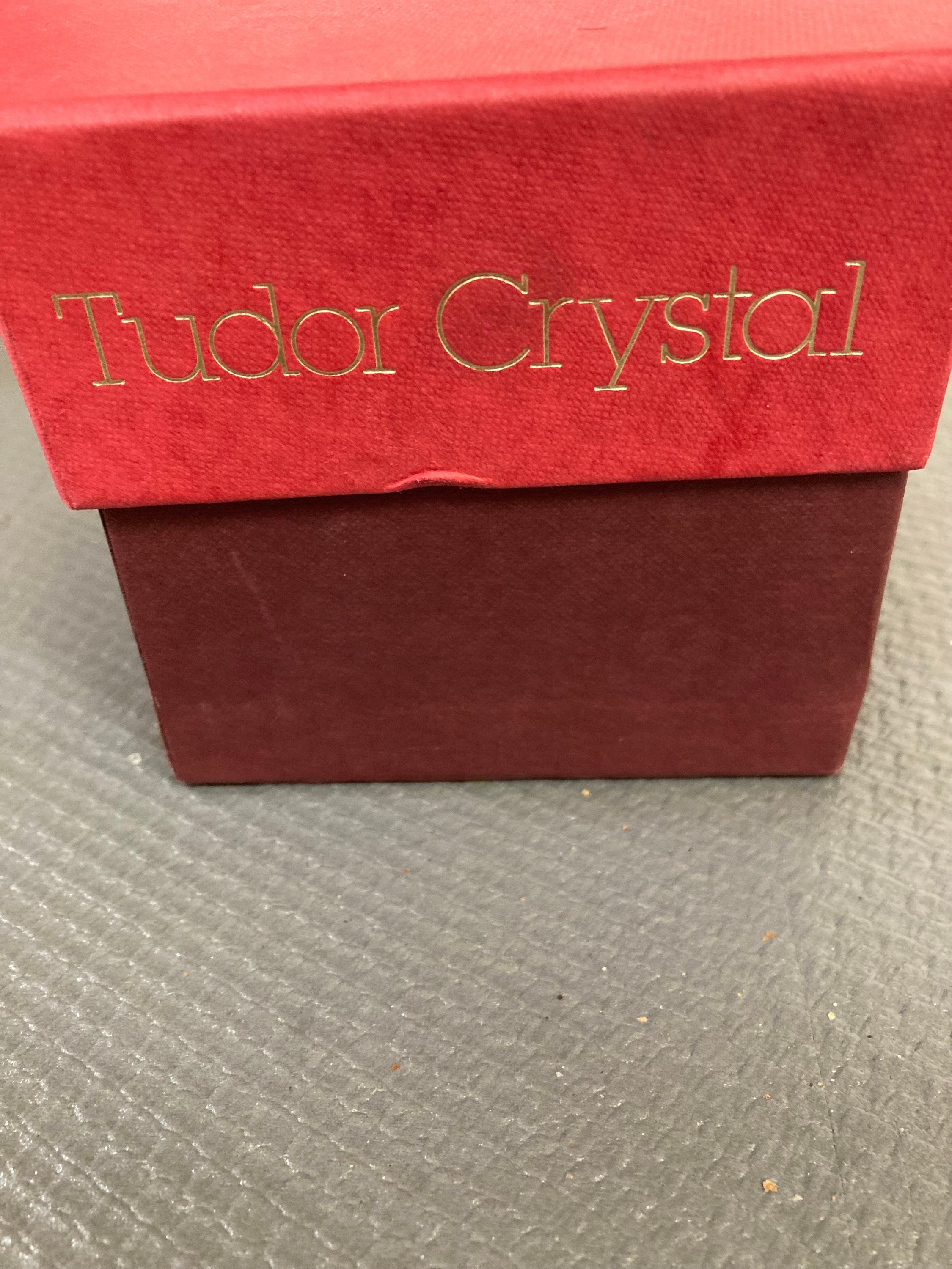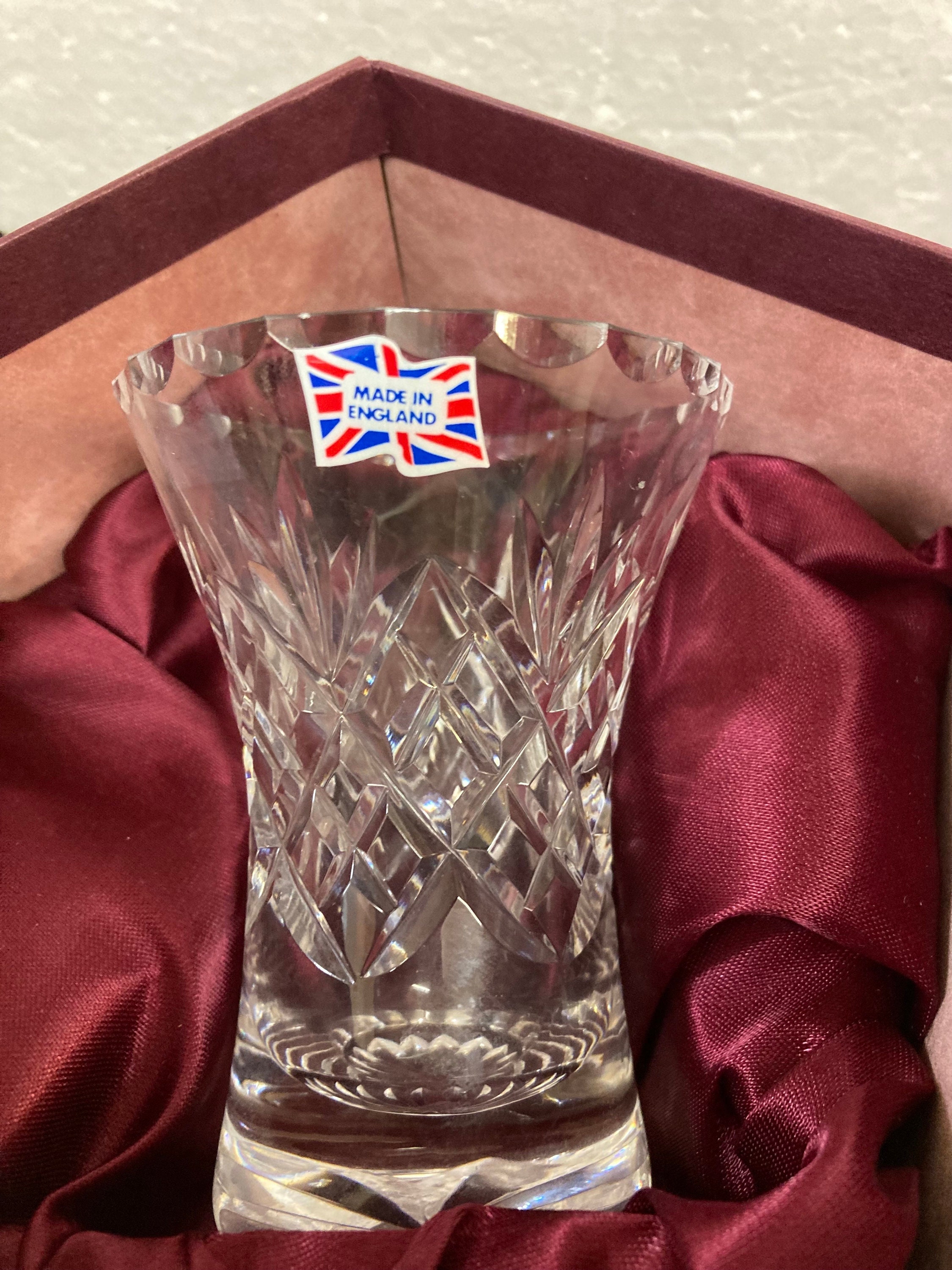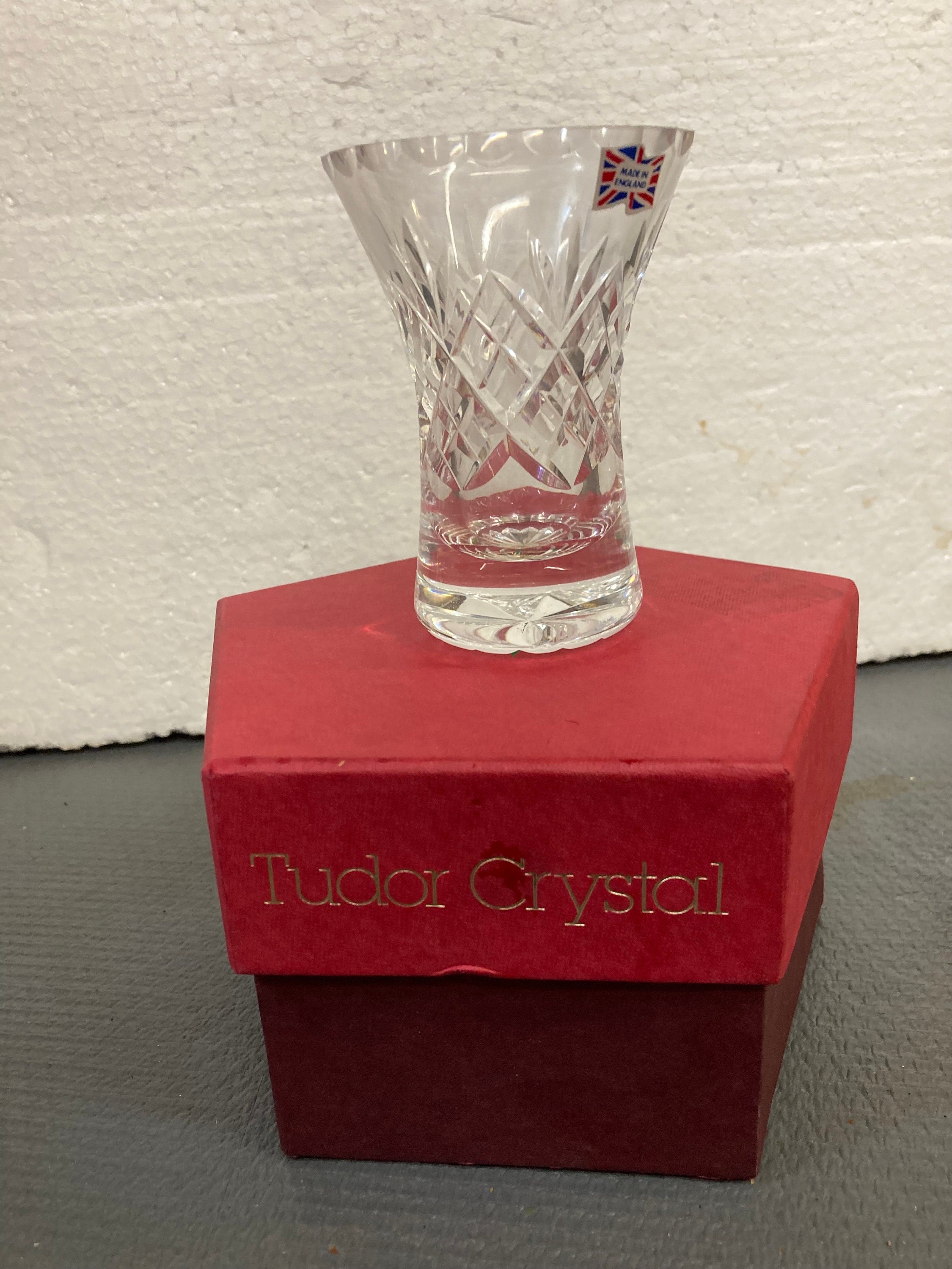 Brand New Tudor Crystal Cut Glass Vase, Posy, Seymour Pattern,comes with original Box. Never UsedExcellent Condition with no damages, chips or cracks4"tall x 3 7/8 " wide x 2" base
