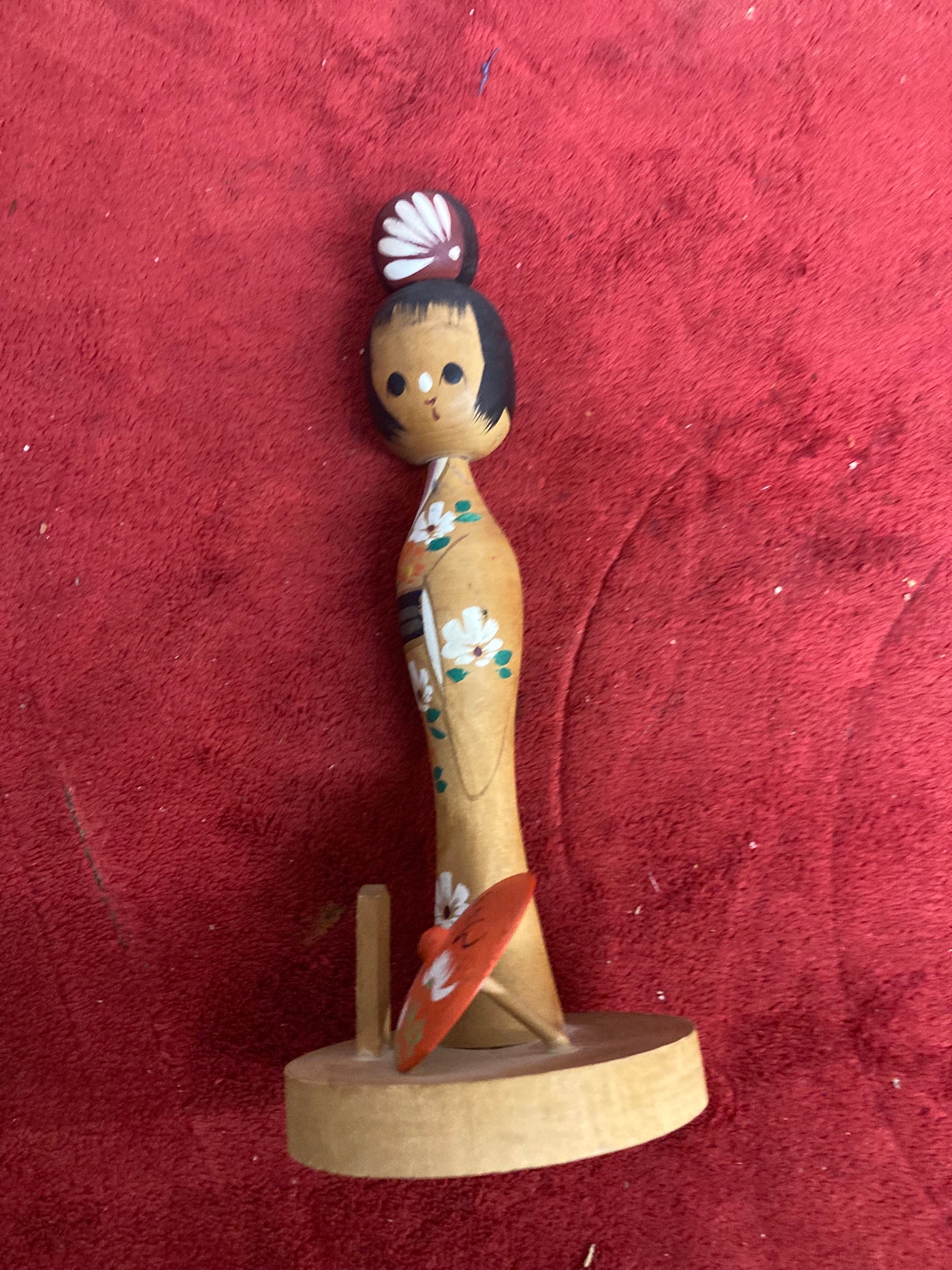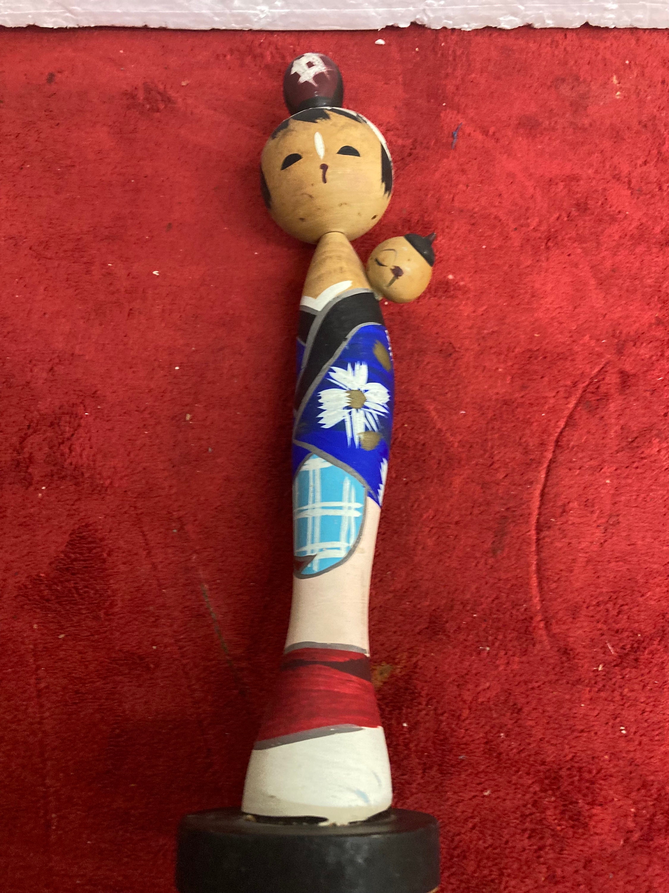 The kokeshi is made out of hand turned wood. This kokeshi of mother in kimono.