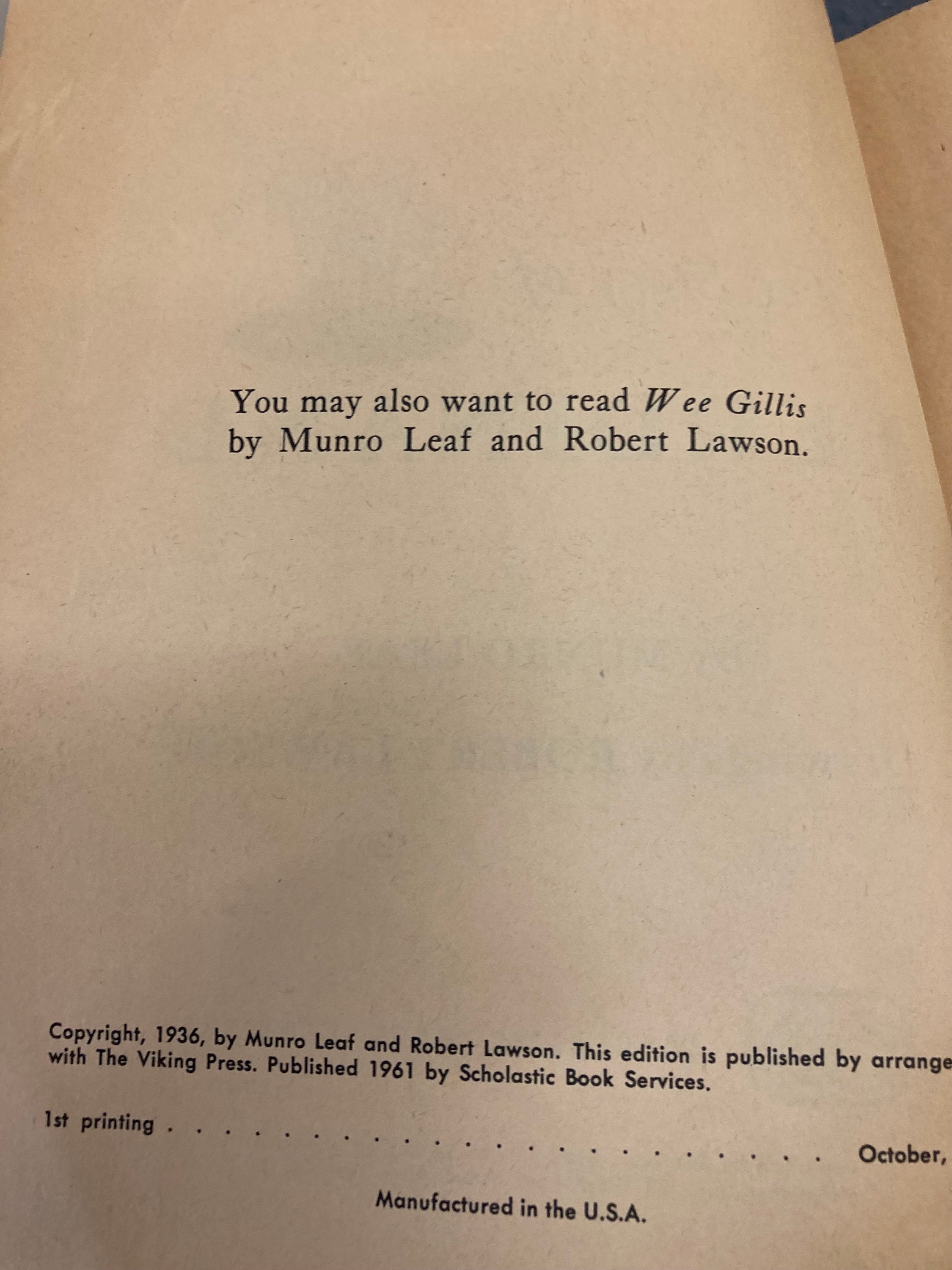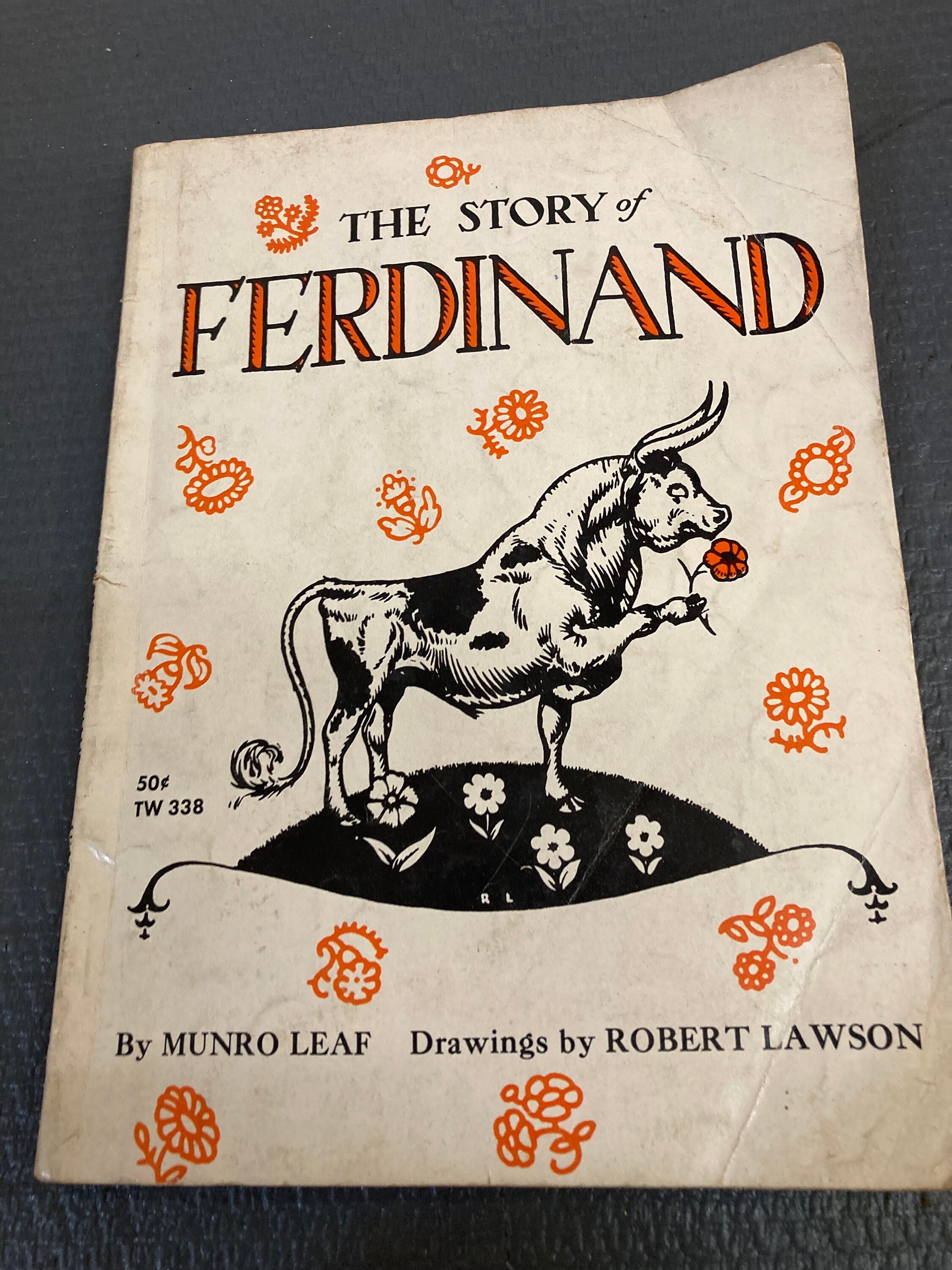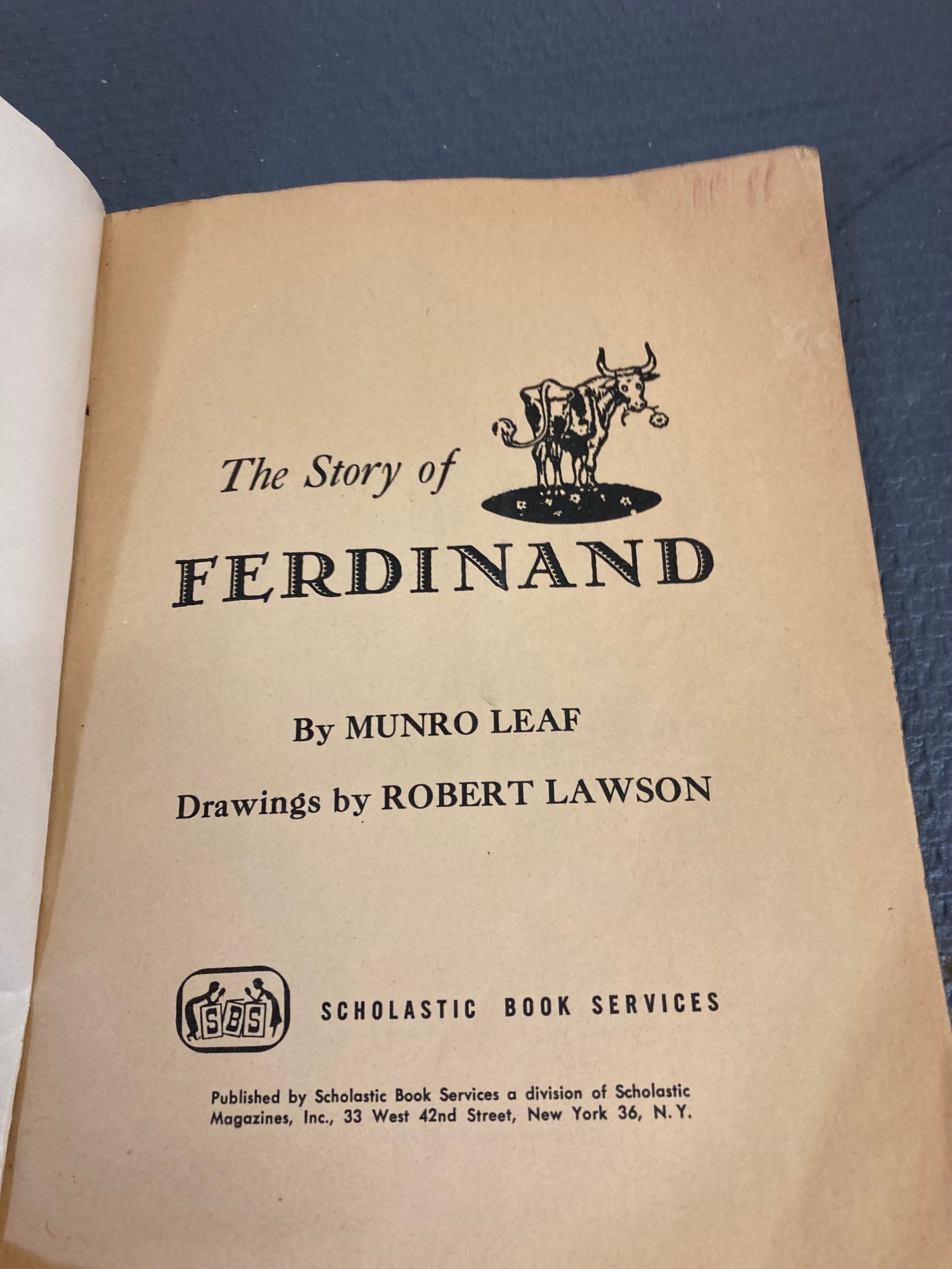 3)The Story Ferdinand by Munro Leaf ,Drawings by Robert Lawson, Copyright 1936, Scholastic Book Services publisher ( soft cover)