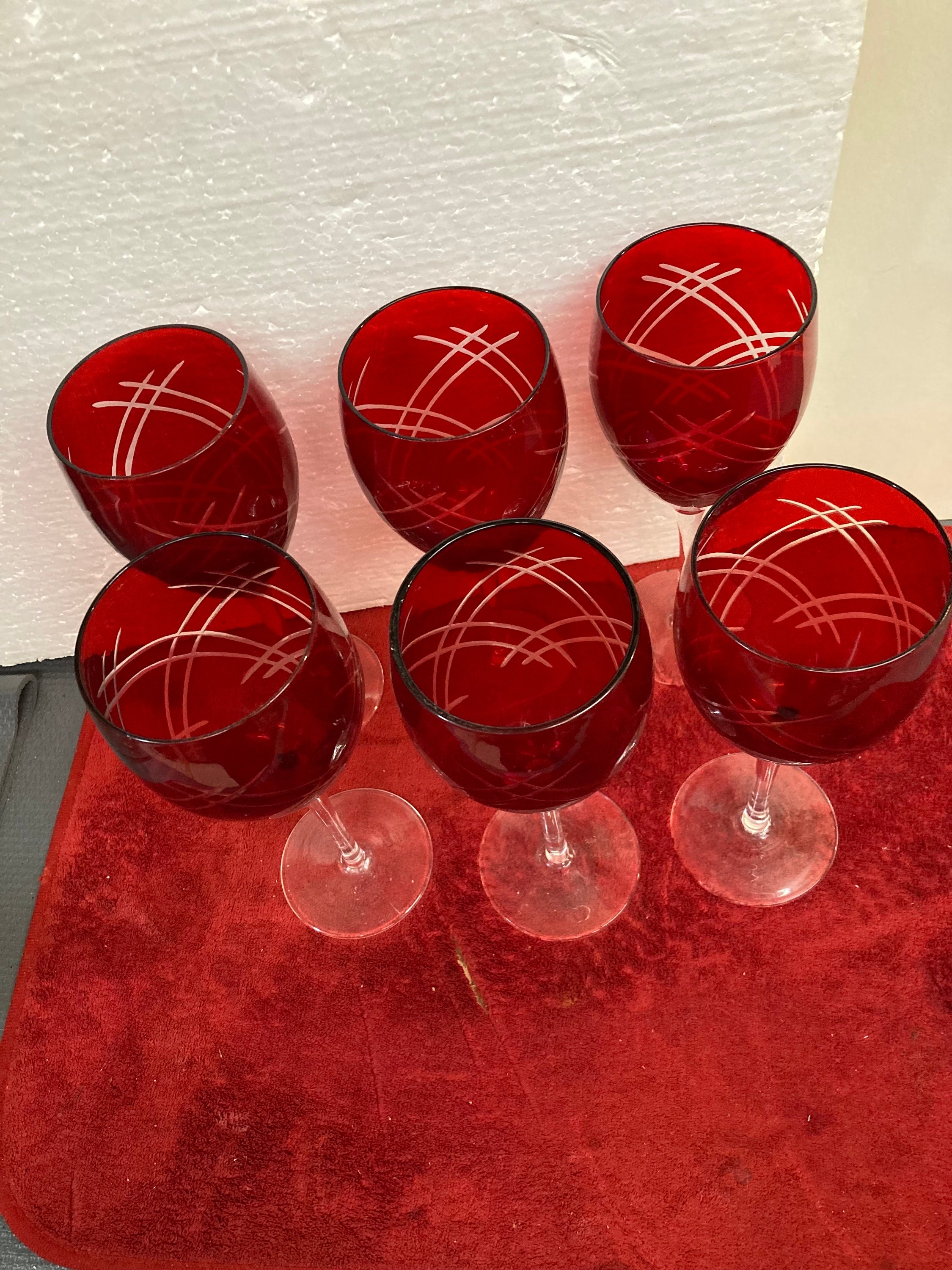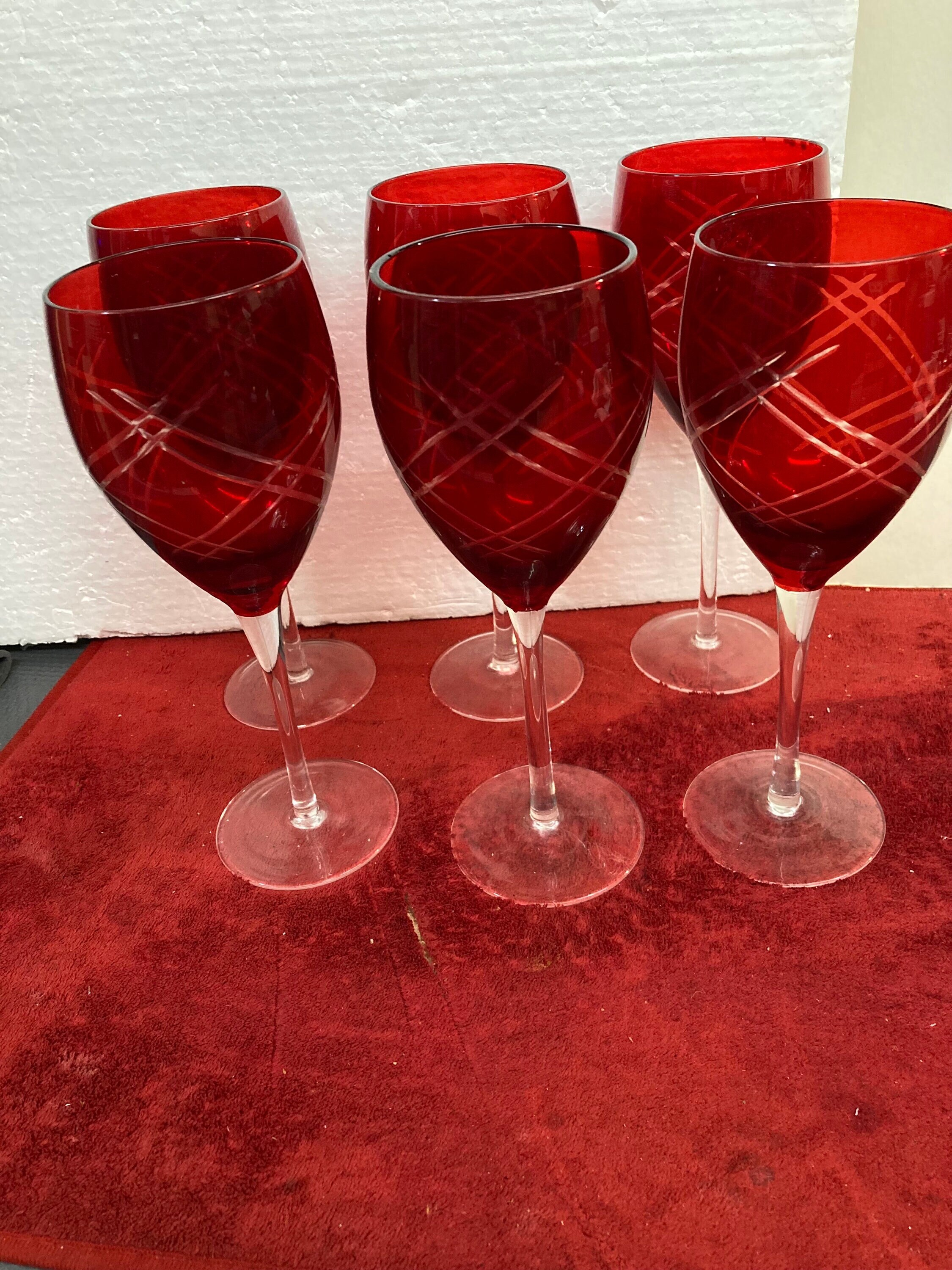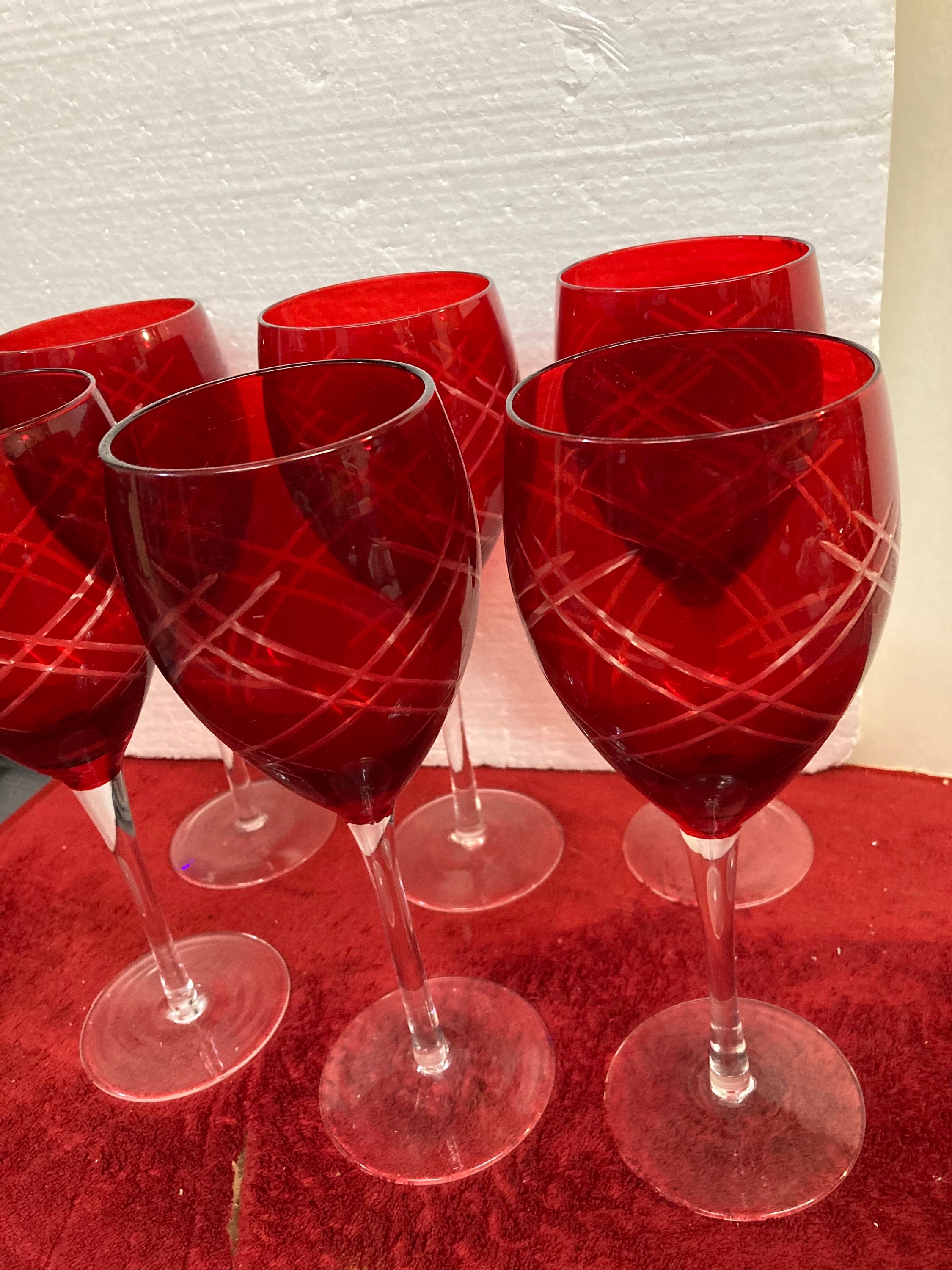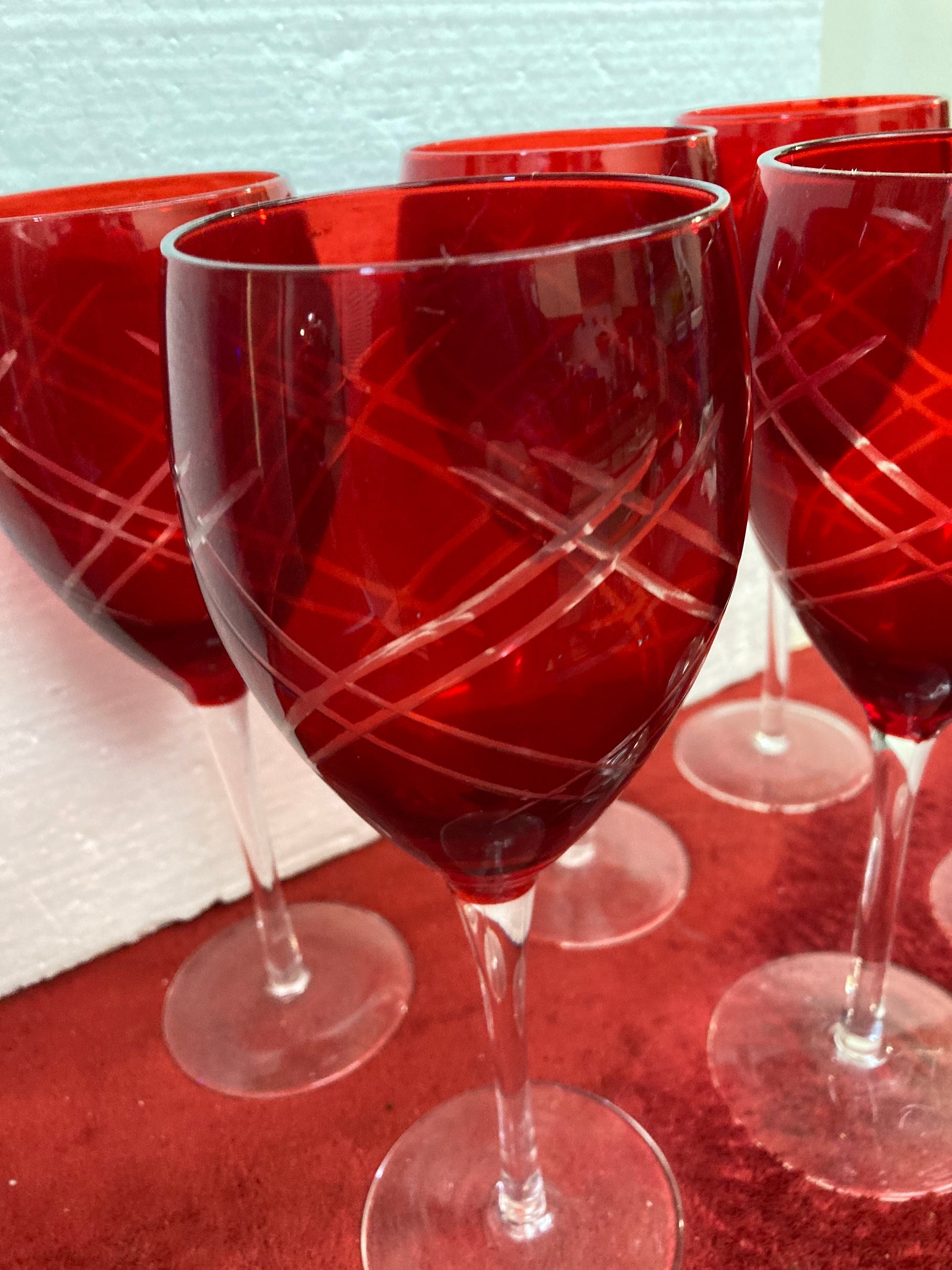 This beautiful set of 6 Glasses are all Ruby Red and are the Curated Art Deco Red Water, Wine, and Cocktail Glasses.