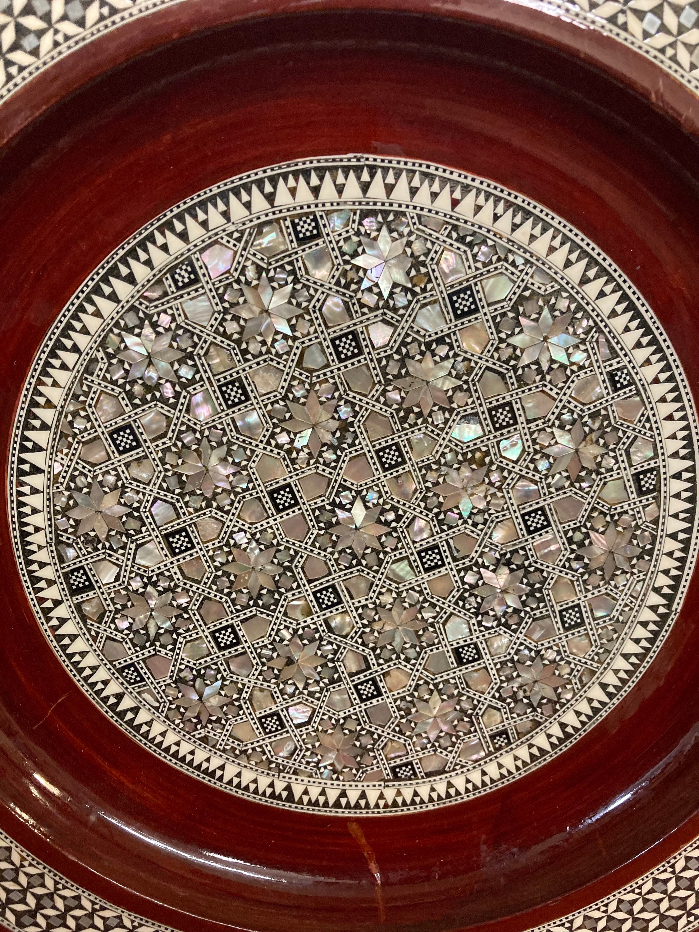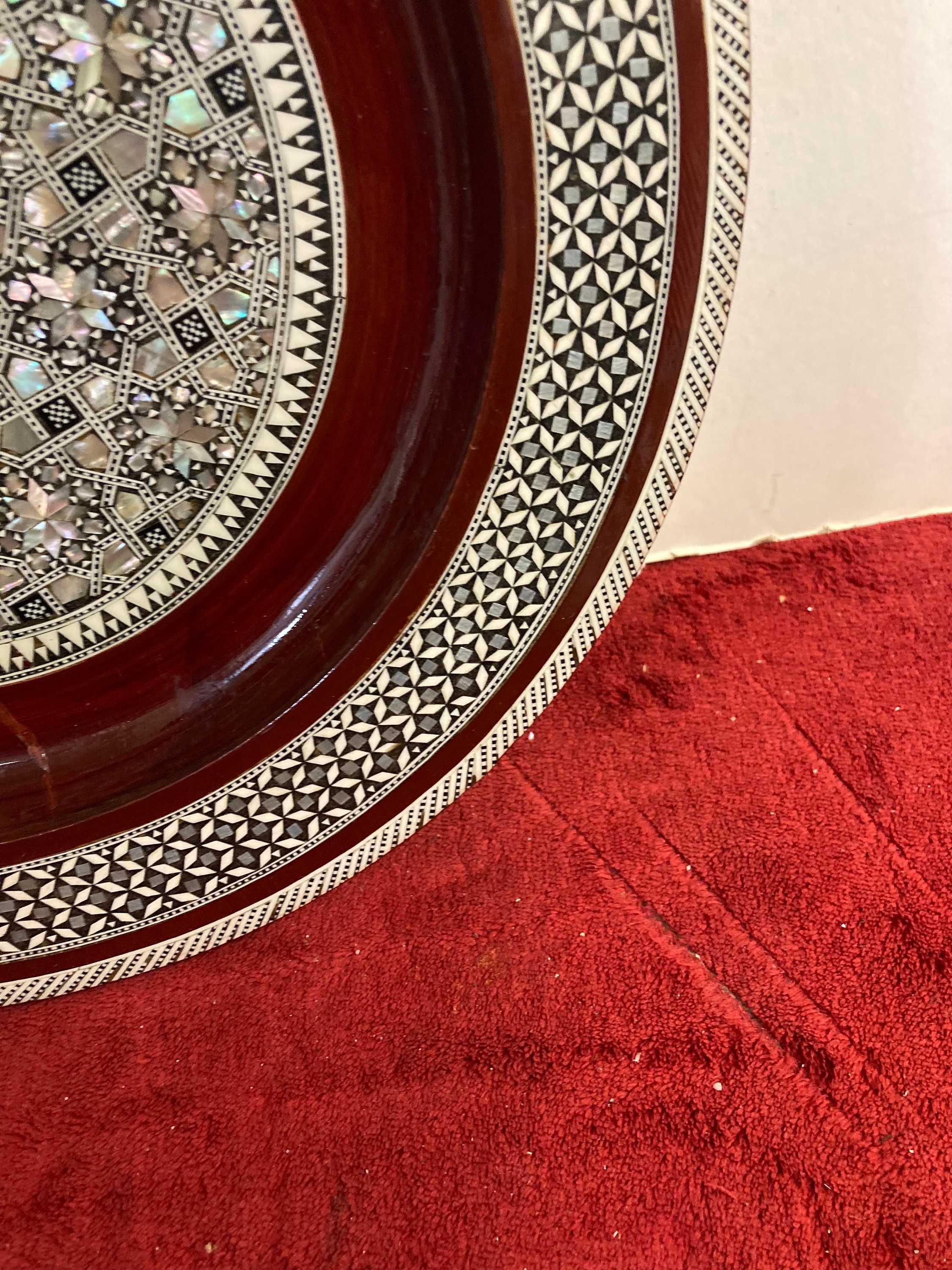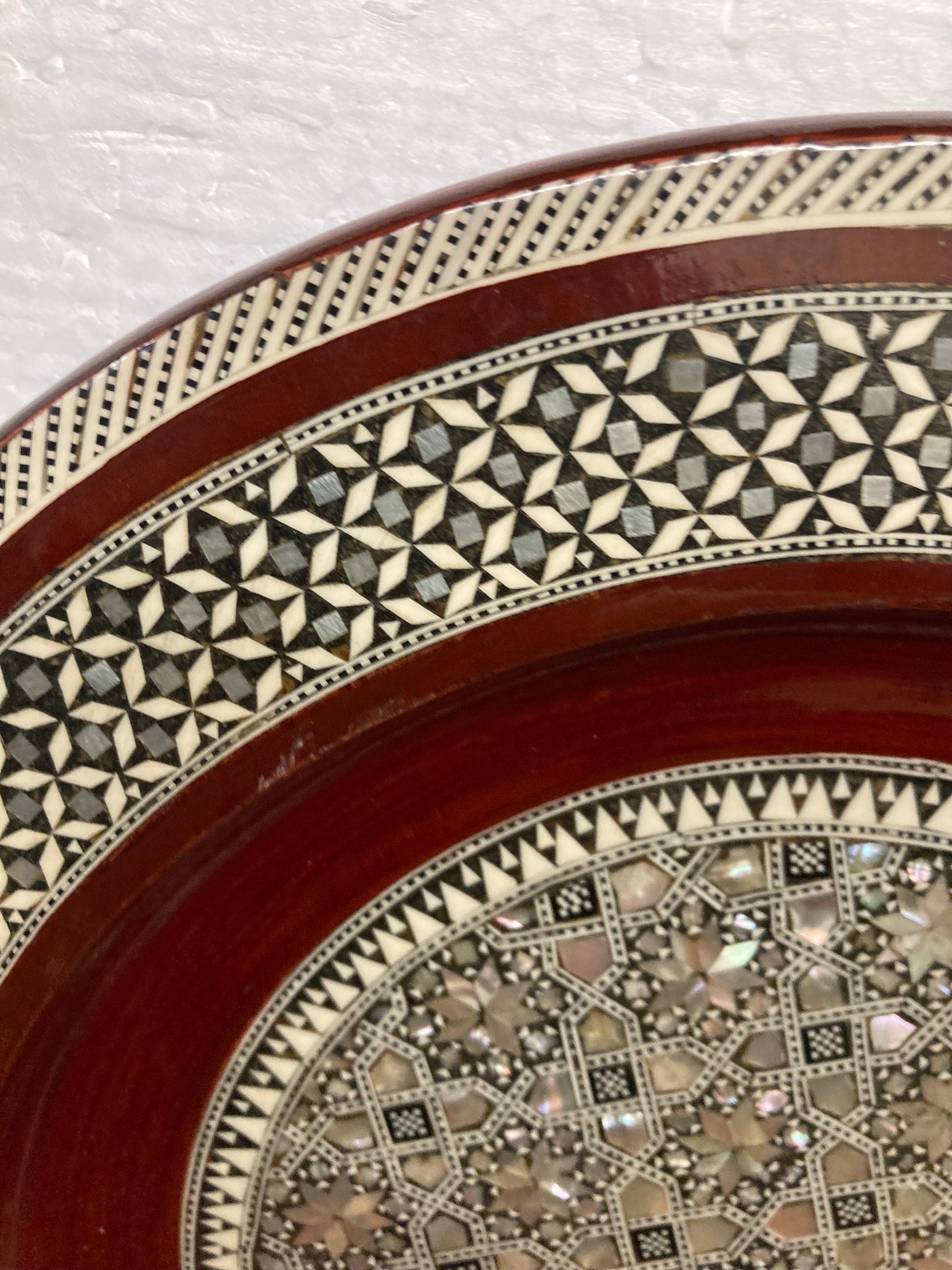 Middle Easter Miniature Look alike Wood Work VINTAGE Egyptian Art Mosaic Abalone Mother of Pearl Inlay Look on Wood Decorative 12"IN DIAMETER X 1.5" DEEPItem is in perfect Vintage condition No Damages