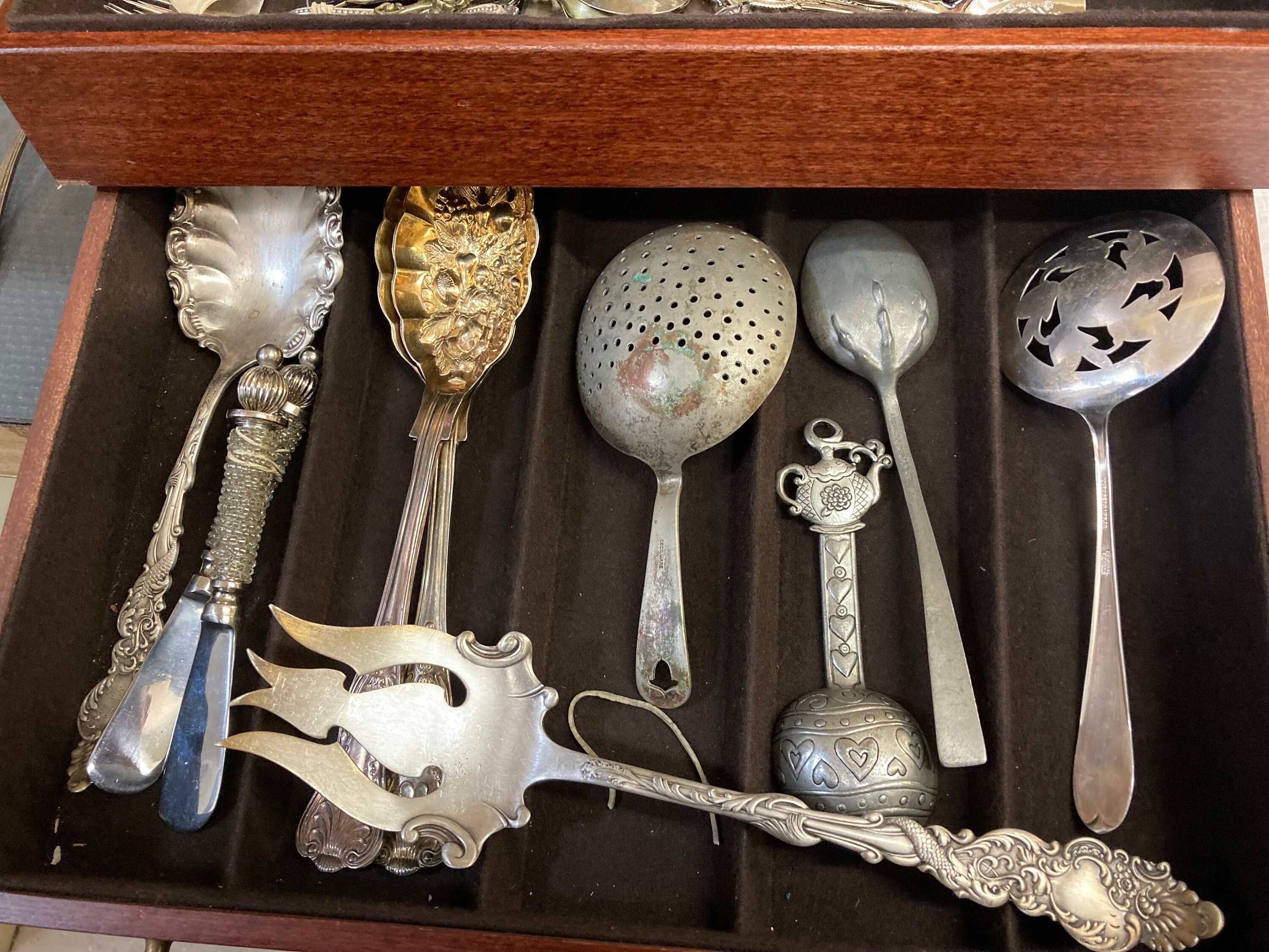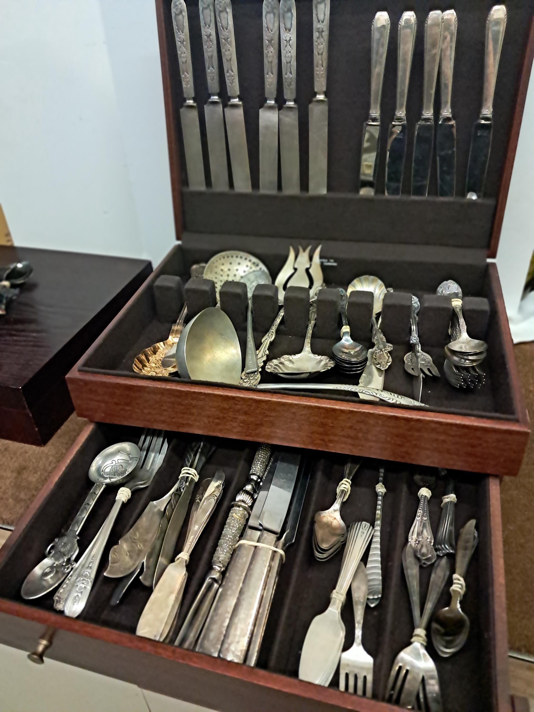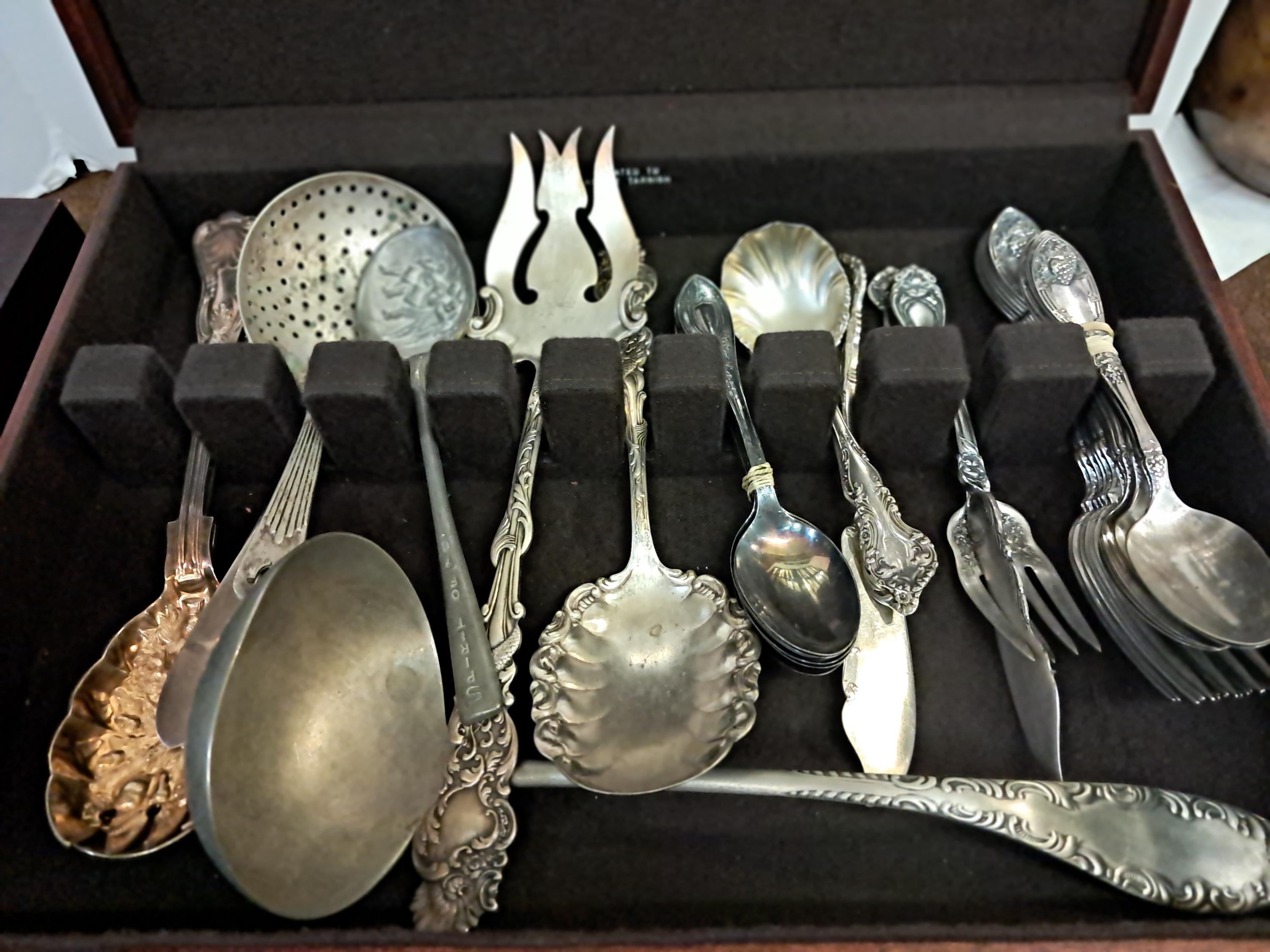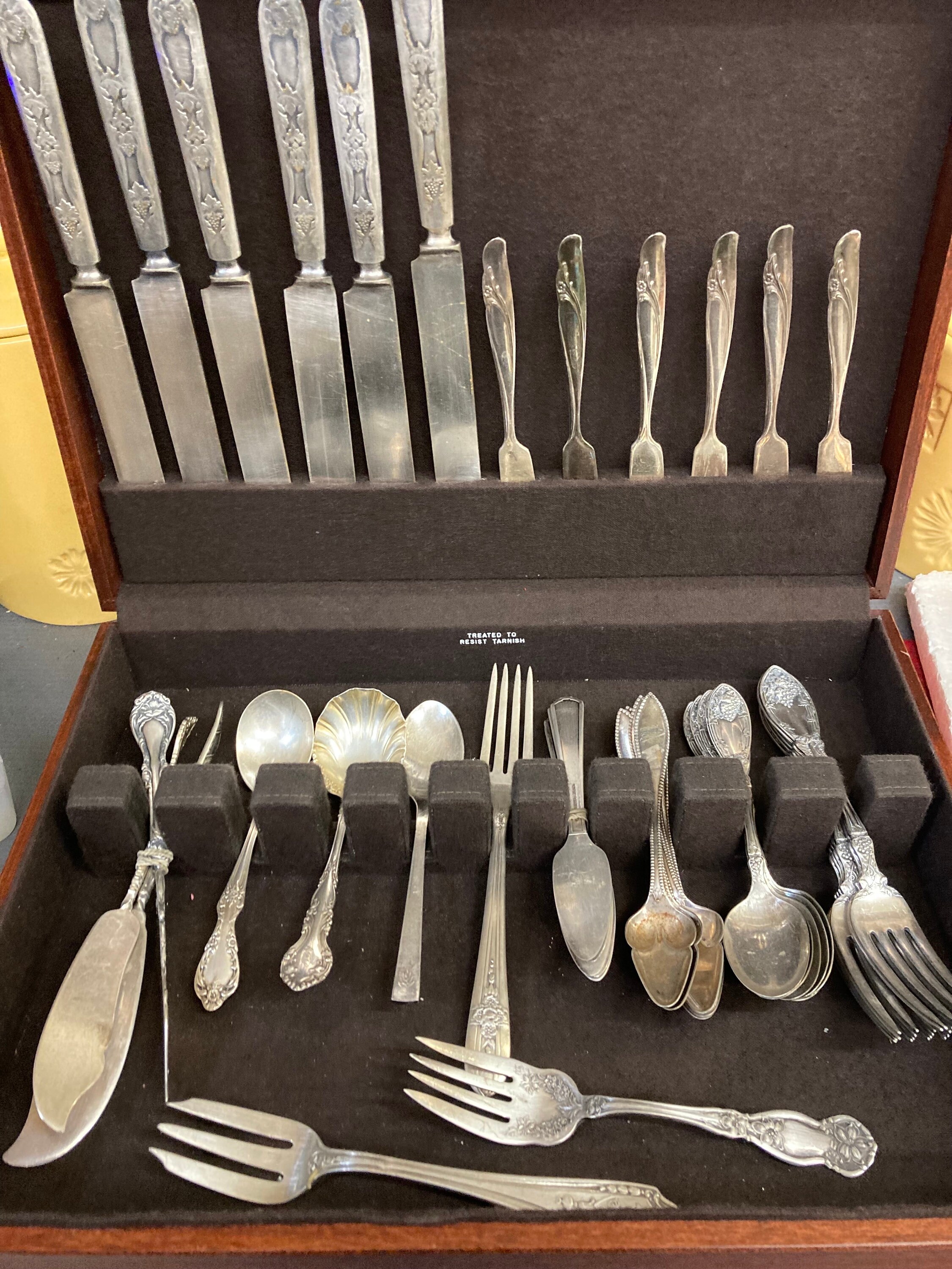 117 Pcs of Assorted Vintage / Antique Silver Plate FlatwareMost belong to early 20th Centuryplease refer to pictures as part of descriptionLess than $2 each priced to sell fast with a Vintage wooden case