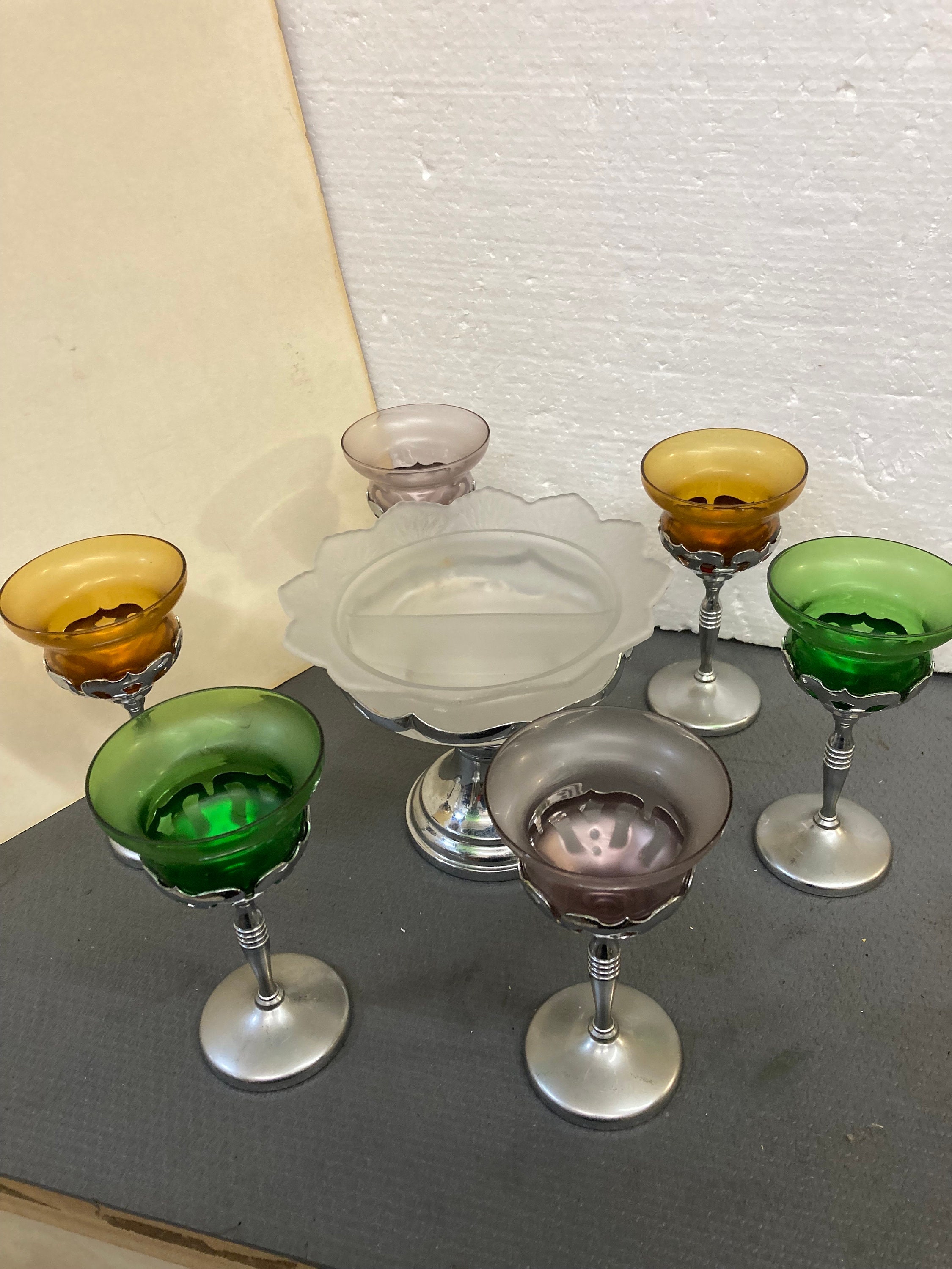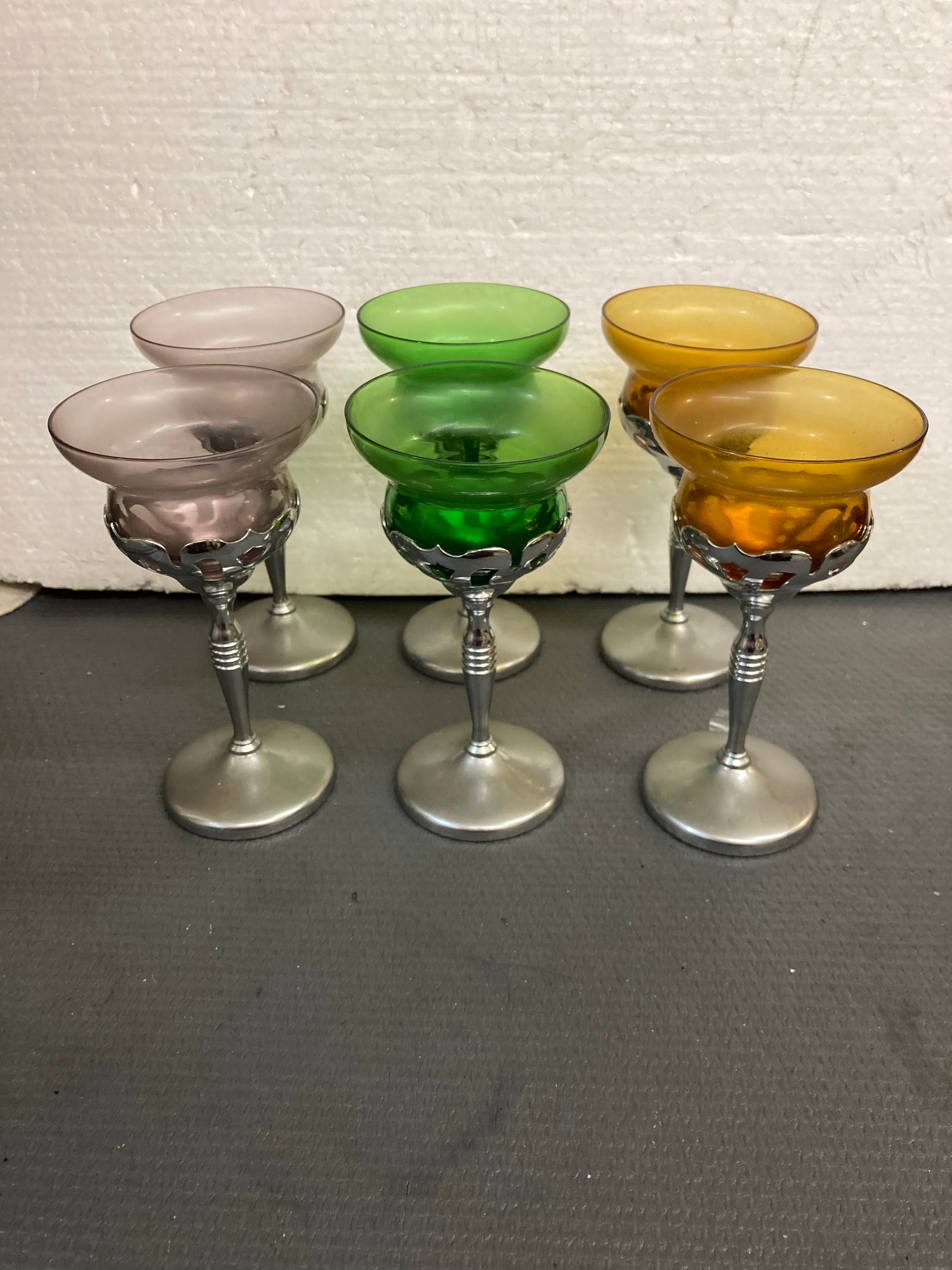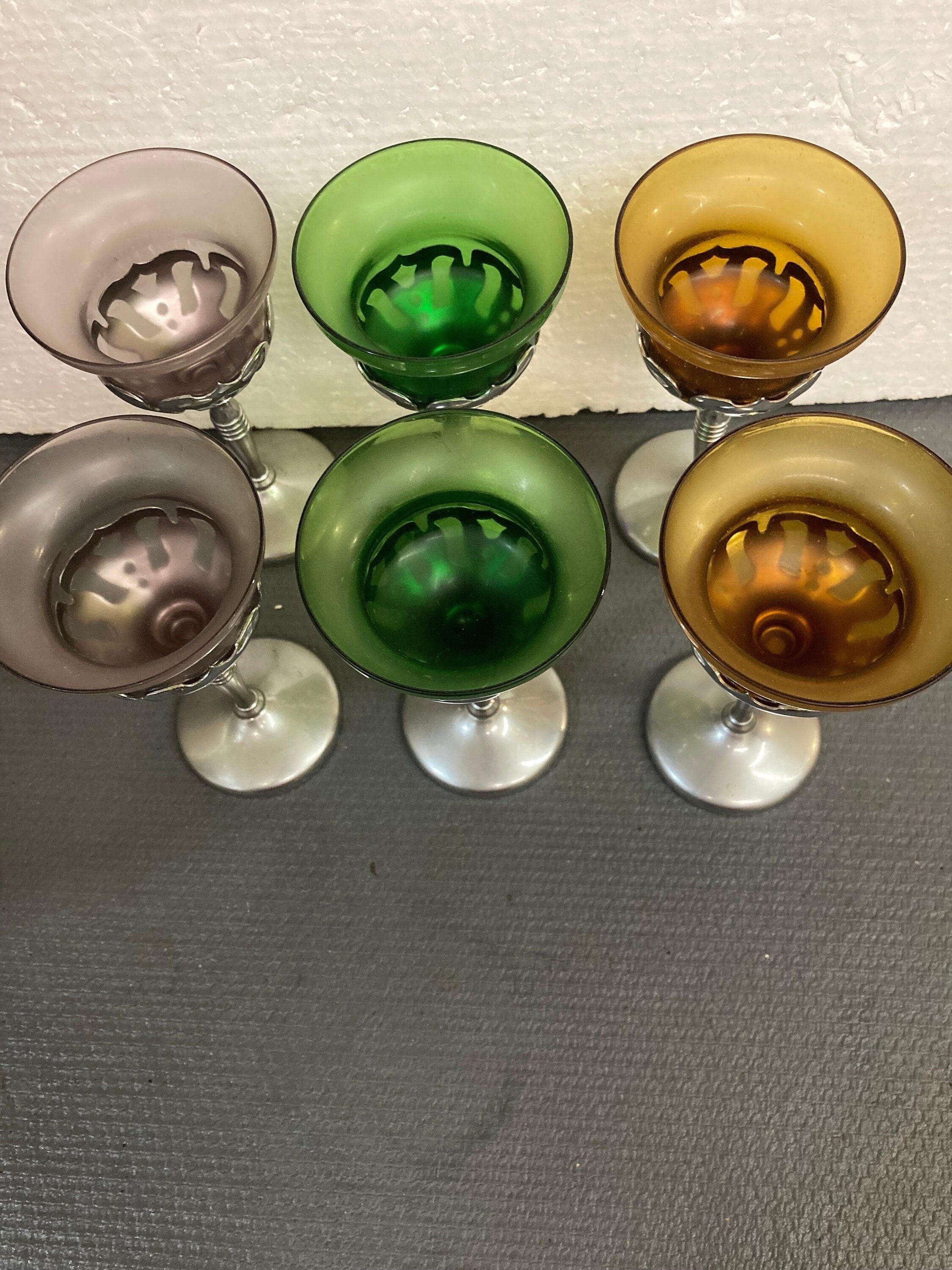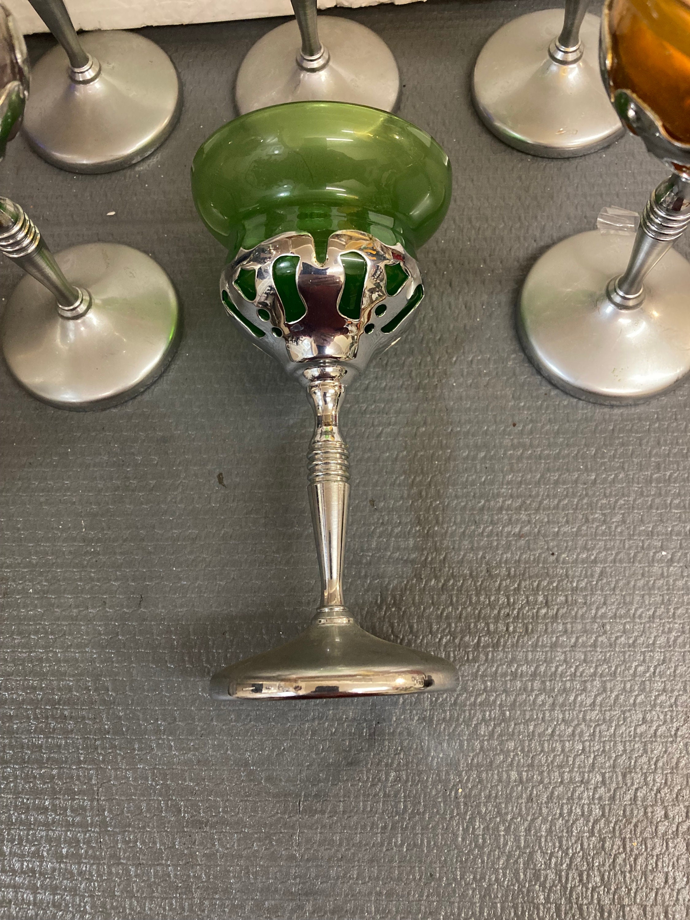 You are Viewing a 6pc Set of Cambridge Farberware Chrome Cocktail Glass with Amber, and Green Glass Inserts.