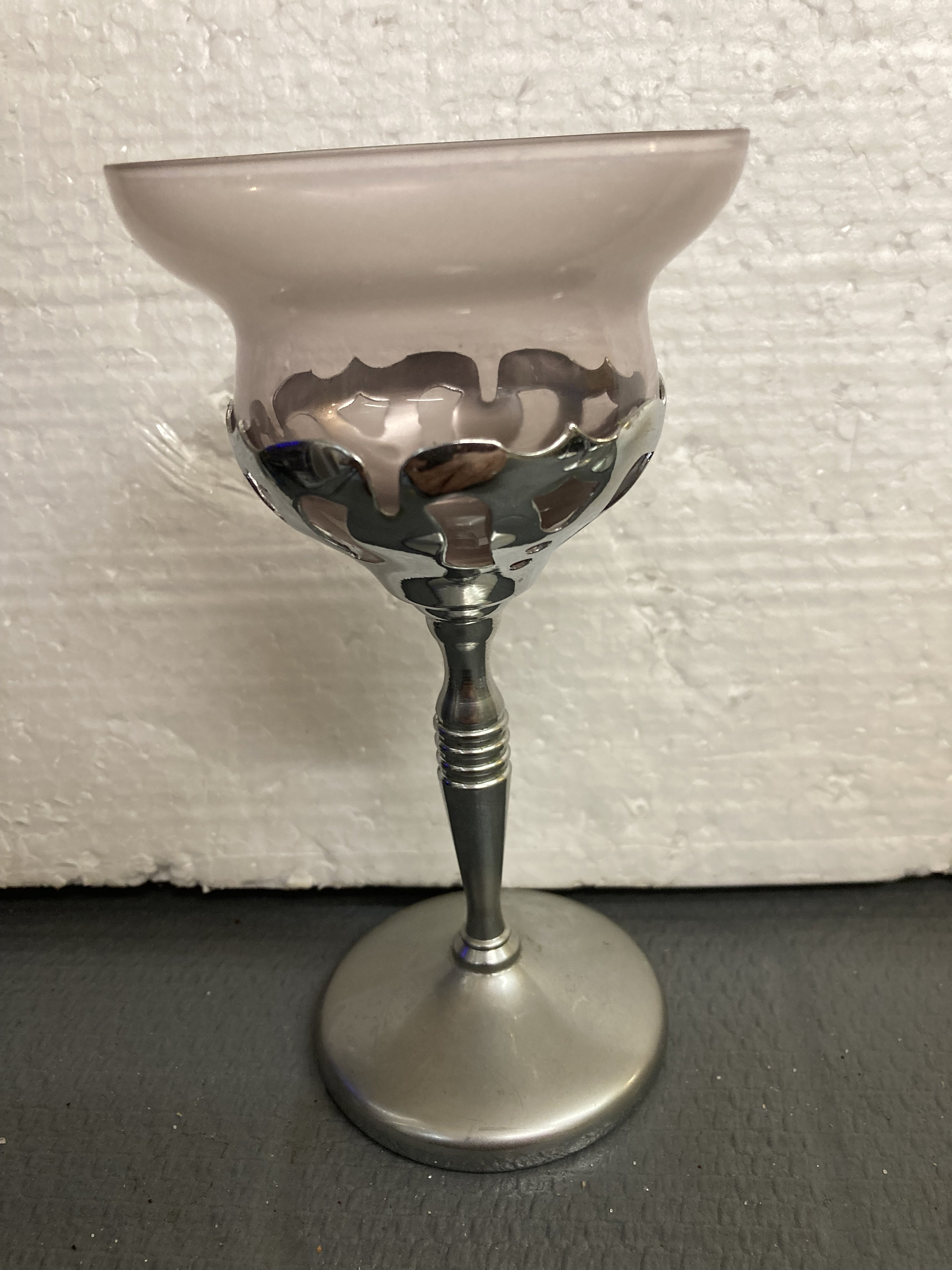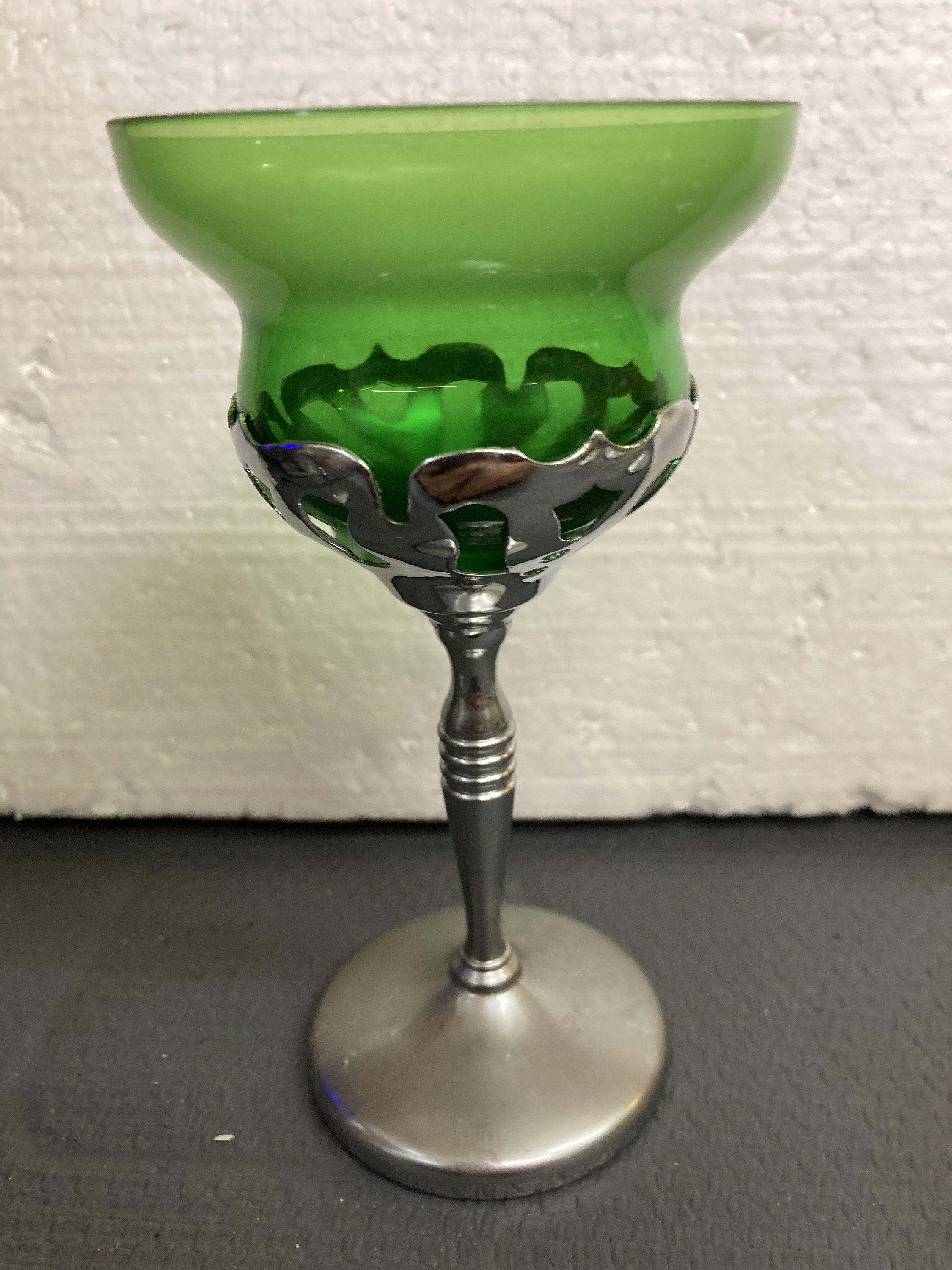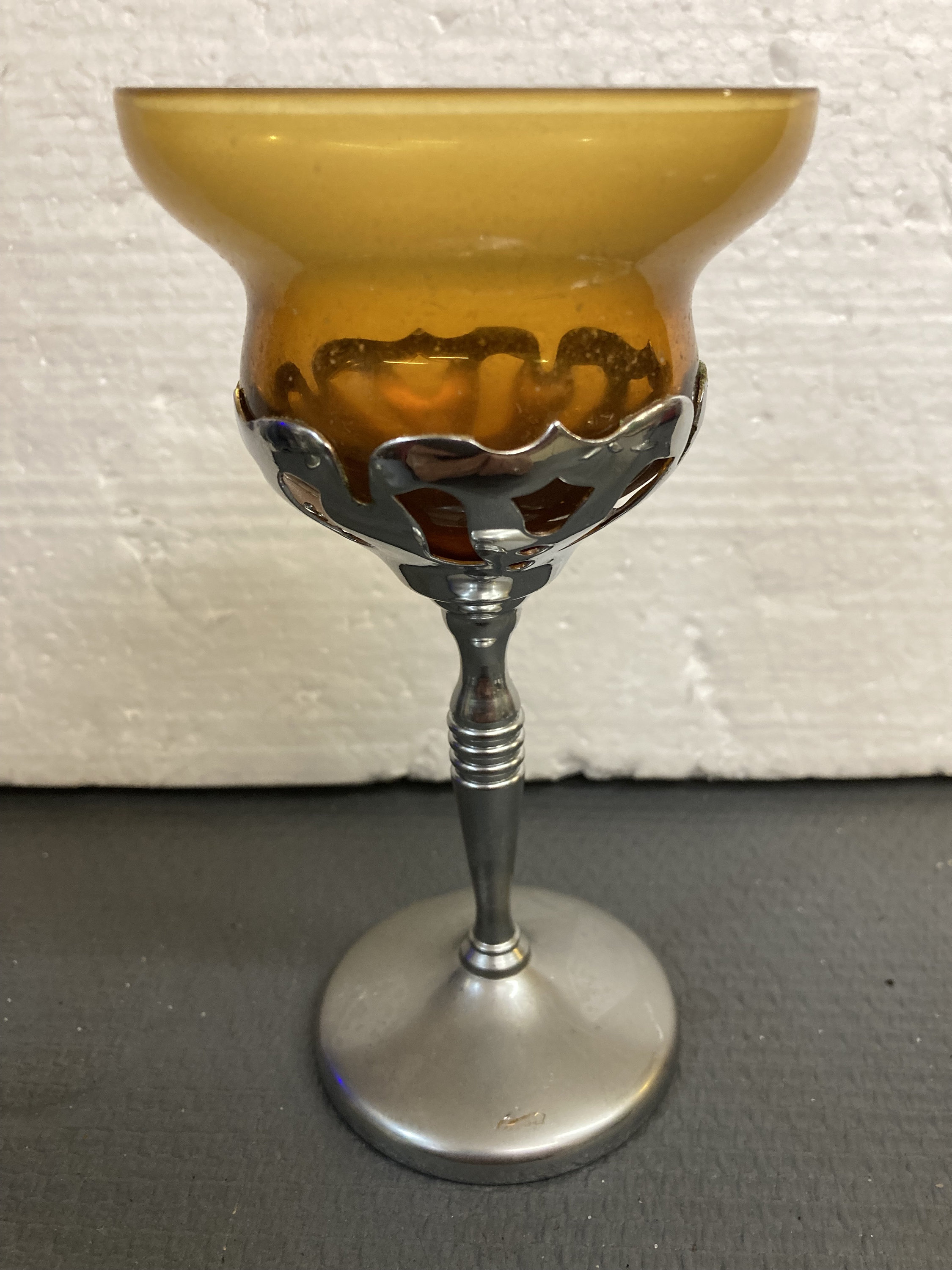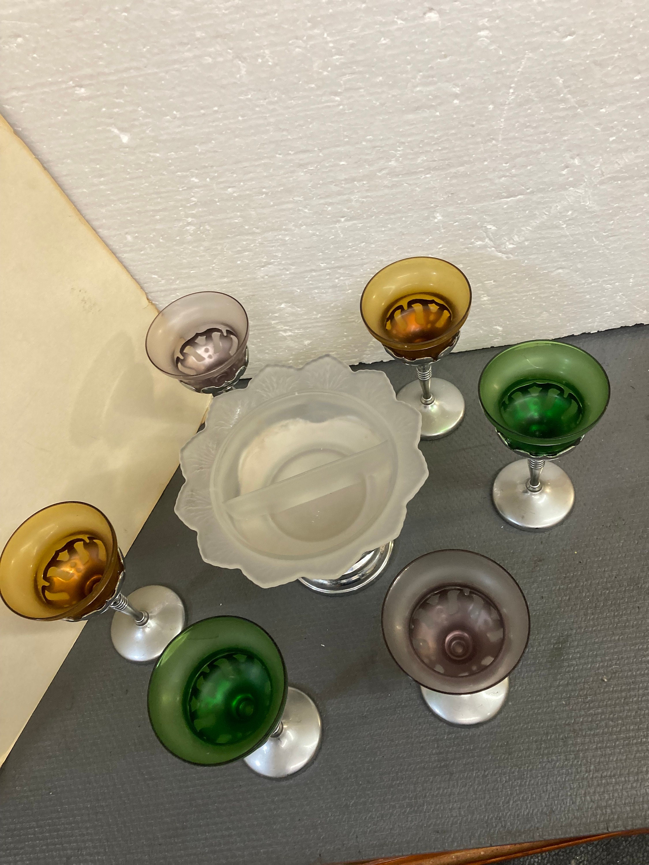 You are Viewing a 6pc Set of Cambridge Farberware Chrome Cocktail Glass with Amber, and Green Glass Inserts.