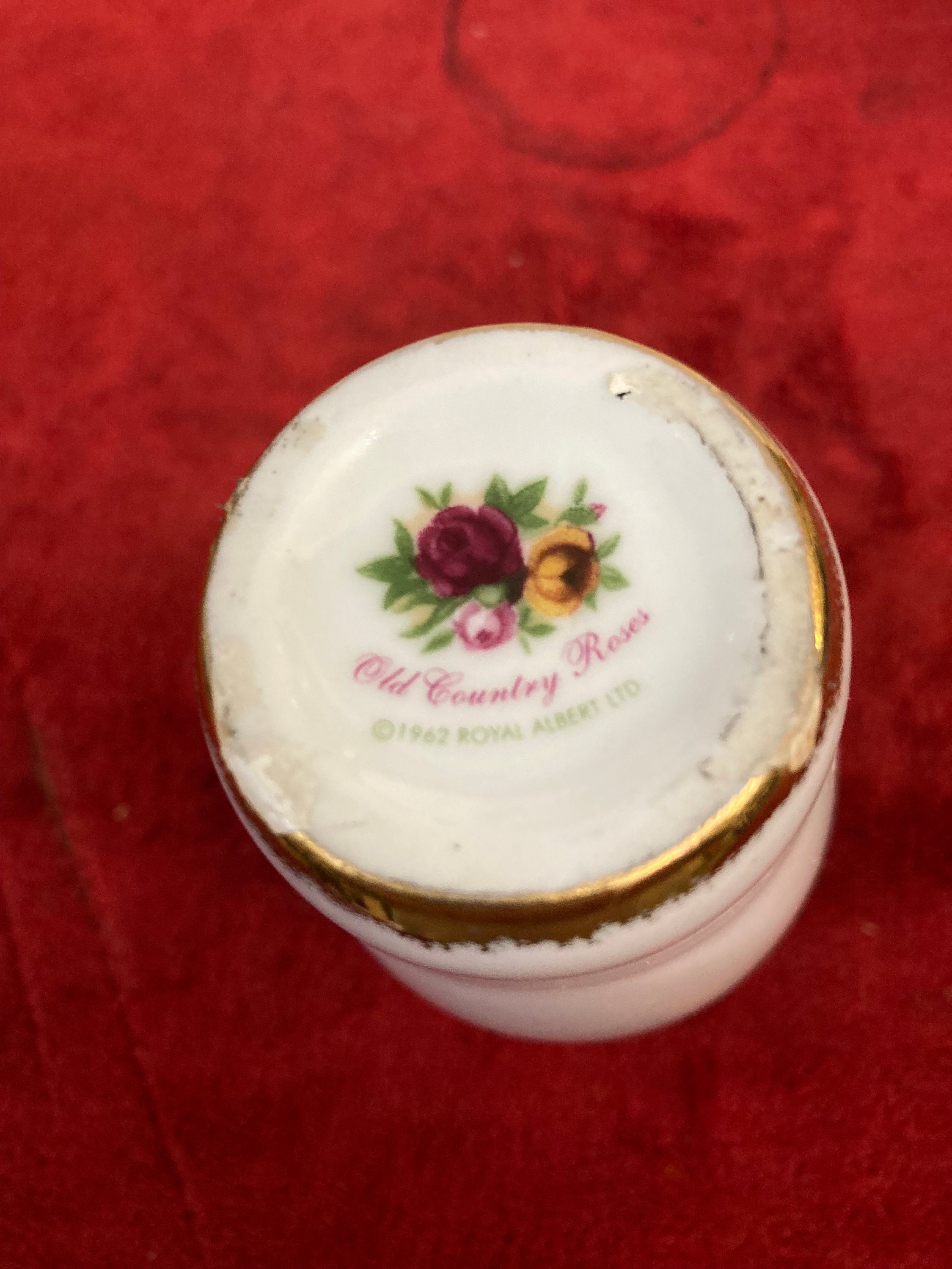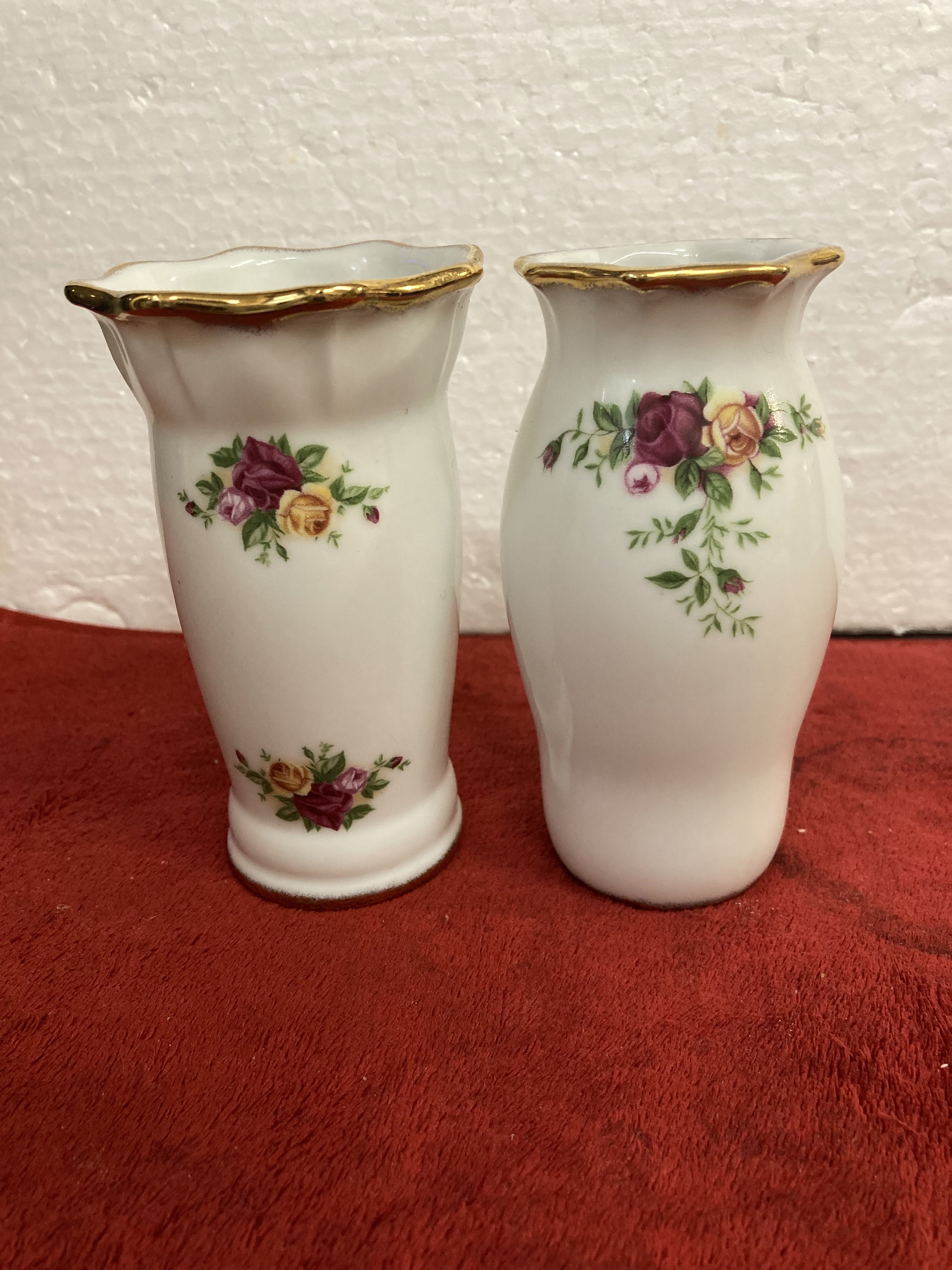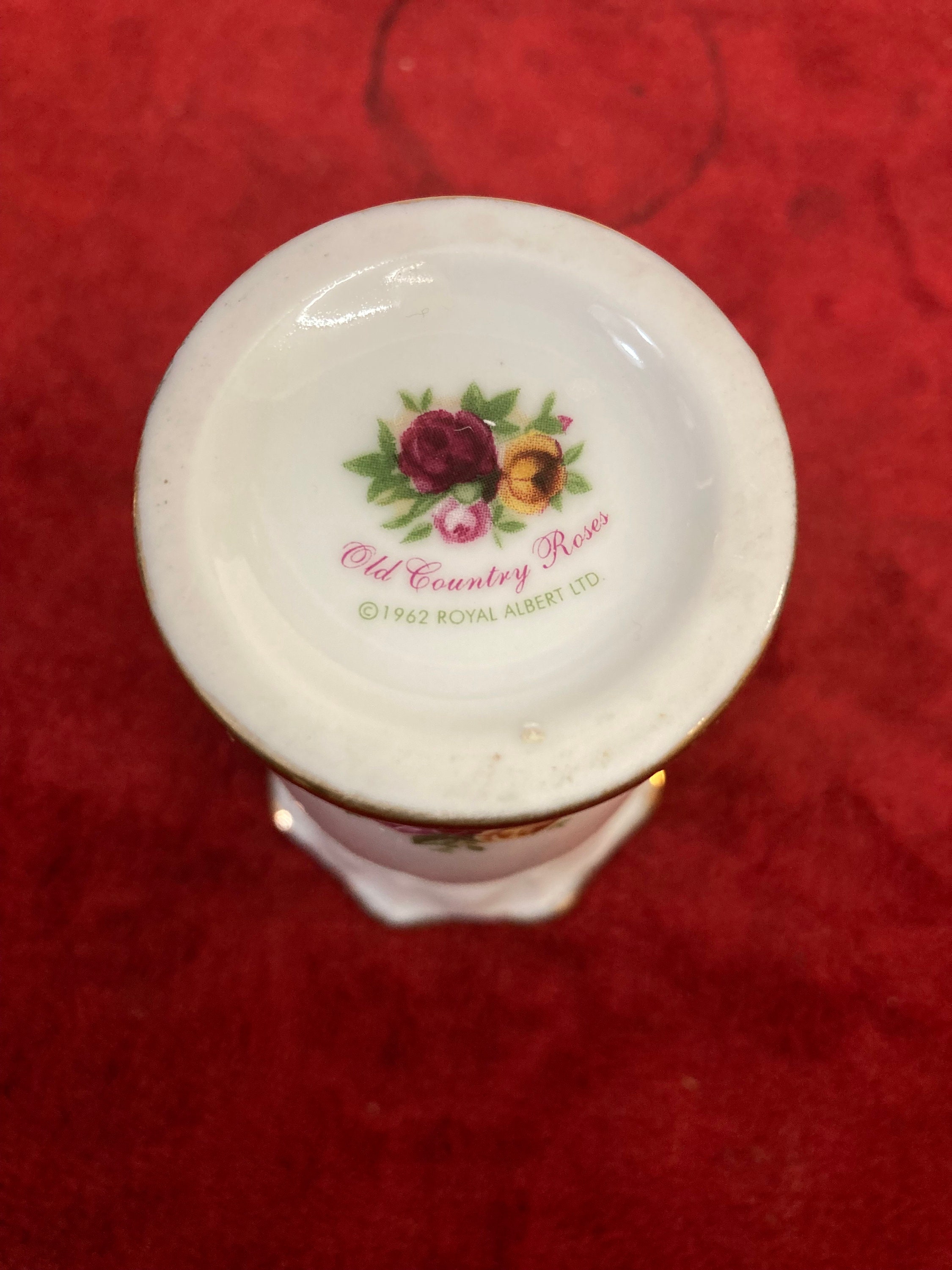 The pretty vase measures 4.75 inches high and is 2.25 inches in diameter and features the ever popular red and yellow roses of the OCR or Old Country Roses design.