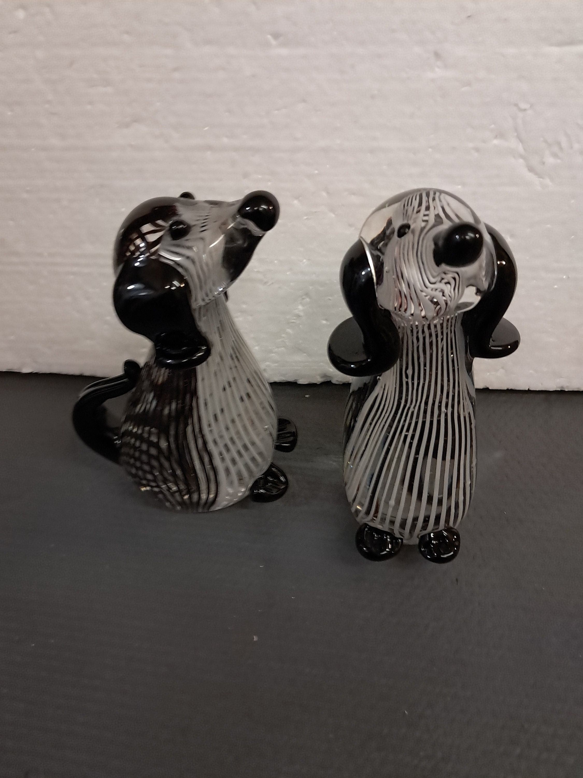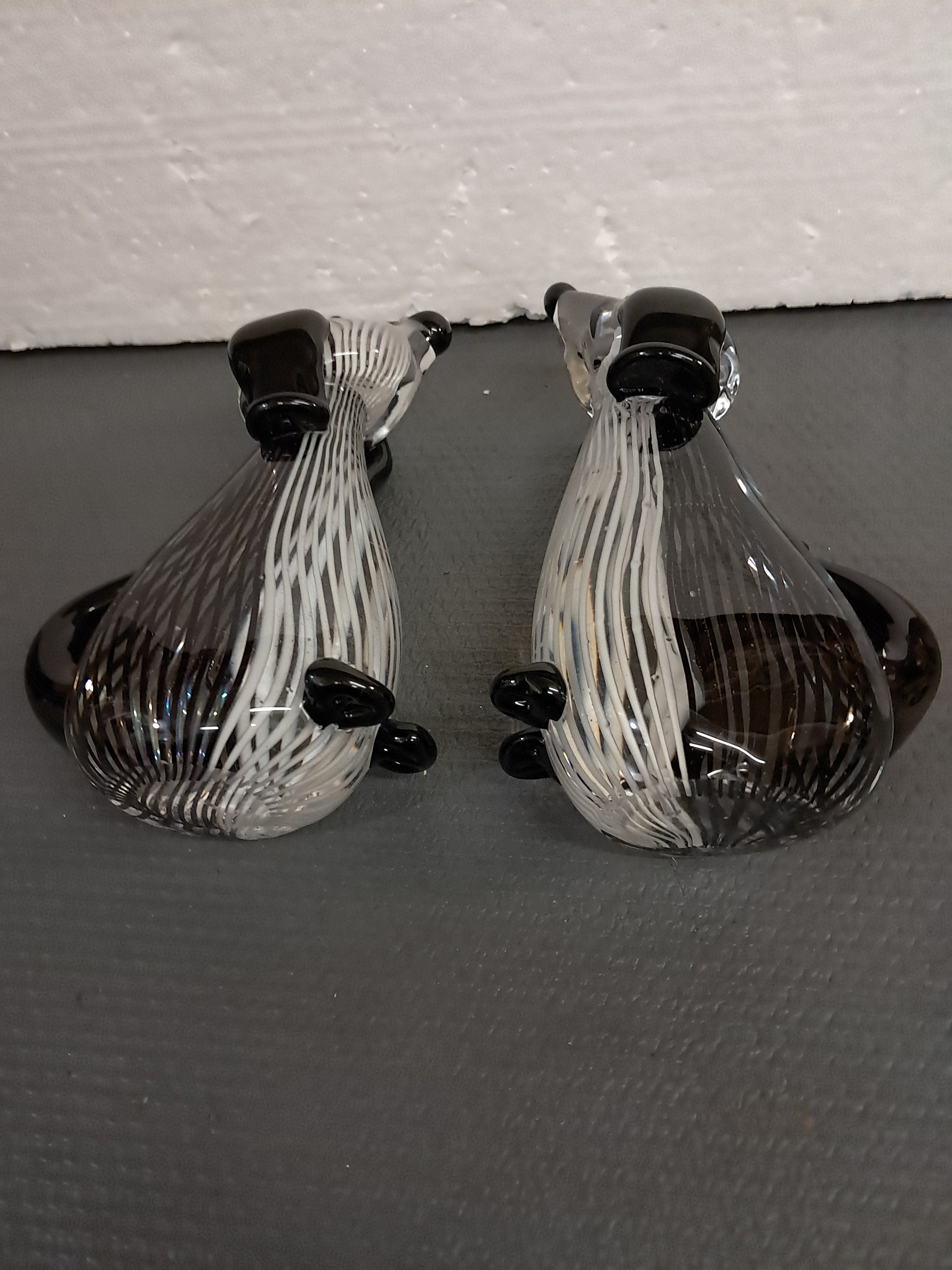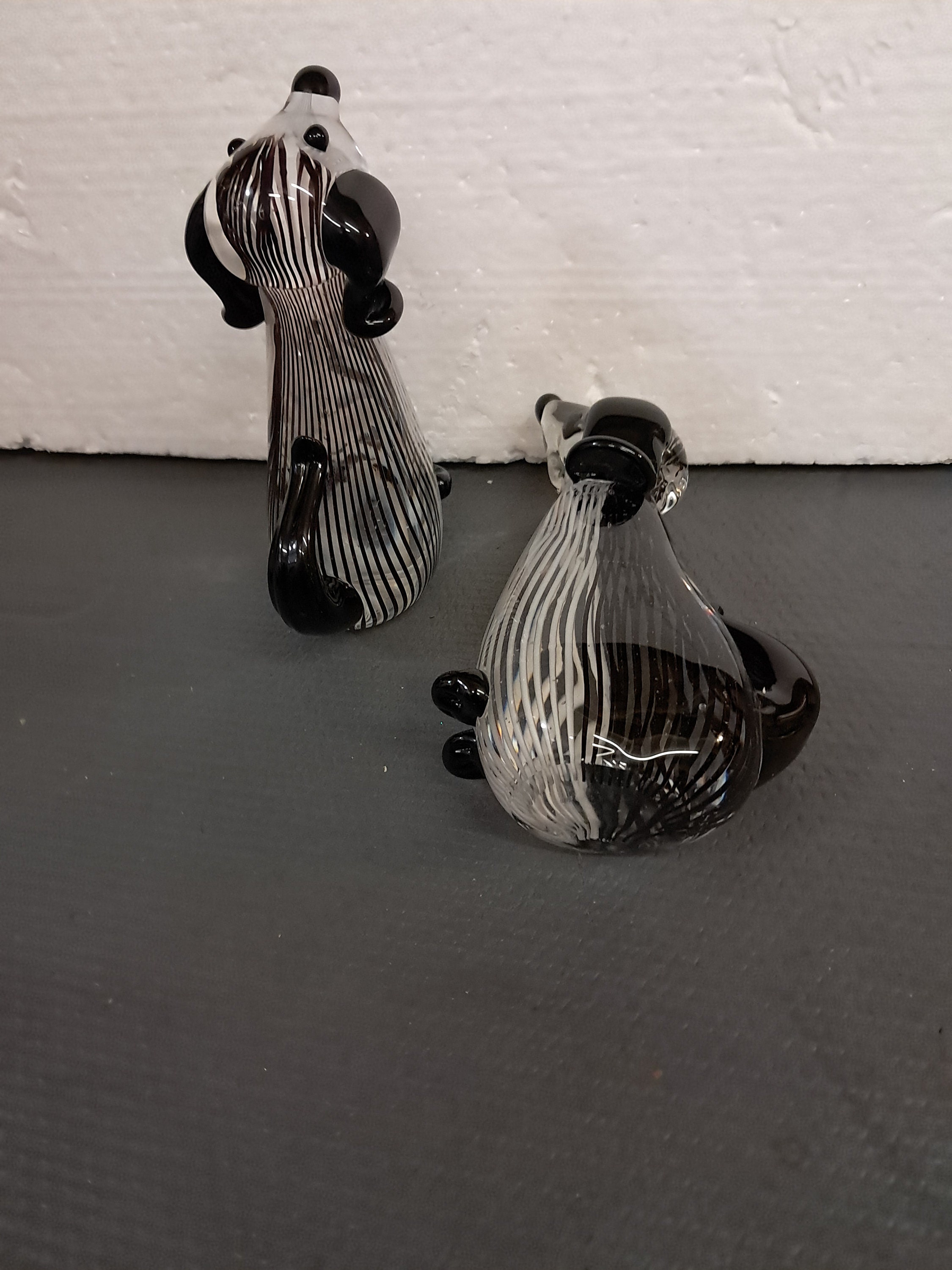 TWO sculptural black and white striped glass dog, made in China.
