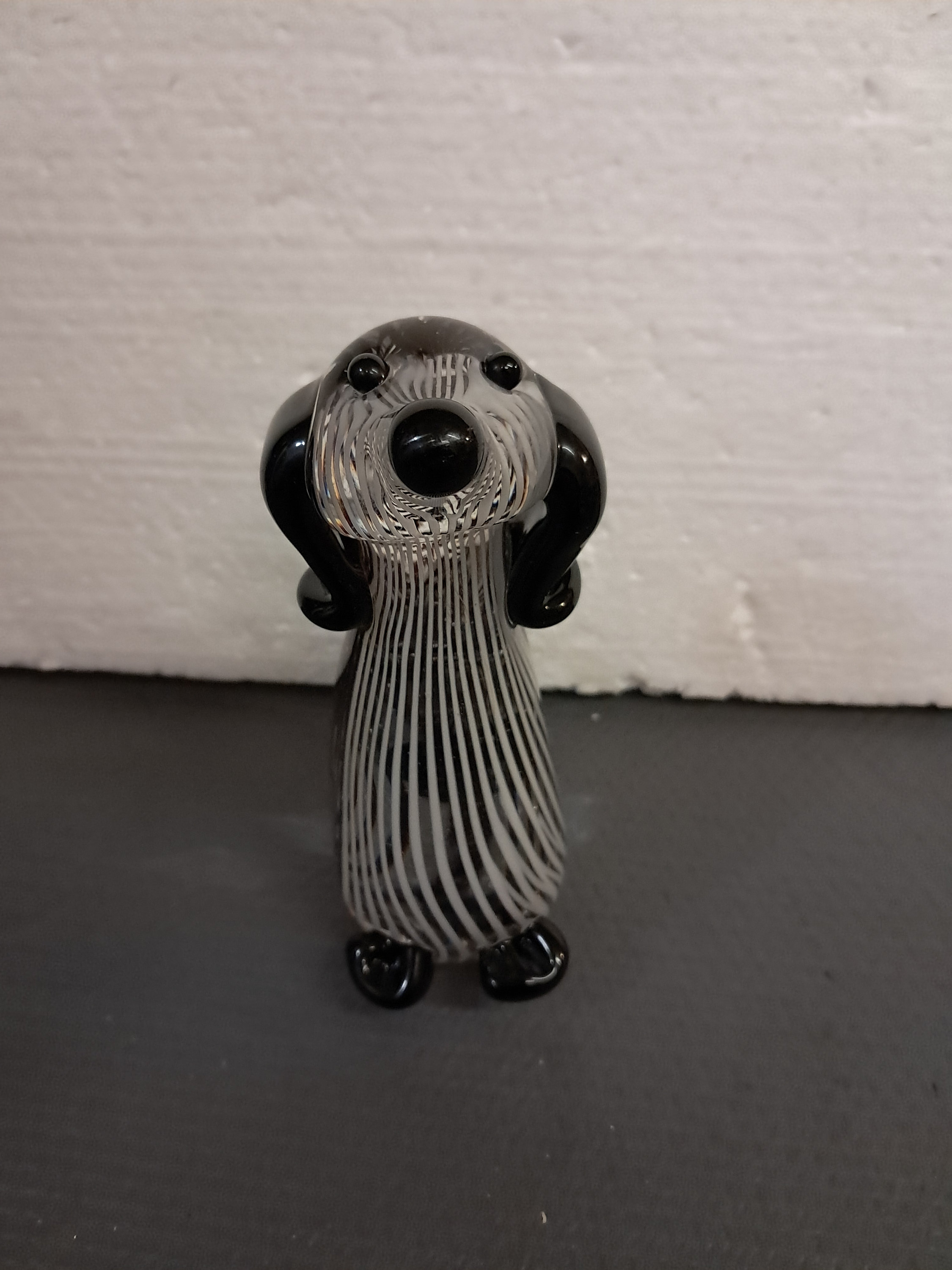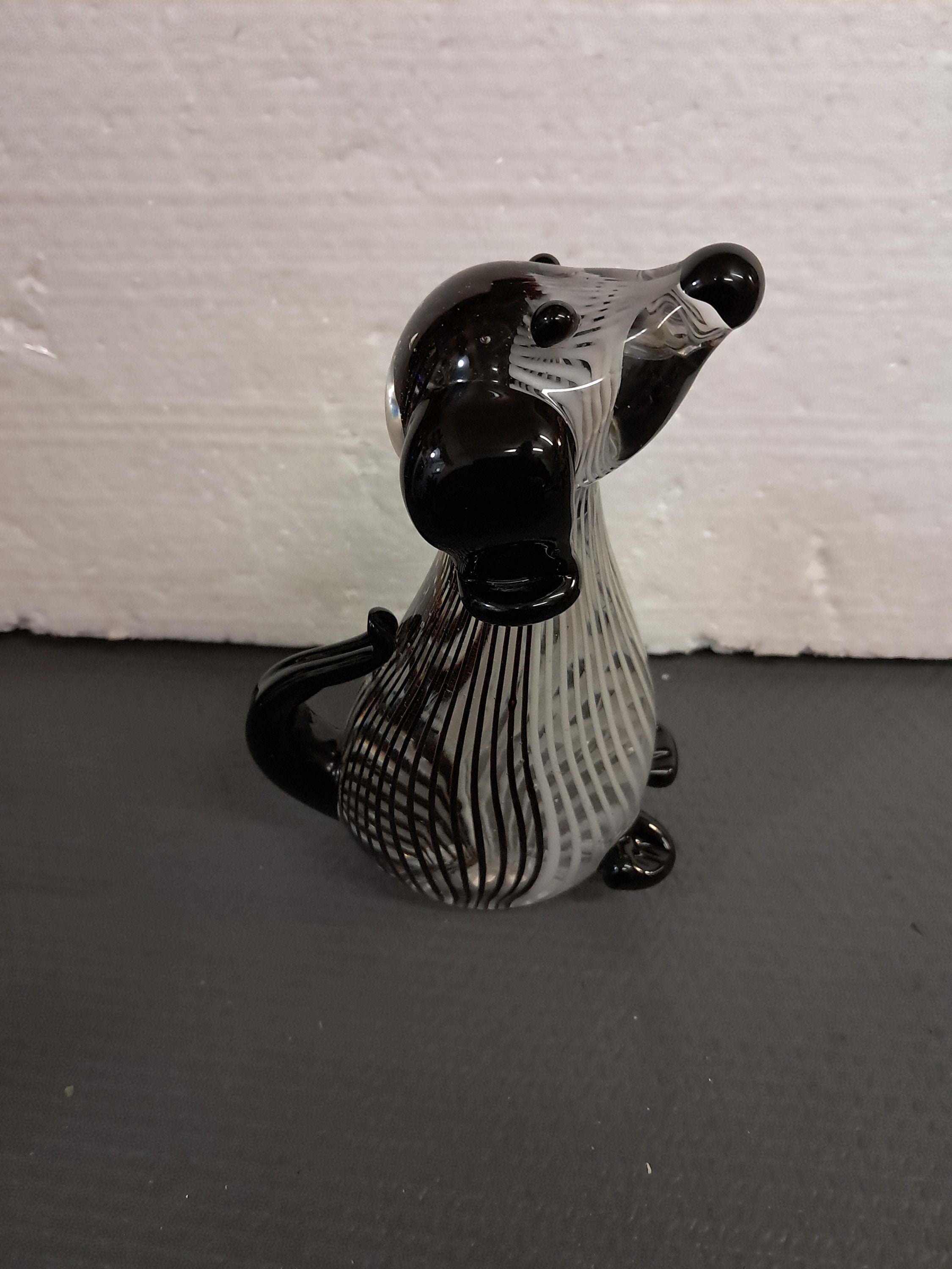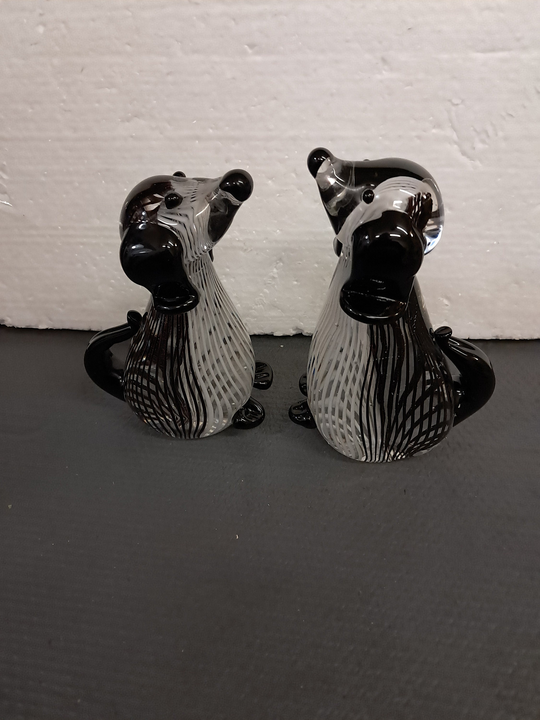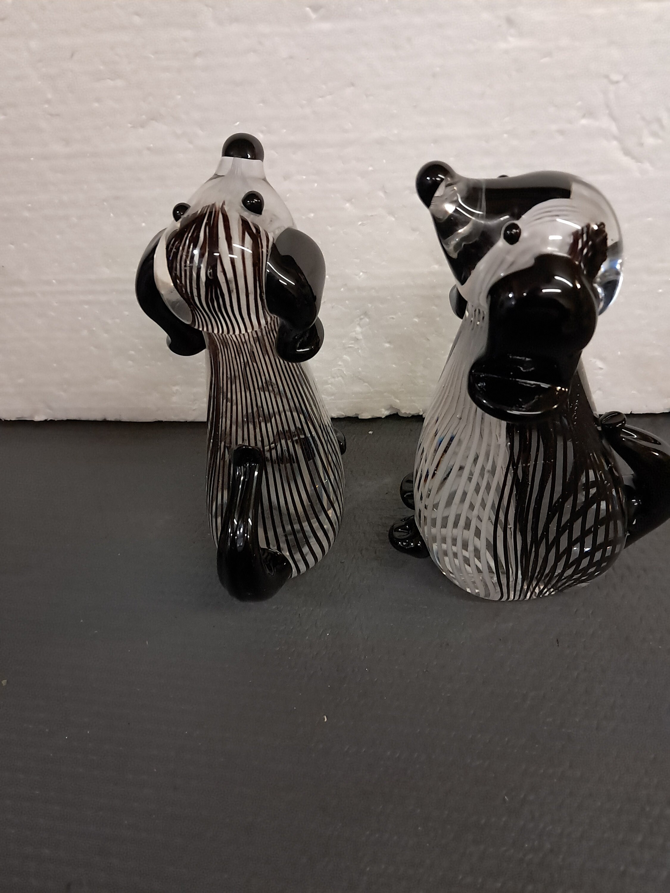 TWO sculptural black and white striped glass dog, made in China.