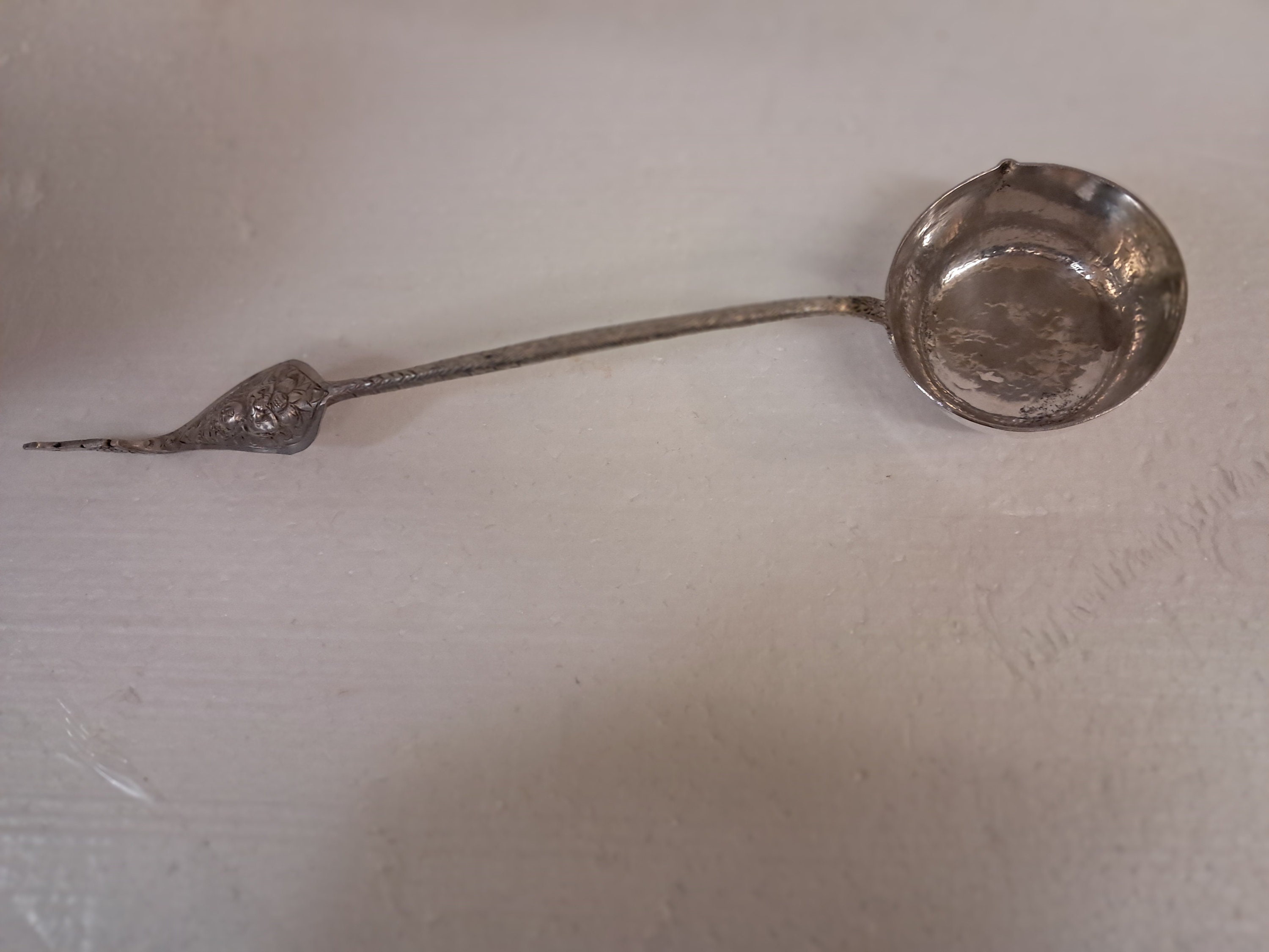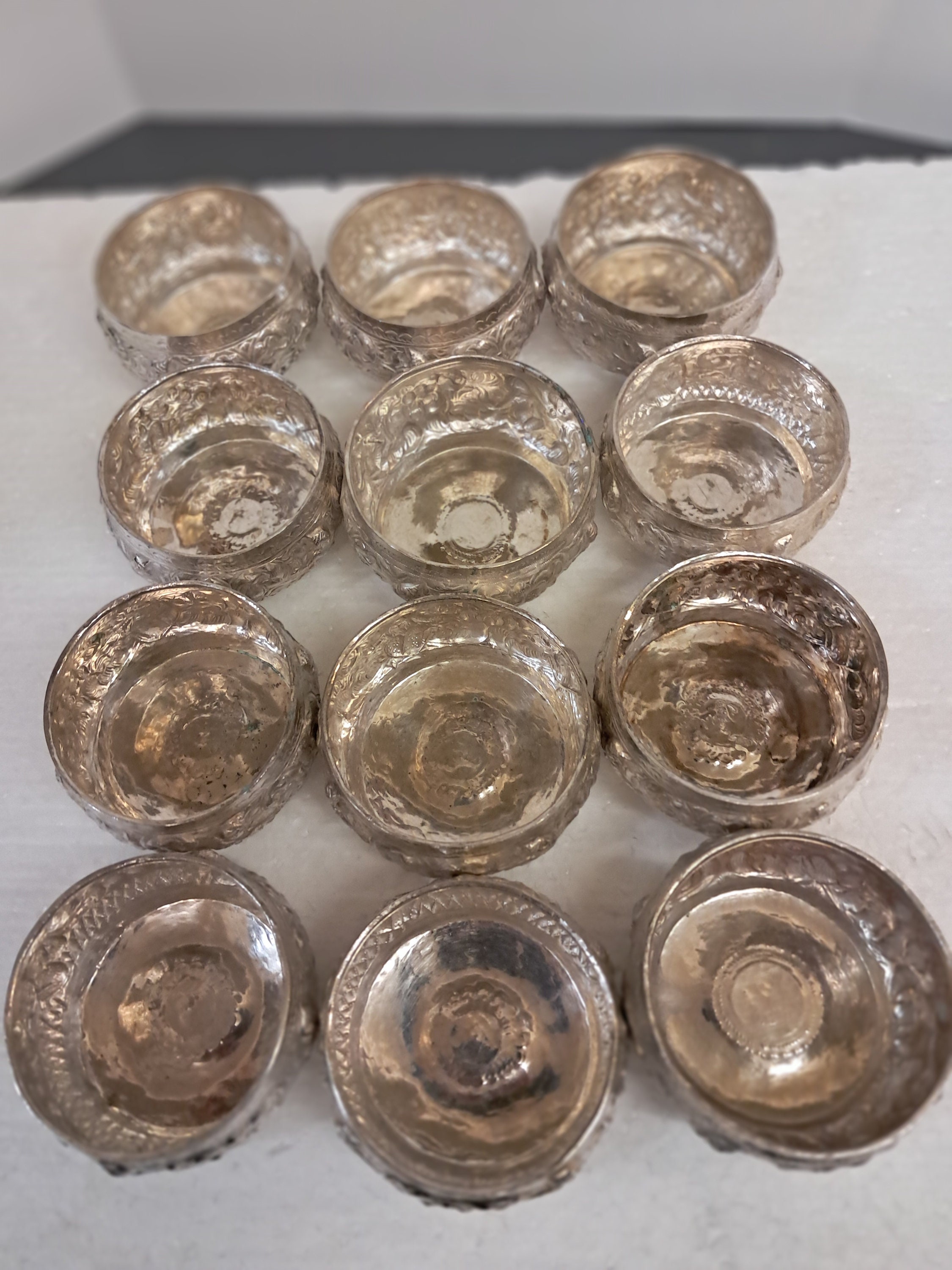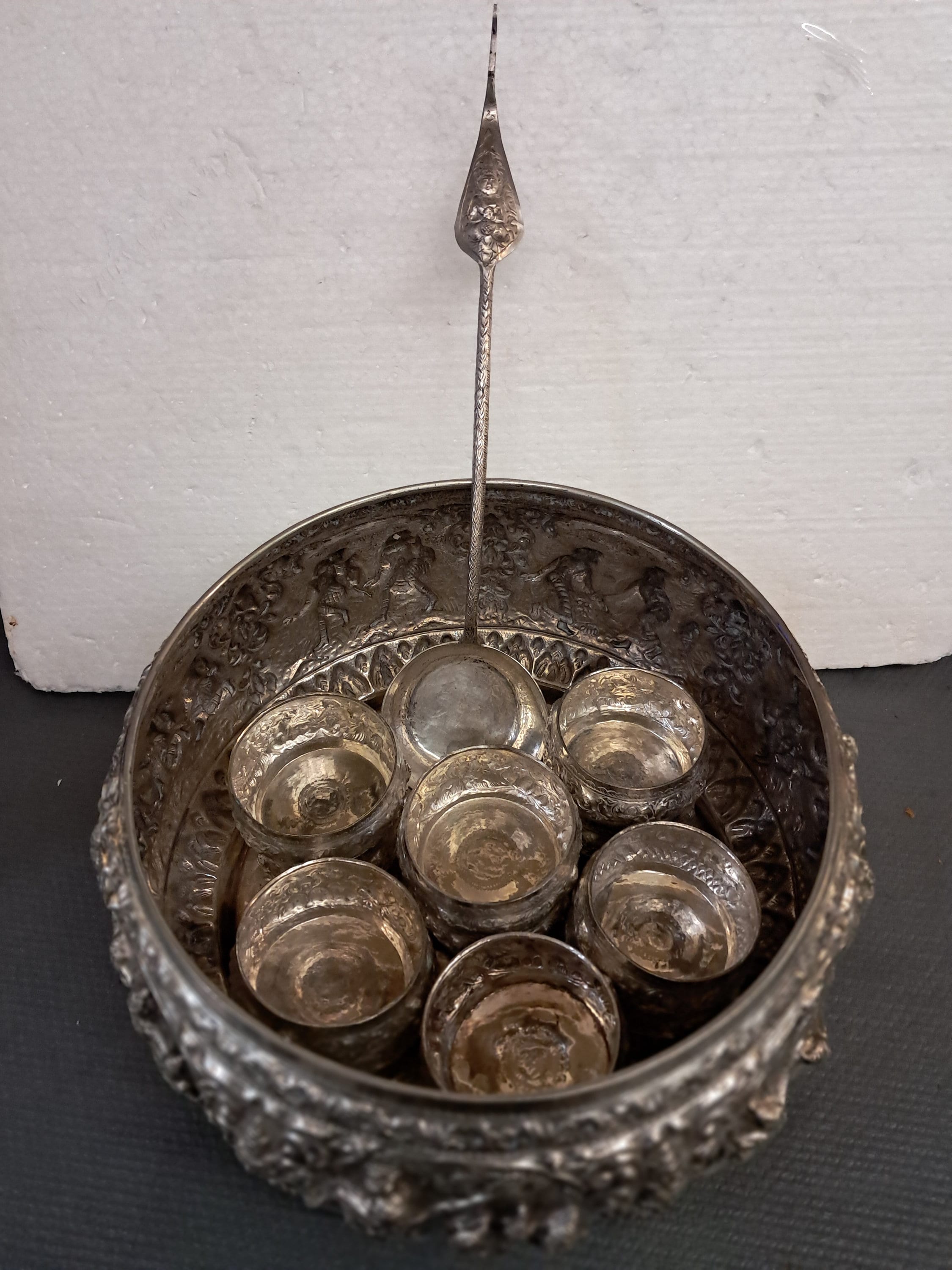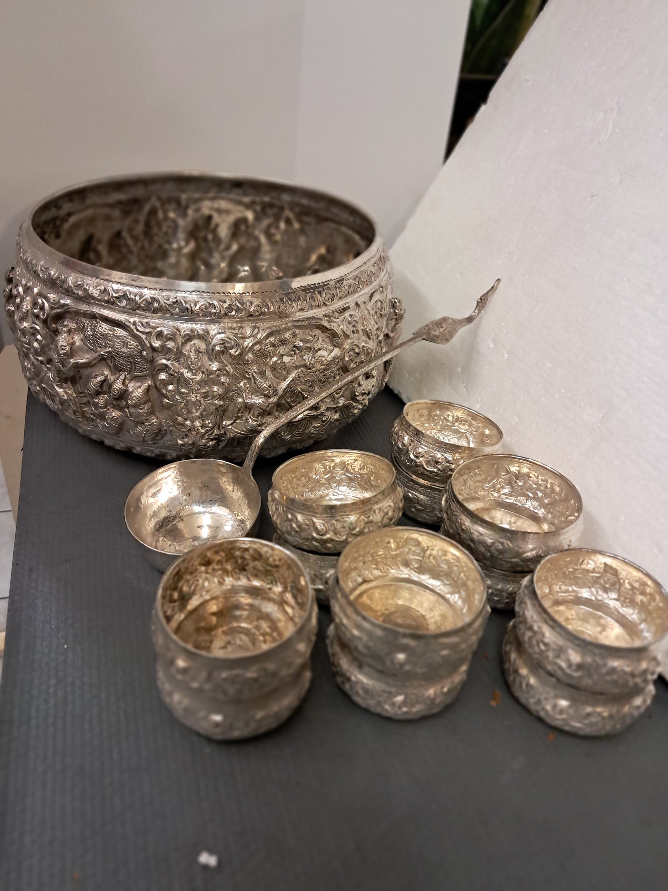 Spectacular Handmade Sterling Silver Thai Burmese offering bowl with high relief decoration, 12 matching serving bowls / cups and long Ladle