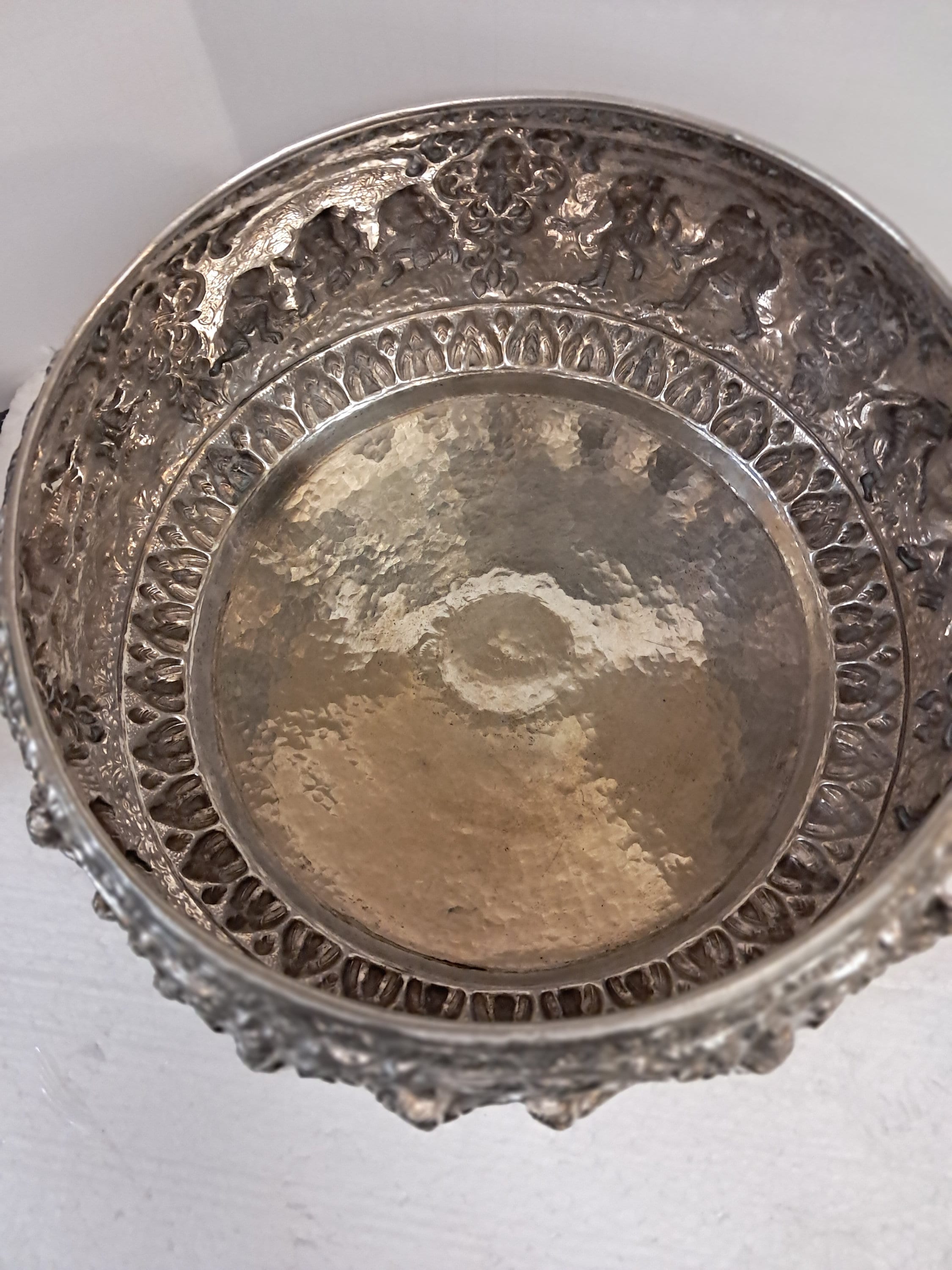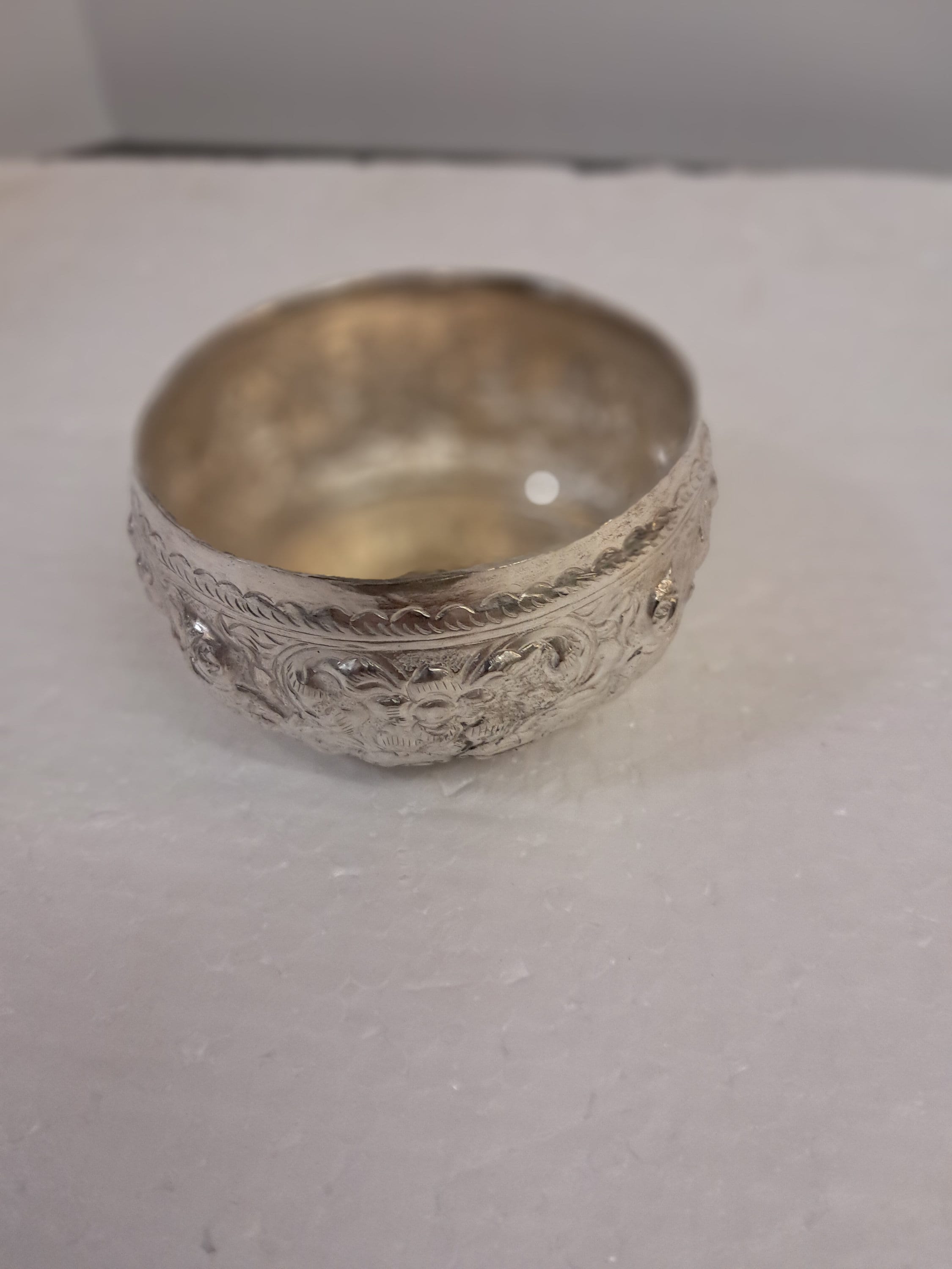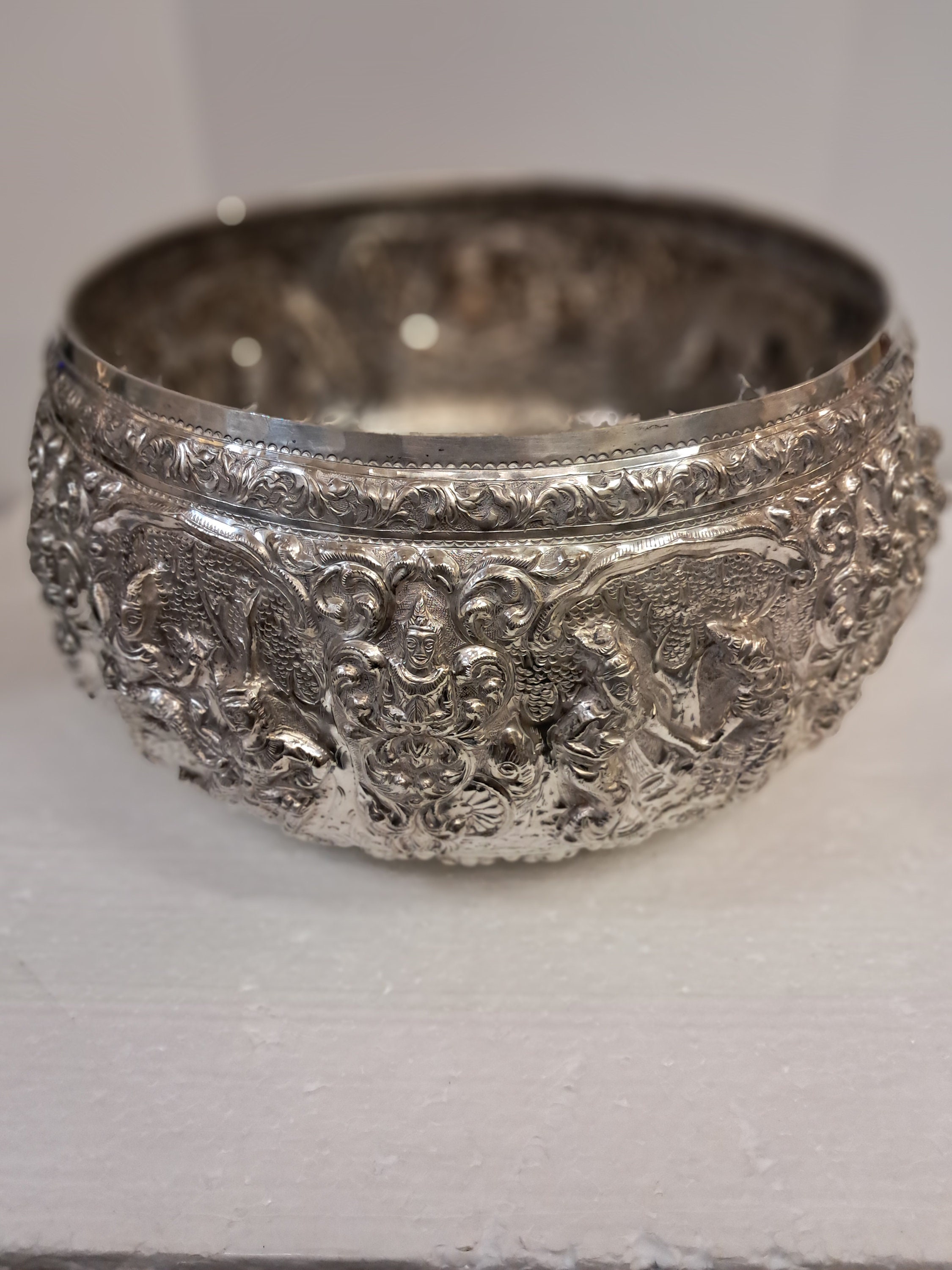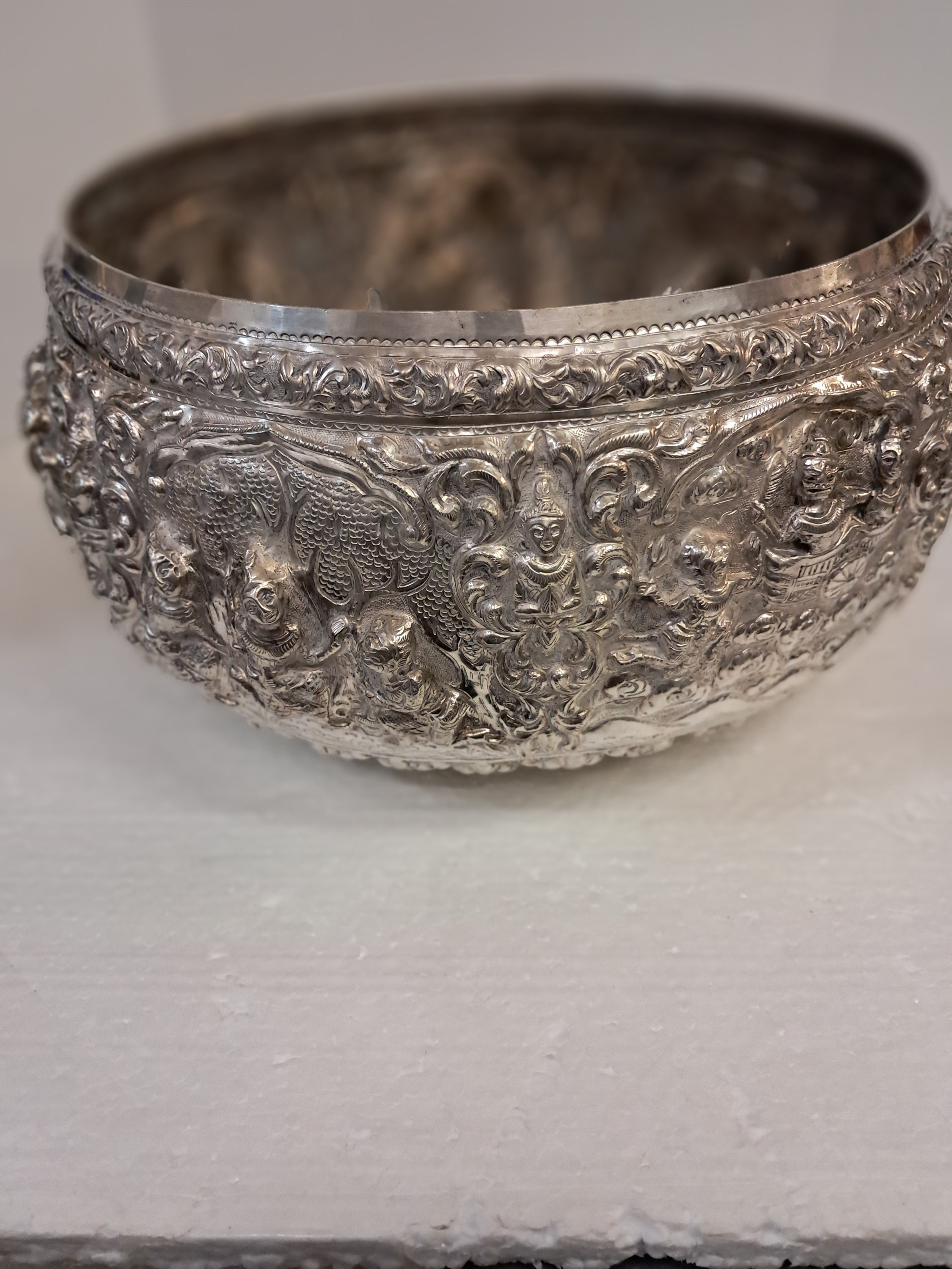 The bowl with Buddhistic Jakata (birth story) scenes, silver weight is 3lbs,2 Oz , condition is very good.