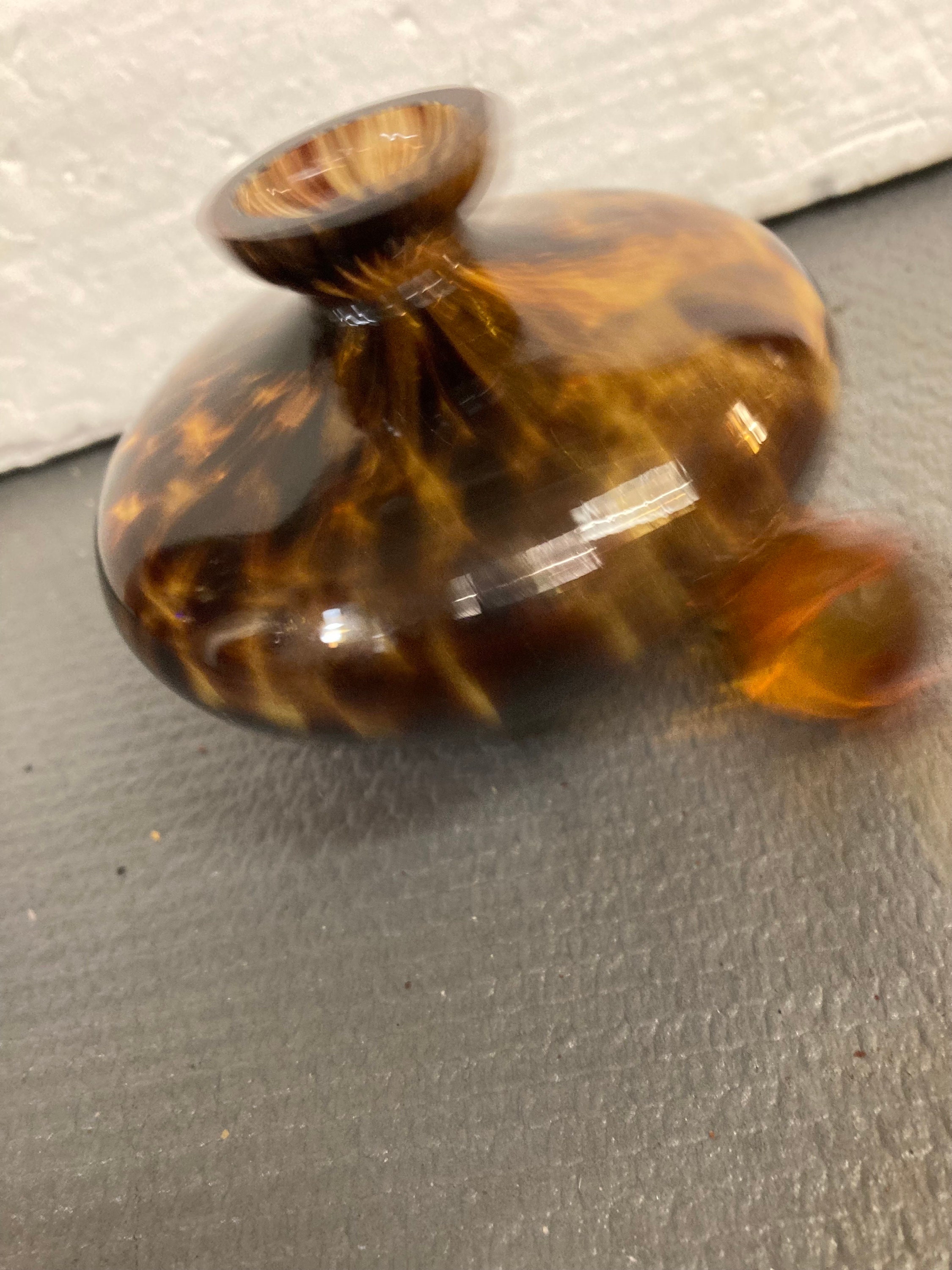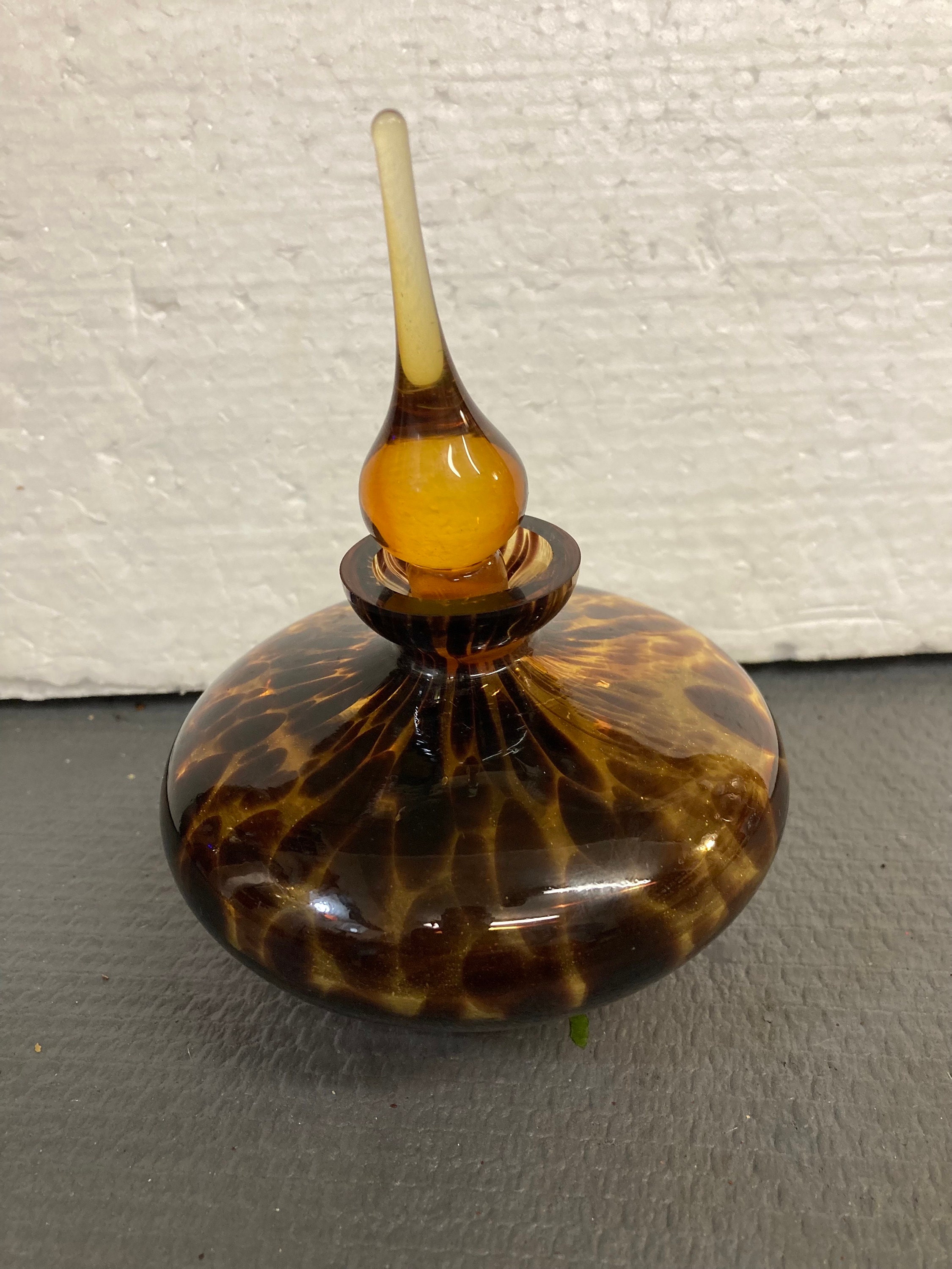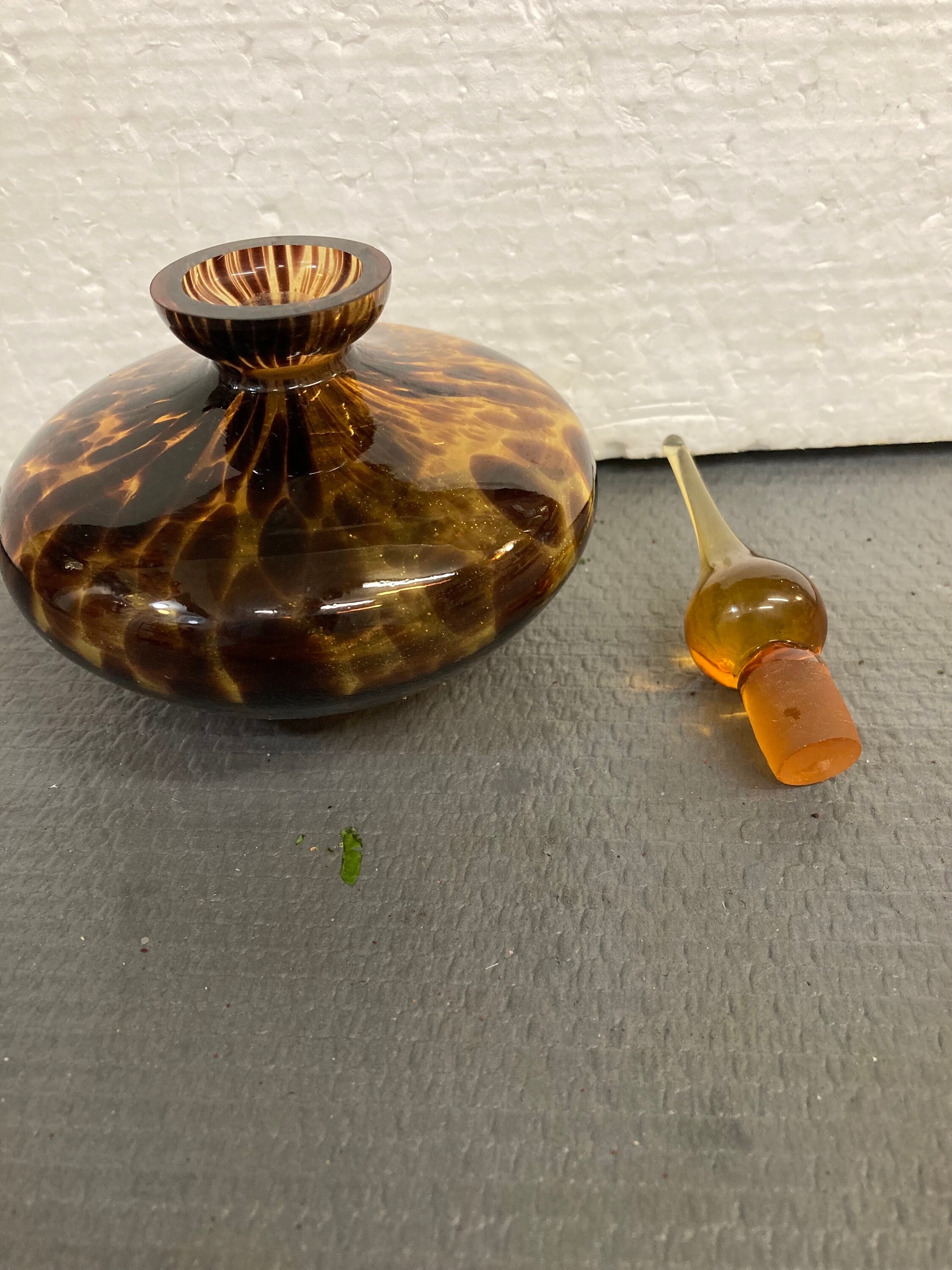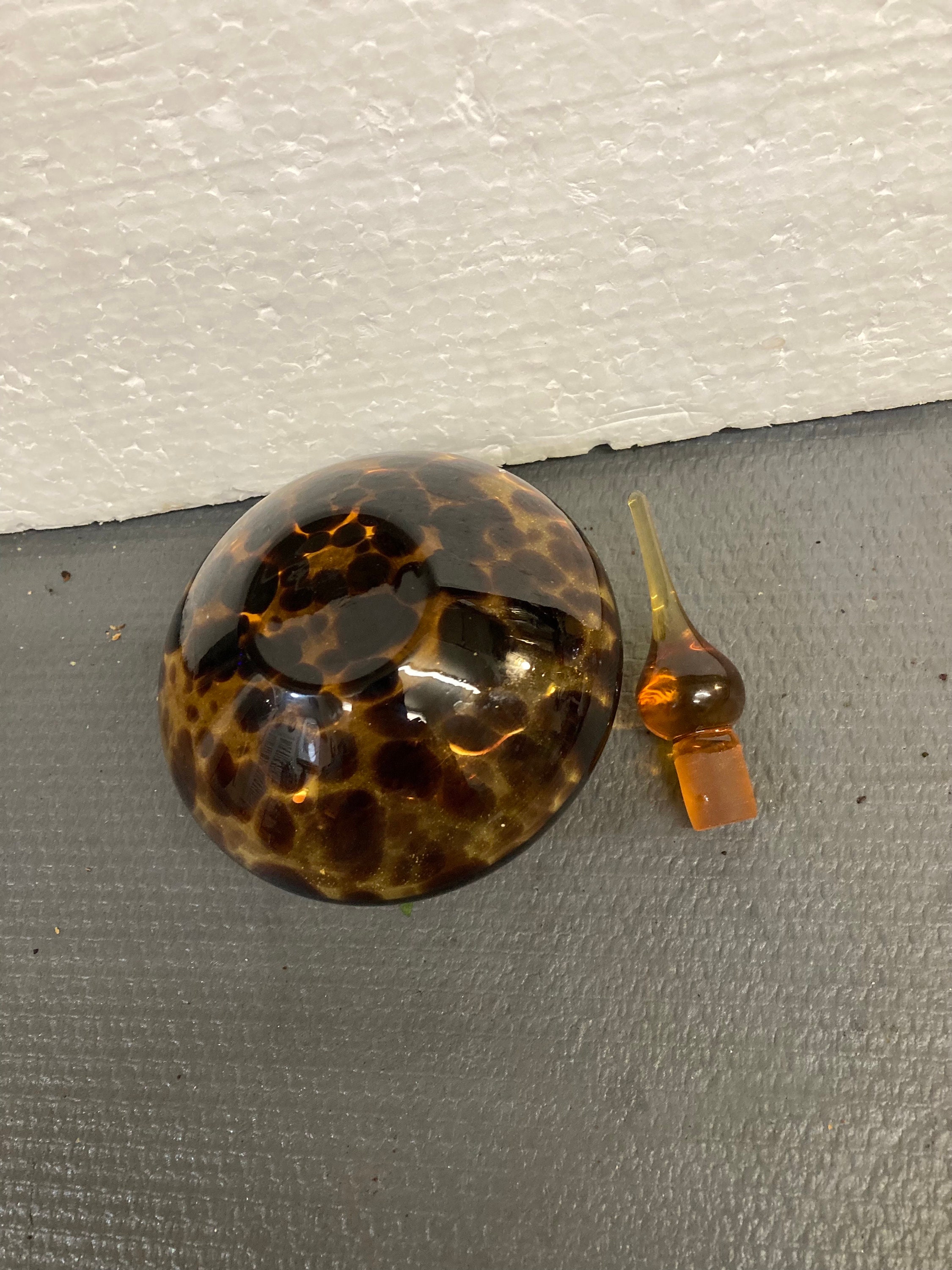A 4'' diameter bottle is a squat 2 1/2'' tall, 4 3/4'' tall with the tapered stopper in place. The bottle has a fun animal ''print'' with brown spots. The dauber is 4'' long, it fits snugly into the opening. There are no nicks at the end of the dauber.