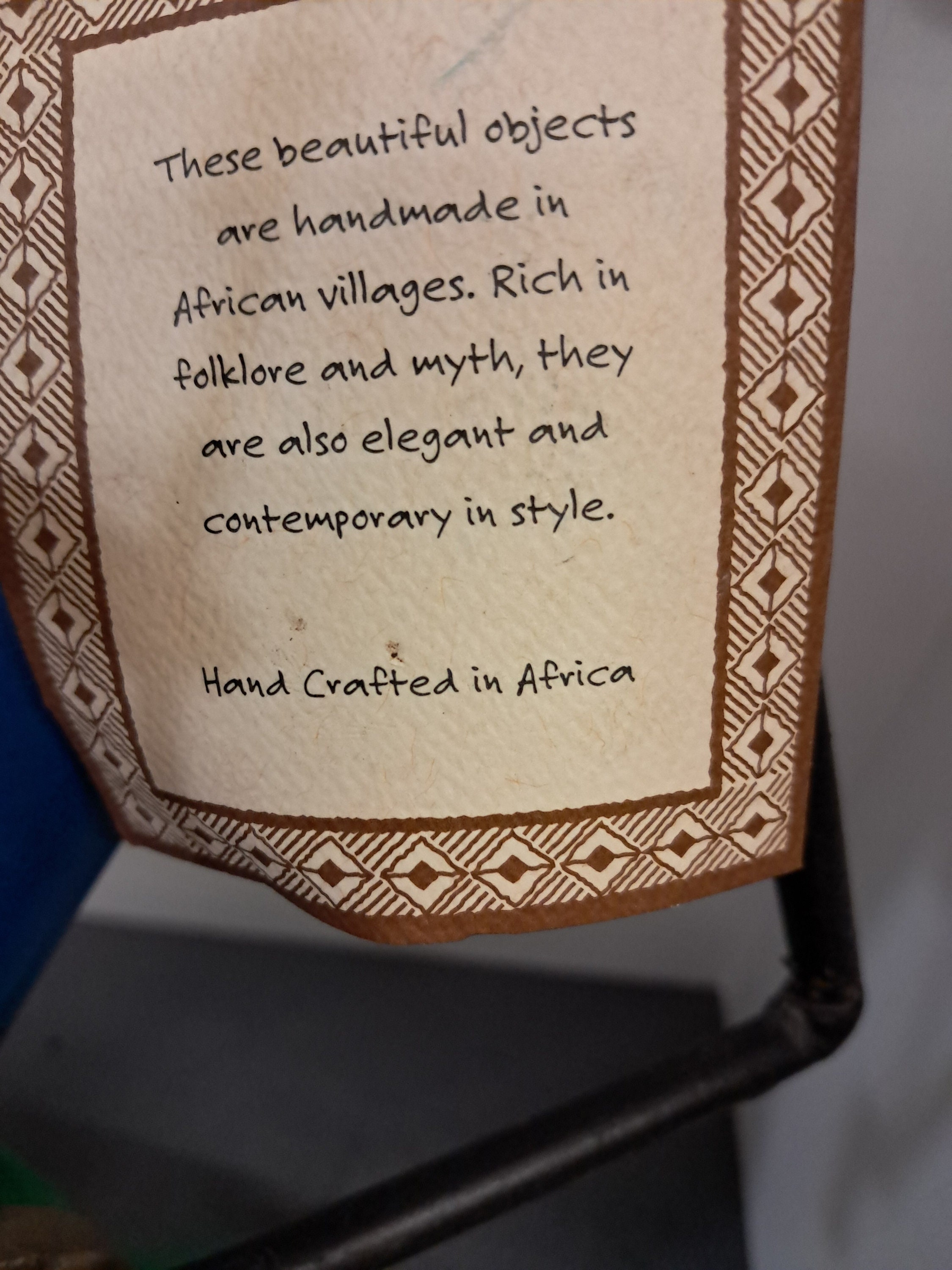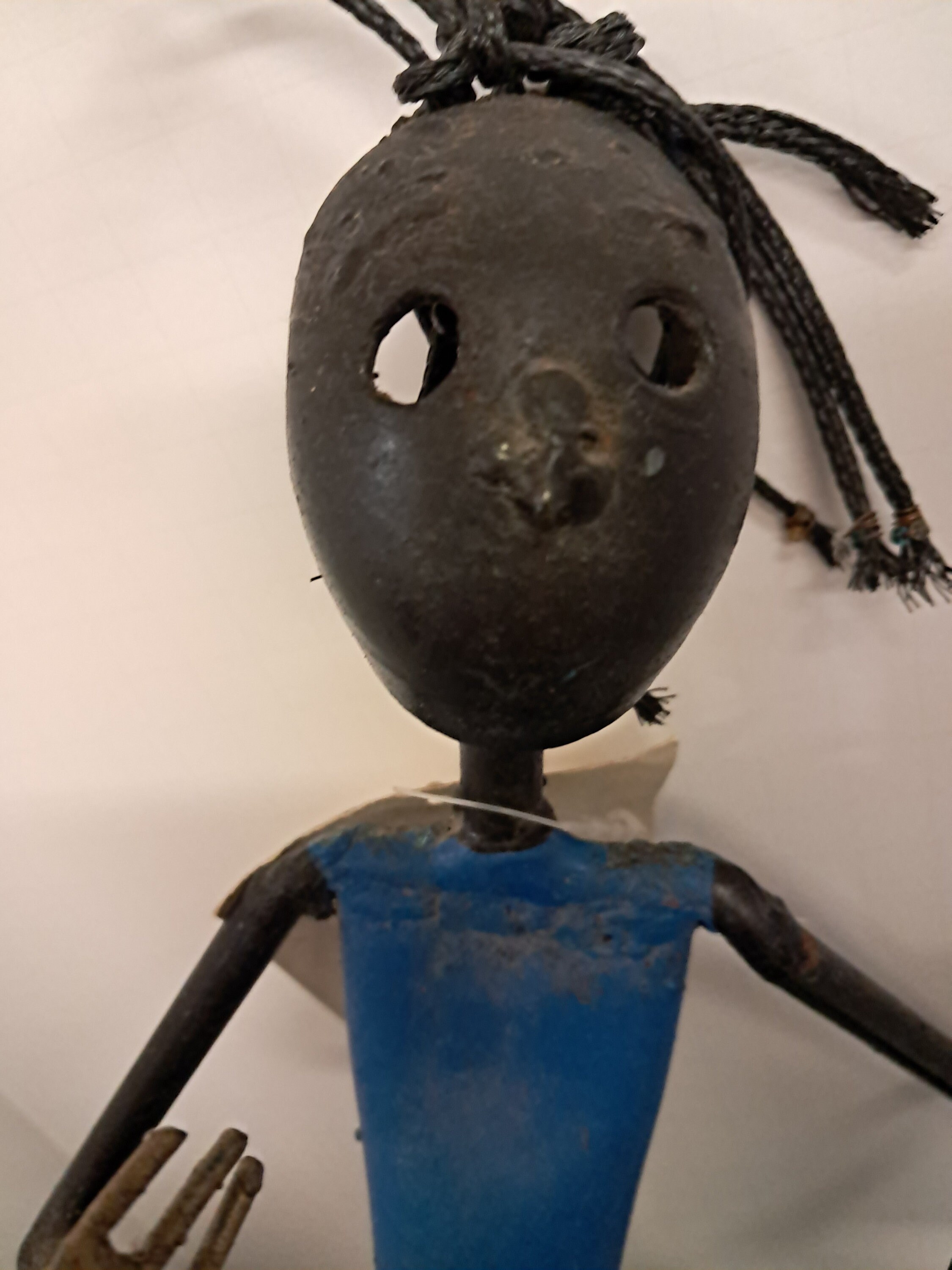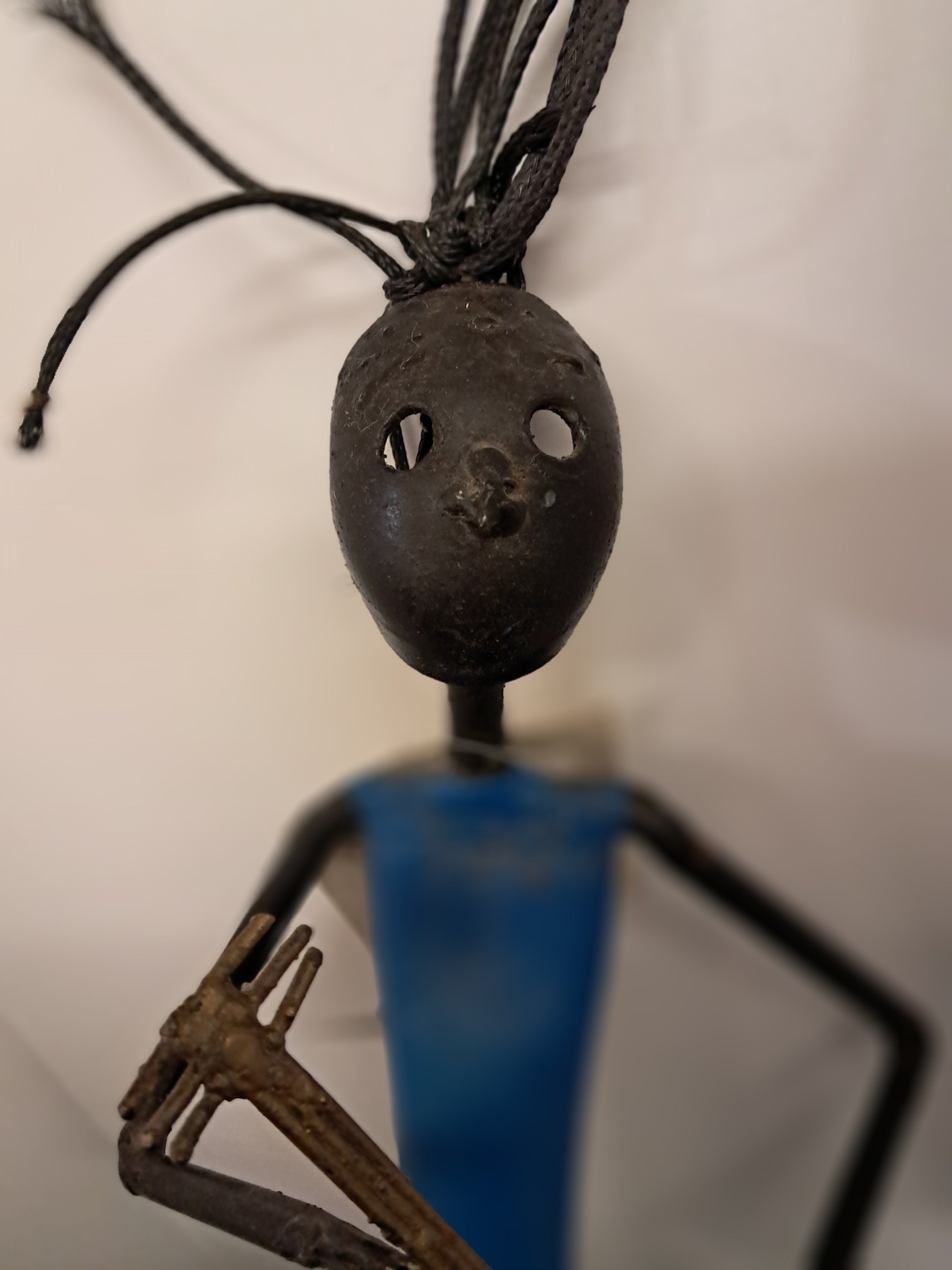 Hand made of welded steel, hand painted and has black nylon rope for dreadlocks.