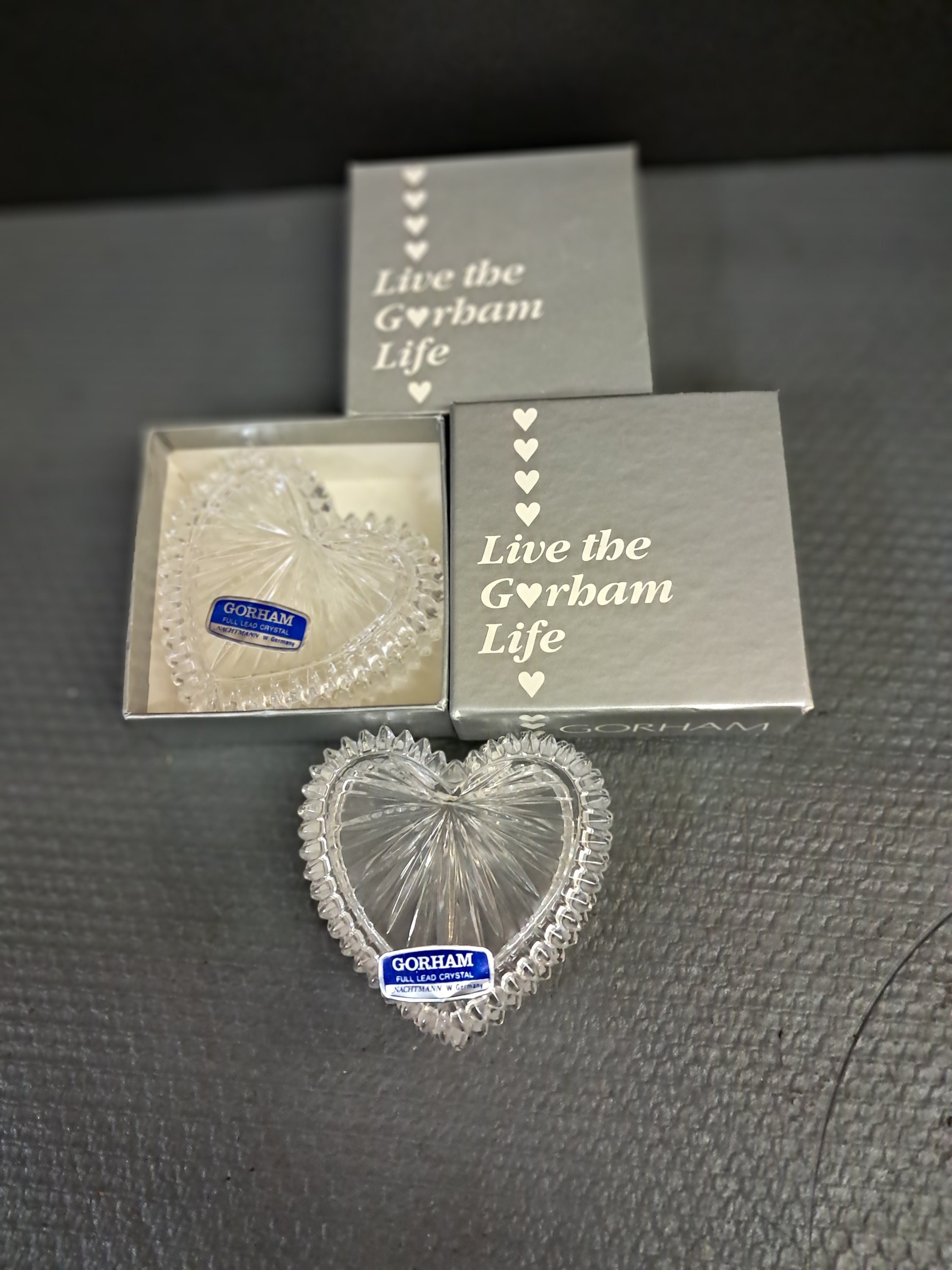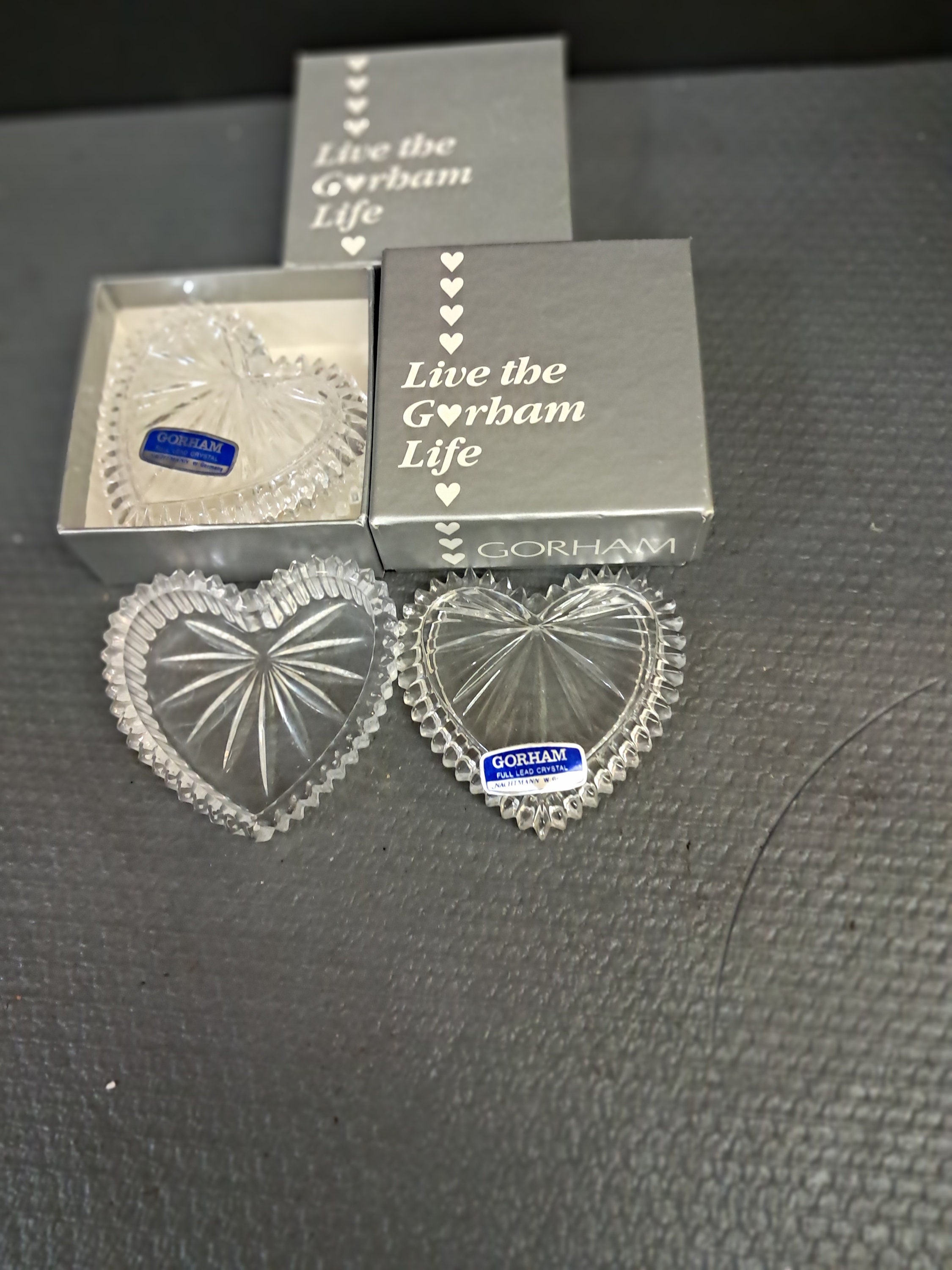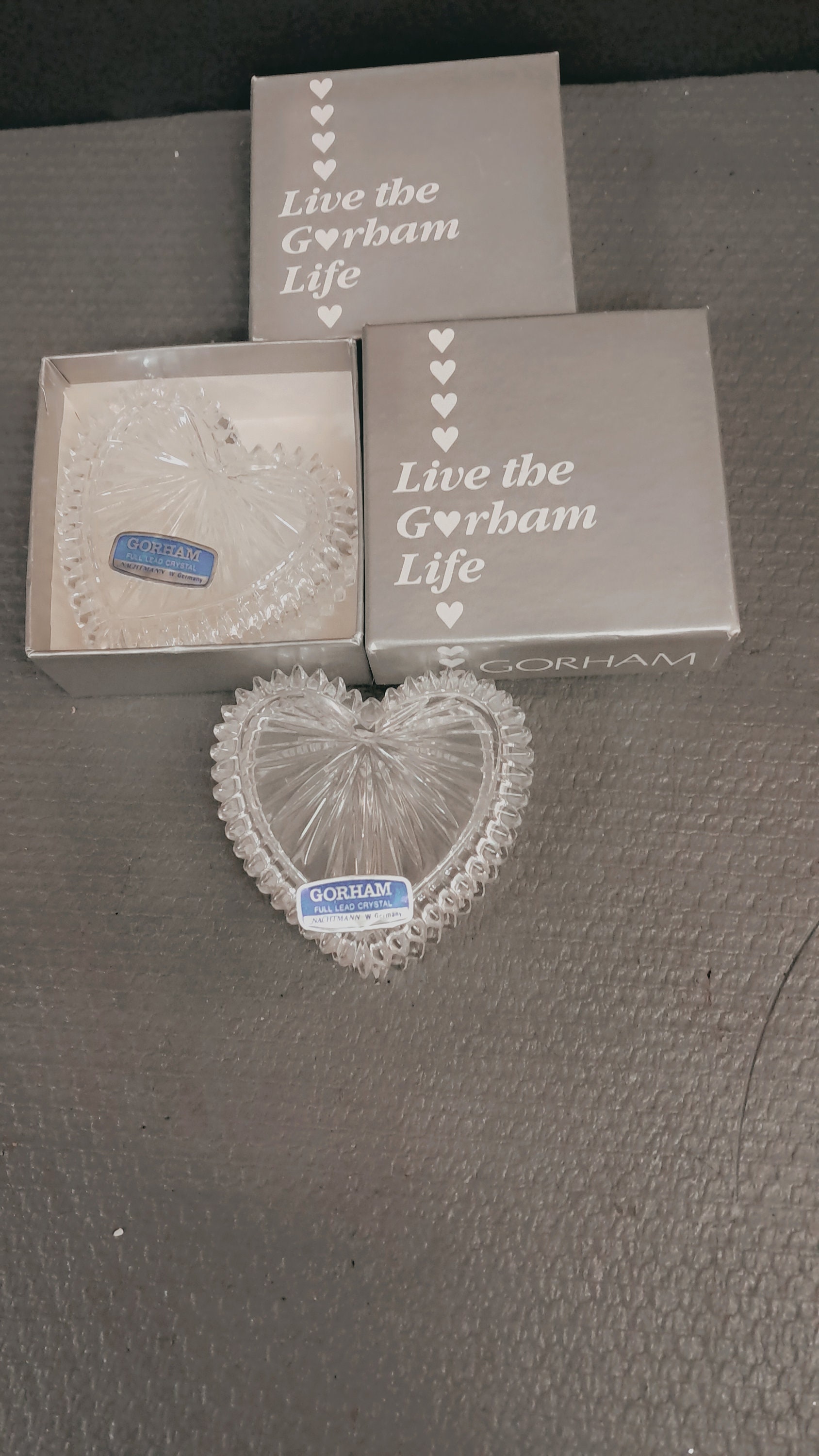 TWO Vintage Gorham Heart Shaped Crystal Covered Trinket Dish