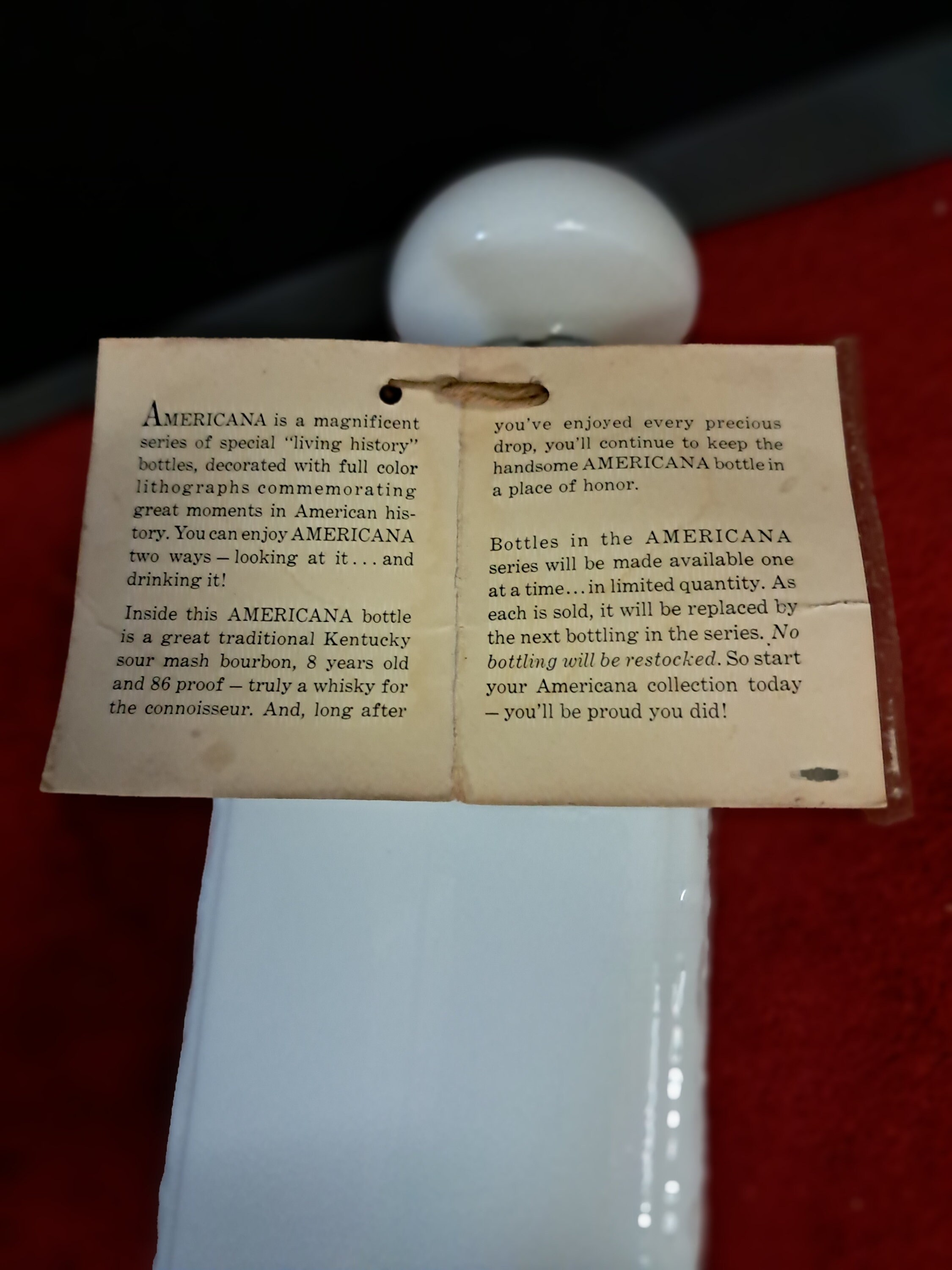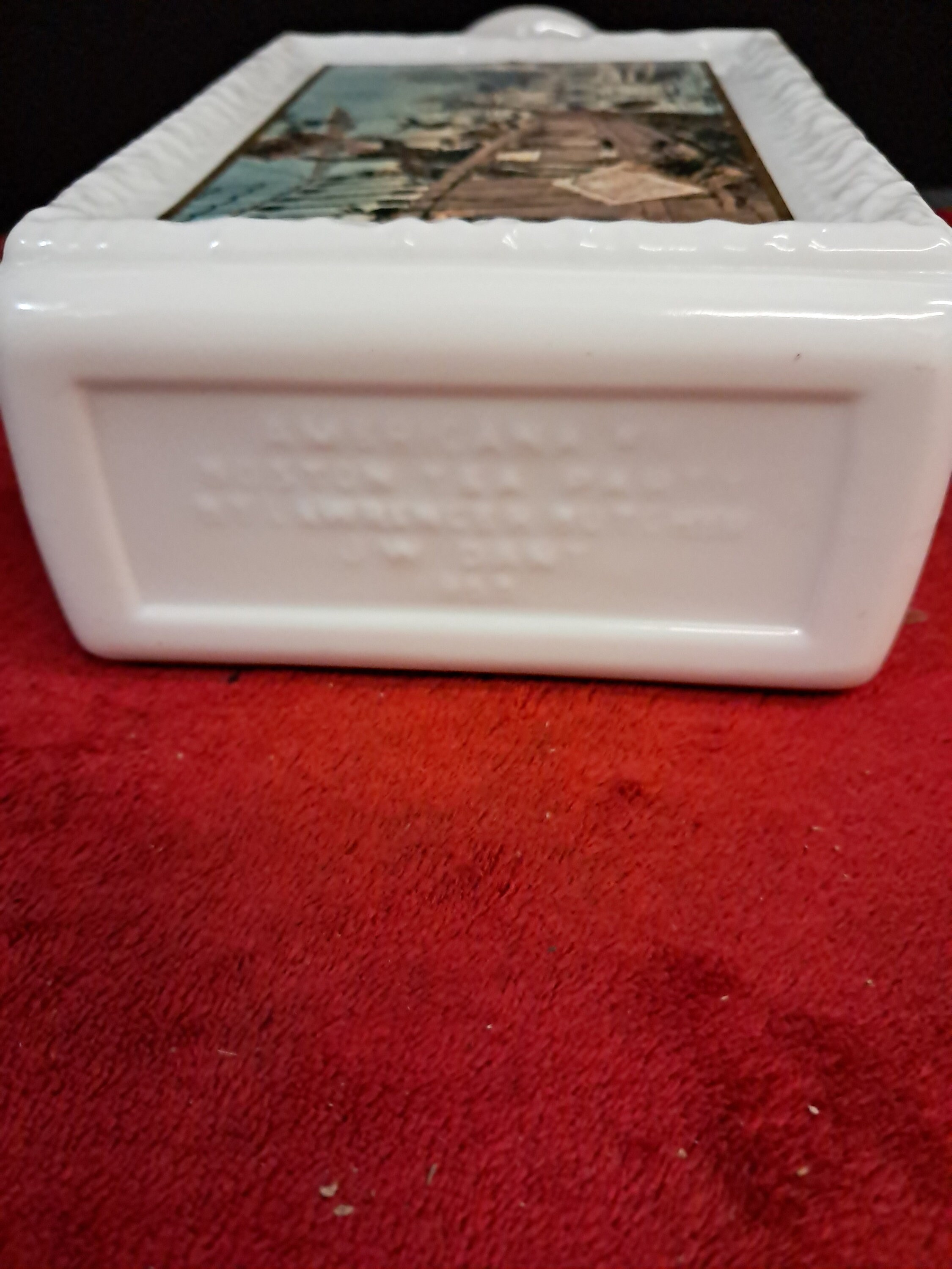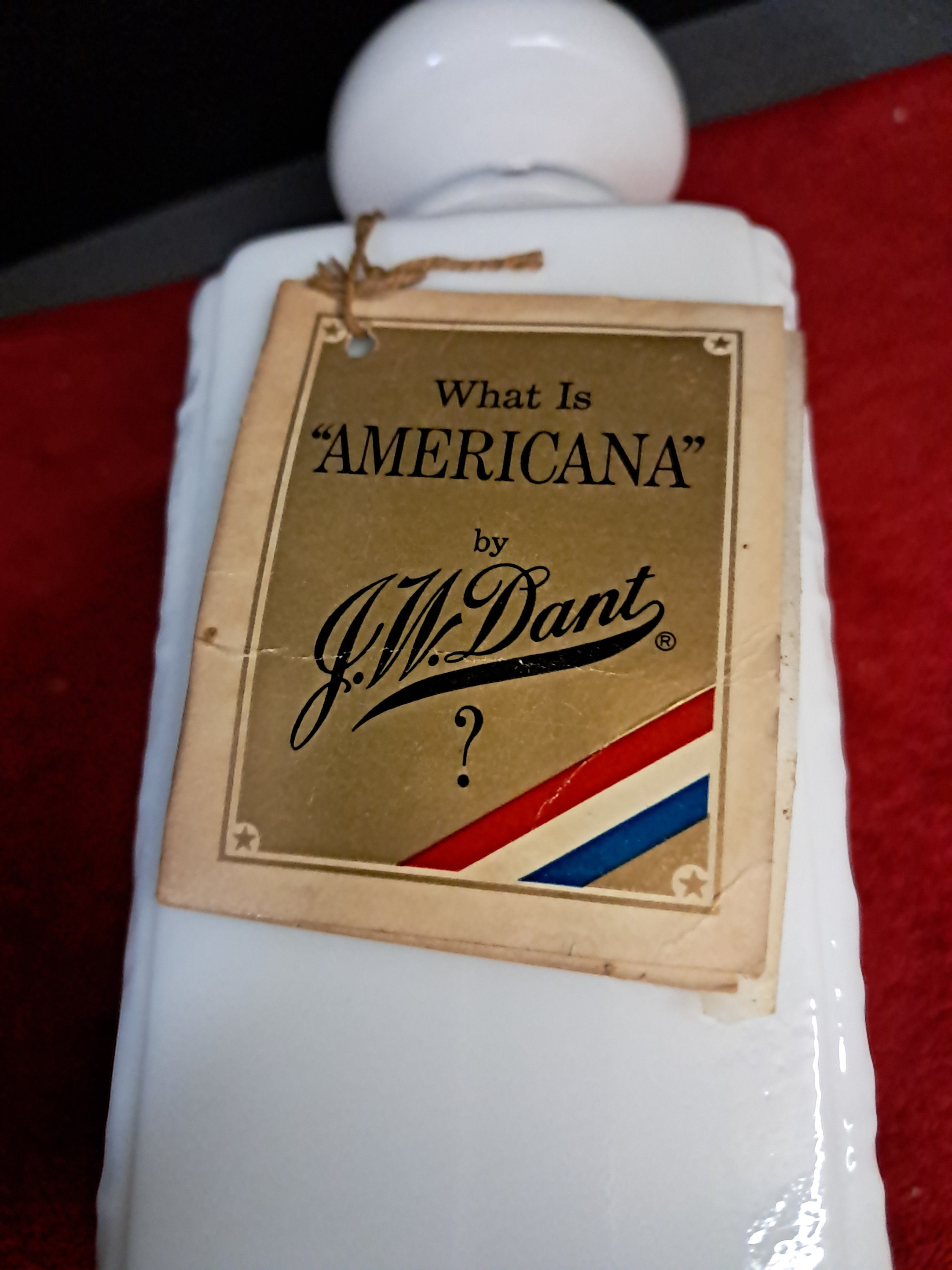 This JW Dant milk glass whiskey decanter is part of the 1968 Americana Collection with a design commemorating the Boston Tea Party. Crafted in a rectangular shape. Has original informational booklet attached.