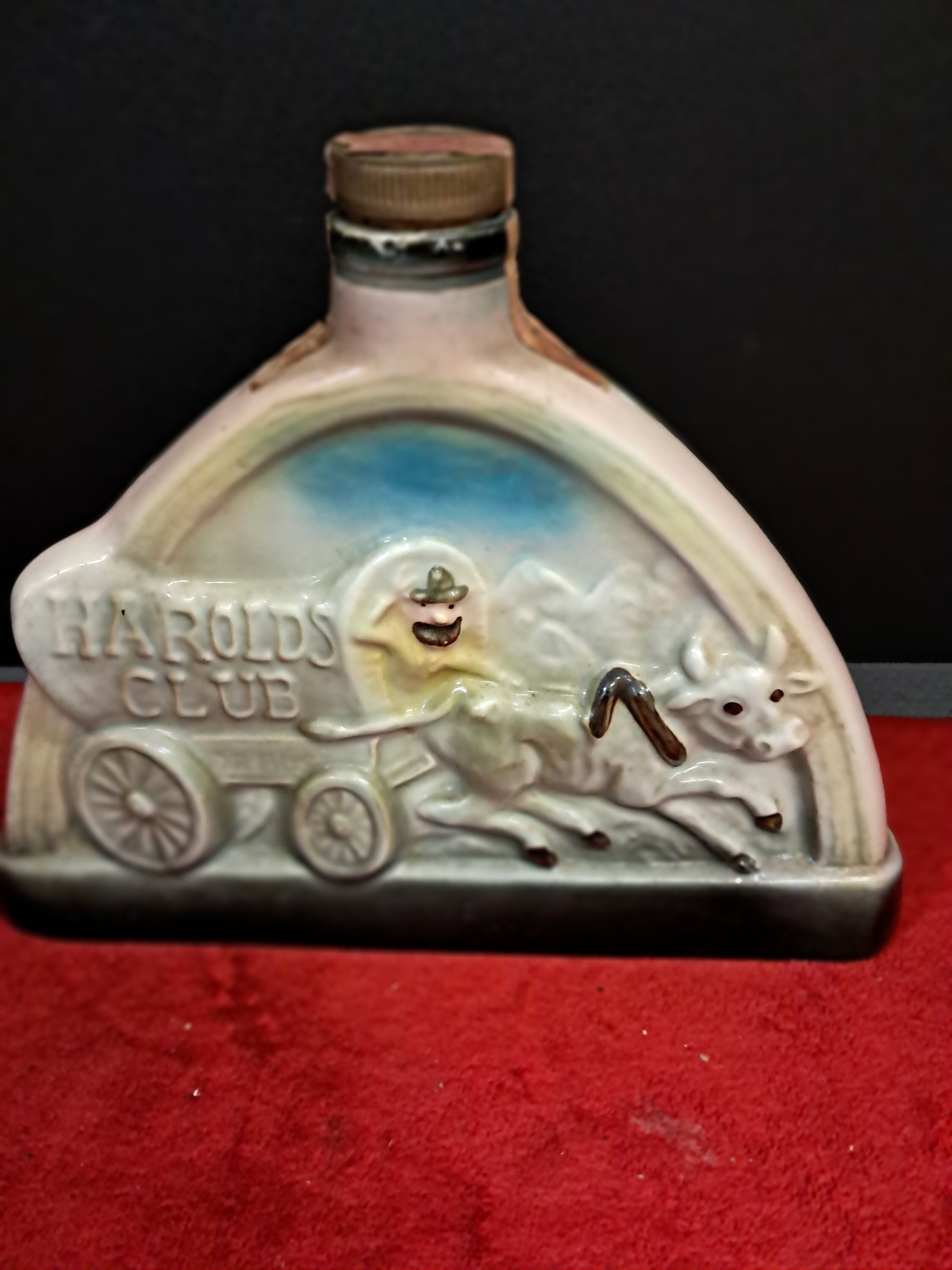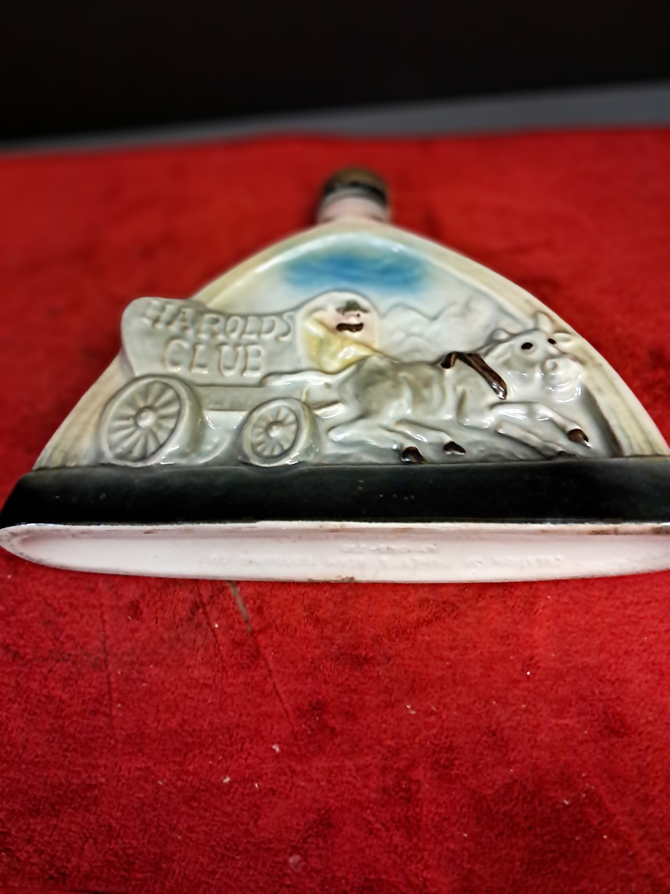 Jim Beam Decanter, Harold's Club, Covered Wagon and Ox, Vintage 1969, C. Miller, Liquor Bottle, Ceramic, Whiskey, Comes Empty