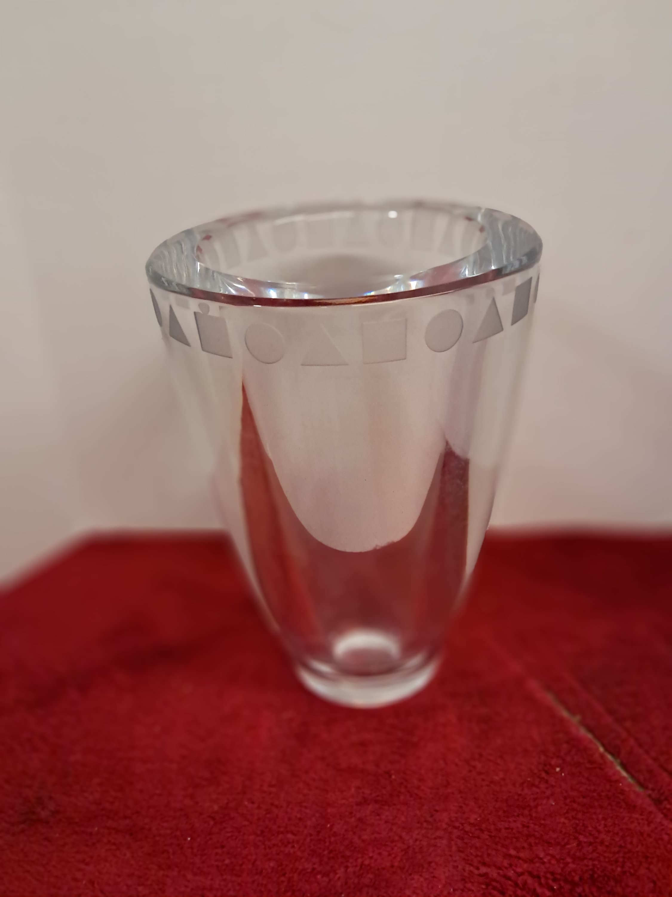 Signed Sasaki Sengai round lead crystal flower vase, etched to-clear, made in Japan and designed by Ward Bennett.