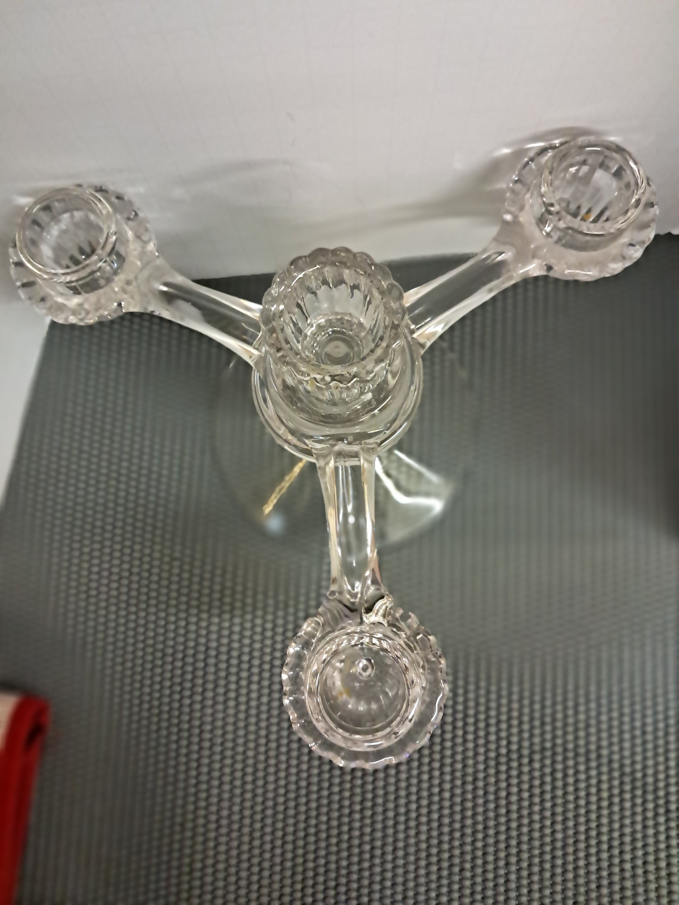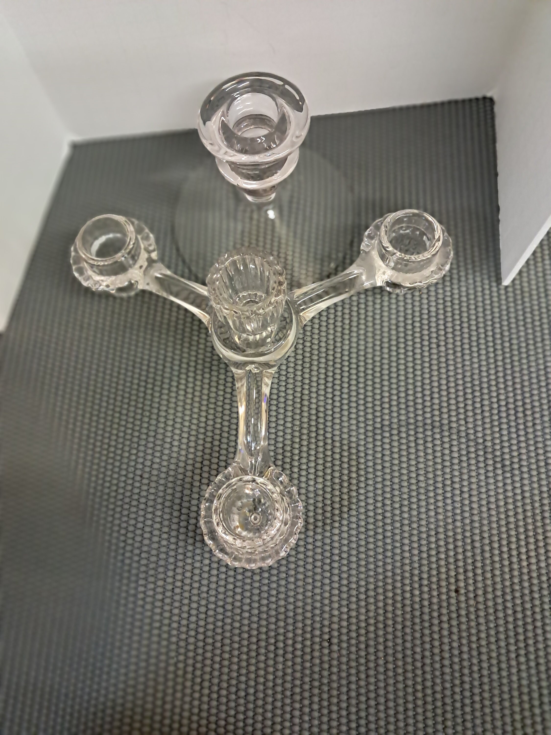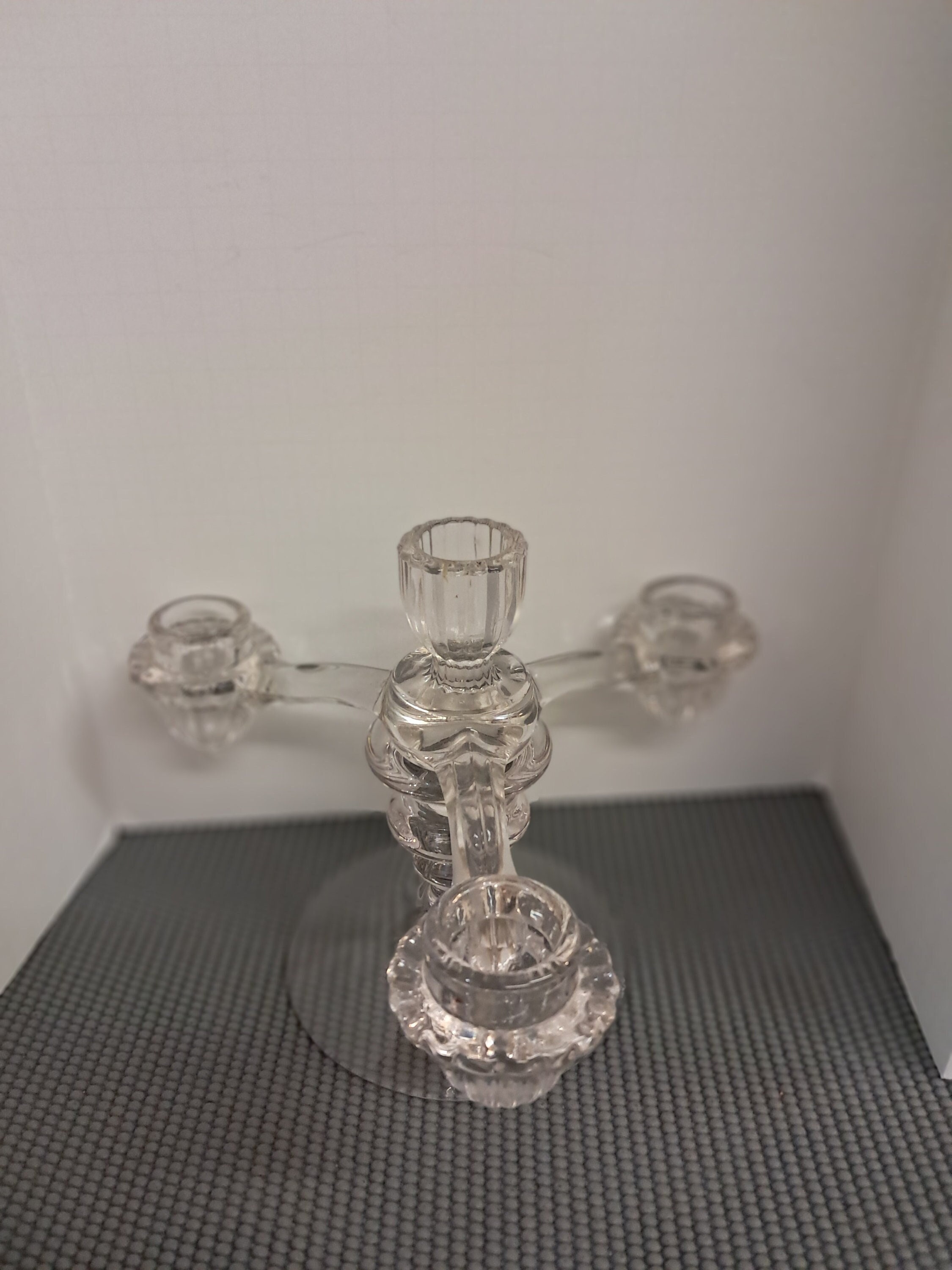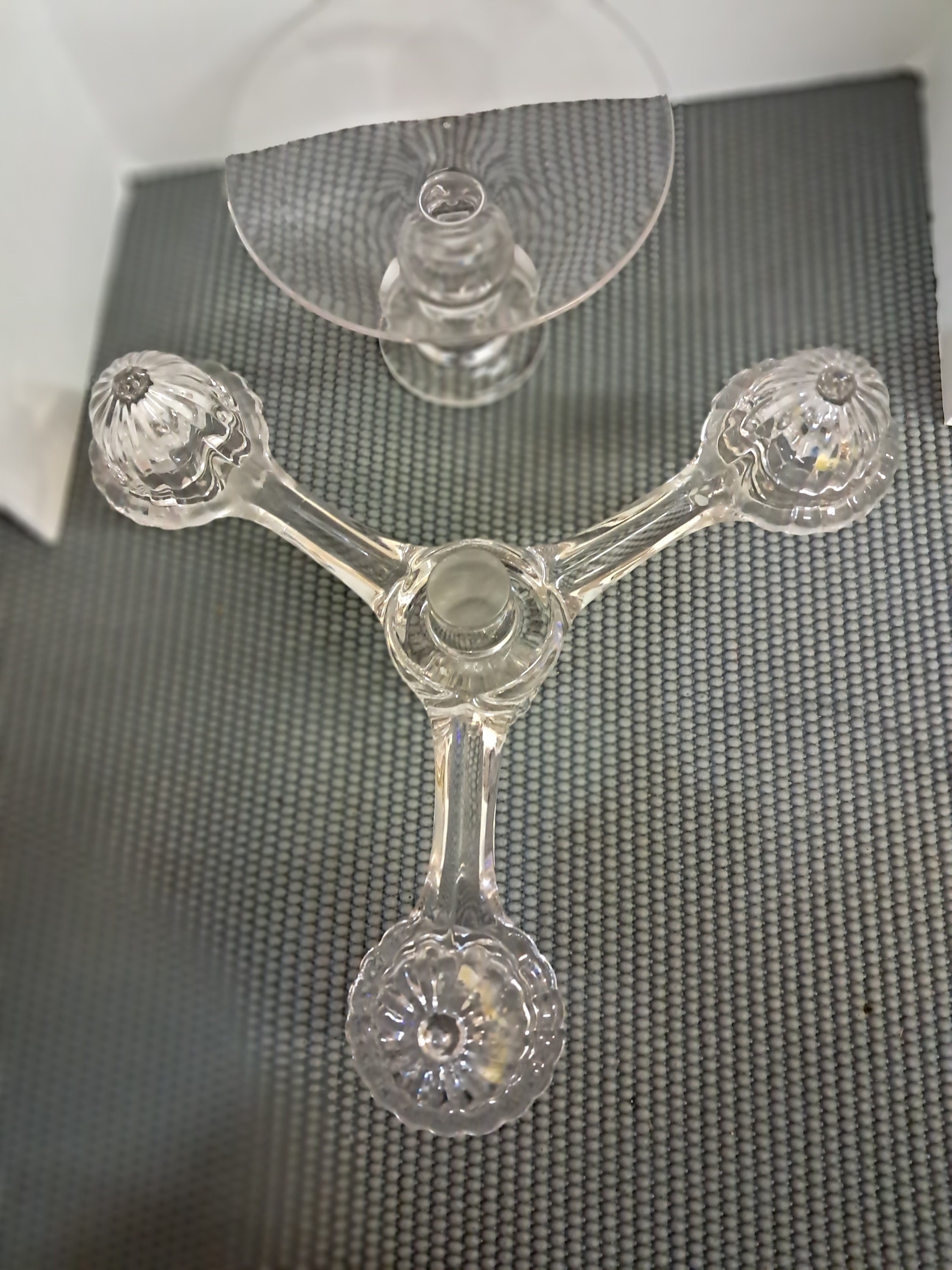 A Cambridge Glass Low Candle stick with 3-arm candle holder. The candlestick constitutes a base for a Cambridge Arm, 3-sided candle holder plus one in center. The arm piece was introduced in 1949. One can place candles or peg vases on it. The arm may be used by itself or placed on the candle holder. The entire structure is 7" tall x 9" in diameter. The base candle holder is 5" at the base and 4" tall. Excellent condition without chips, cracks, or scratches. Please examine photos.
