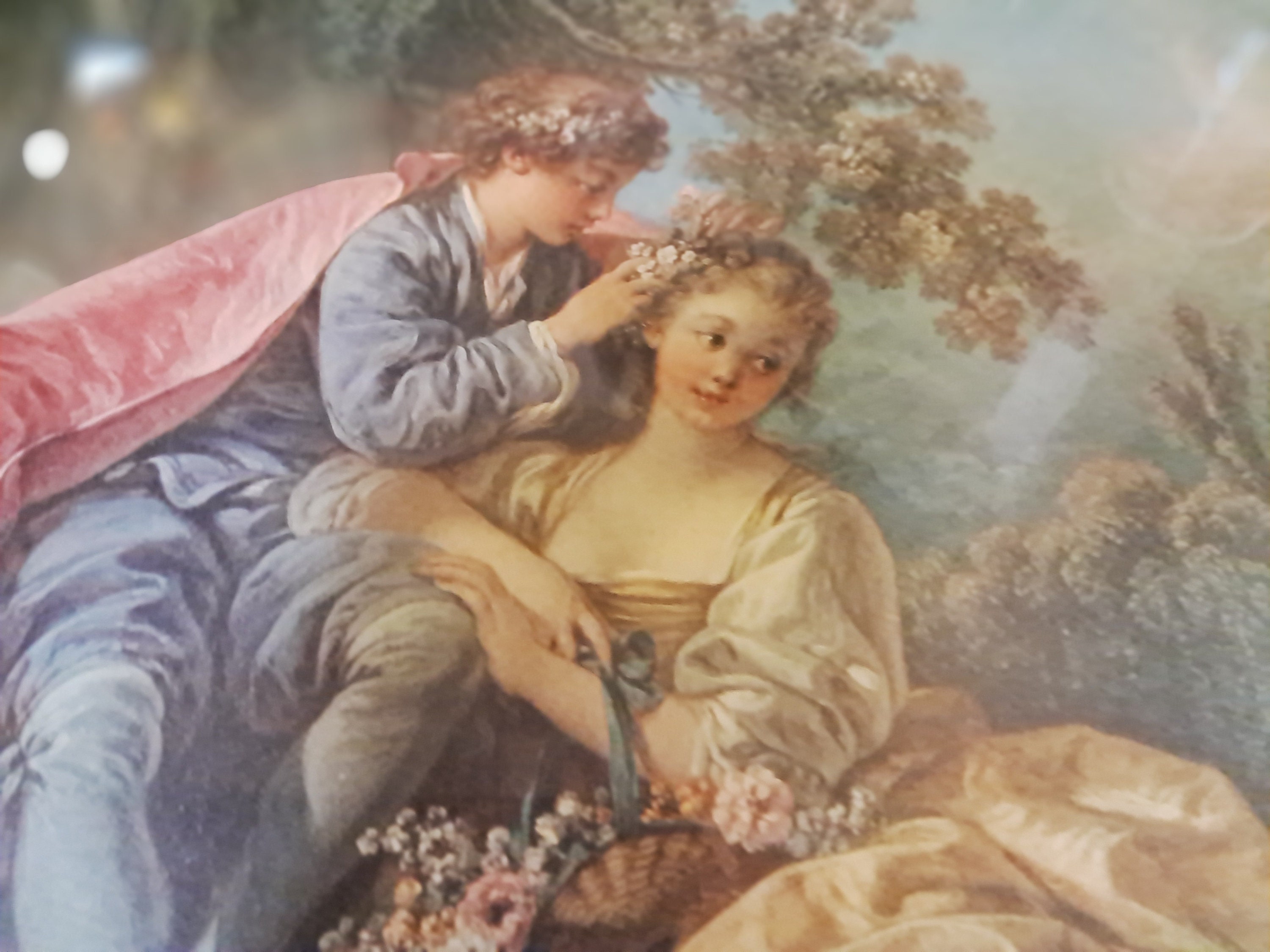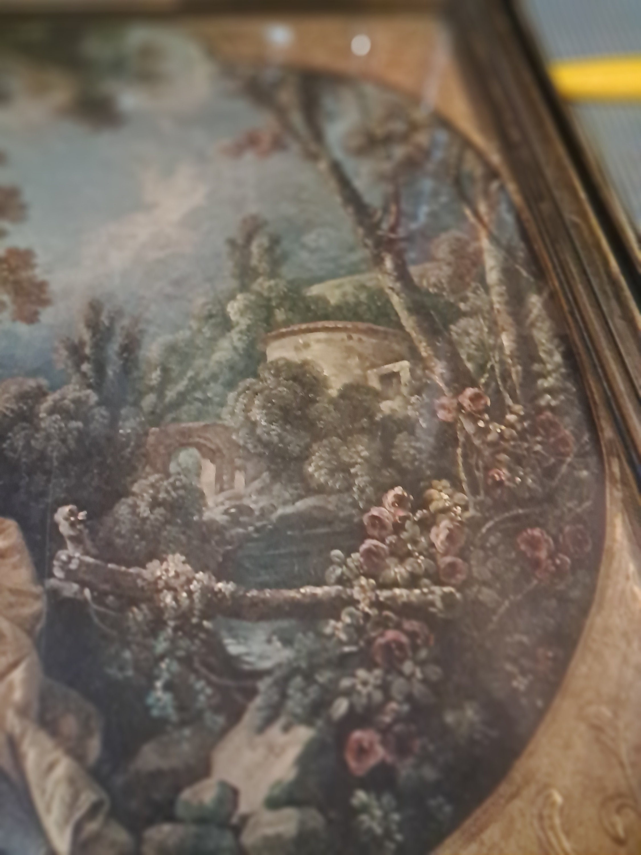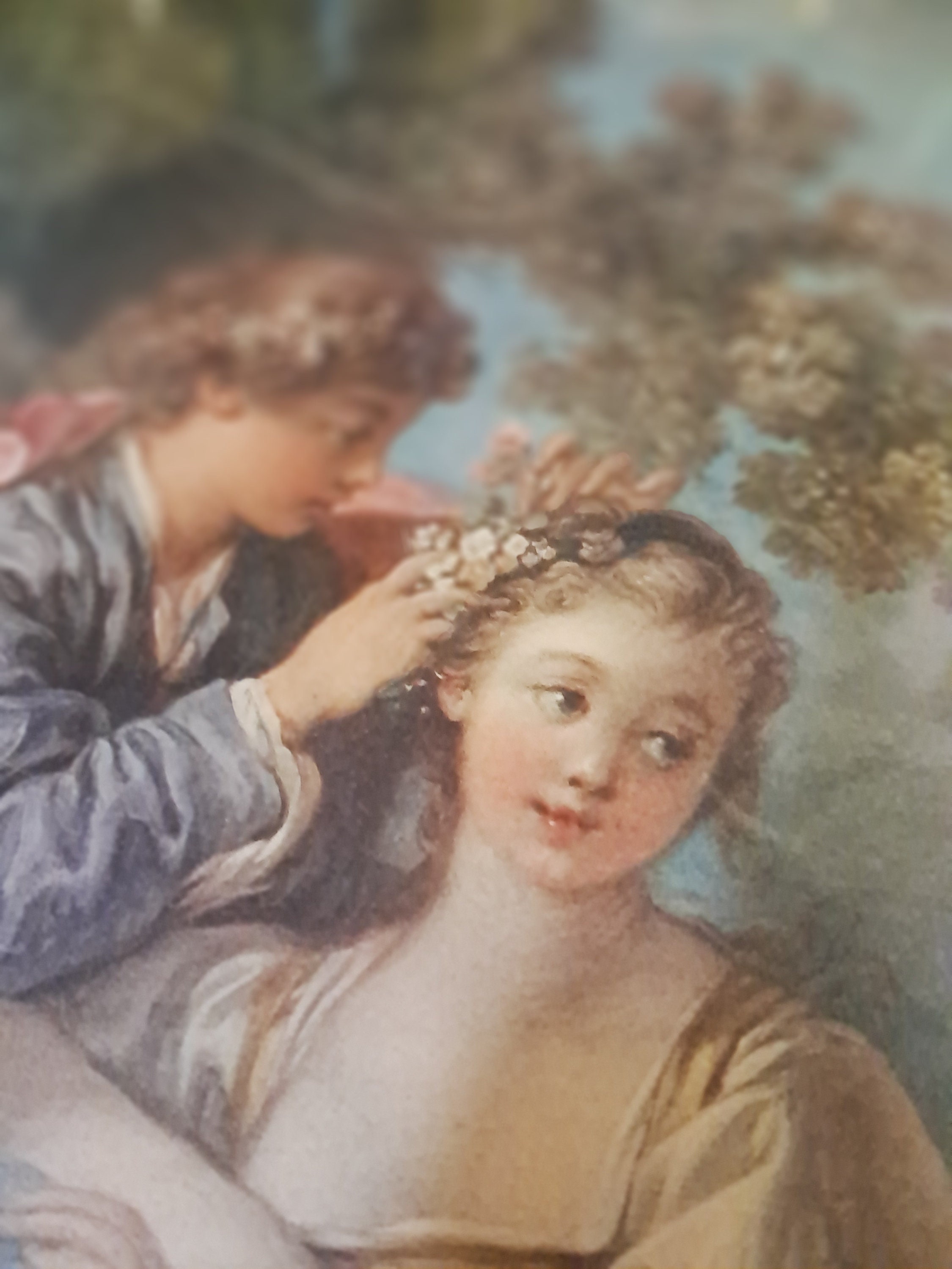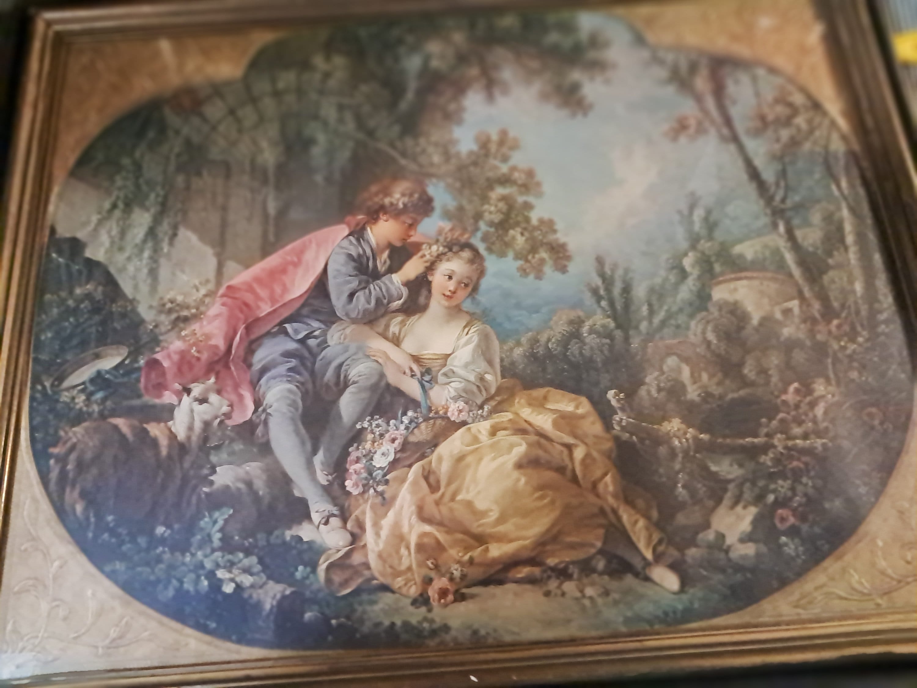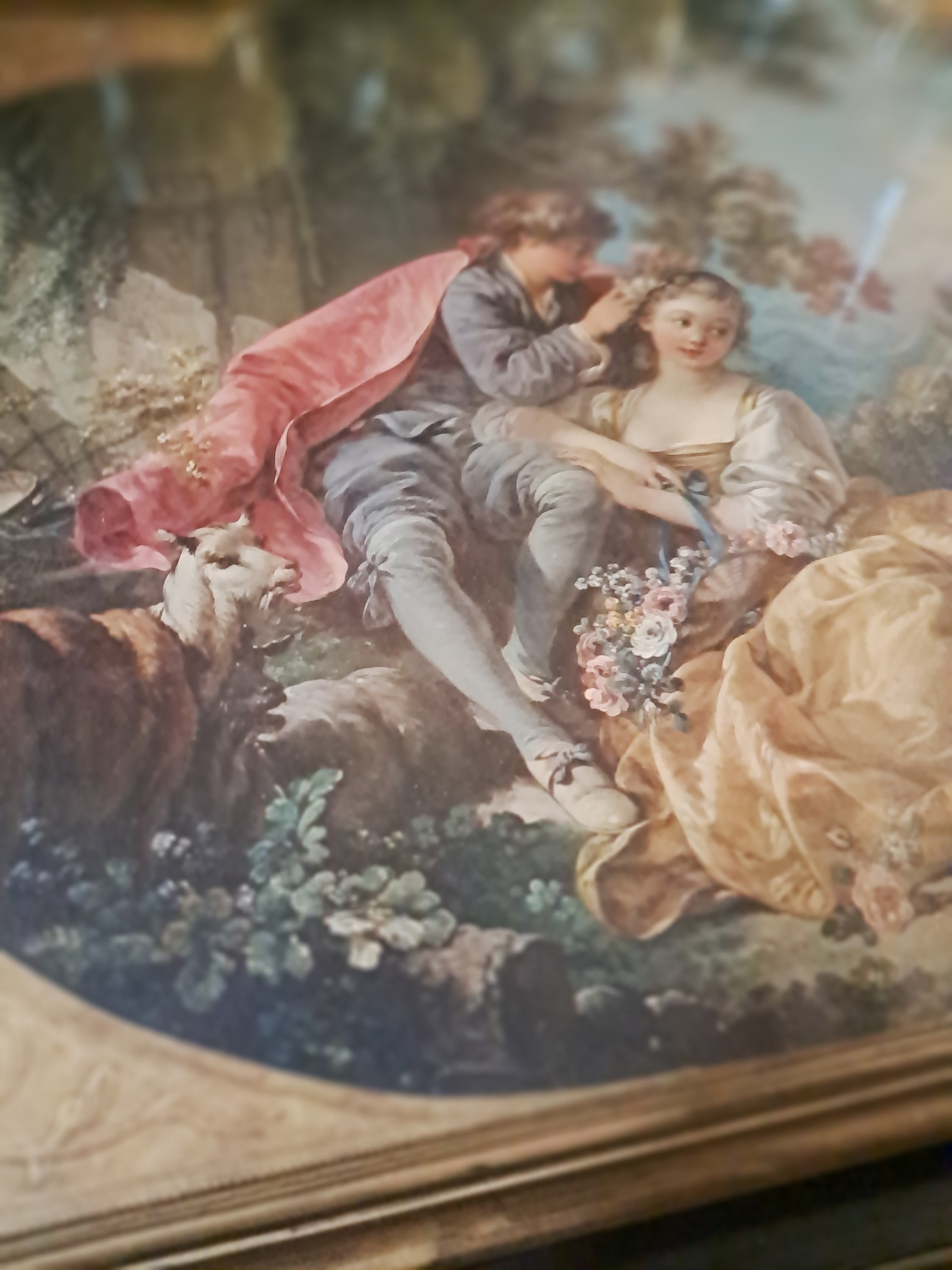 ANTIQUE 19c LITHOGRAPH DEPICTING A LADY AND CAVALIER COURT SCENE ON LANDSCAPE,