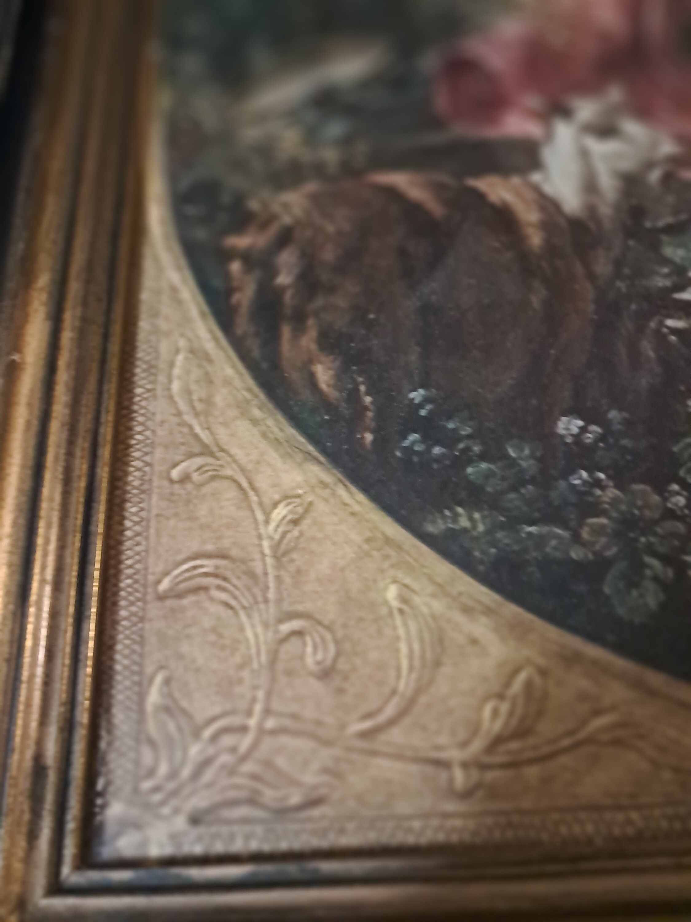 HAND CARVED ORNATE GILT FRAME WITH GLASS.