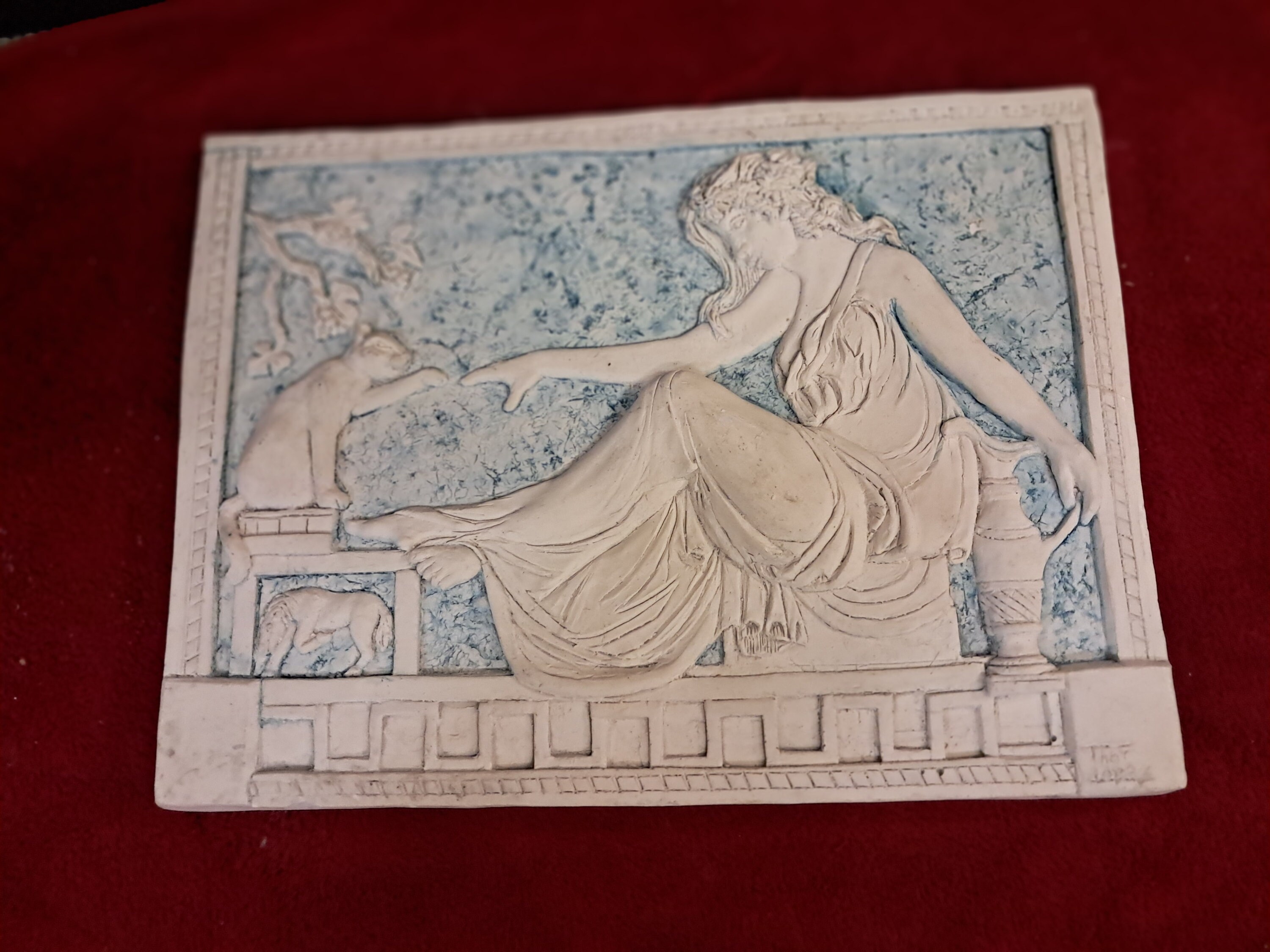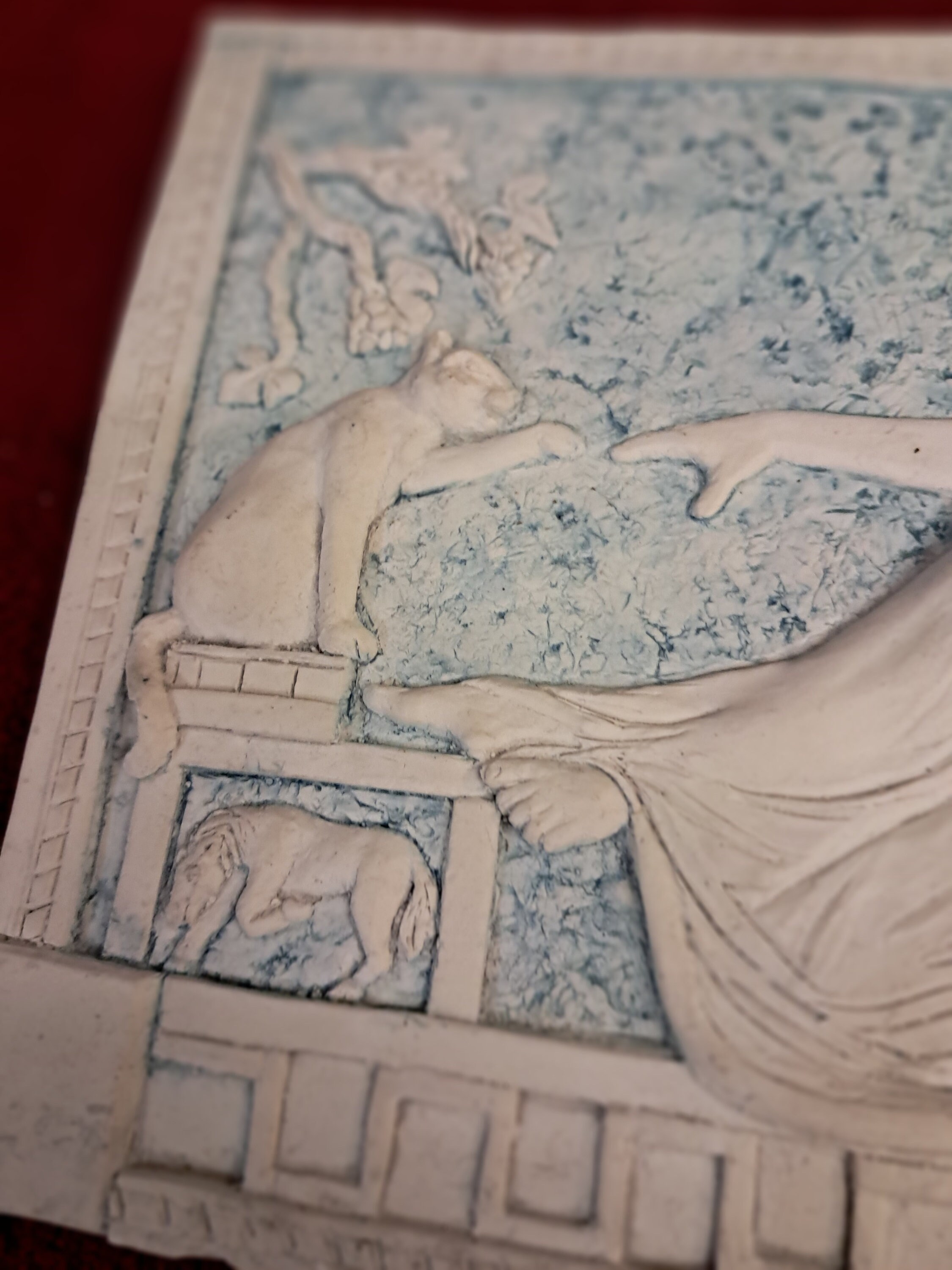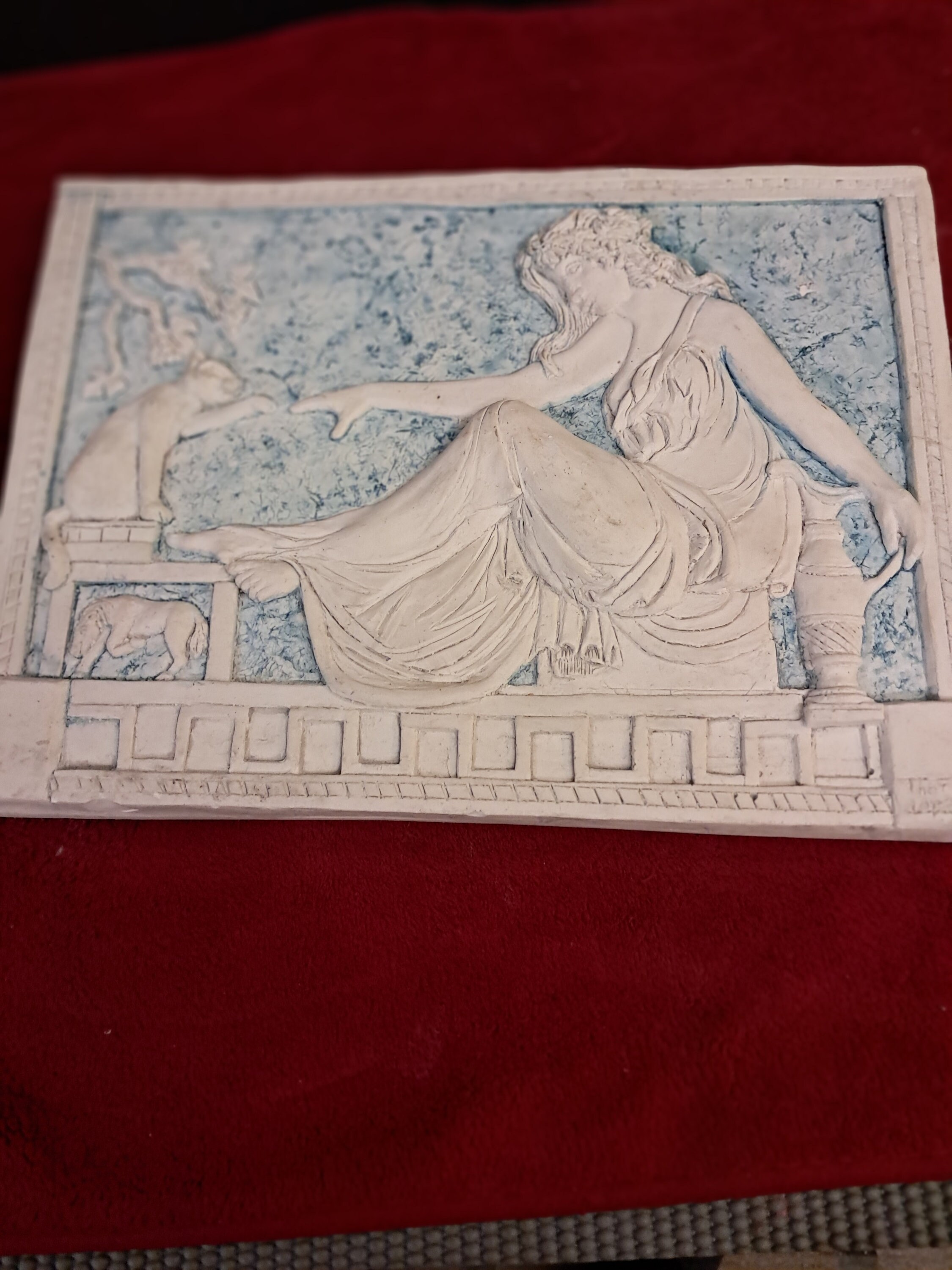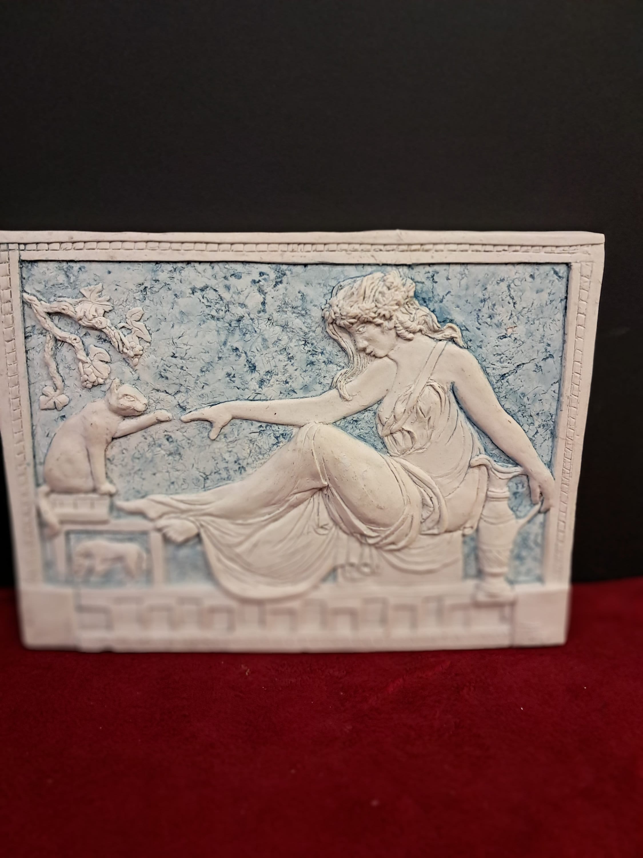 A beautifully designed hanging plaque featuring a roman lady reaching to her cat